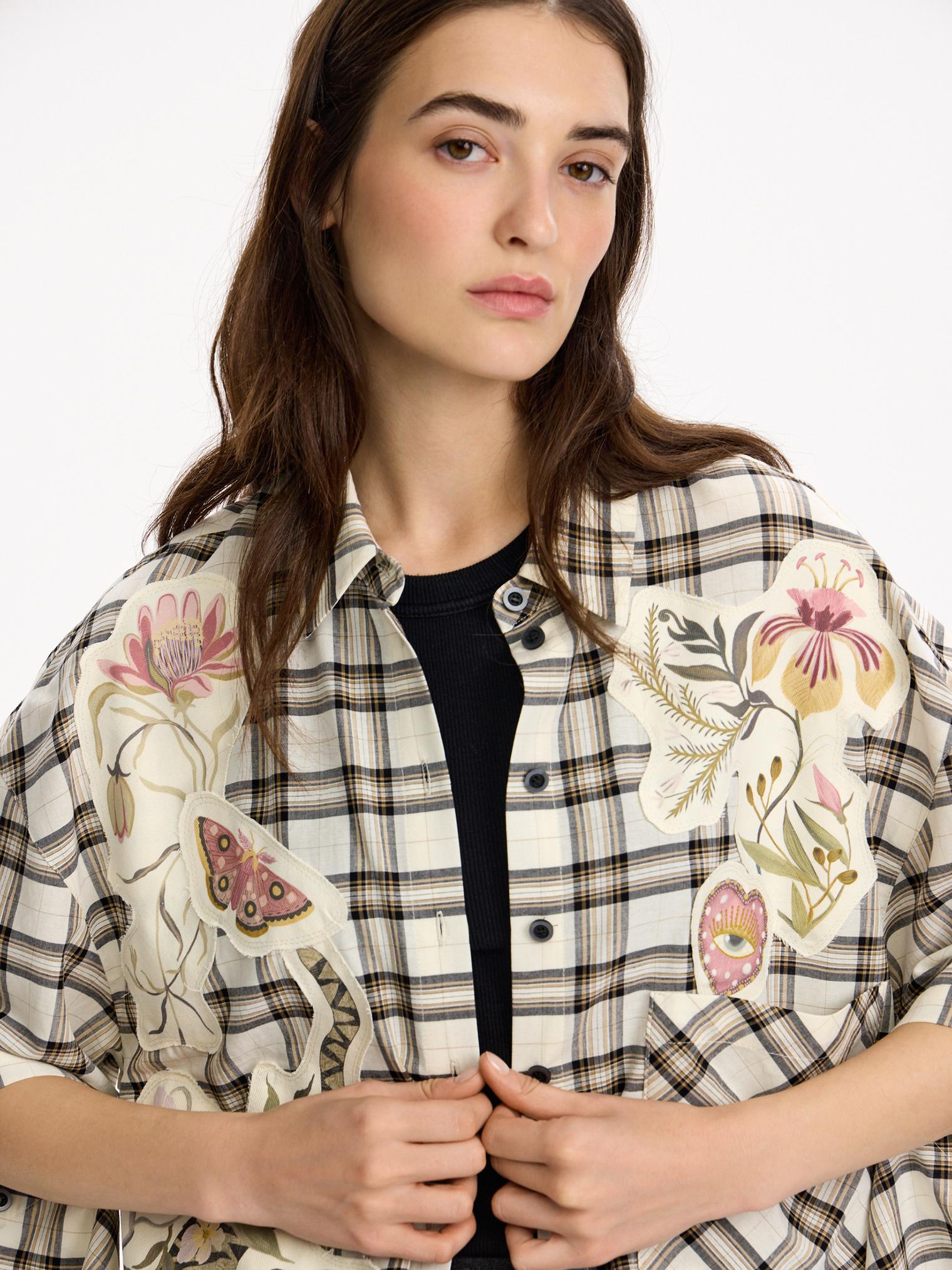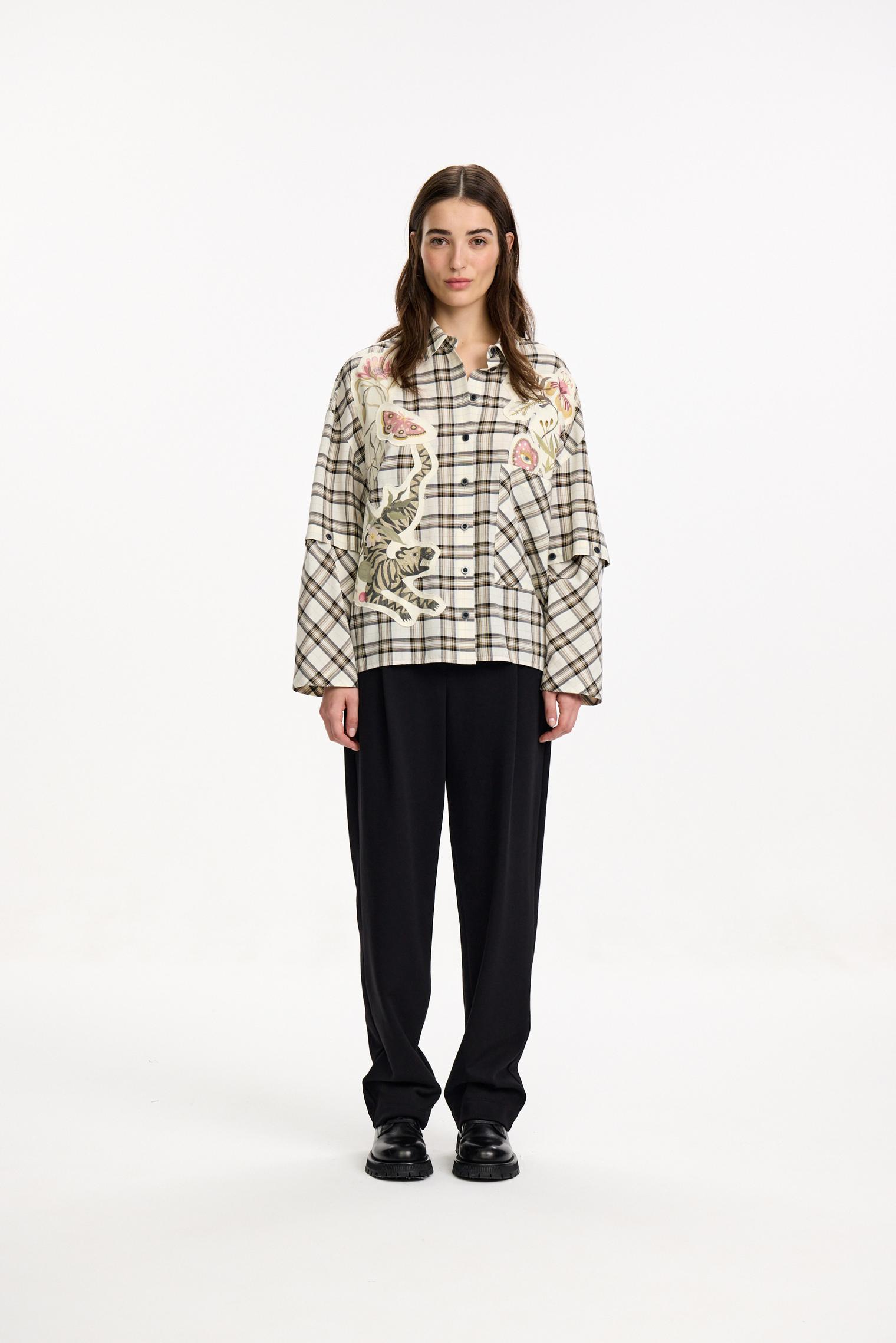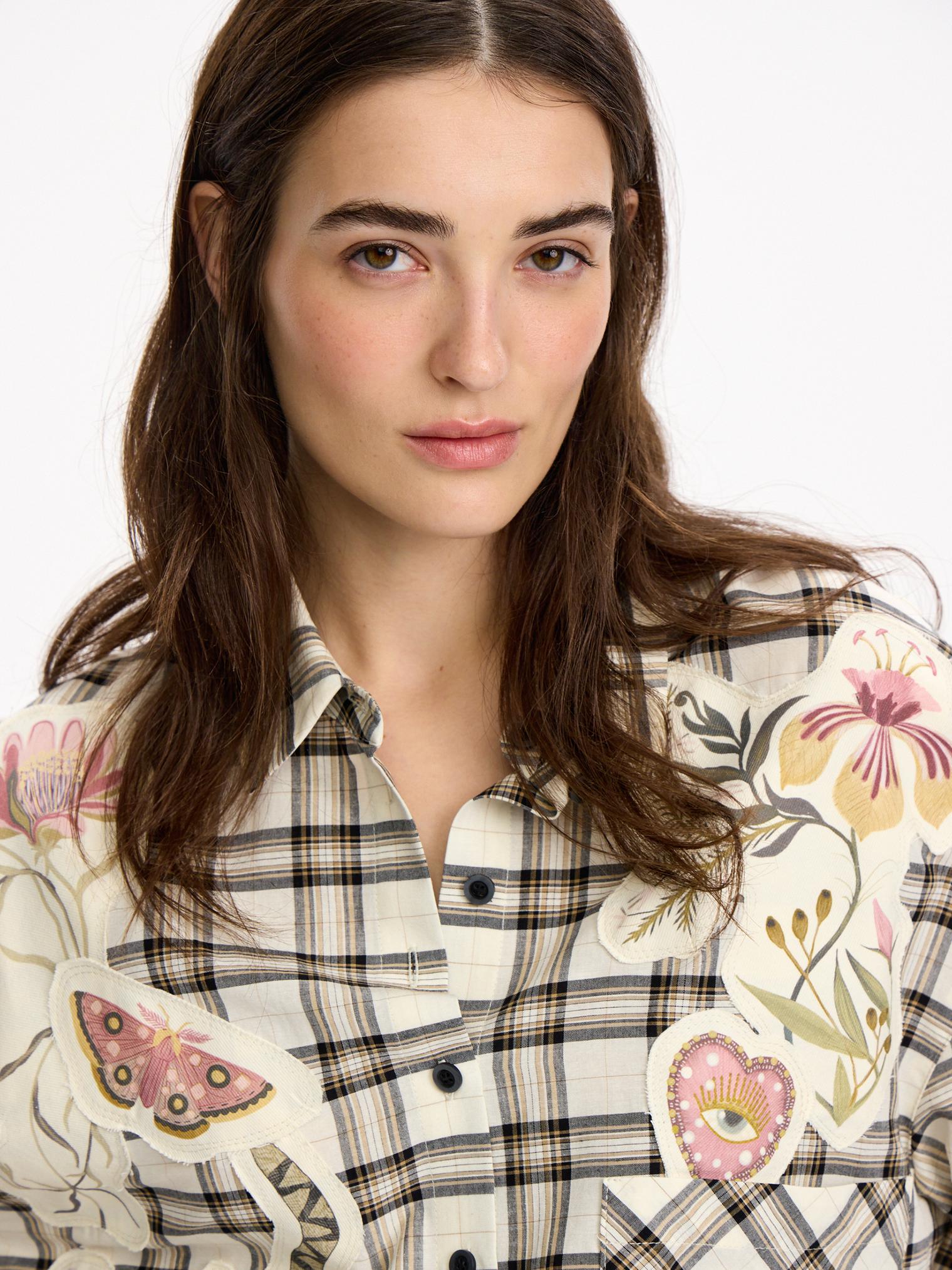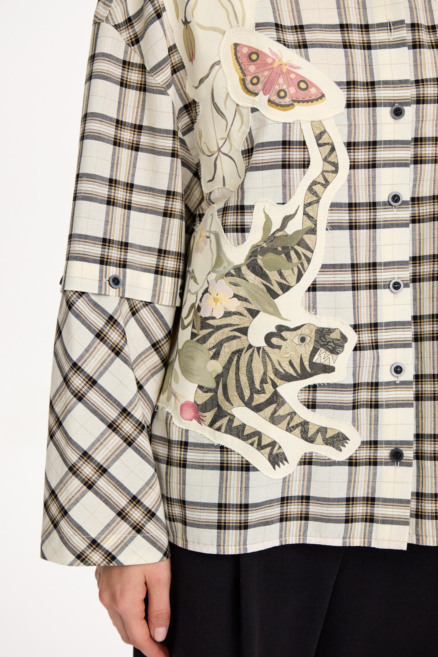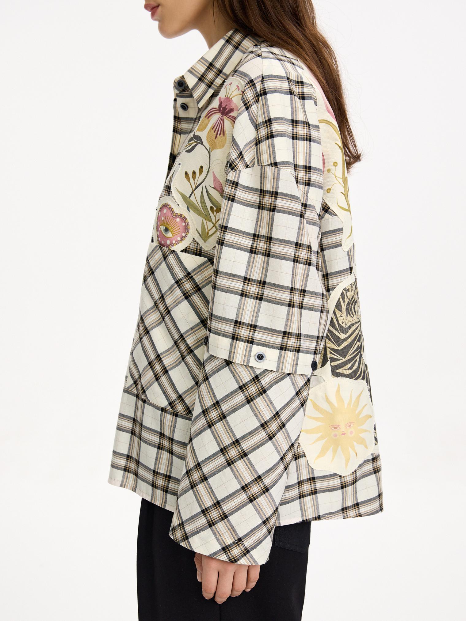 Объемная блуза из смесового хлопка и вискозы. Модель в крупную клетку и нашивки с авторскими принтами, которые настрачиваются практически вручную. Отдельного внимания достойны рукава-трансформеры. После стирки блузка станет еще выразительнее за счет приобретения эффекта гранжевости.