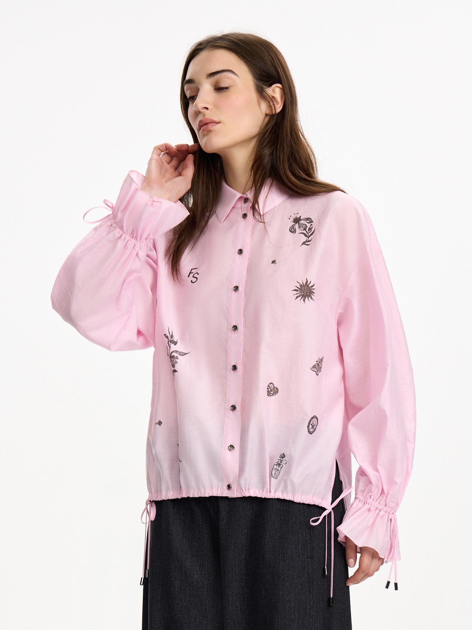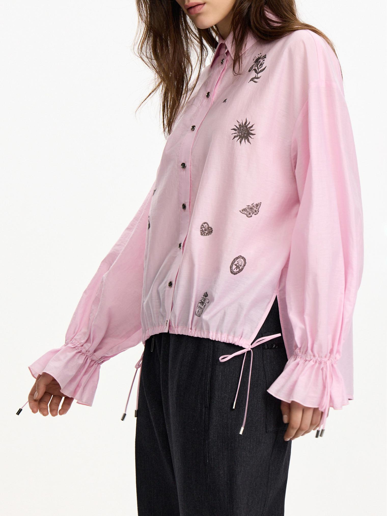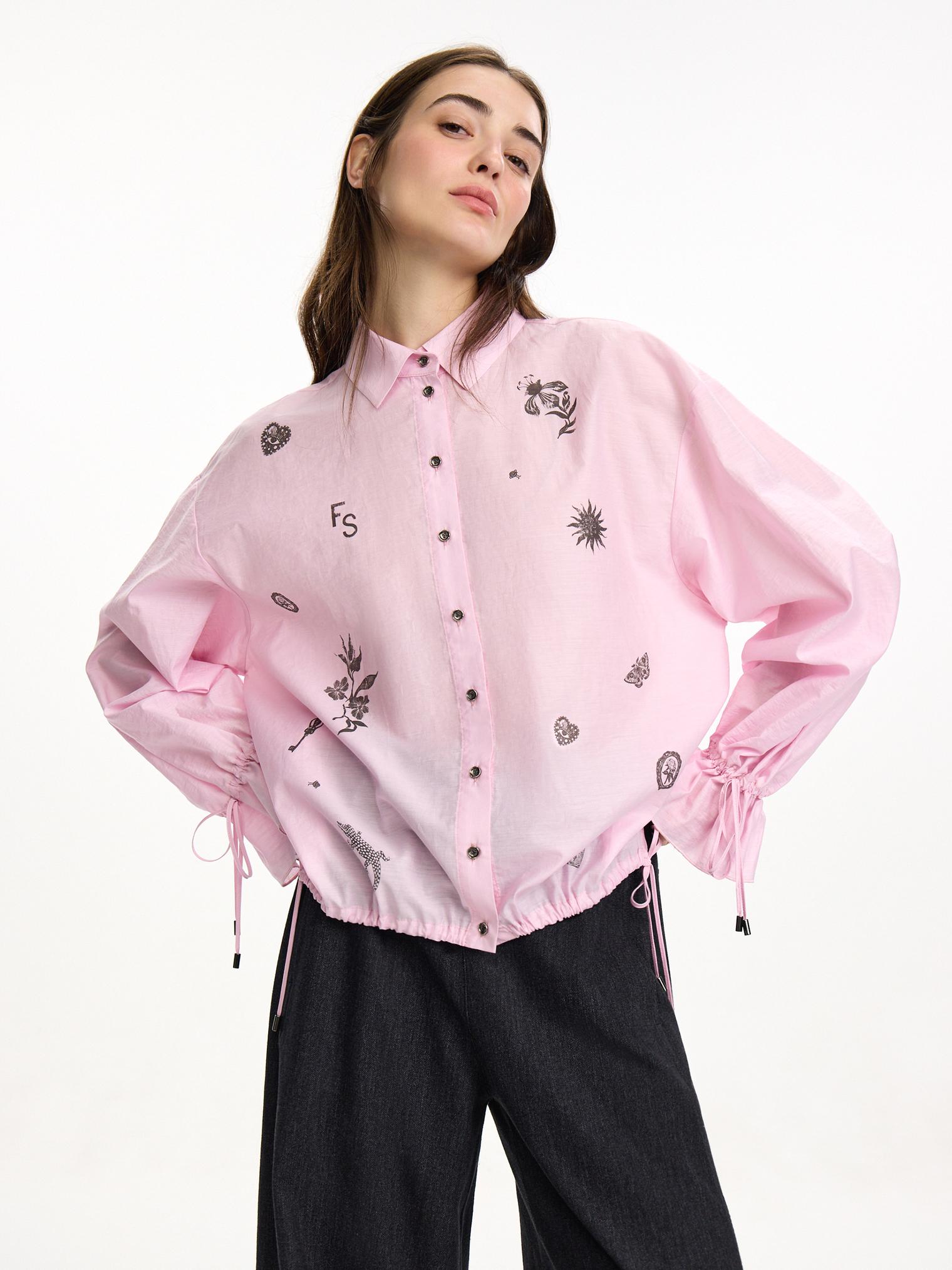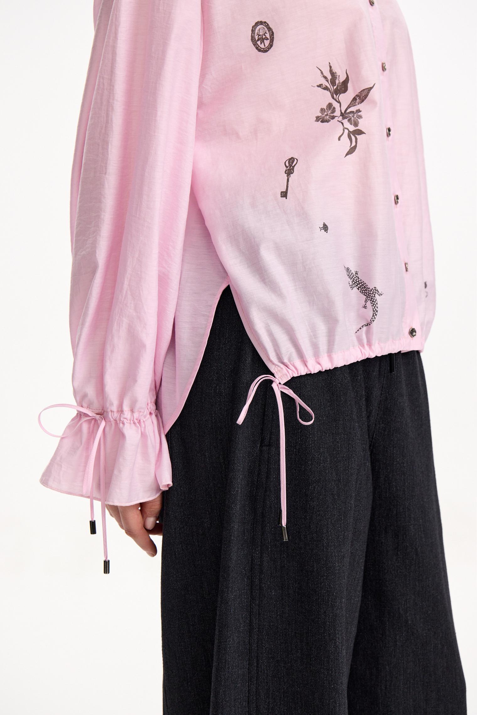Блузка объемного, укороченного кроя из фактурного хлопка. Деликатный принт, сборки на манжетах и кулиска низу полочки, а также зефирный розовый оттенок создают нежное, романтичное настроение. Идеально для прихода весны.