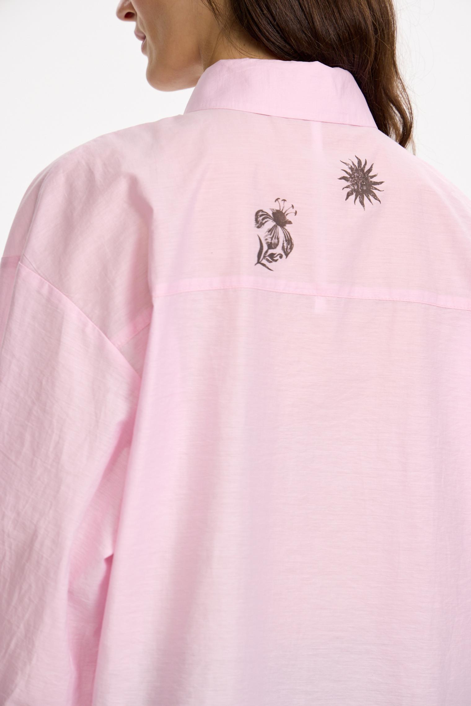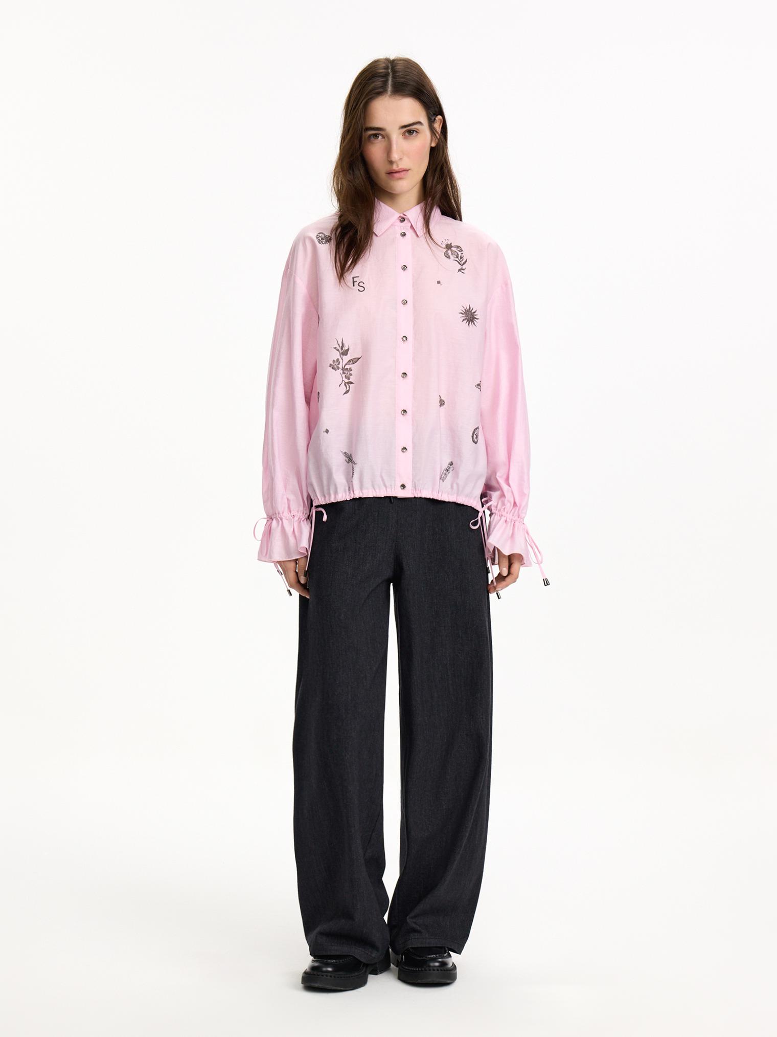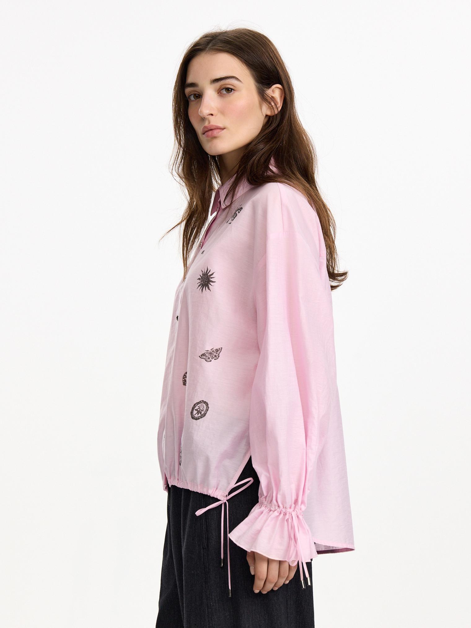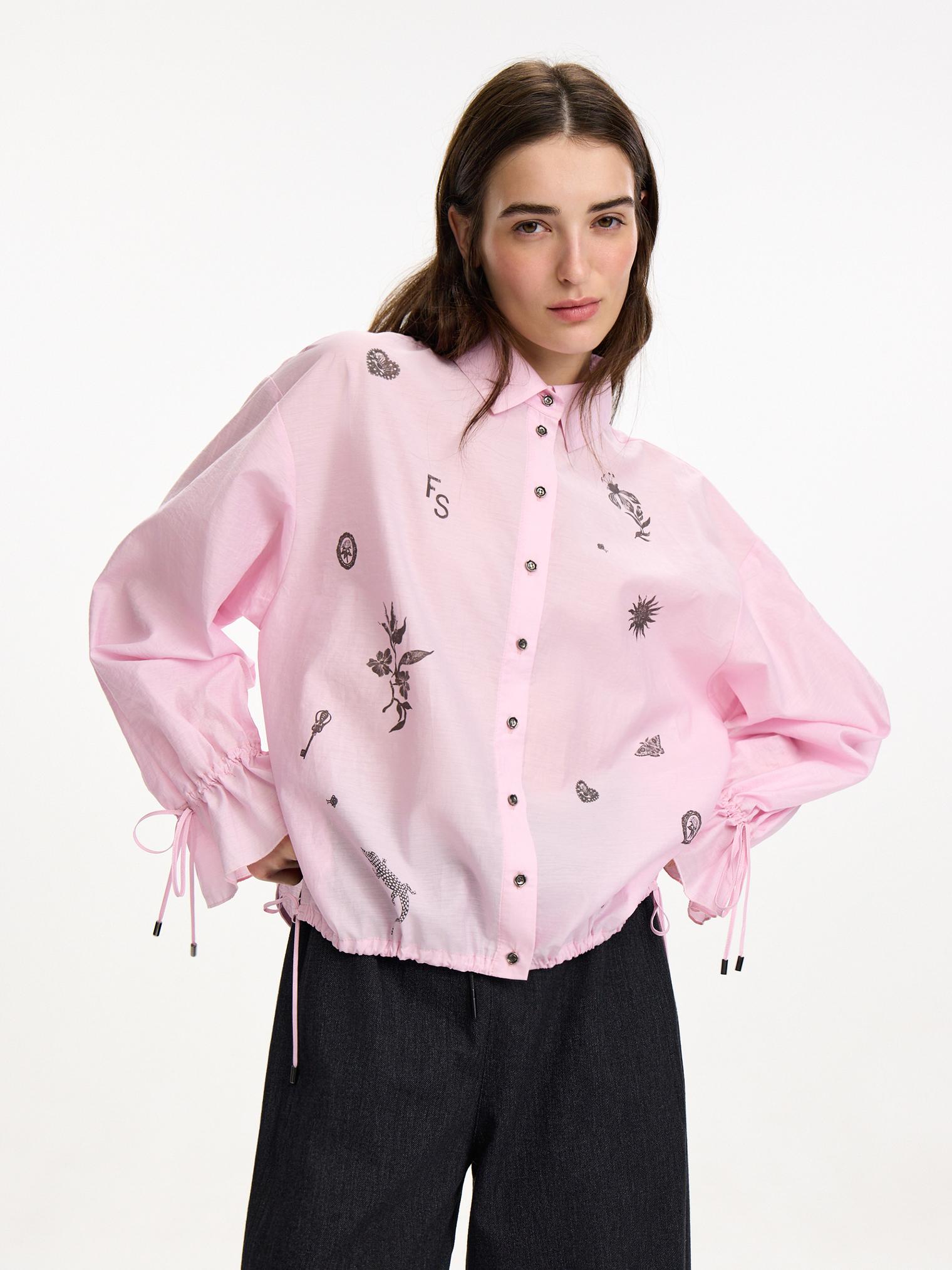 Блузка объемного, укороченного кроя из фактурного хлопка. Деликатный принт, сборки на манжетах и кулиска низу полочки, а также зефирный розовый оттенок создают нежное, романтичное настроение. Идеально для прихода весны.
