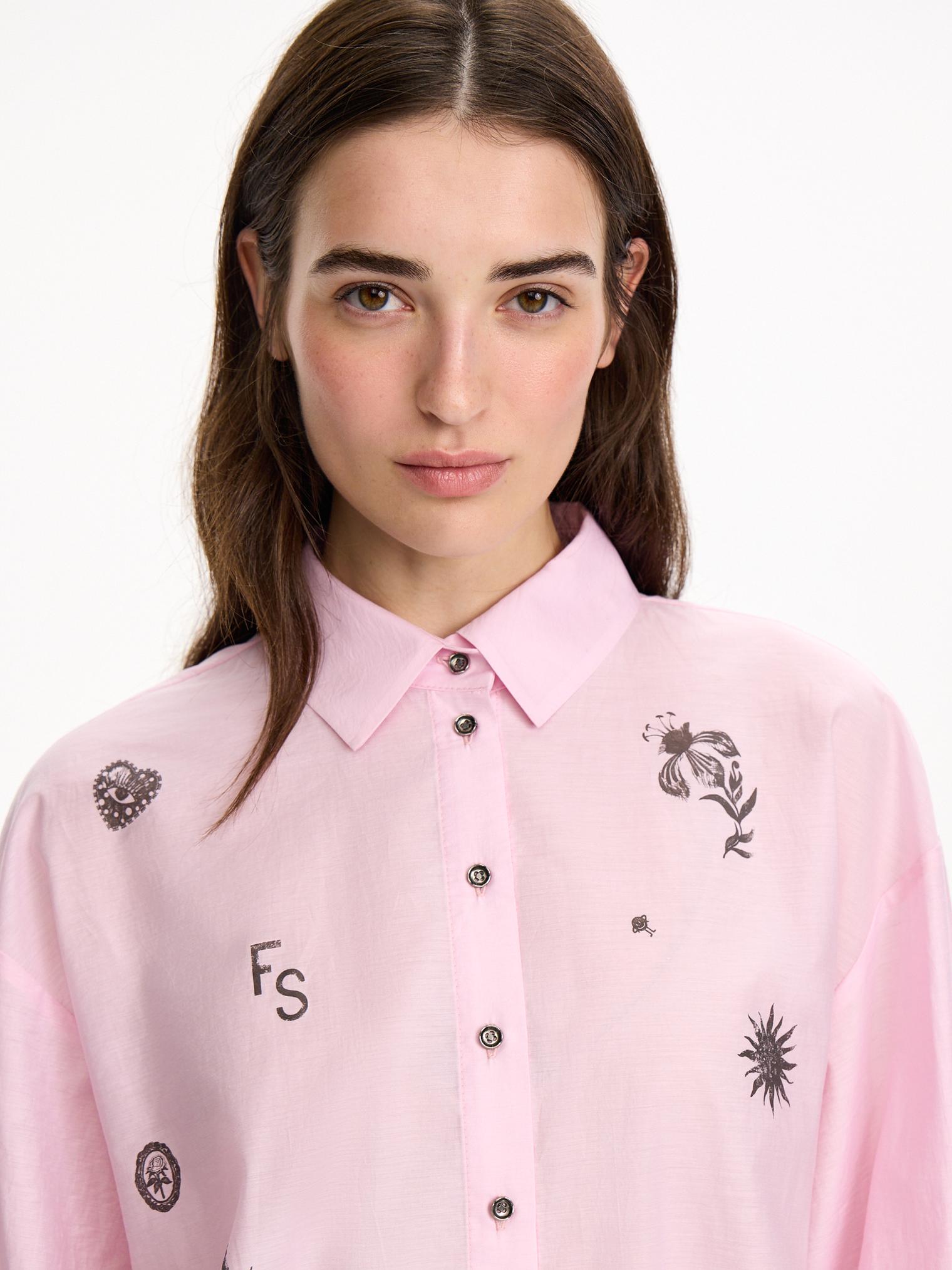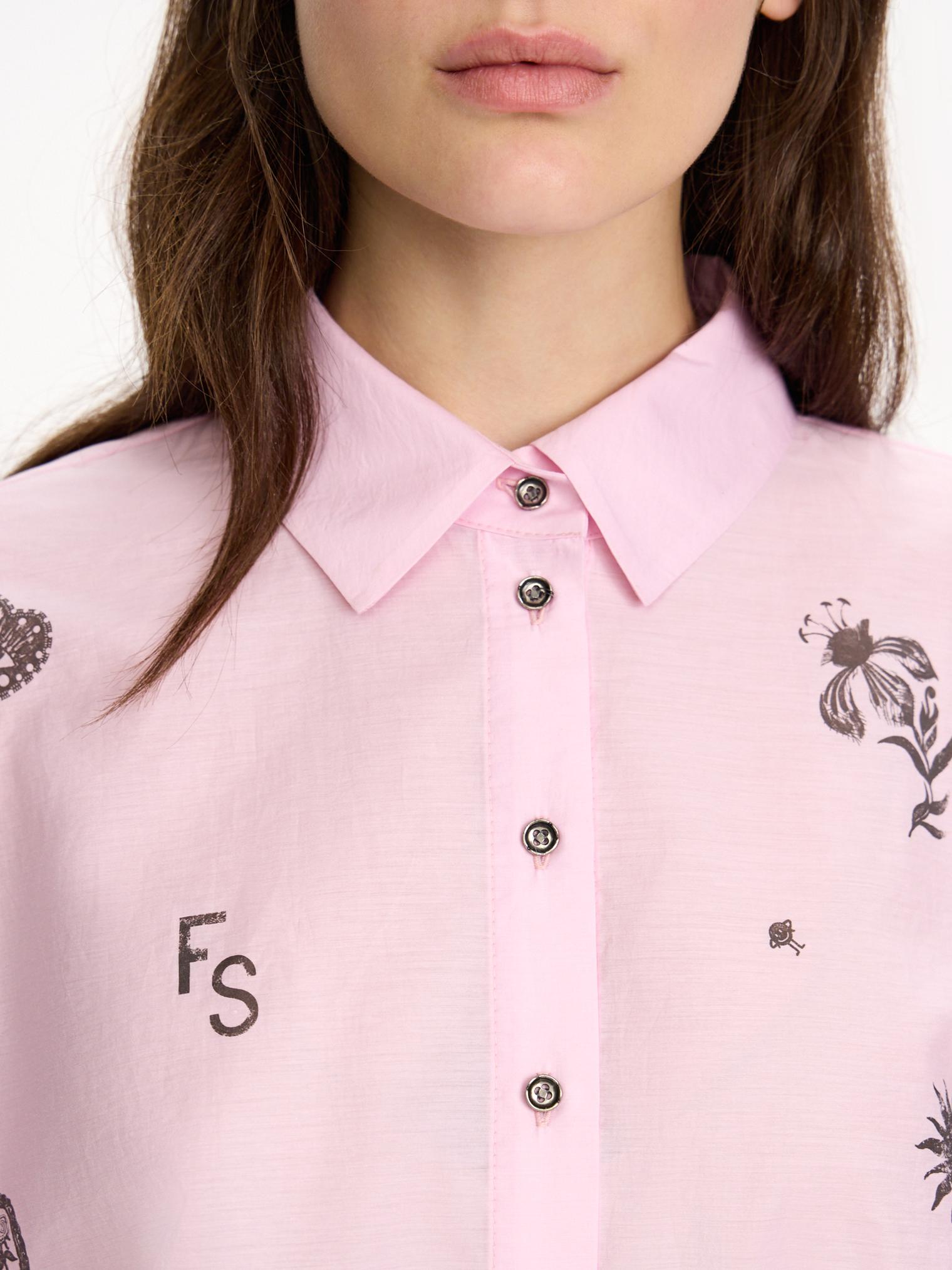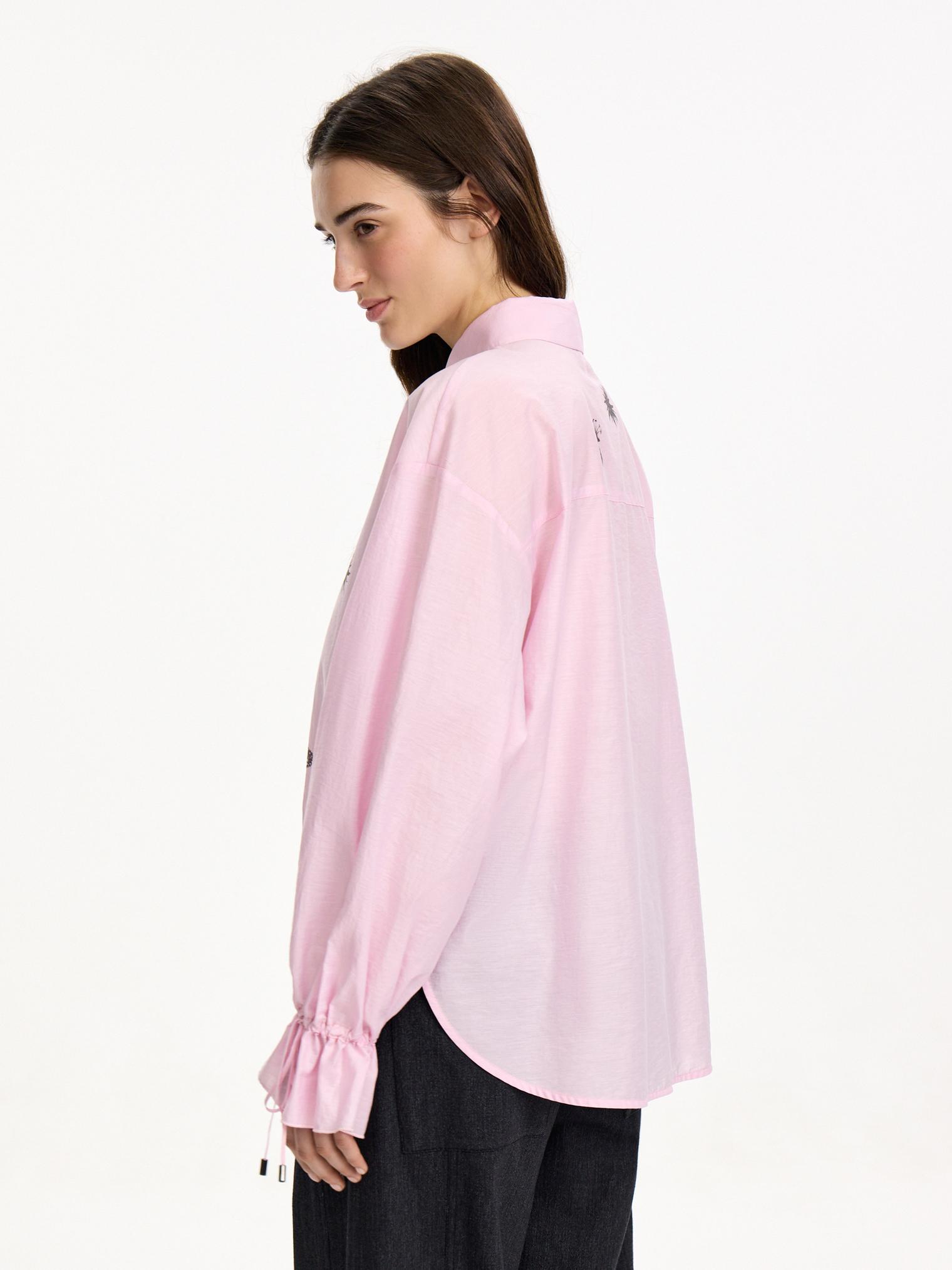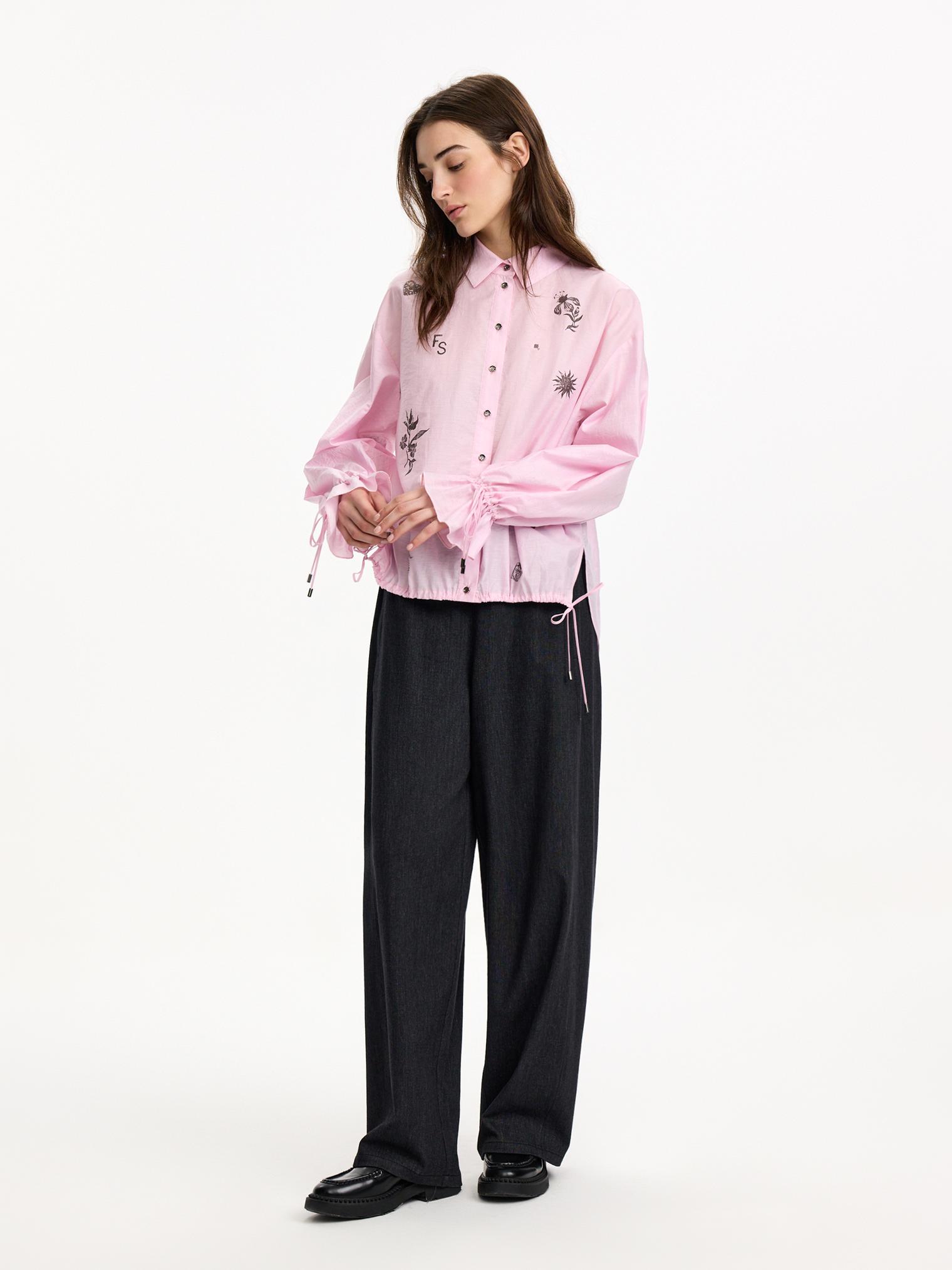 Блузка объемного, укороченного кроя из фактурного хлопка. Деликатный принт, сборки на манжетах и кулиска низу полочки, а также зефирный розовый оттенок создают нежное, романтичное настроение. Идеально для прихода весны.