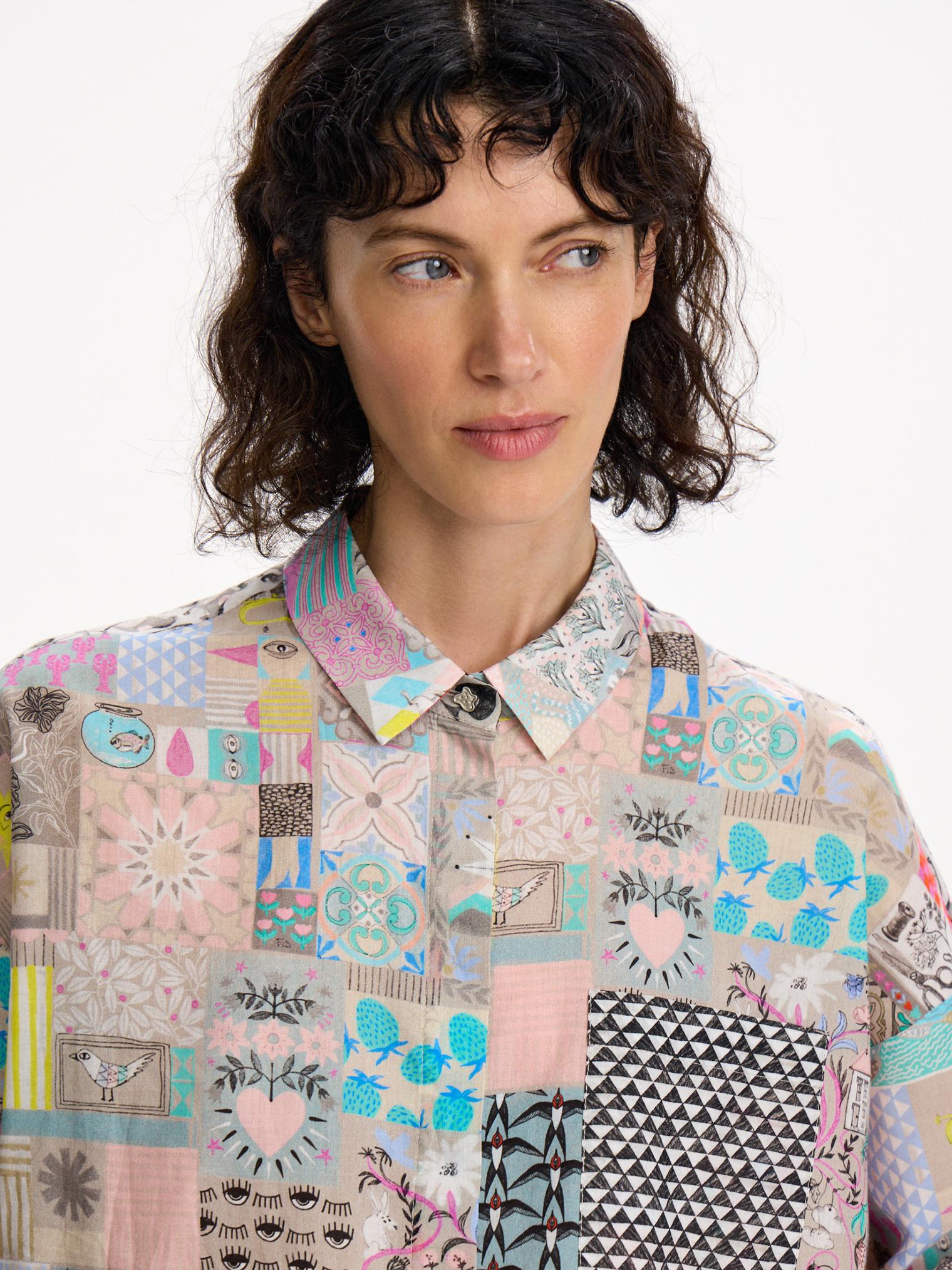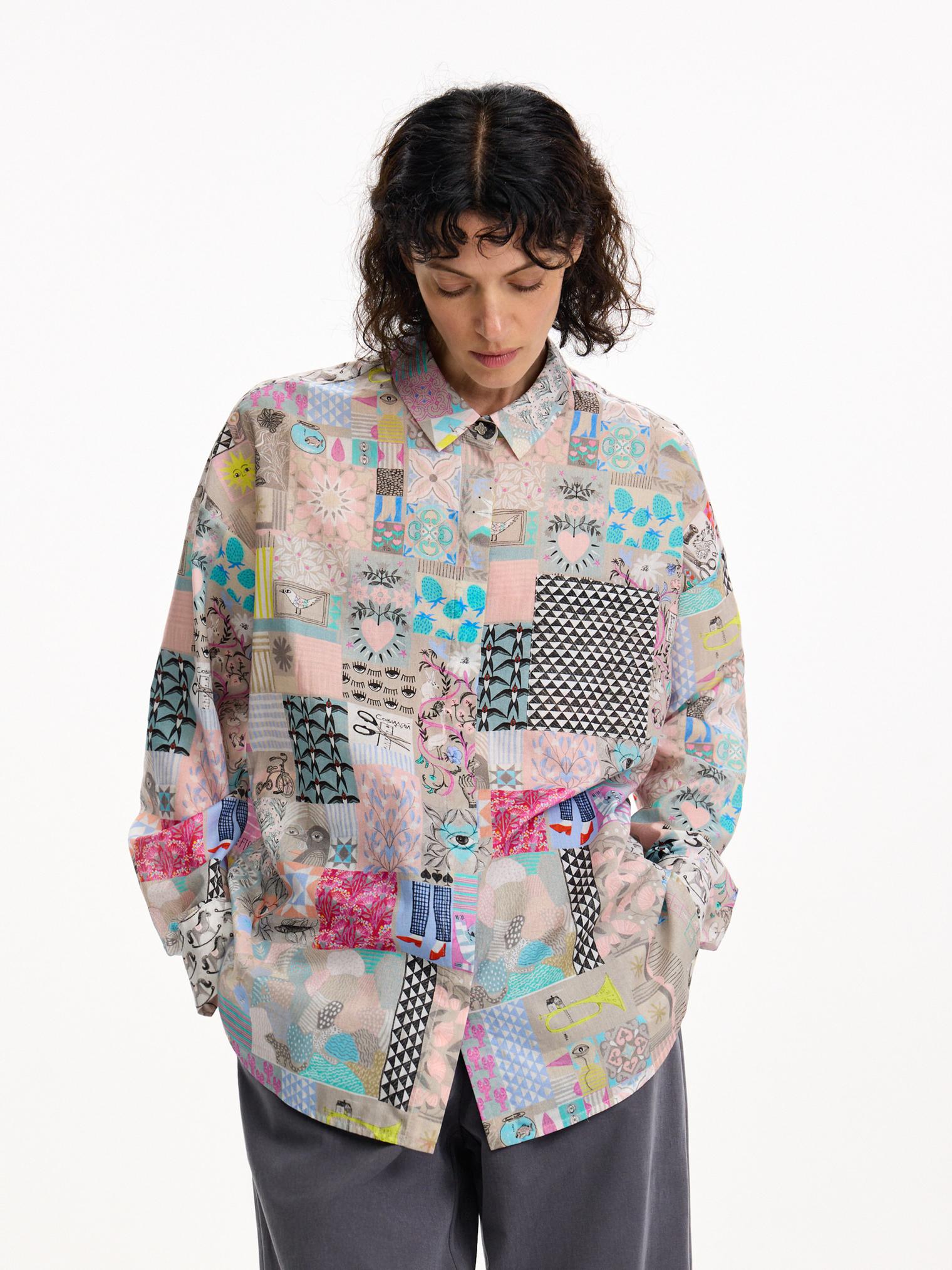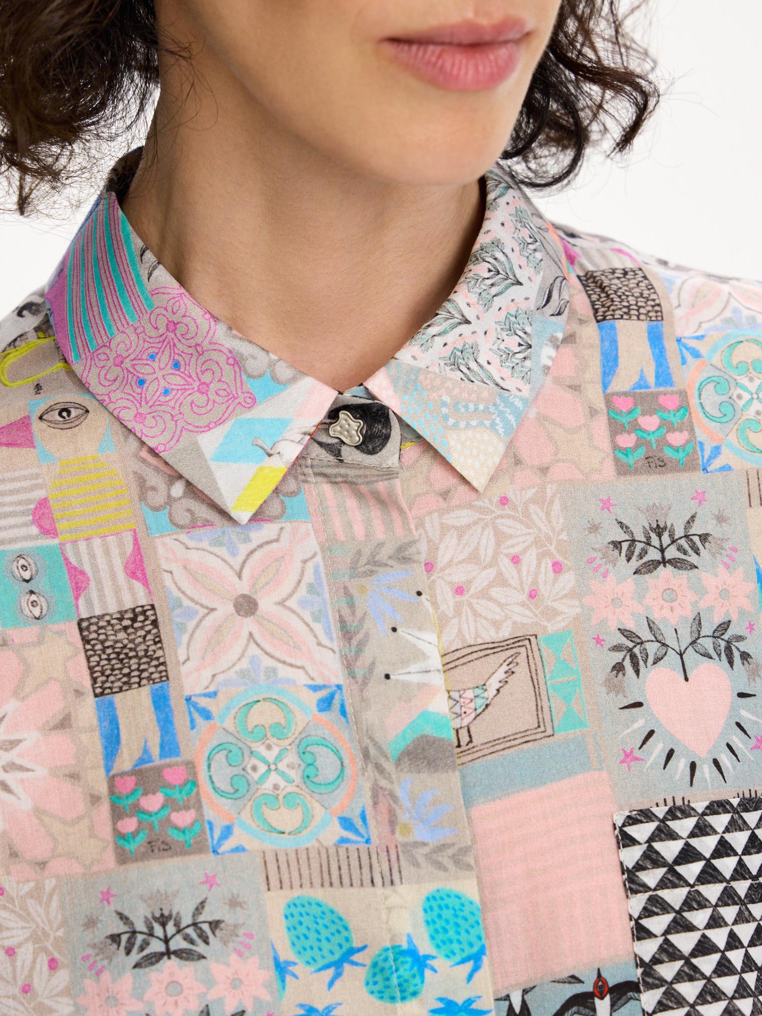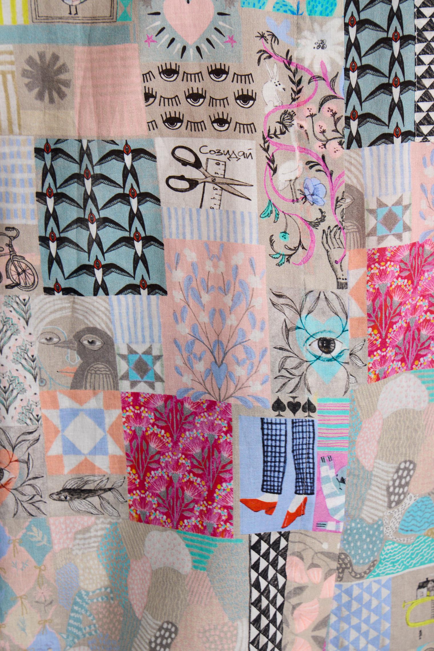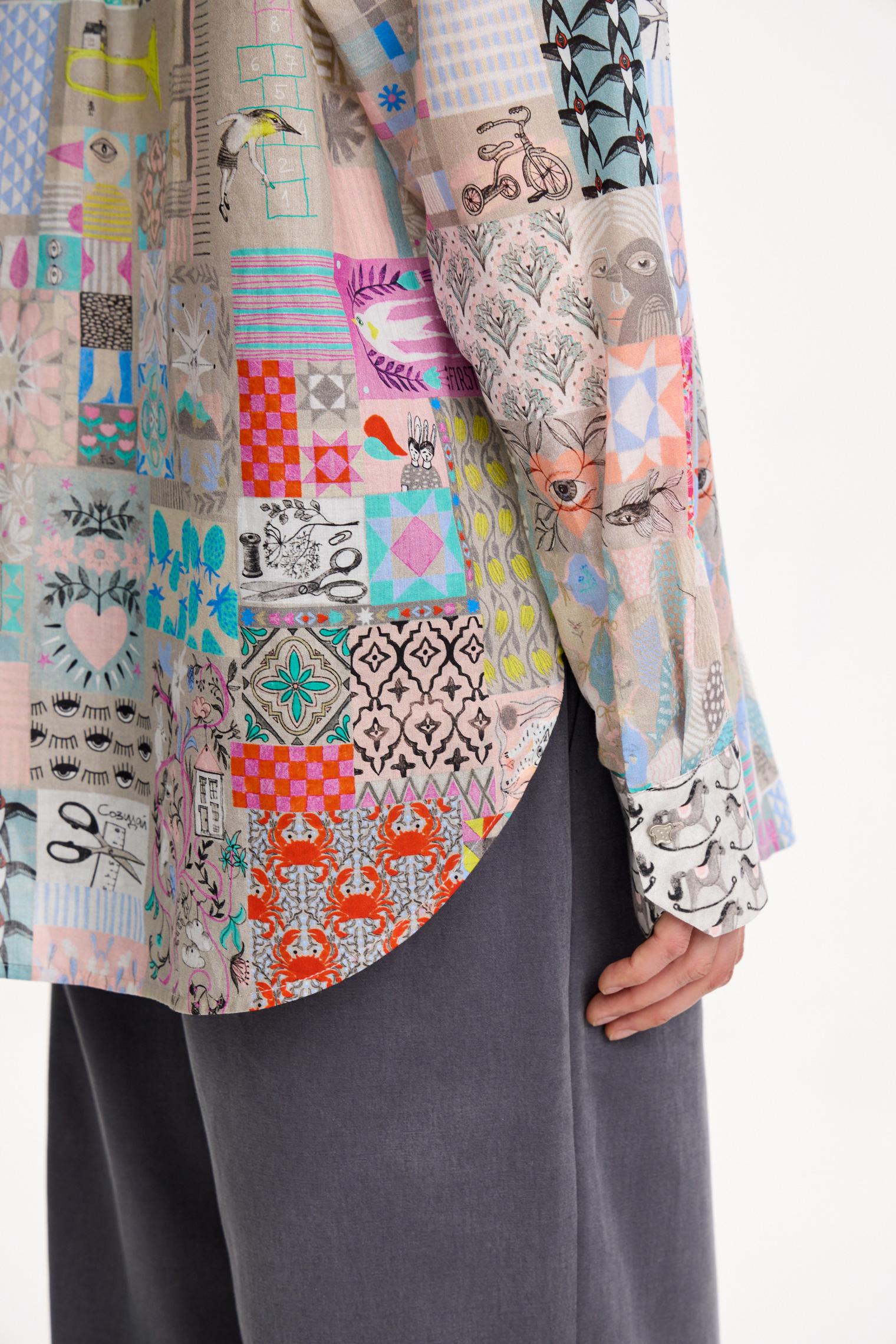 Наш классический фасон блузки украшен ярким, необычным принтом в коллажной технике. Модель из натурального хлопка виаль придаст весеннего настроения и поможет бороться с сезонным авитаминозом.