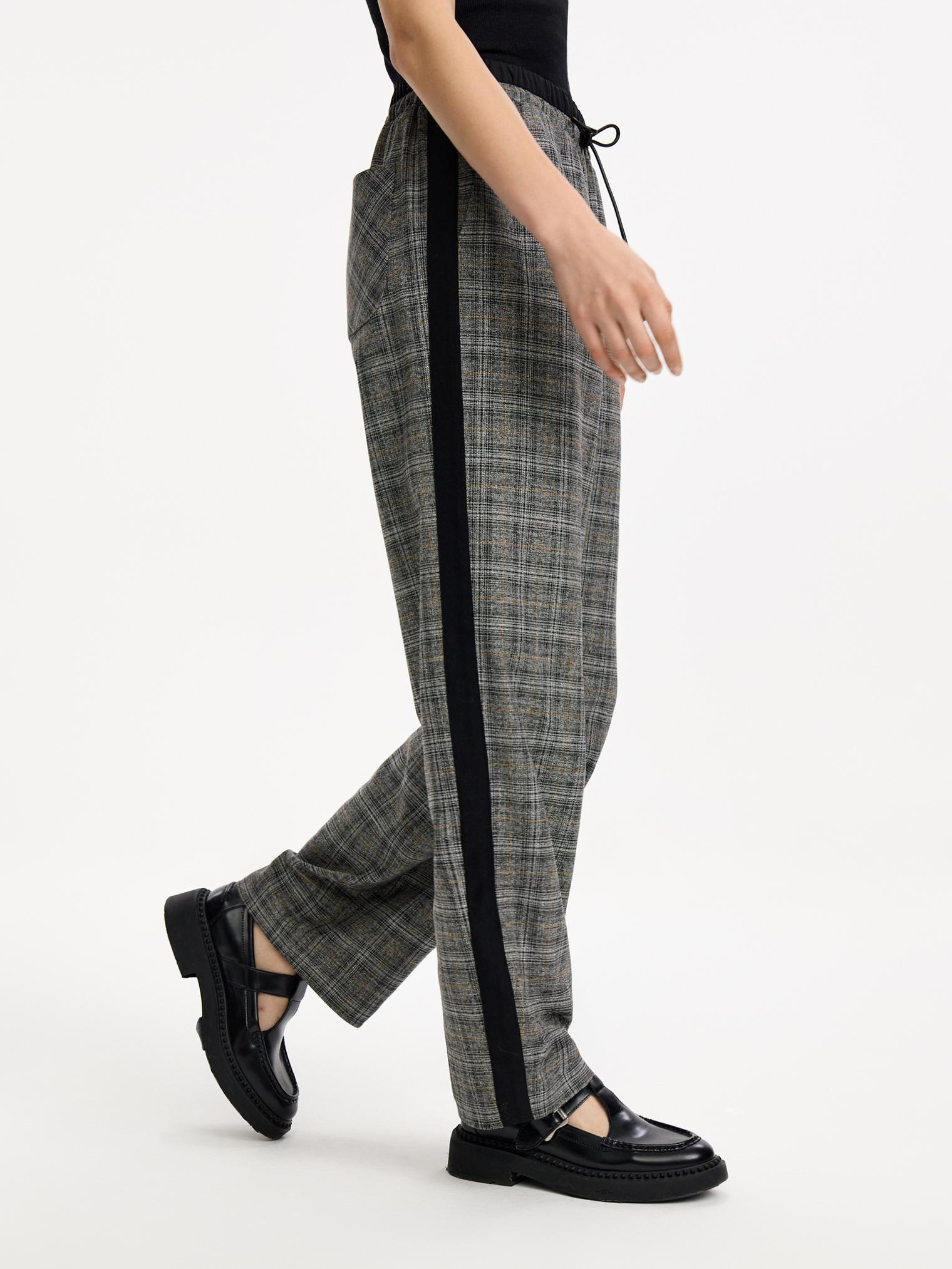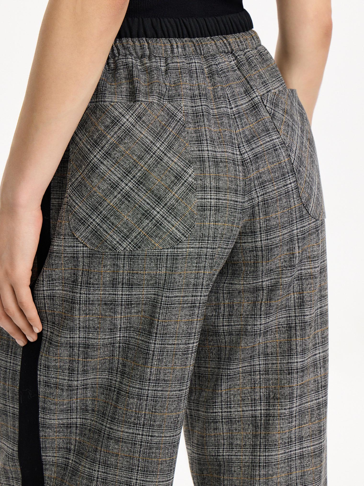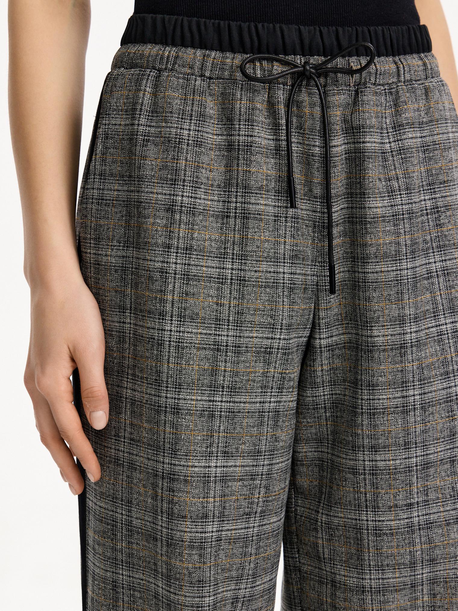 Брюки расслабленного кроя из комбинированного хлопка в клетку. Модель на эластичном поясе с кулиске. В брюках будет удобно в любое время суток. Контрастные лампасы оживляют традиционную клетку и визуально вытягивают силуэт.