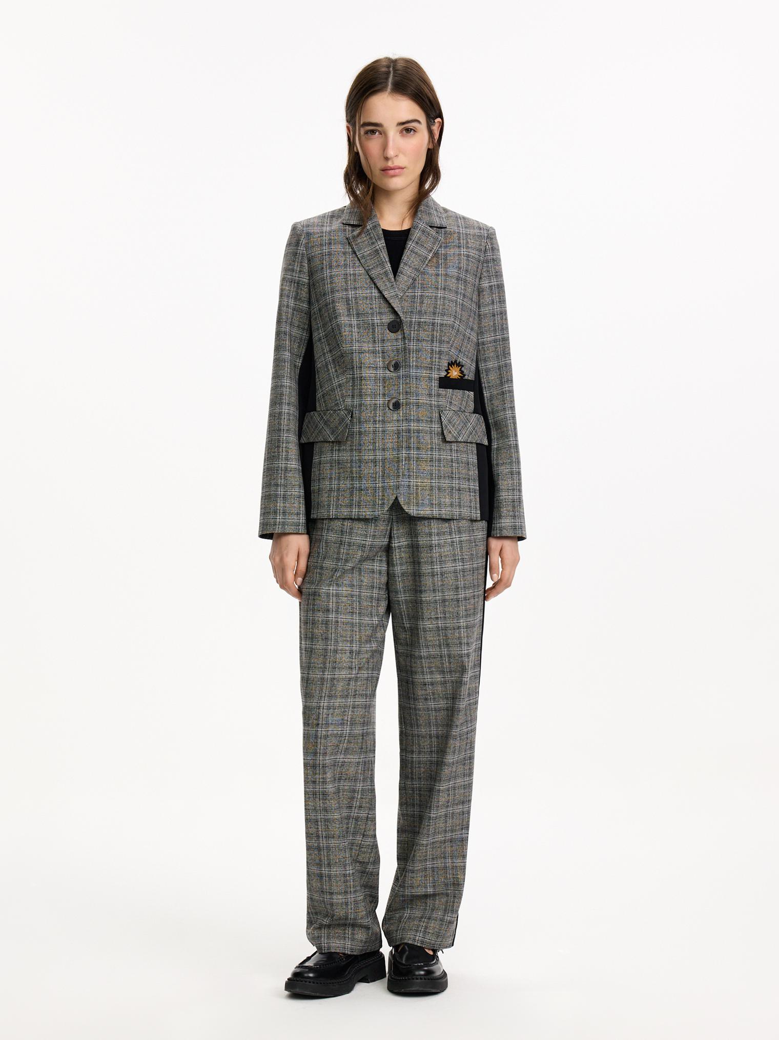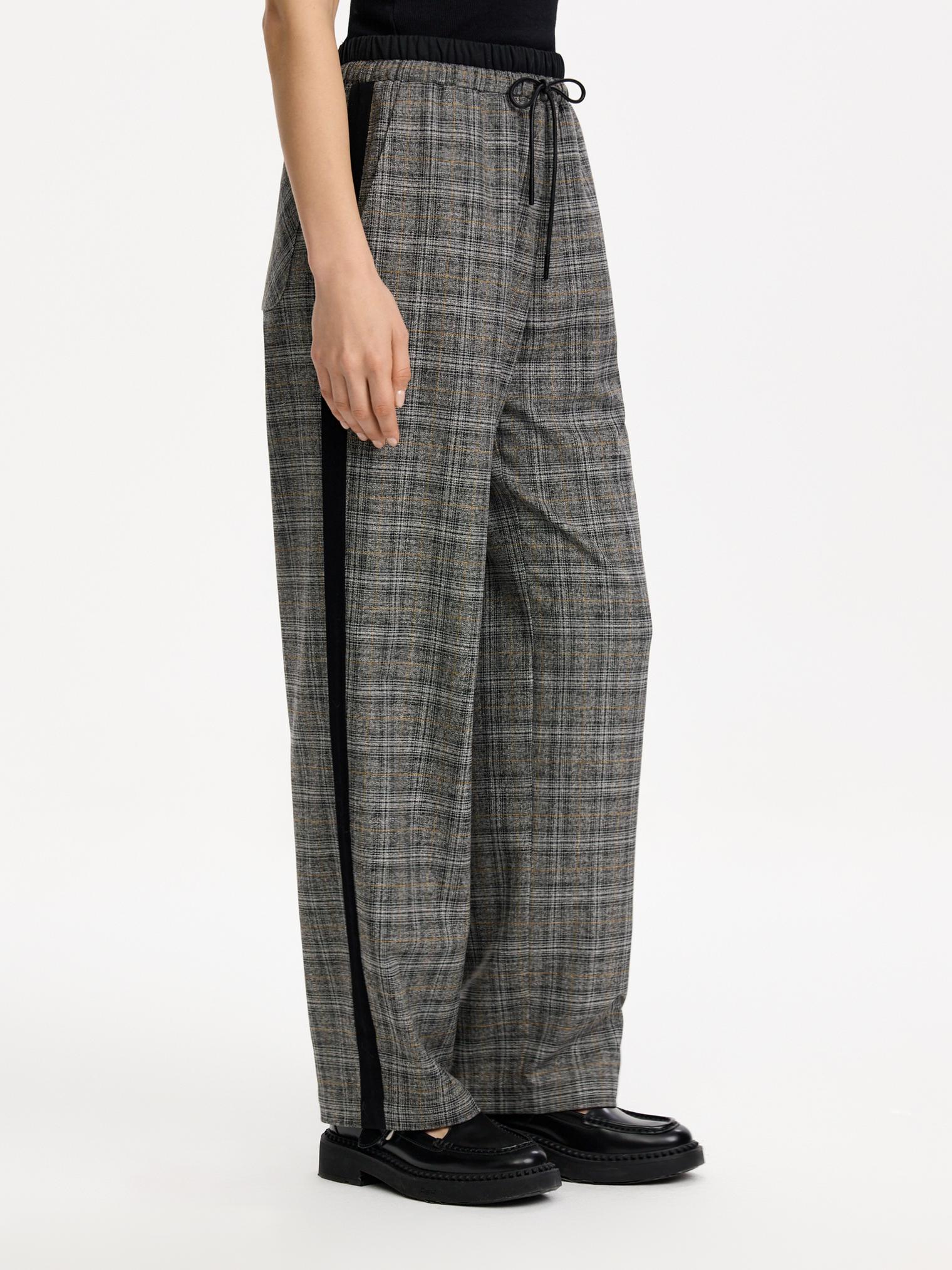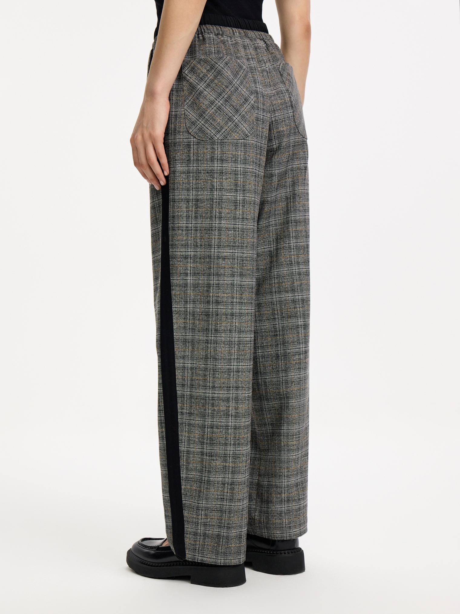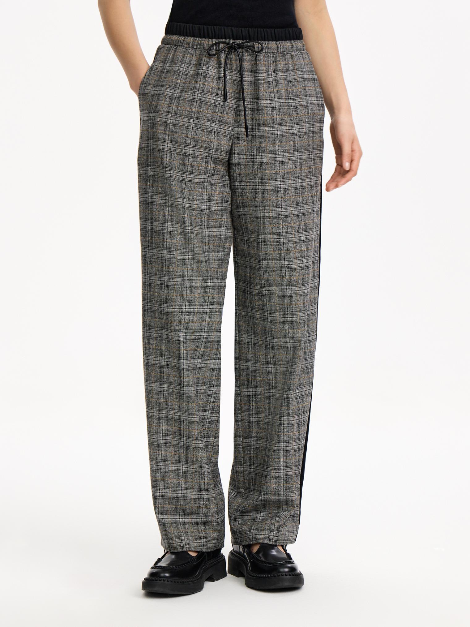 Брюки расслабленного кроя из комбинированного хлопка в клетку. Модель на эластичном поясе с кулиске. В брюках будет удобно в любое время суток. Контрастные лампасы оживляют традиционную клетку и визуально вытягивают силуэт.