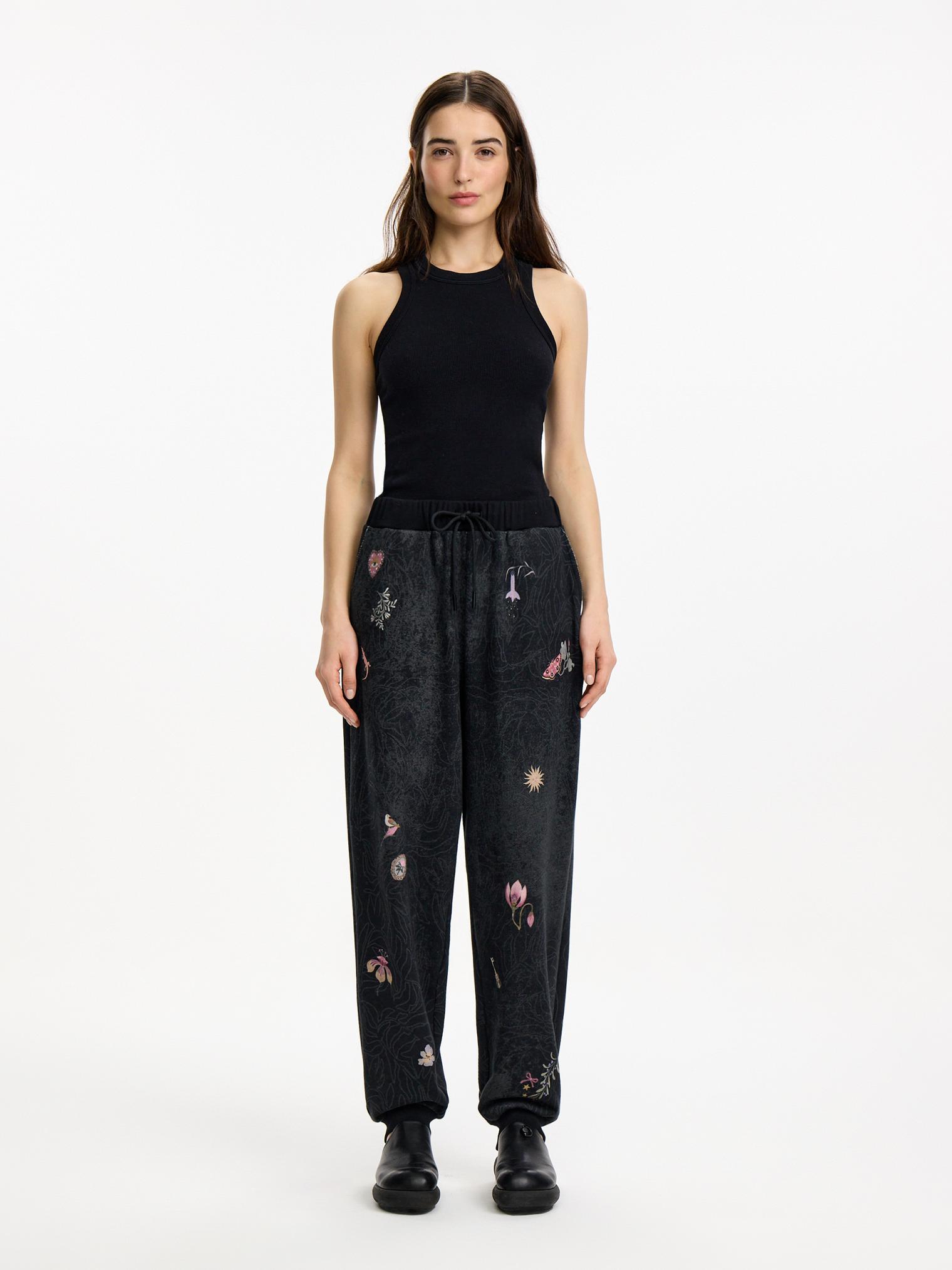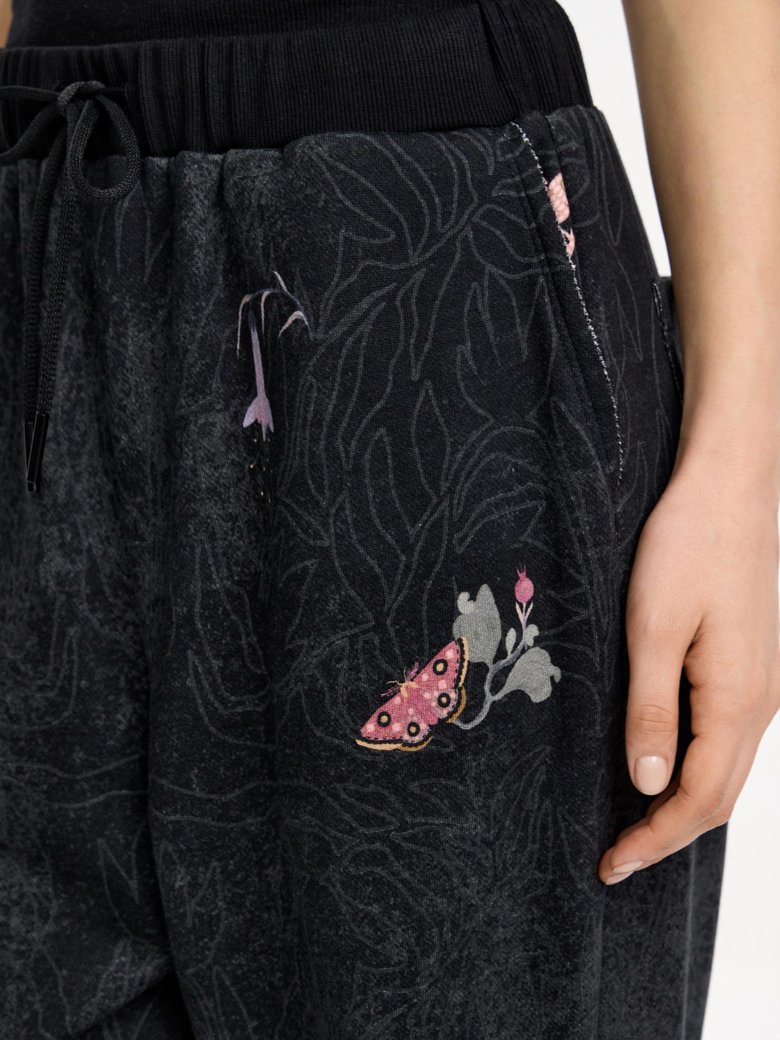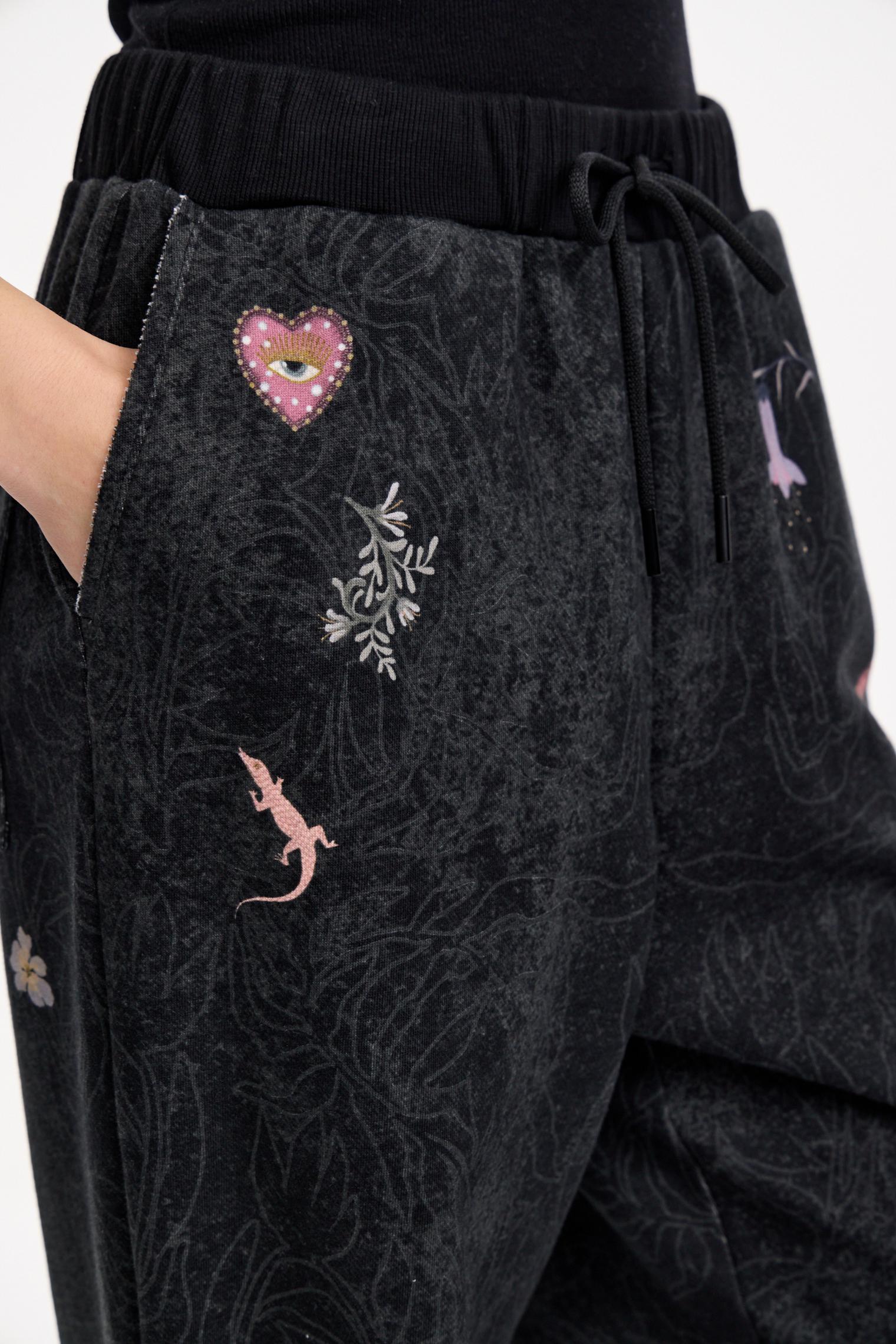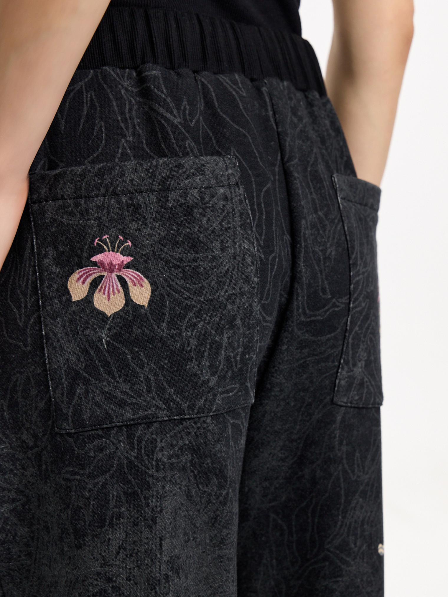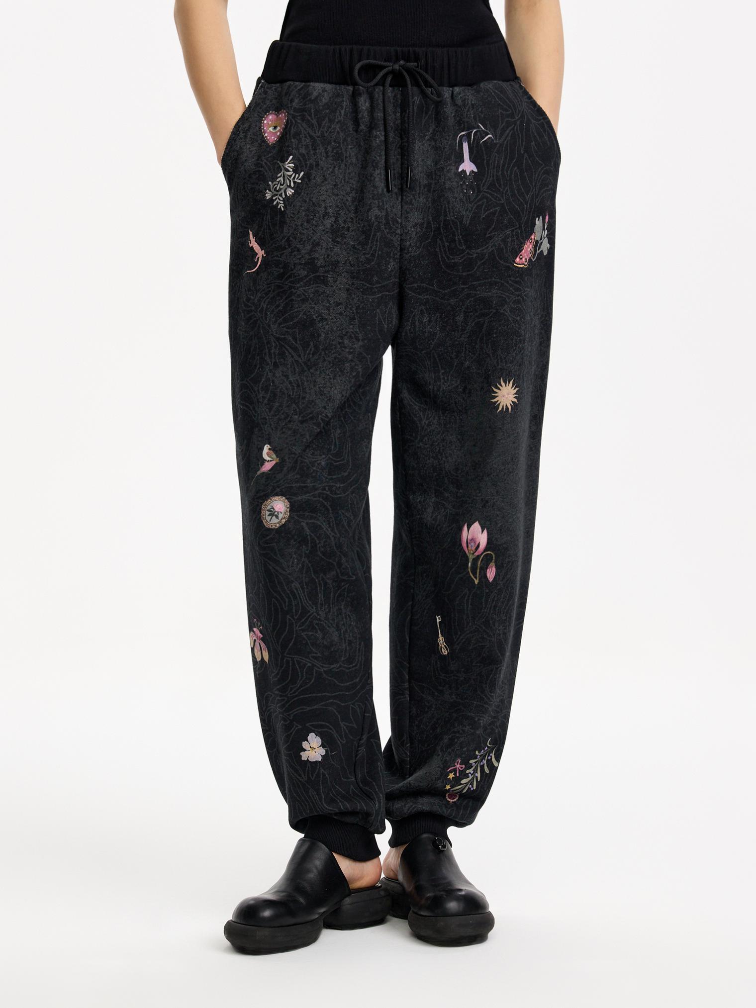 Брюки-джоггеры из хлопкового футера трехнитки. Модель с комфортной талией на эластичной резинке. Универсальный кэжуал с акцентными деталями: контрастным принтом и узором по всей поверхности.