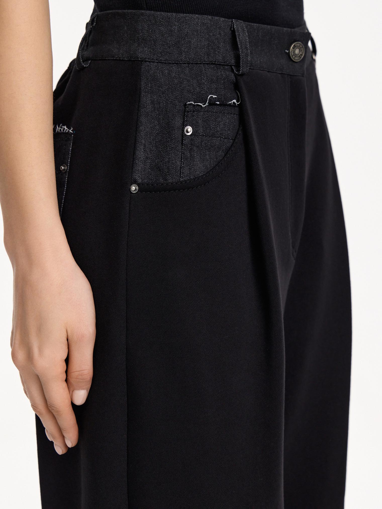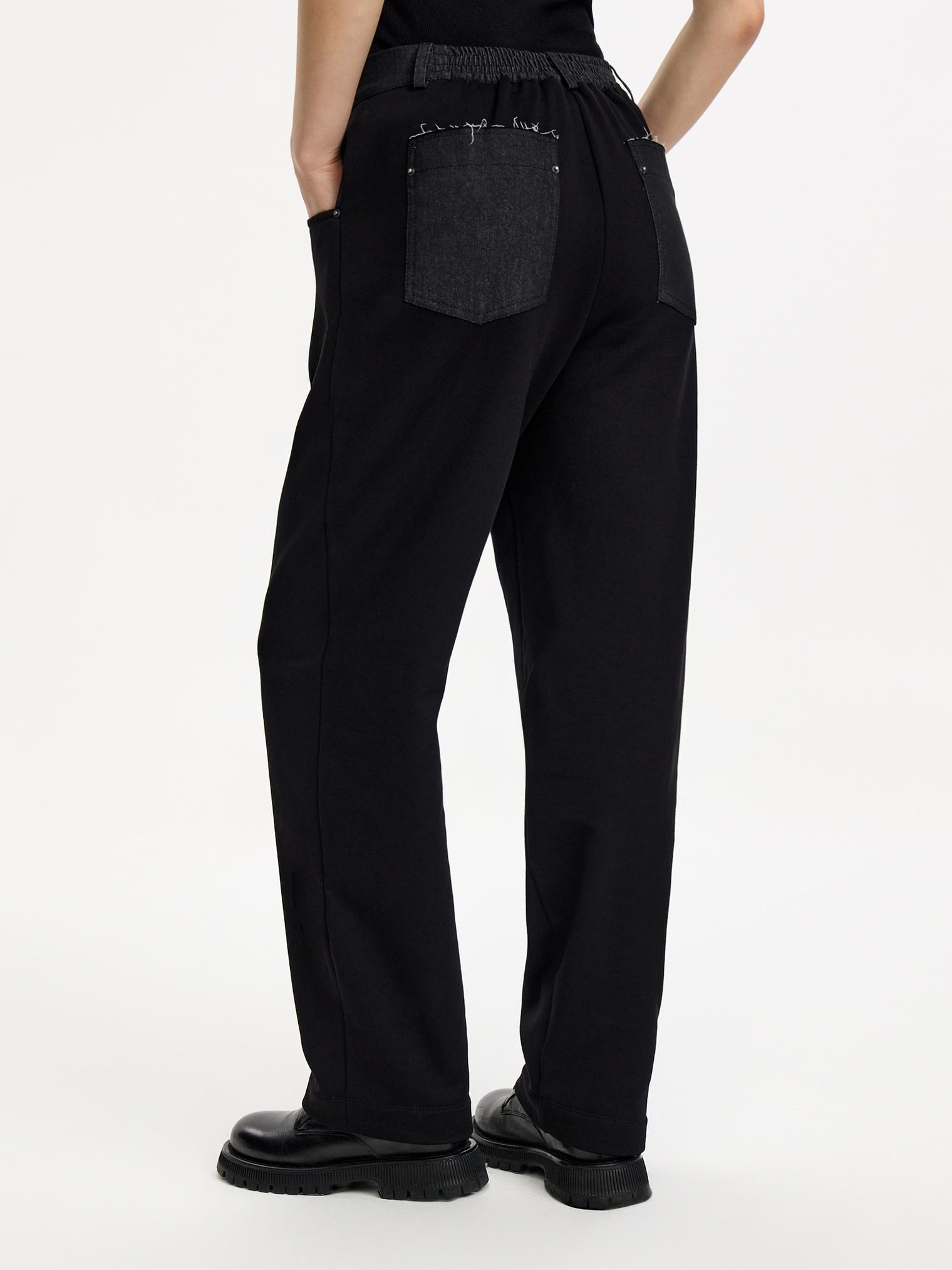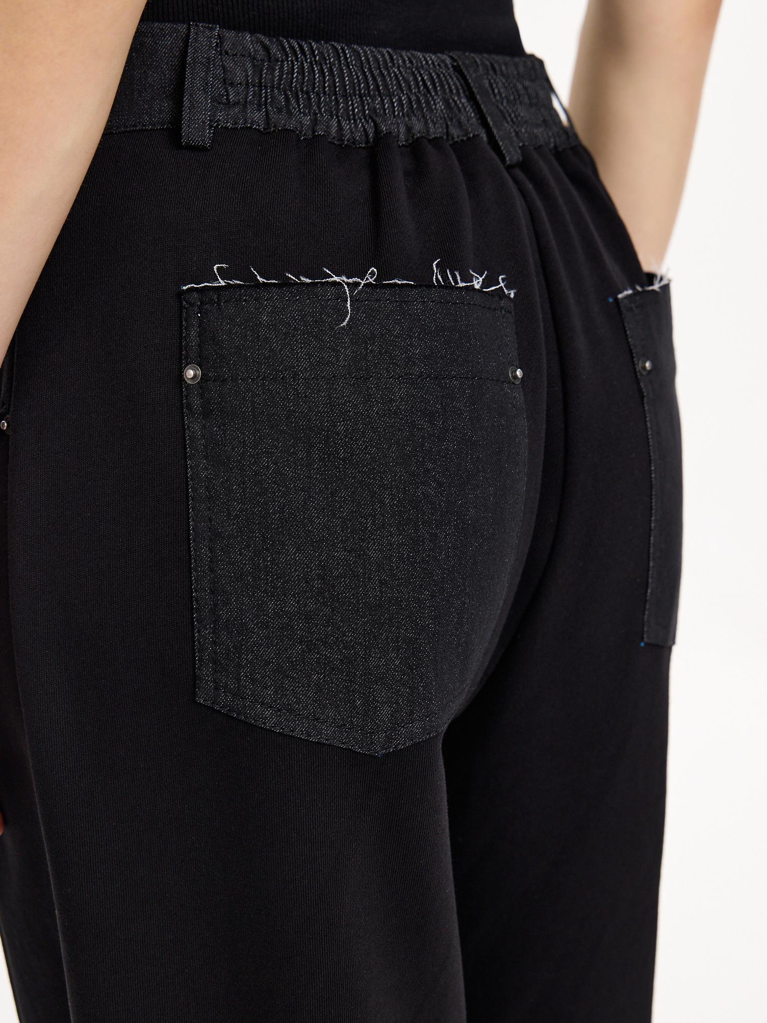 Брюки скомбинированы из хлопкового трикотажа супима с джинсовыми вставками. Модель прямого кроя оформлена брендированным лого на съемном карабине. Идеальный выбор для творческих модников.