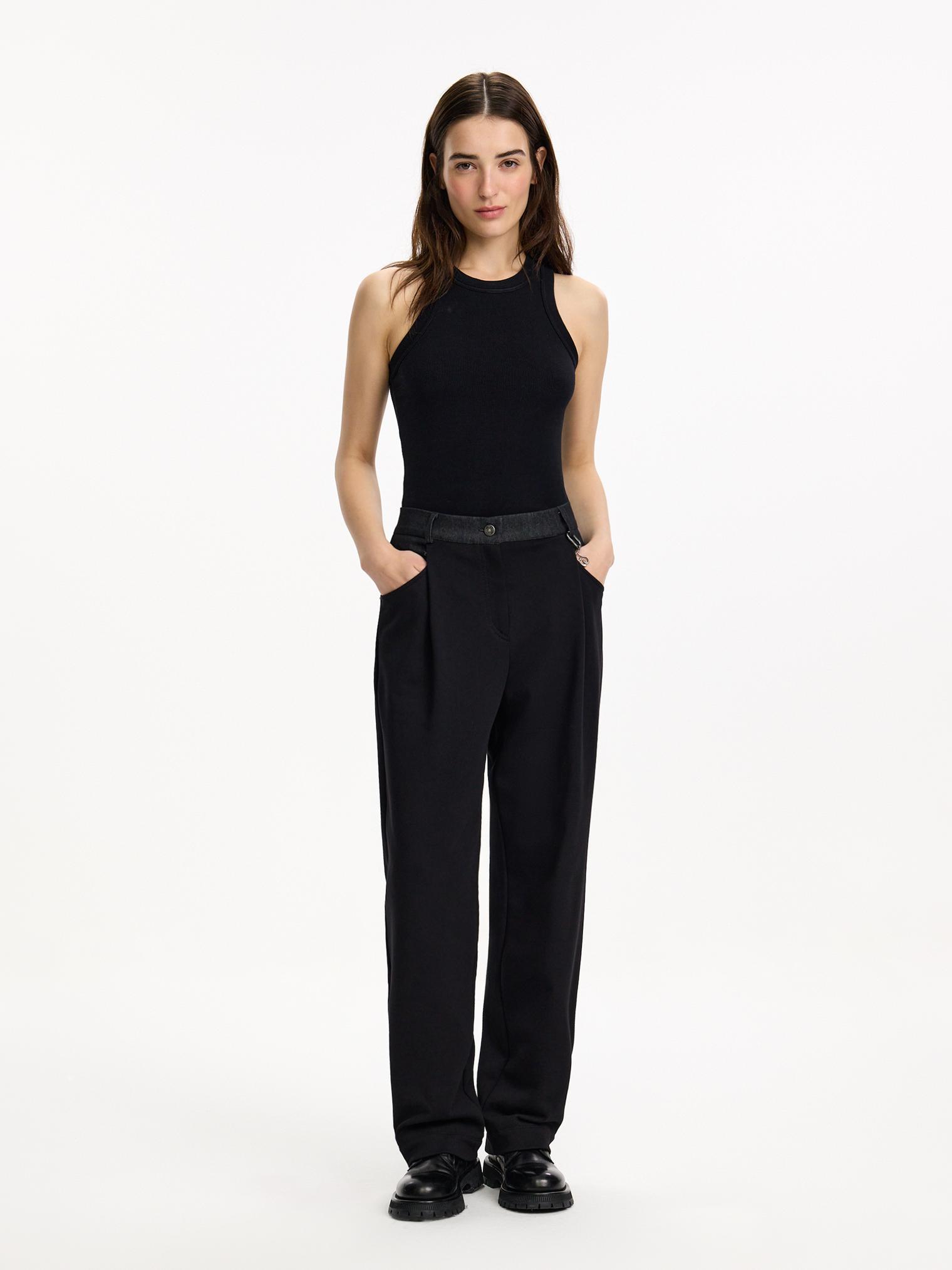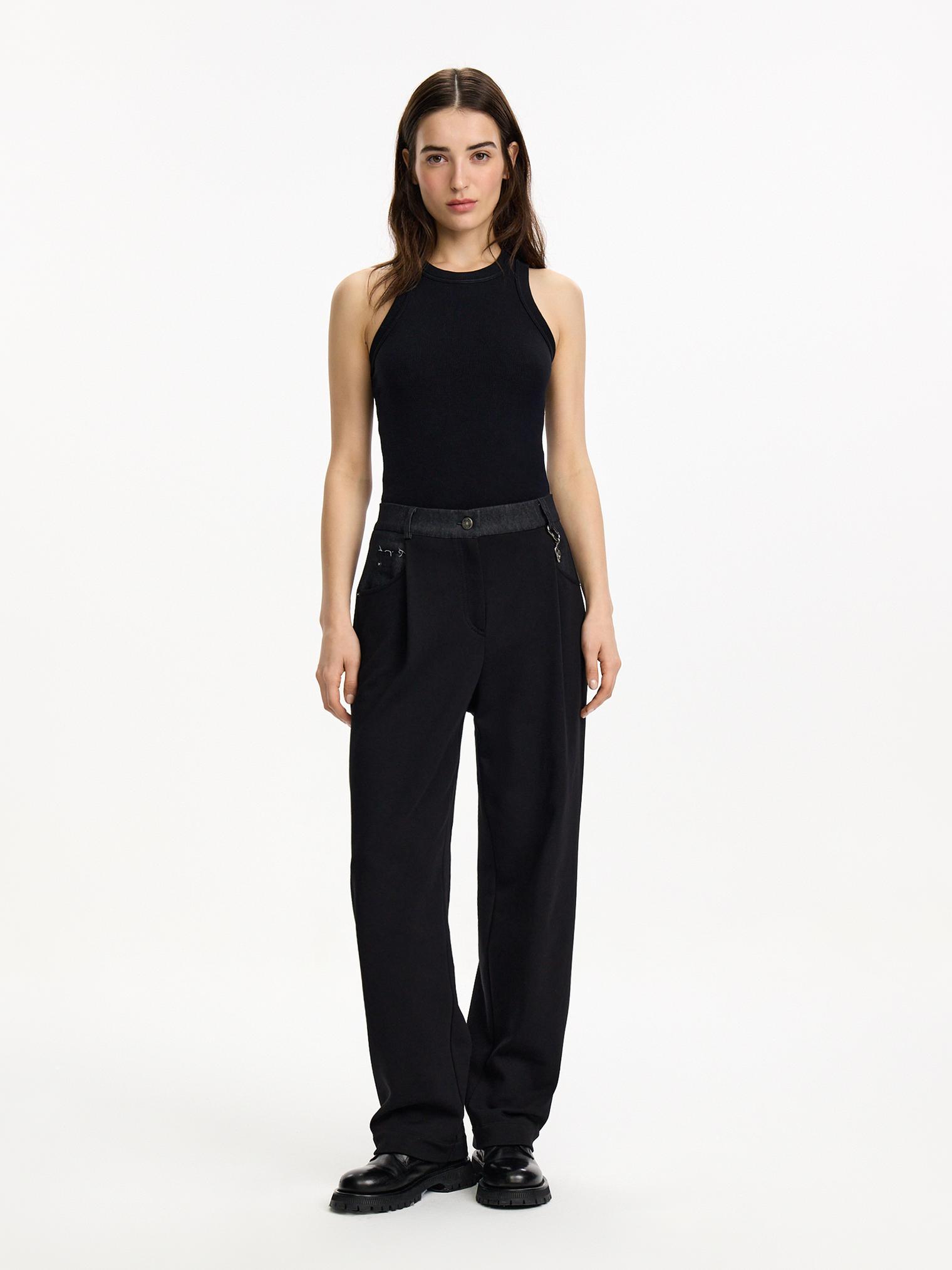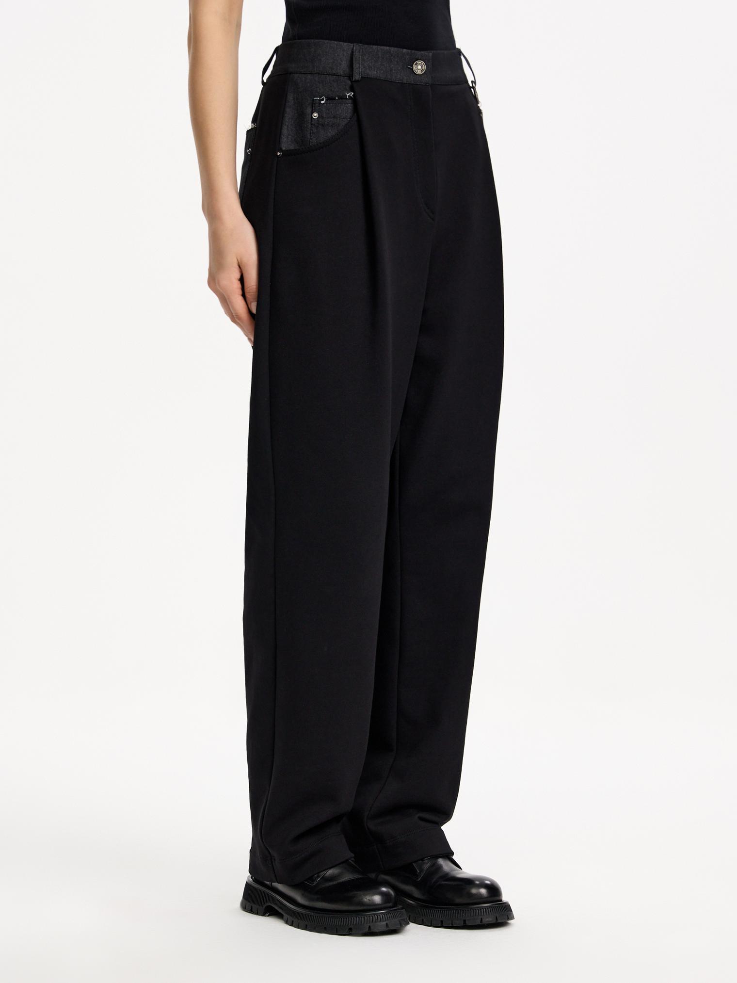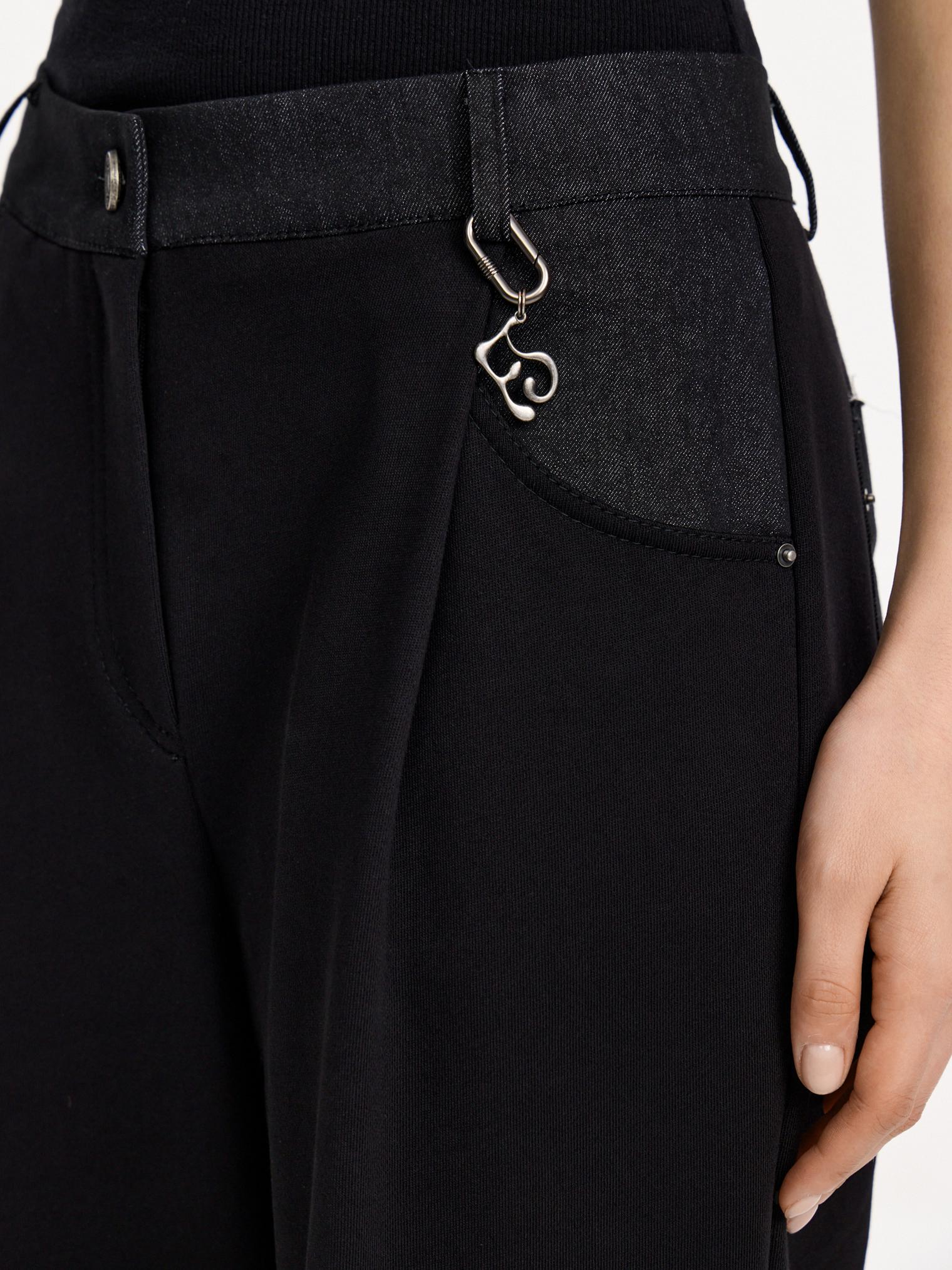 Брюки скомбинированы из хлопкового трикотажа супима с джинсовыми вставками. Модель прямого кроя оформлена брендированным лого на съемном карабине. Идеальный выбор для творческих модников.