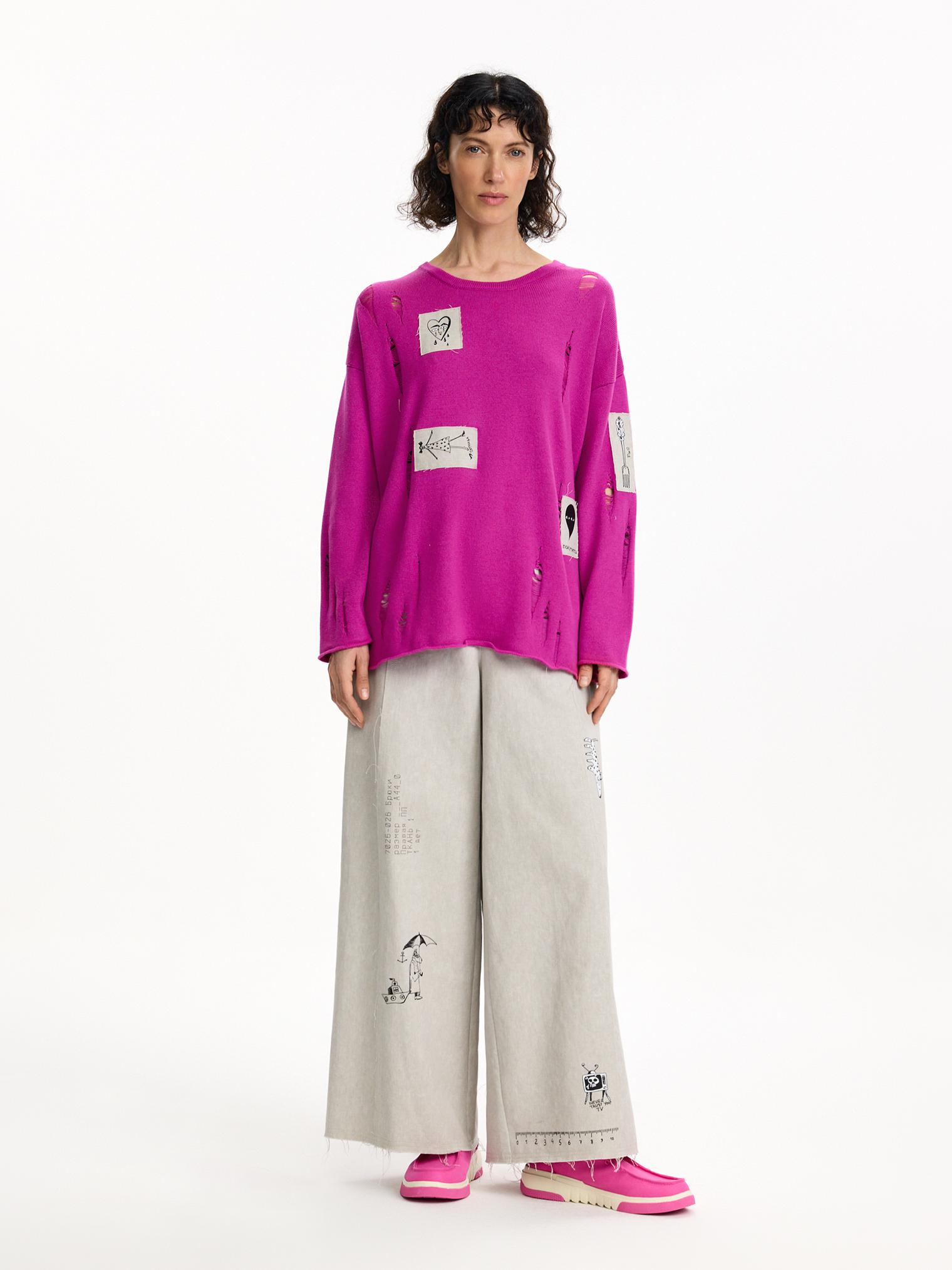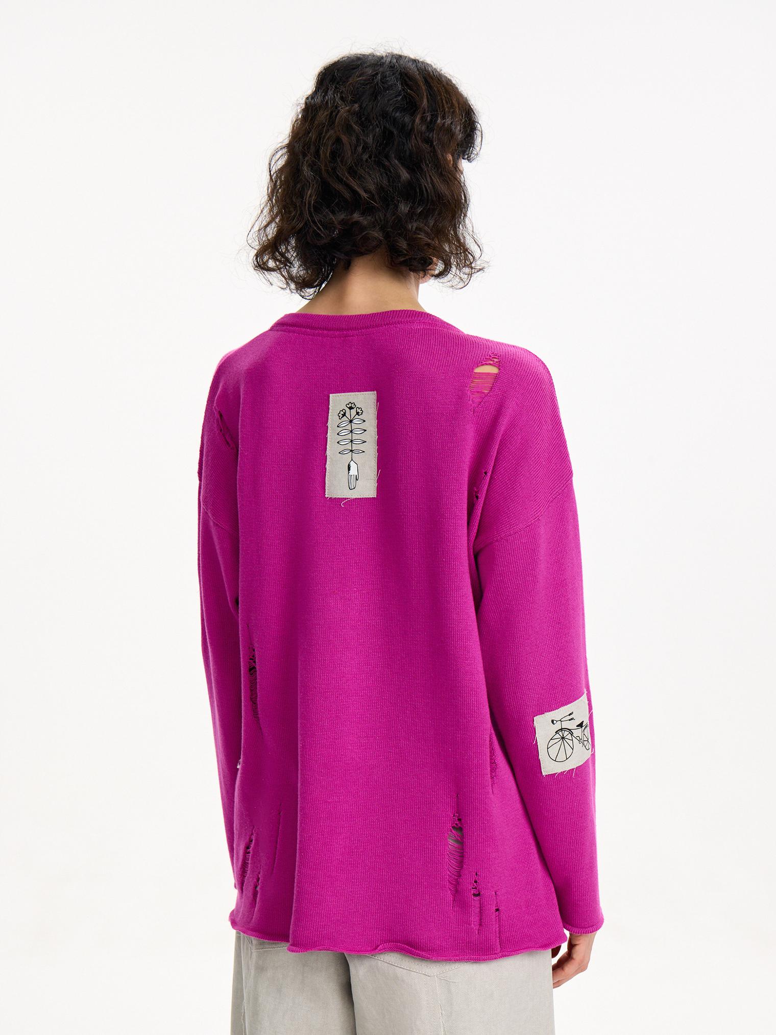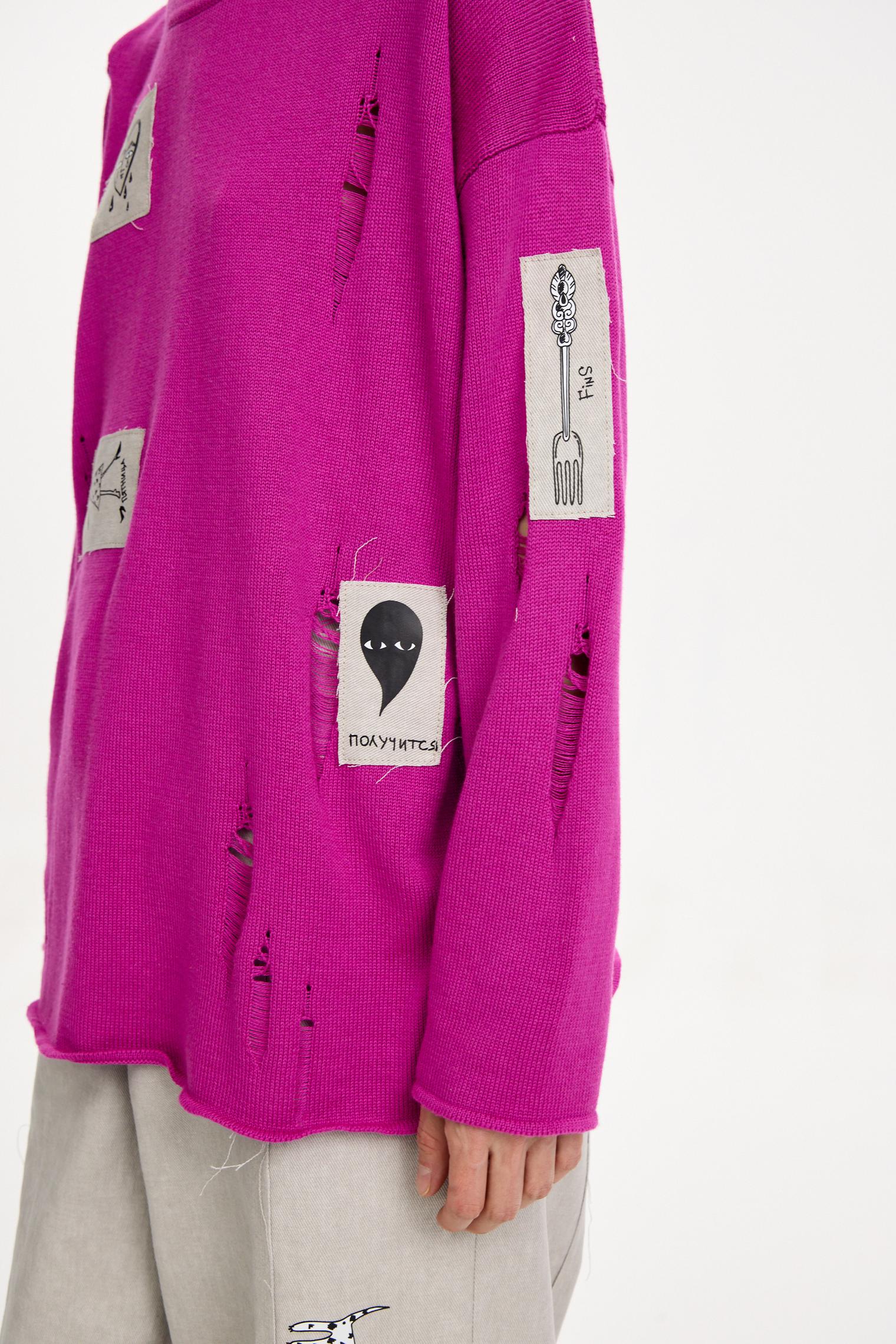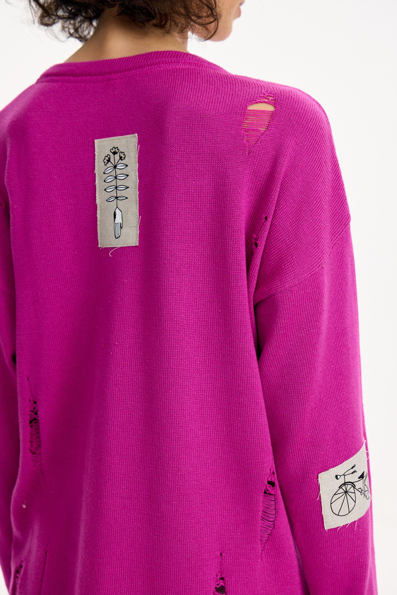 Наш внесезонный бестселлер в насыщенном оттенке цикламена добавит буйства красок весеннему образу. Эффект порванности и спущенных петель, а также контрастные нашивки добавят гранжевого шика повседневным будням.