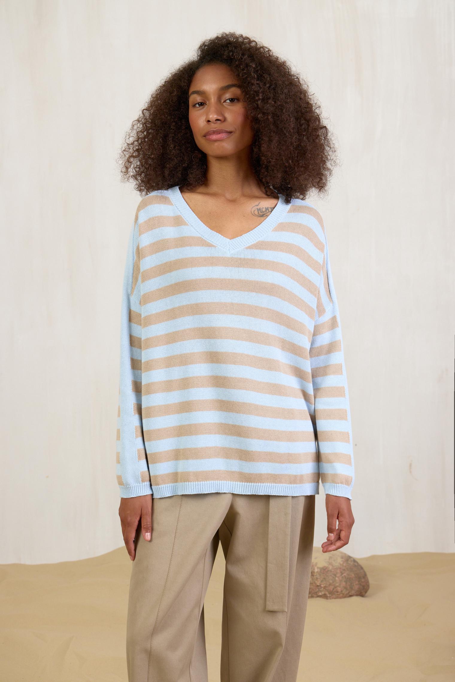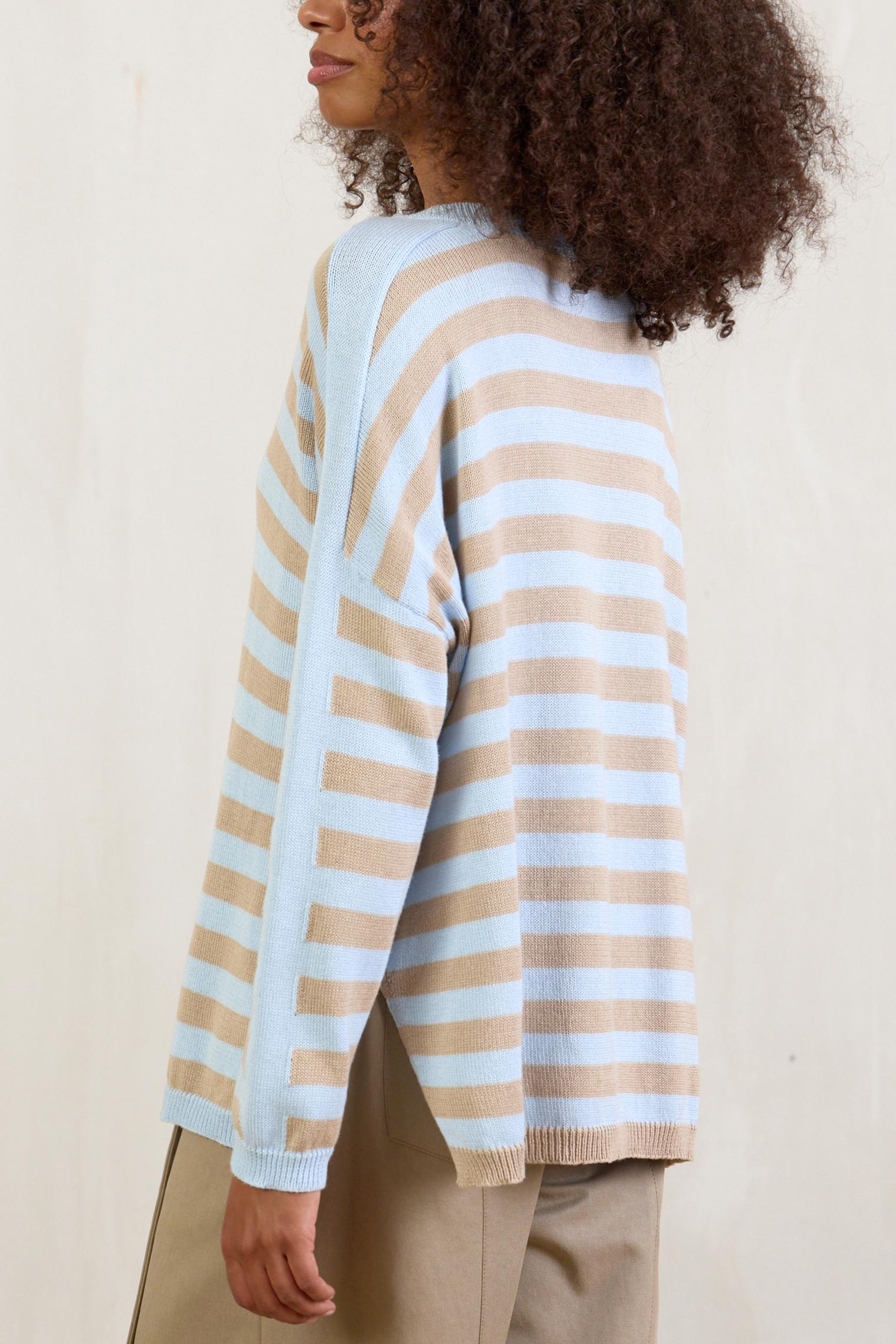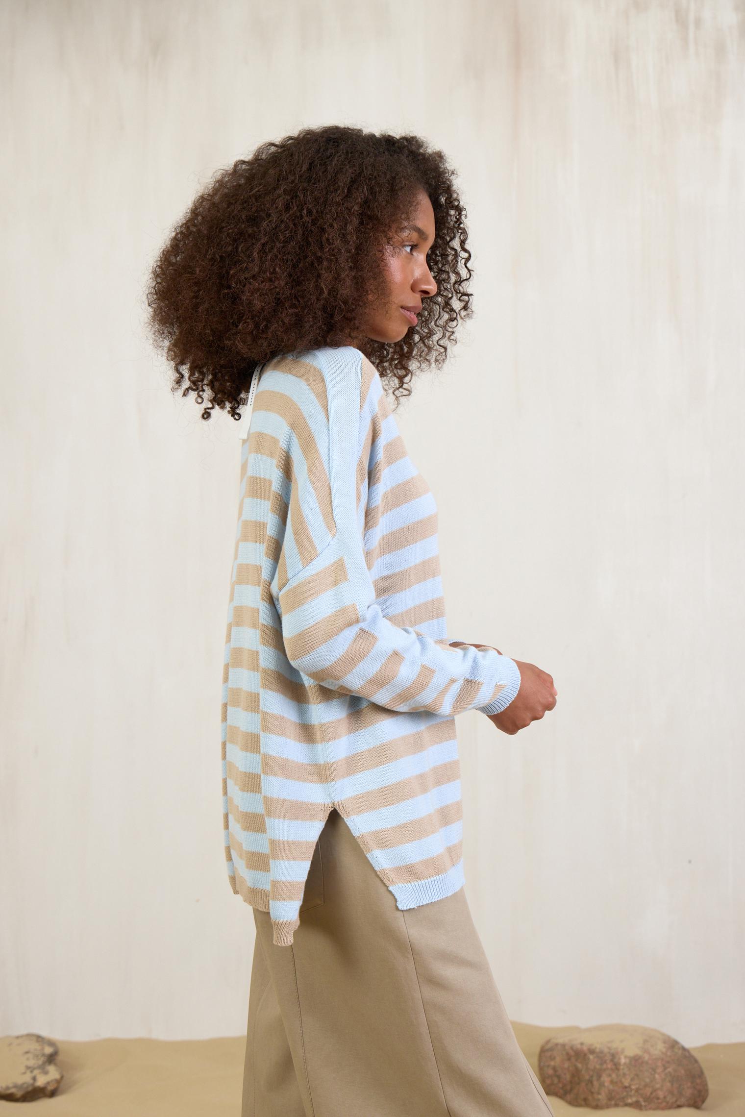 Новая модель джемпера из хлопка с акрилом. Воздушный трикотаж, расслабленный силуэт и нежное сочетание цветов, голубого и песочного, делает его идеальным партнером к любым джинсам и юбкам из денима.