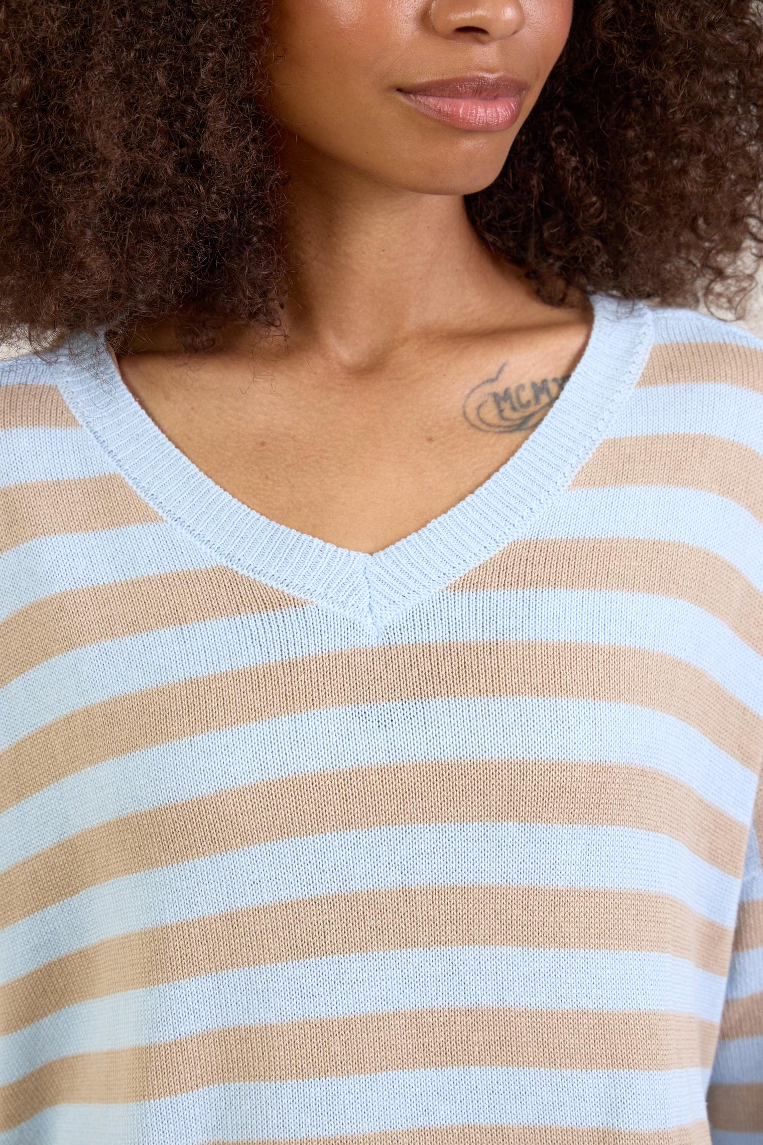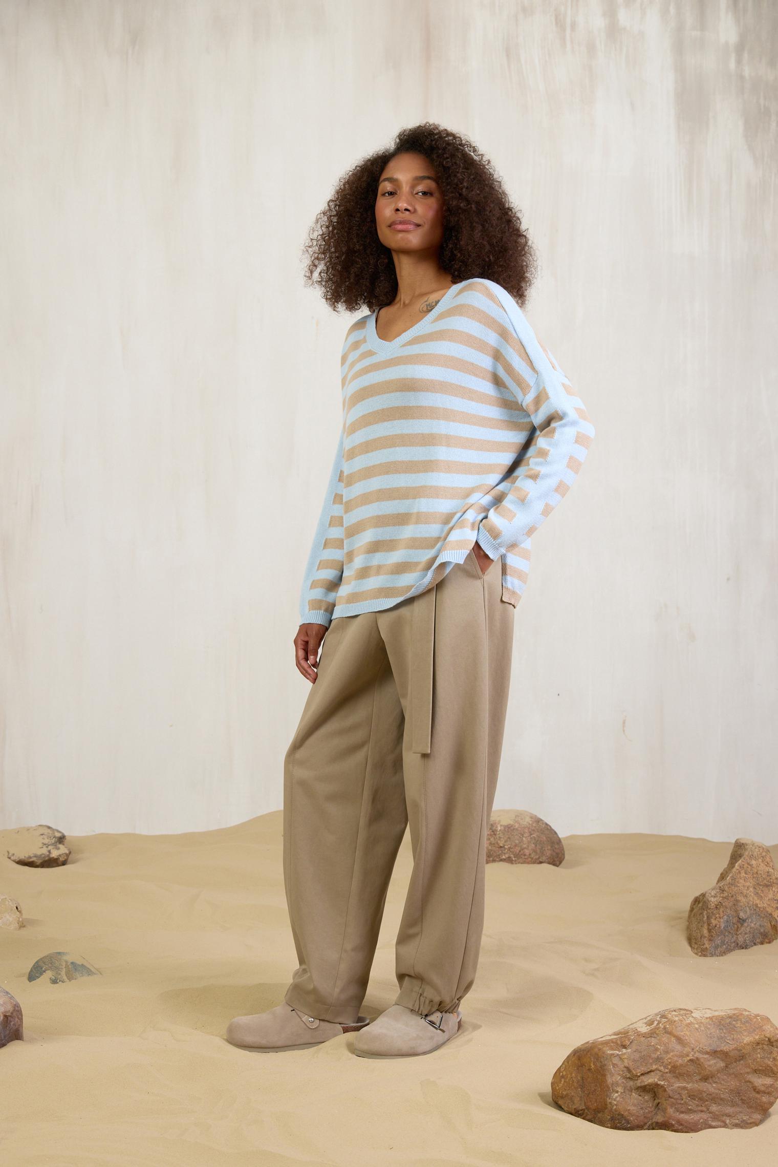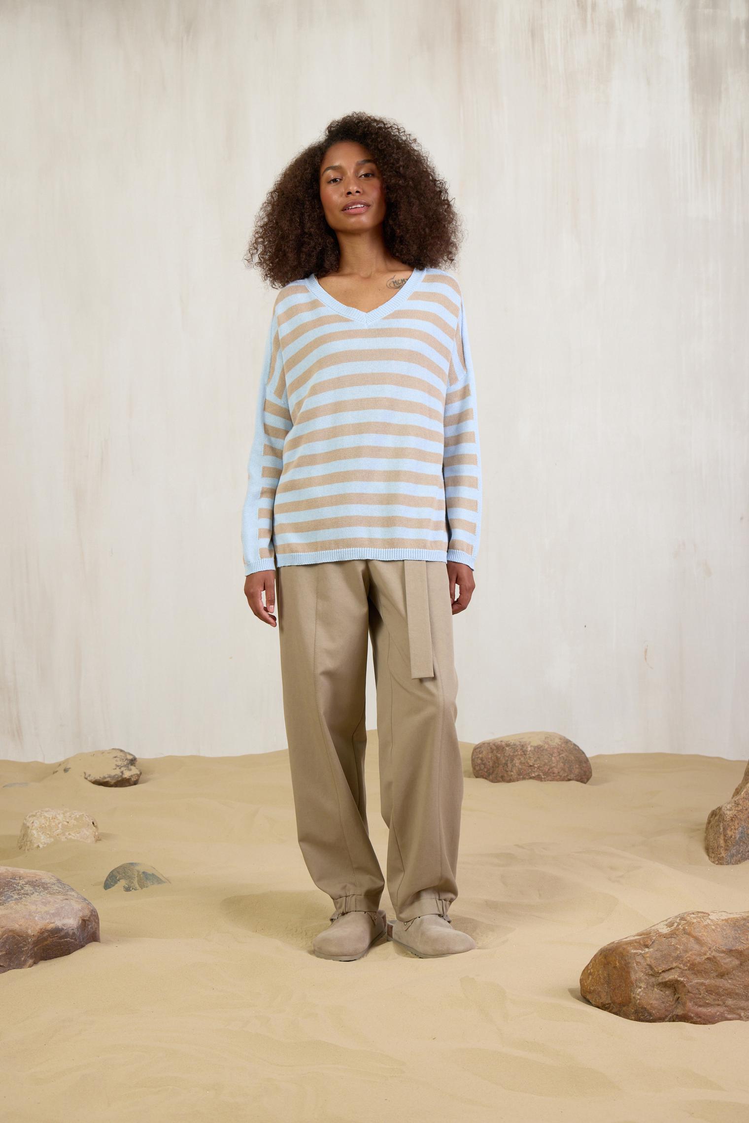 Новая модель джемпера из хлопка с акрилом. Воздушный трикотаж, расслабленный силуэт и нежное сочетание цветов, голубого и песочного, делает его идеальным партнером к любым джинсам и юбкам из денима.