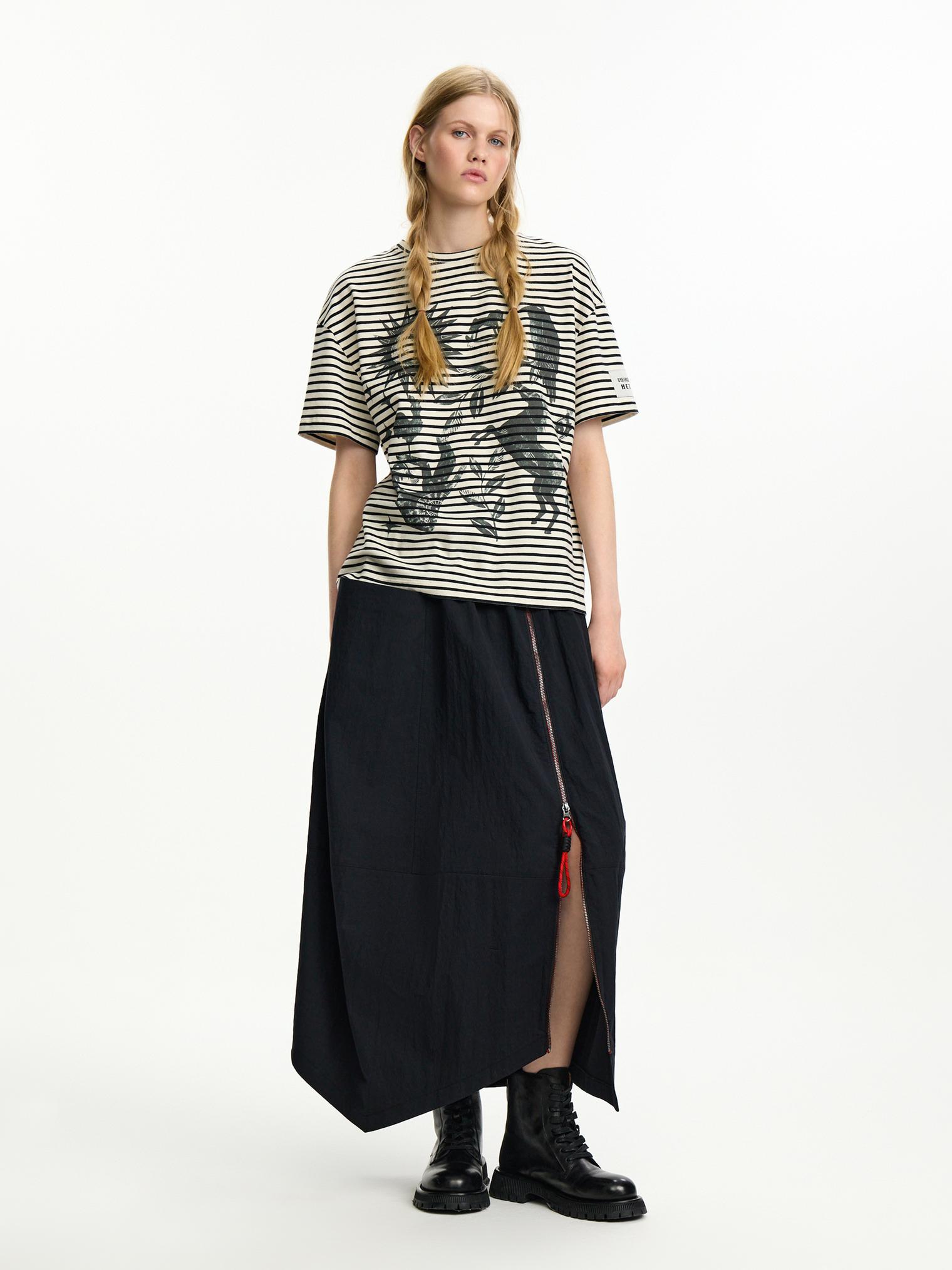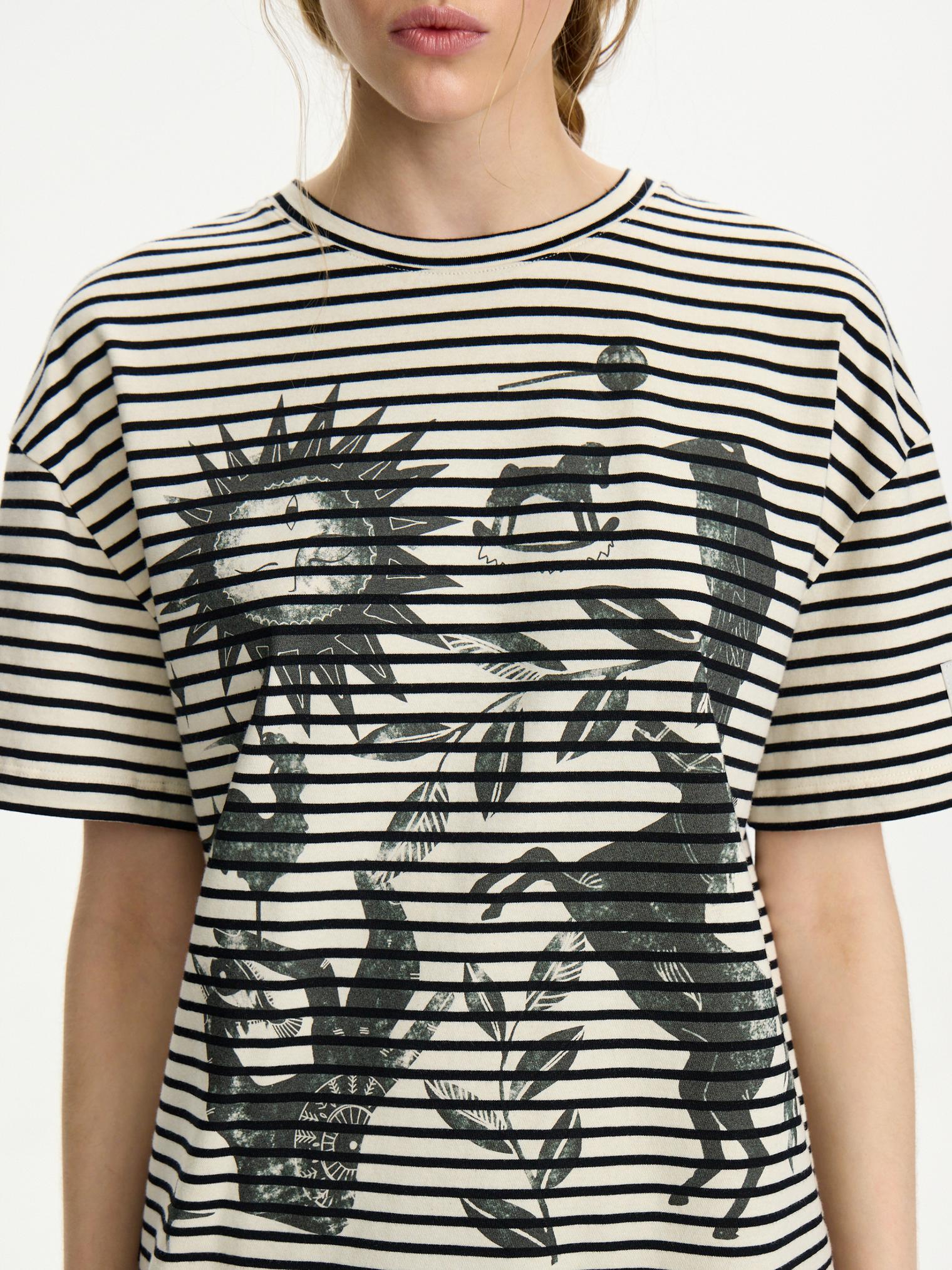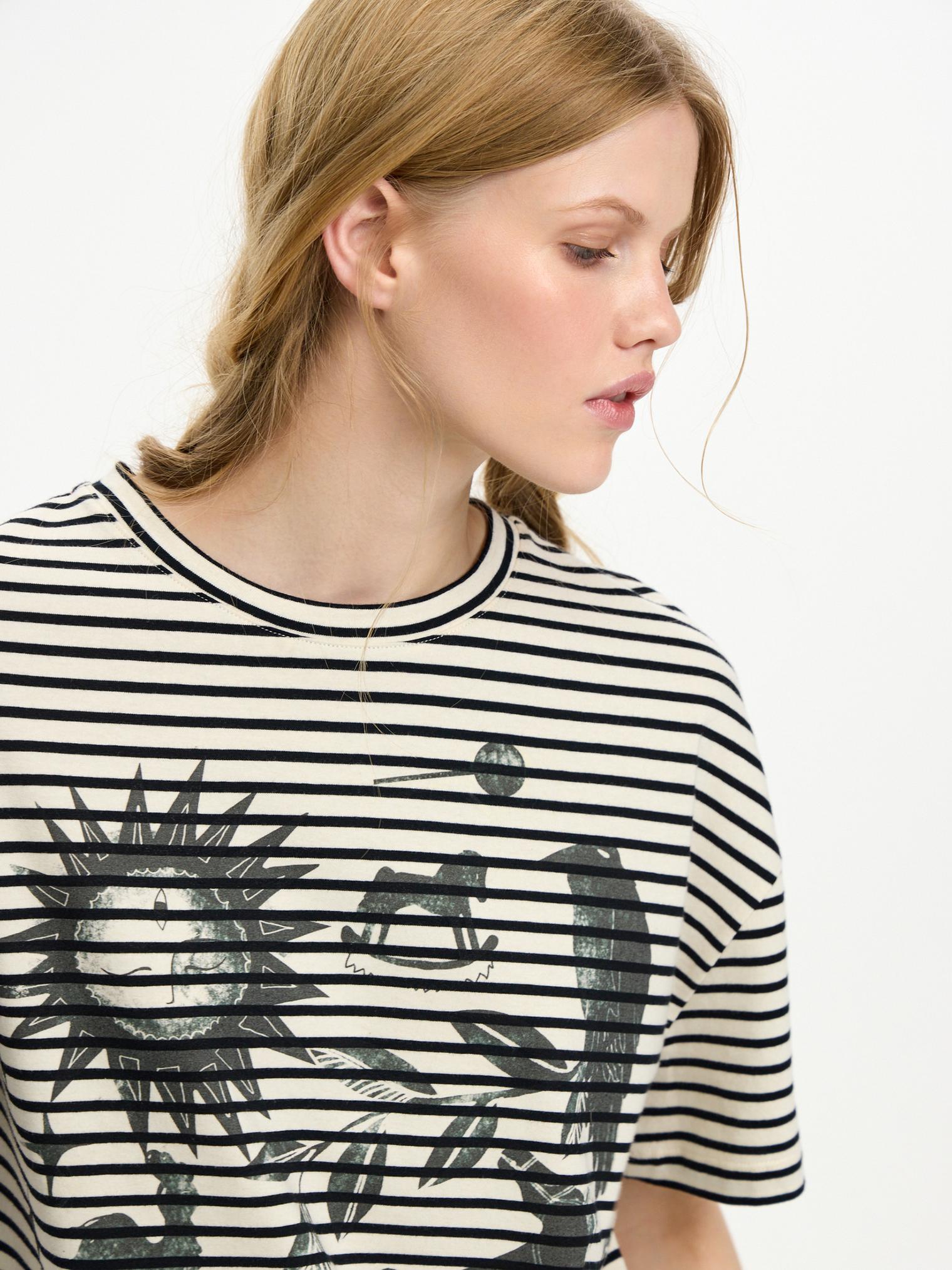 Футболка свободного кроя из мягкой хлопковой кулирки. Классическая брентонская полоска сочетается с графичным принтом придает дерзости повседневному образу.