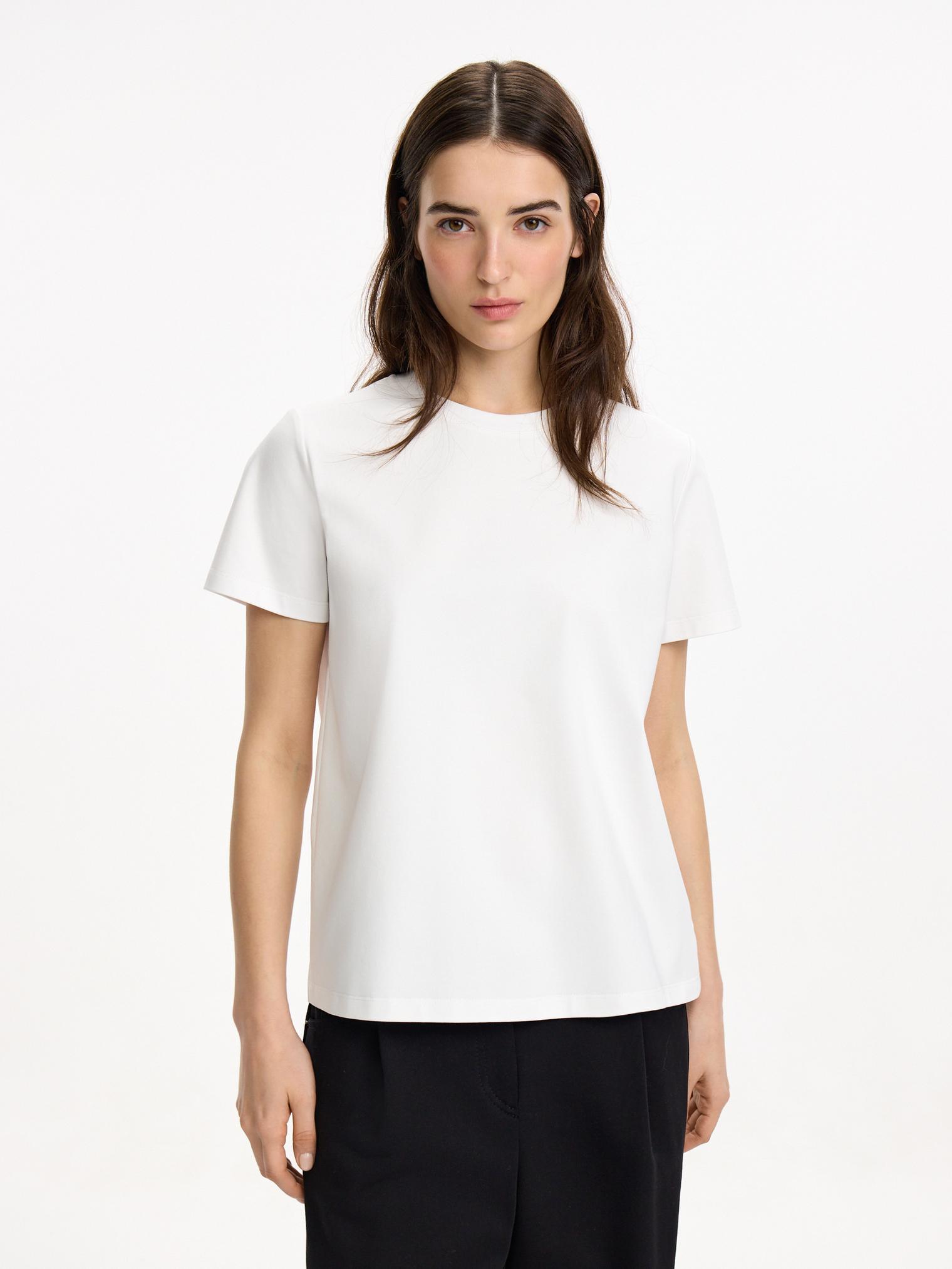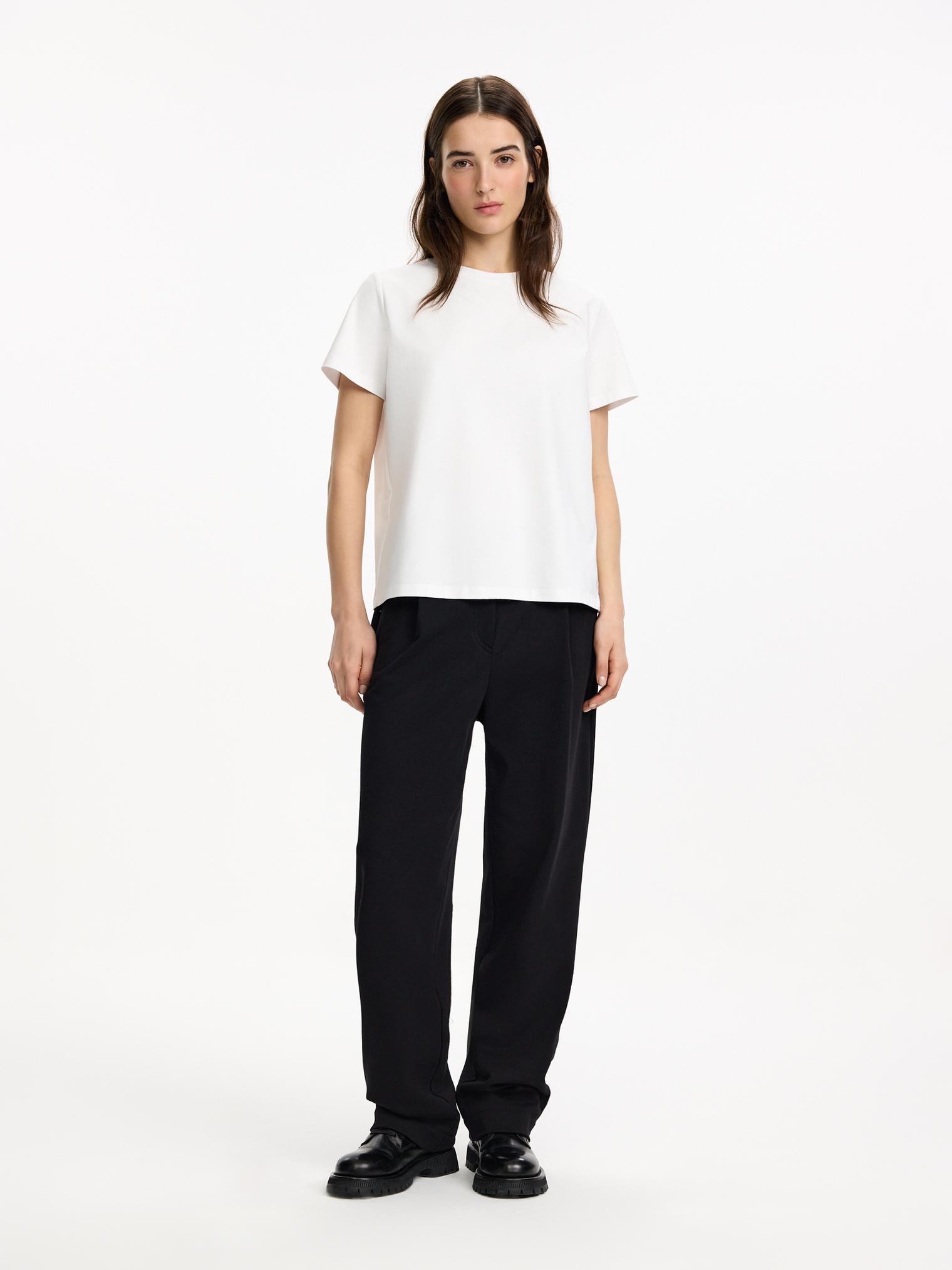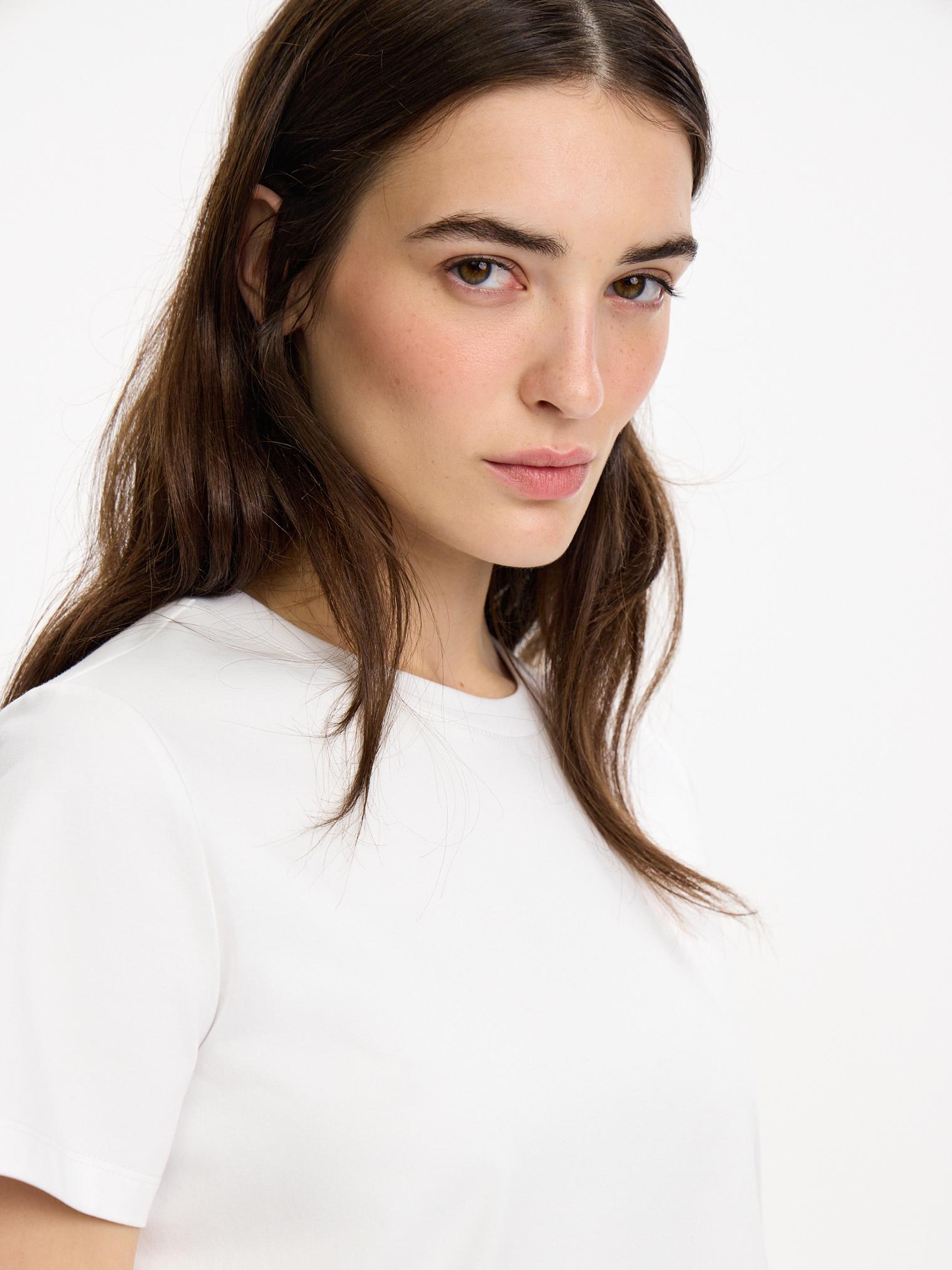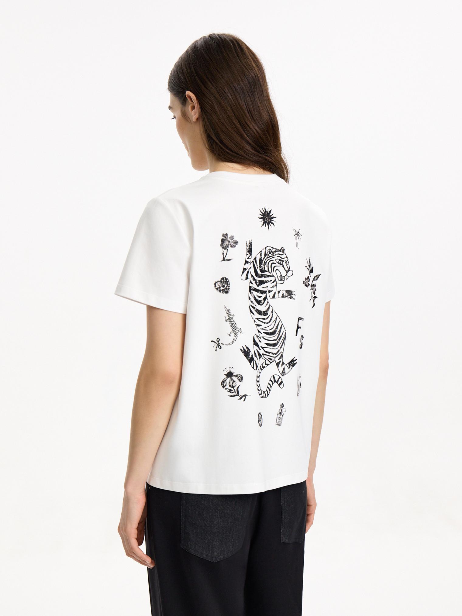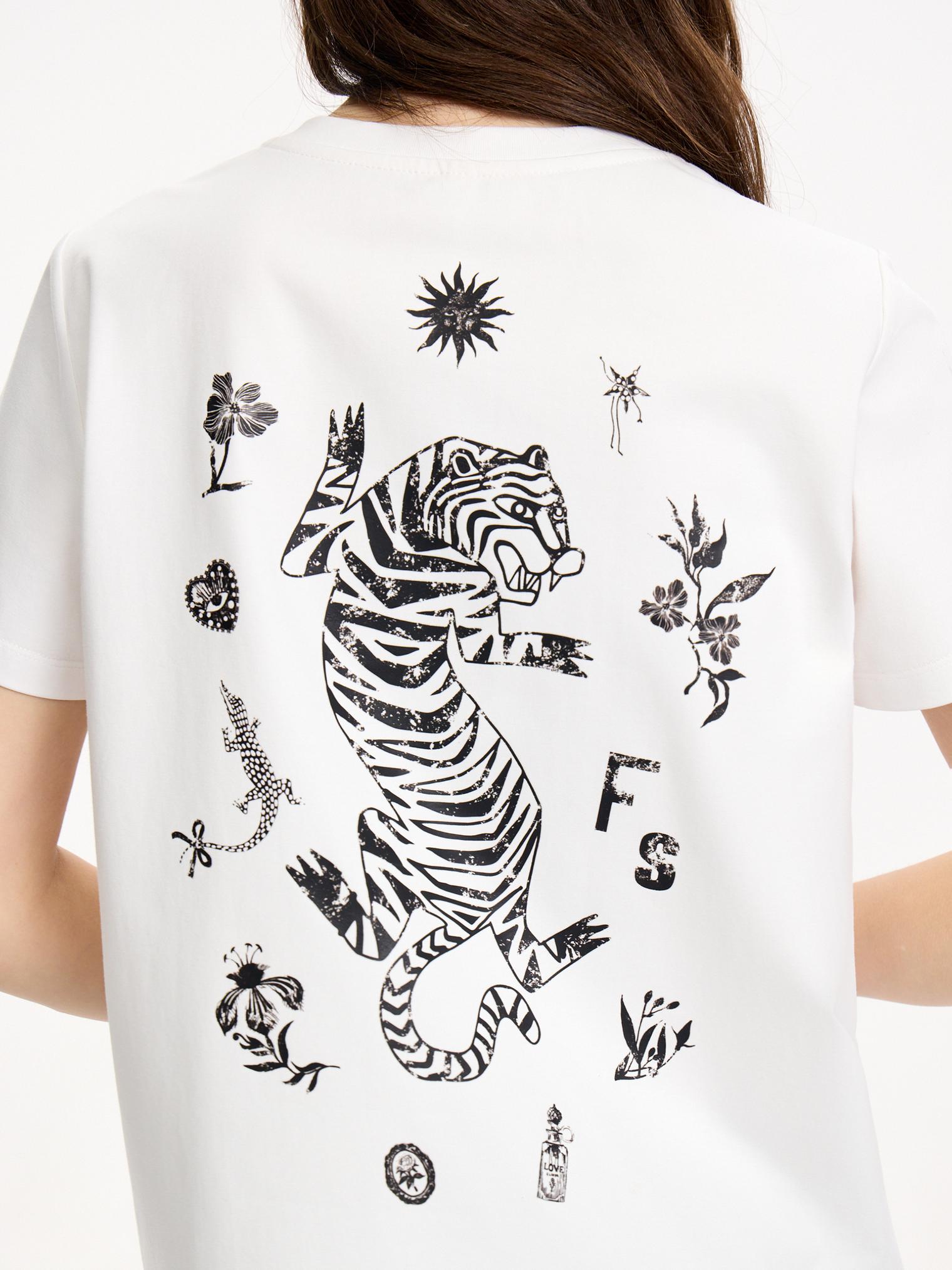 Футболка базового кроя и аккуратного объема. Модель украшена контрастным принтом в виде тигра на спине. Отлично сочетается с жилетом из капсулы.