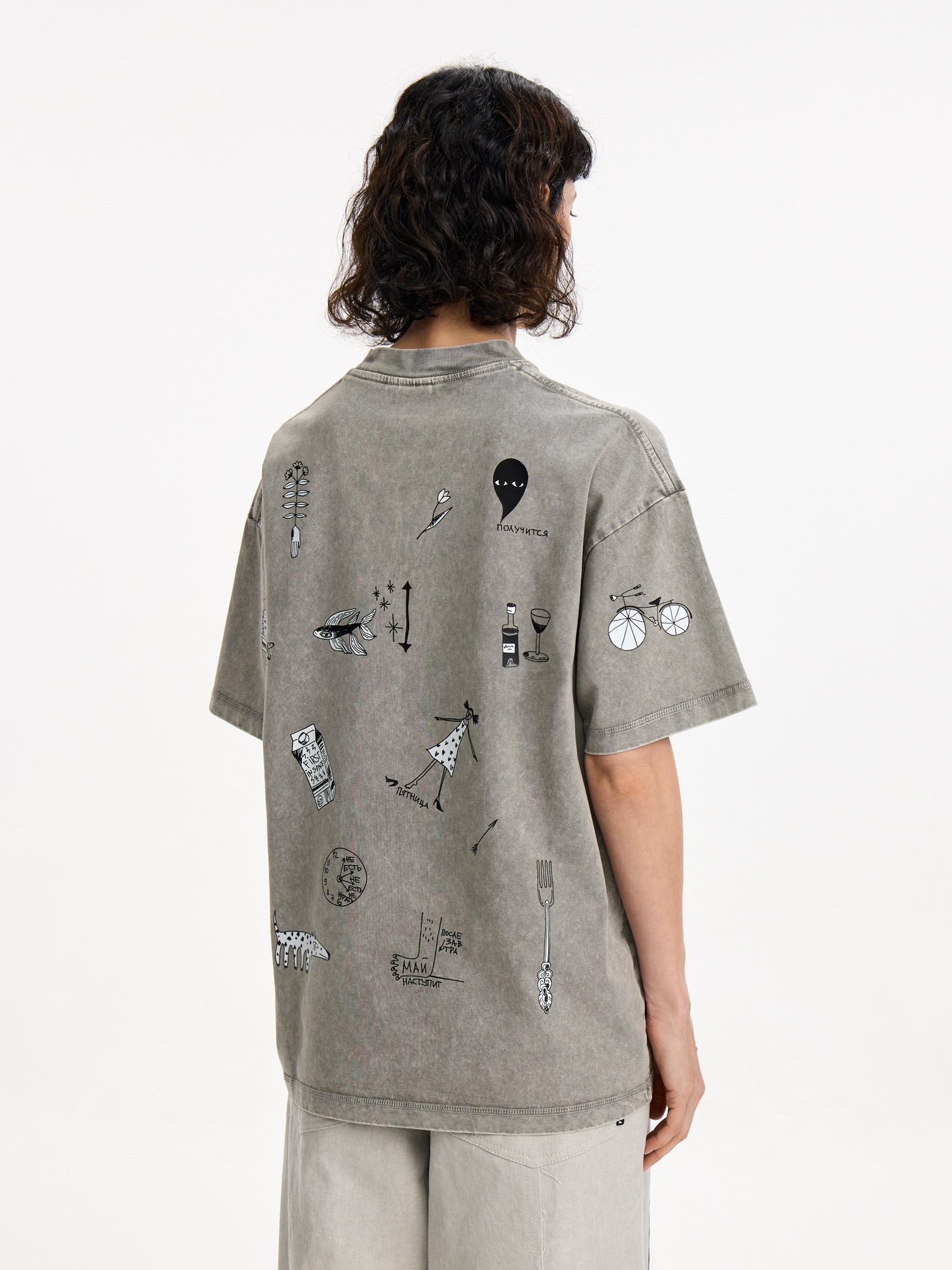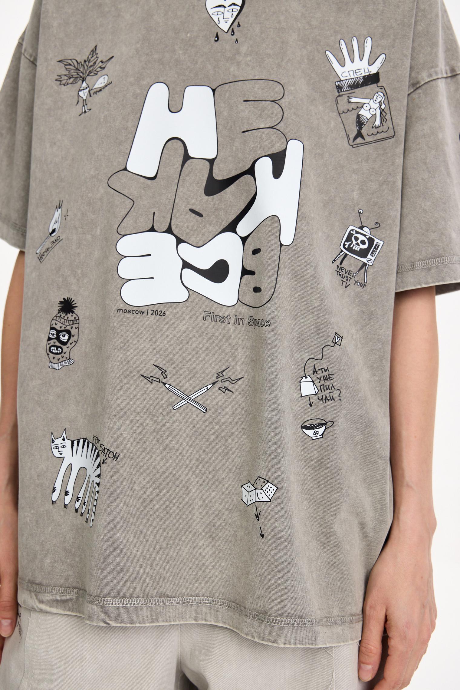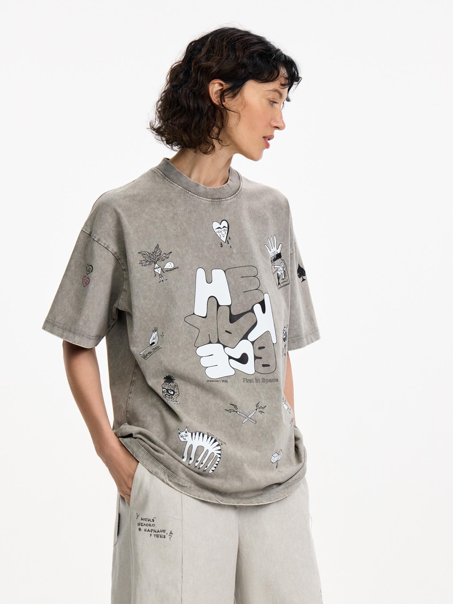 Вайбовая футболка из натурального хлопка. Современный оверсайз силуэт в сочетании с эффектом варки и смешными надписями и персонажами создает маст-хэв айтем для любого гардероба.
