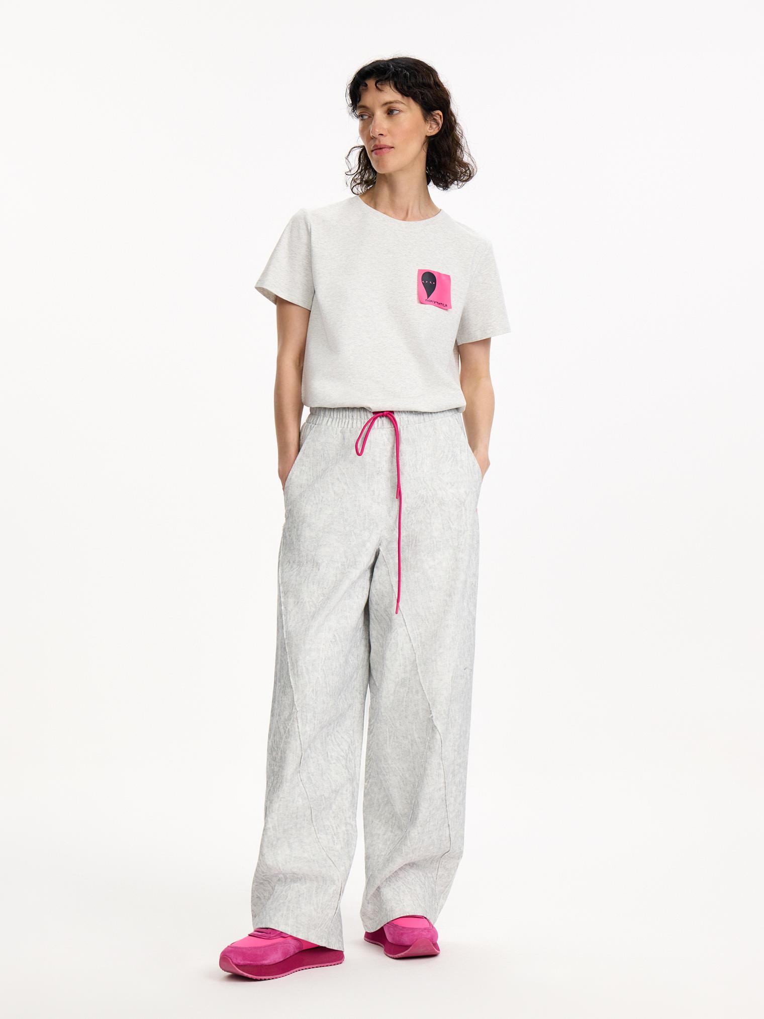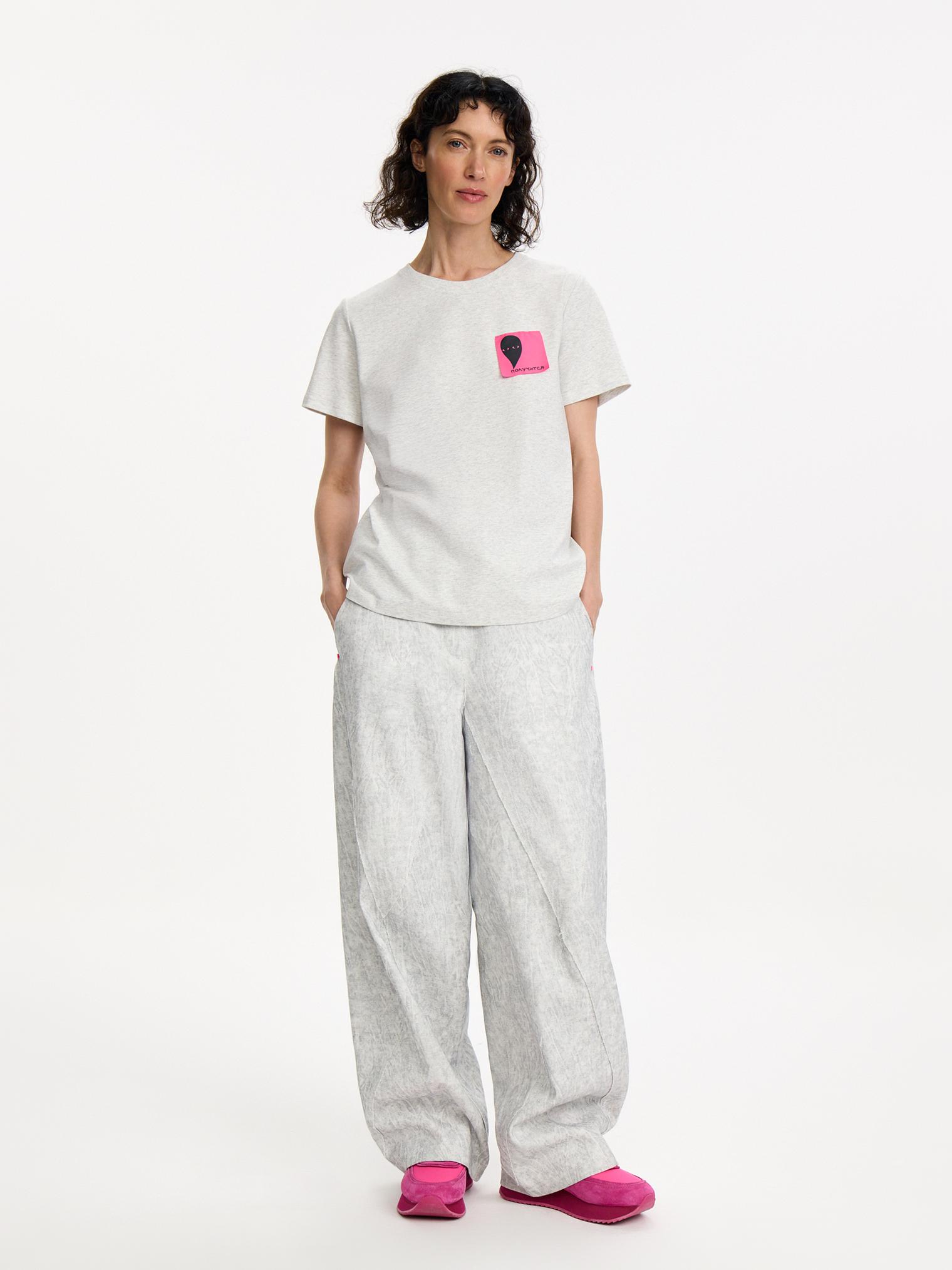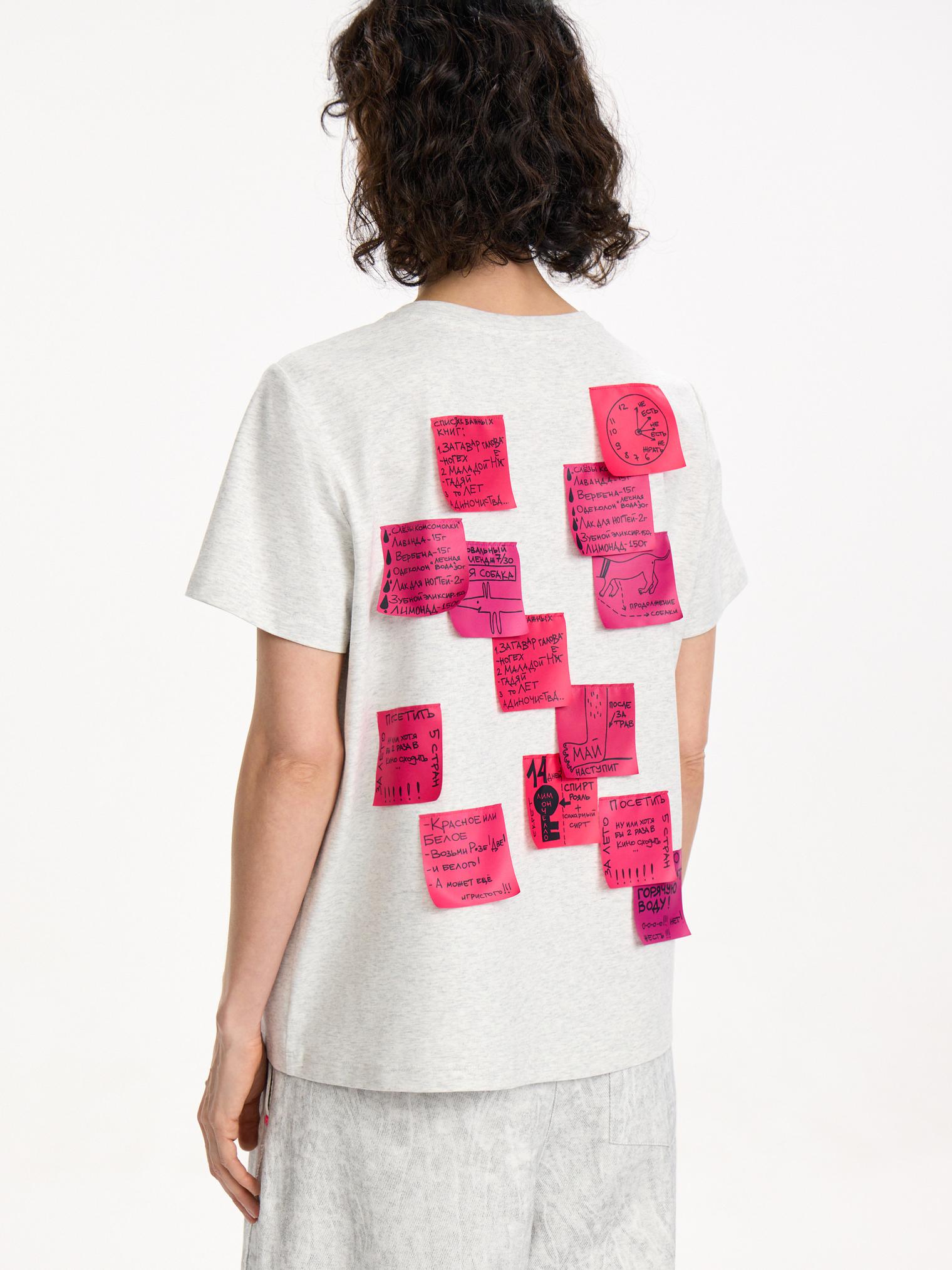 Базовая футболка с небазовым декором на на спине: имитацией стикеров с напоминаниями о важном и насущном, мы назвали их “записки из весны 2026”. Идеальная альтернатива базовой футболке на каждый день.