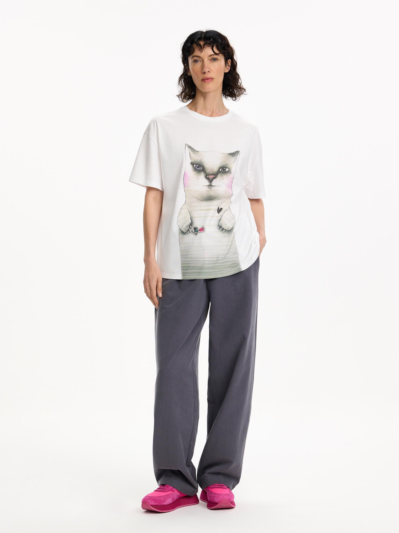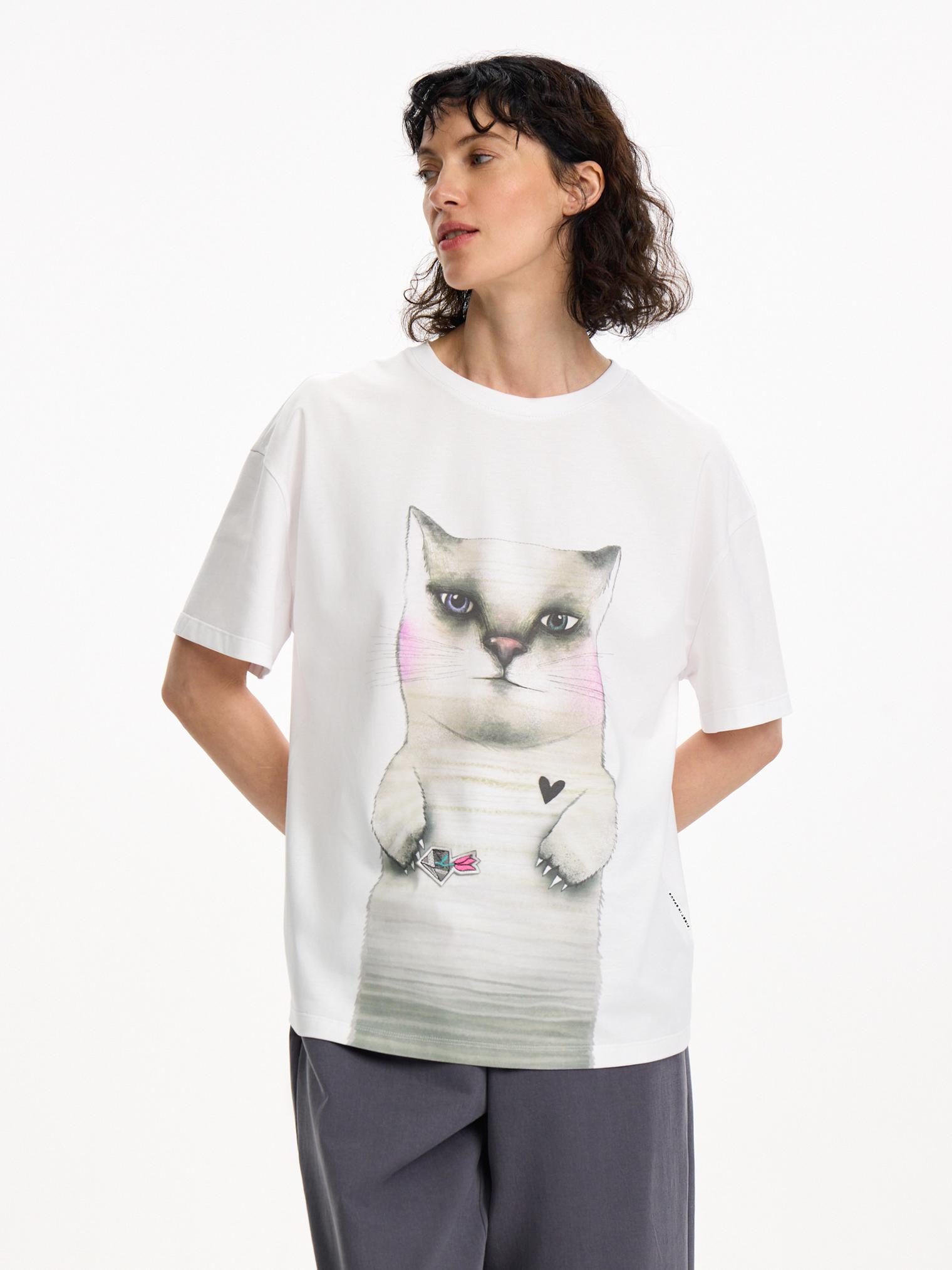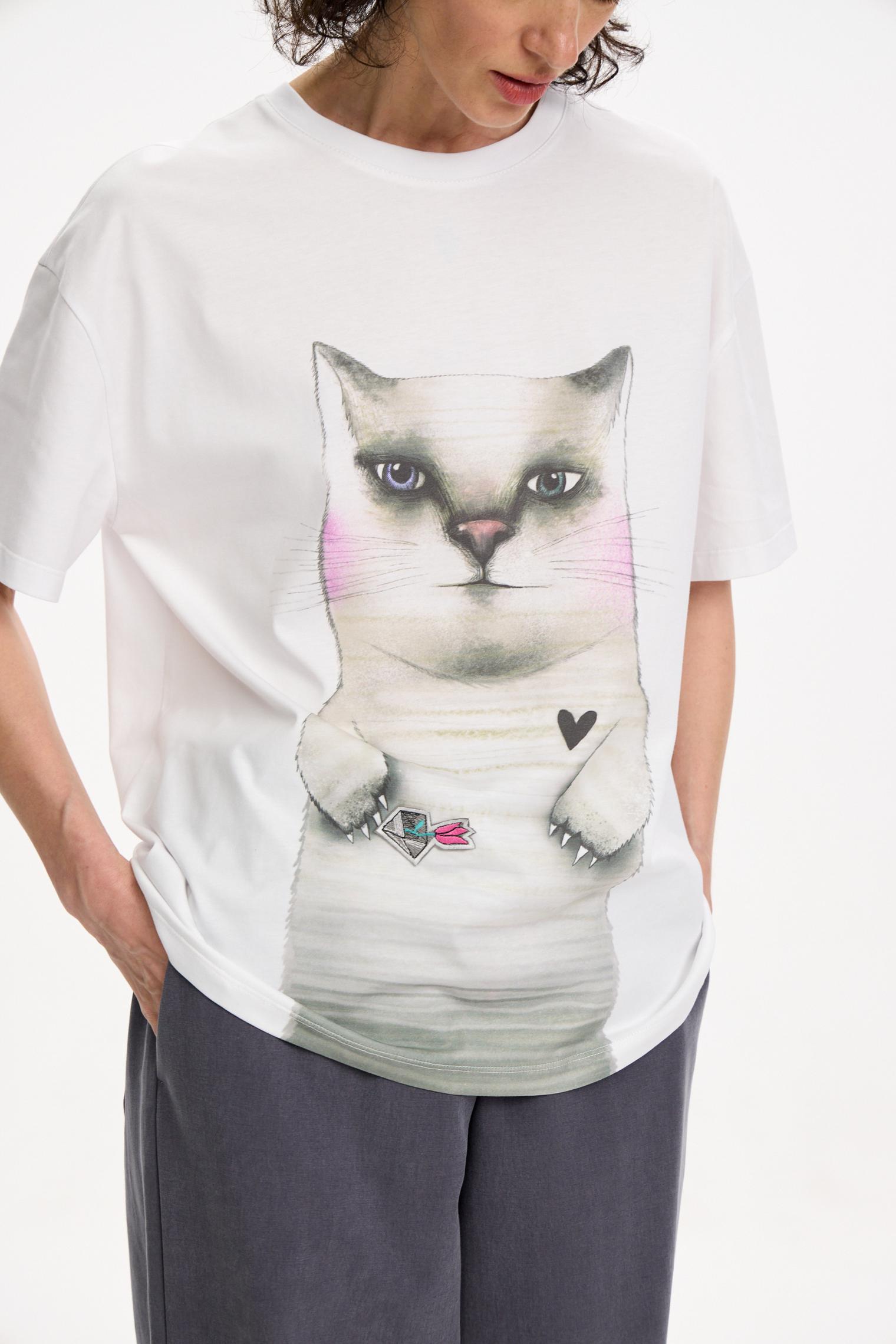 Что может быть лучше кота? Только огромный кот, как на футболке из новой сезонной коллекции. Модель из натурального хлопка украшена котом Батоном, другом Выпиваки. Легко сочетается с любым низом из капсулы.
