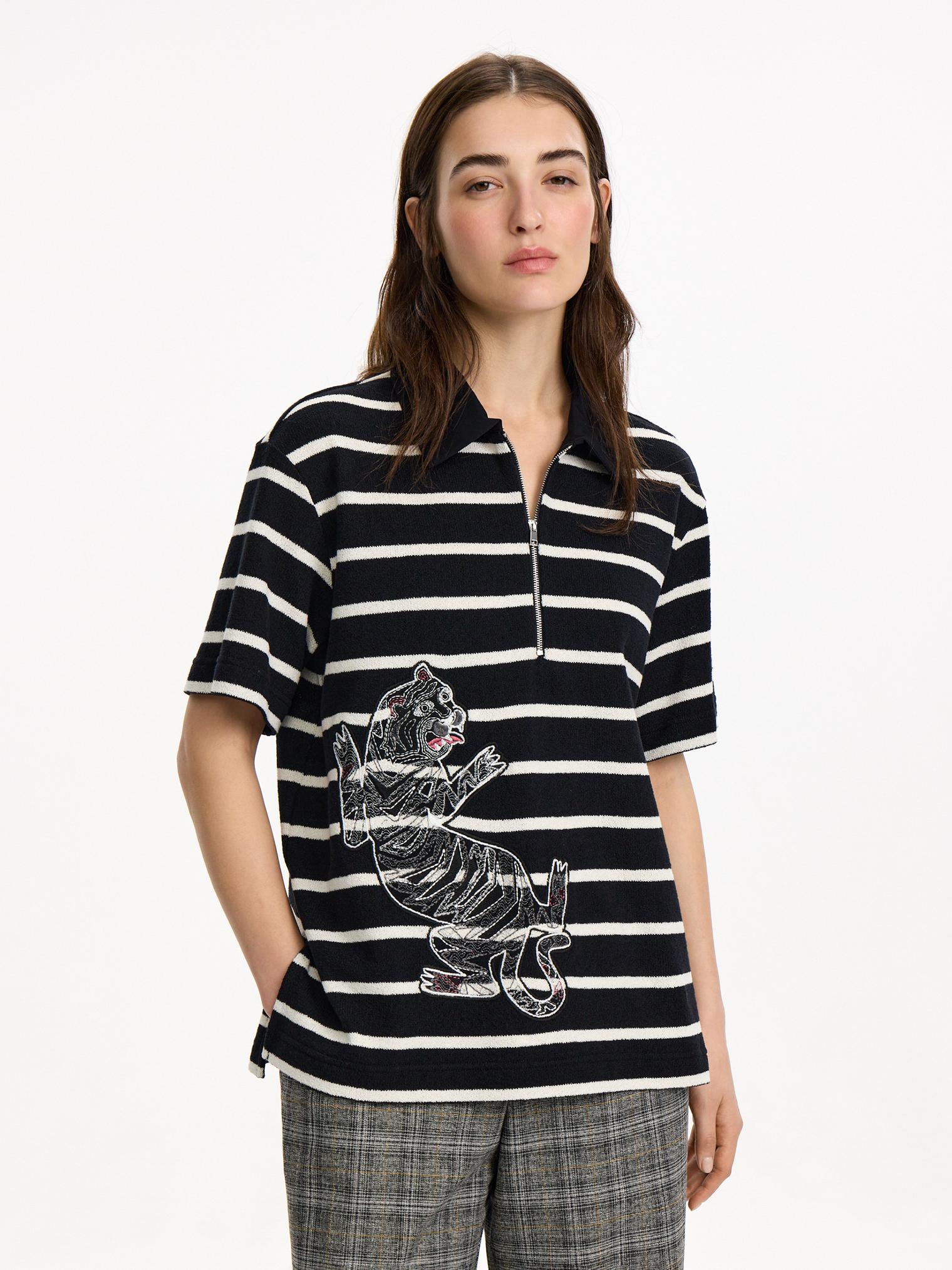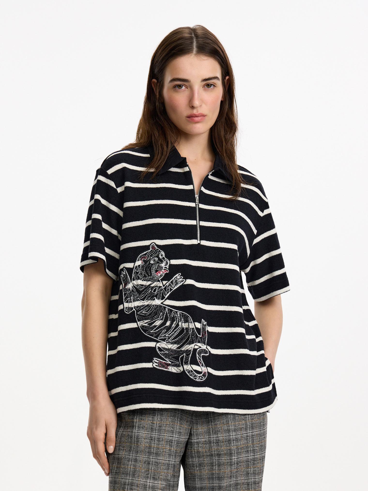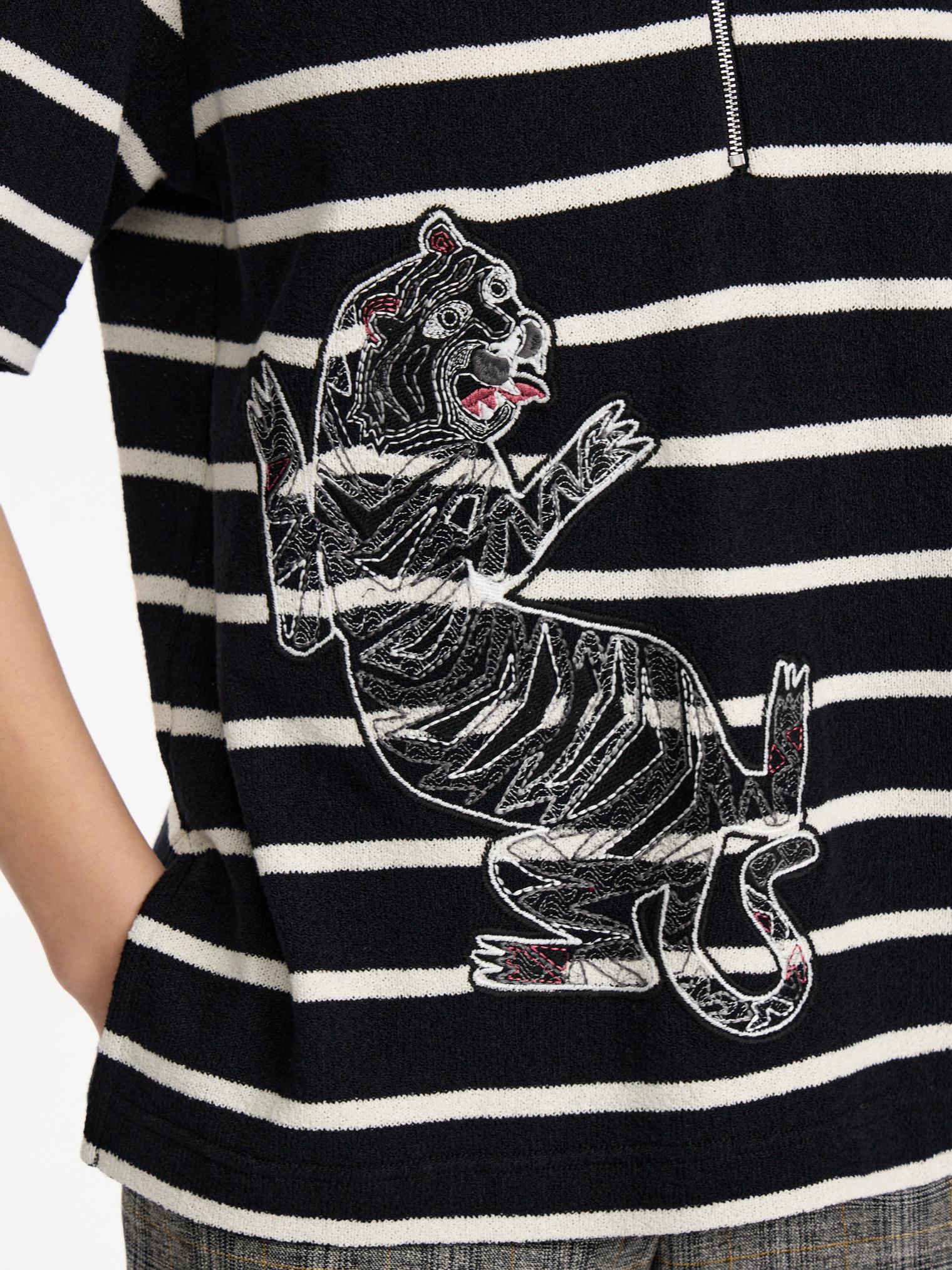 Новинка - футболка-поло из вязаного трикотажа в графичную полоску. Эластичный хлопок идеально подойдет на теплую весеннюю и летнюю погоду. Футболка оформлена воротником-поло с застежкой на акцентную металлическую молнию и эффектной вышивкой в виде тигра.