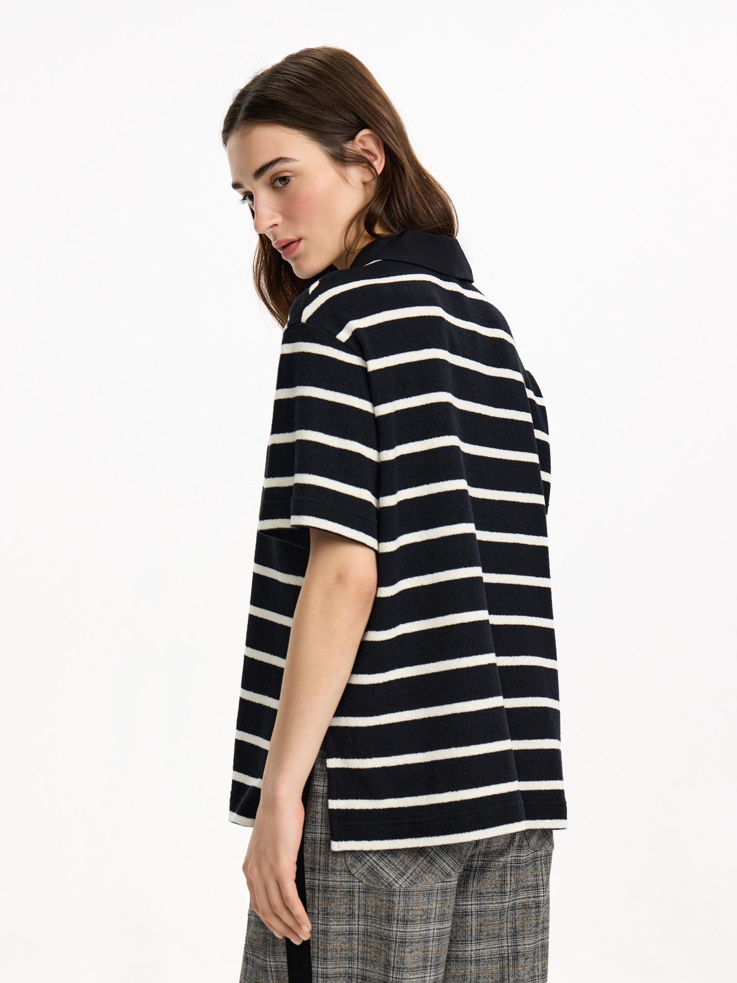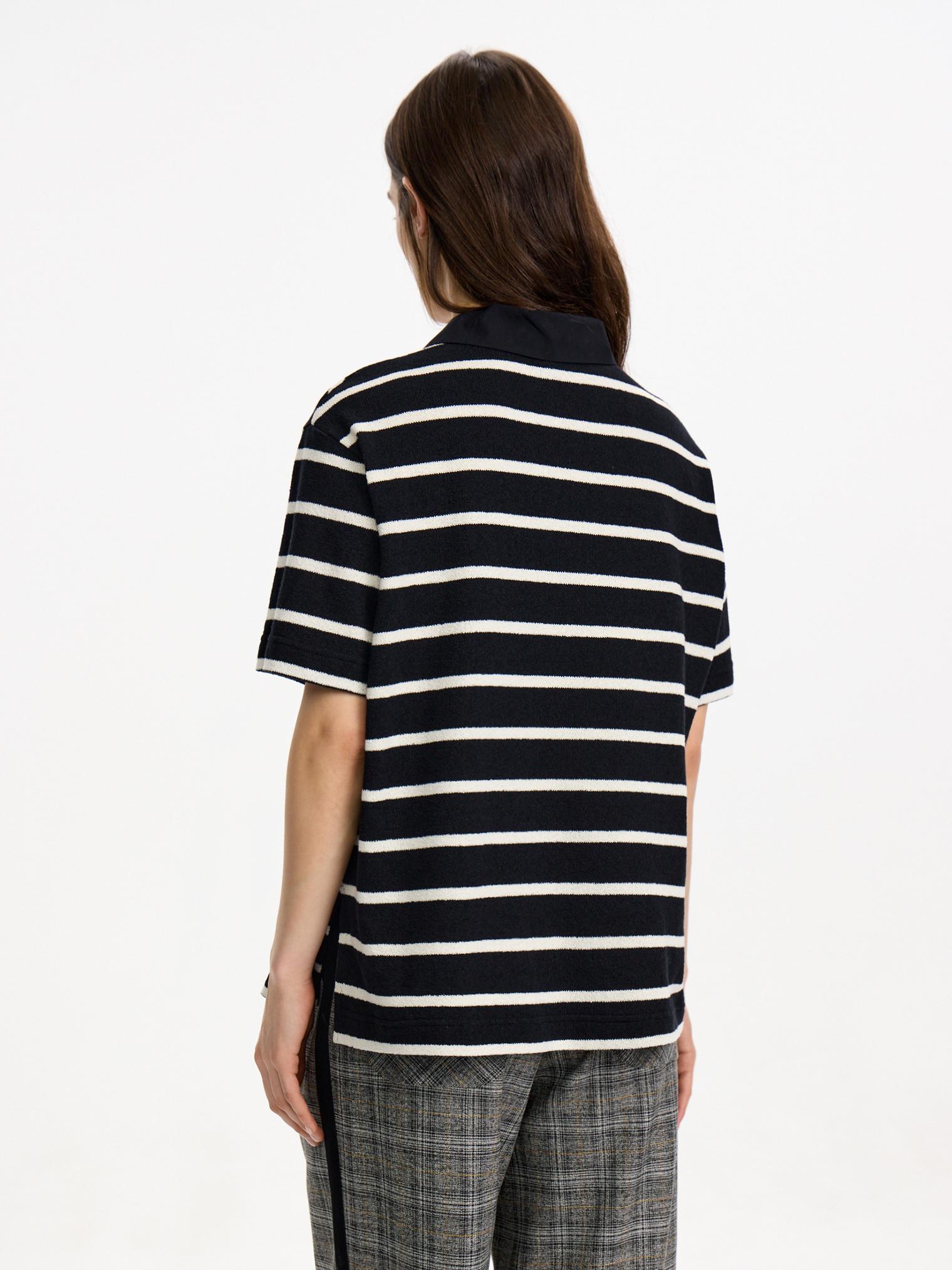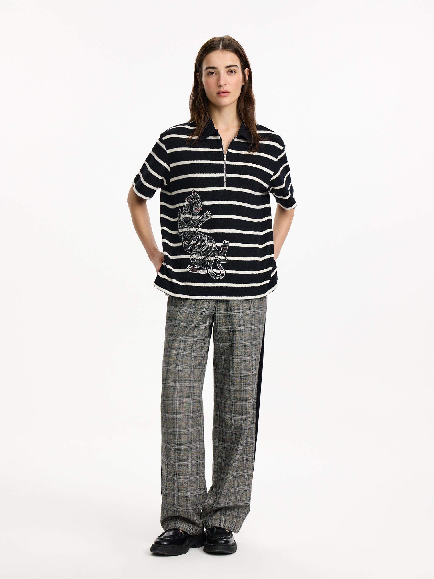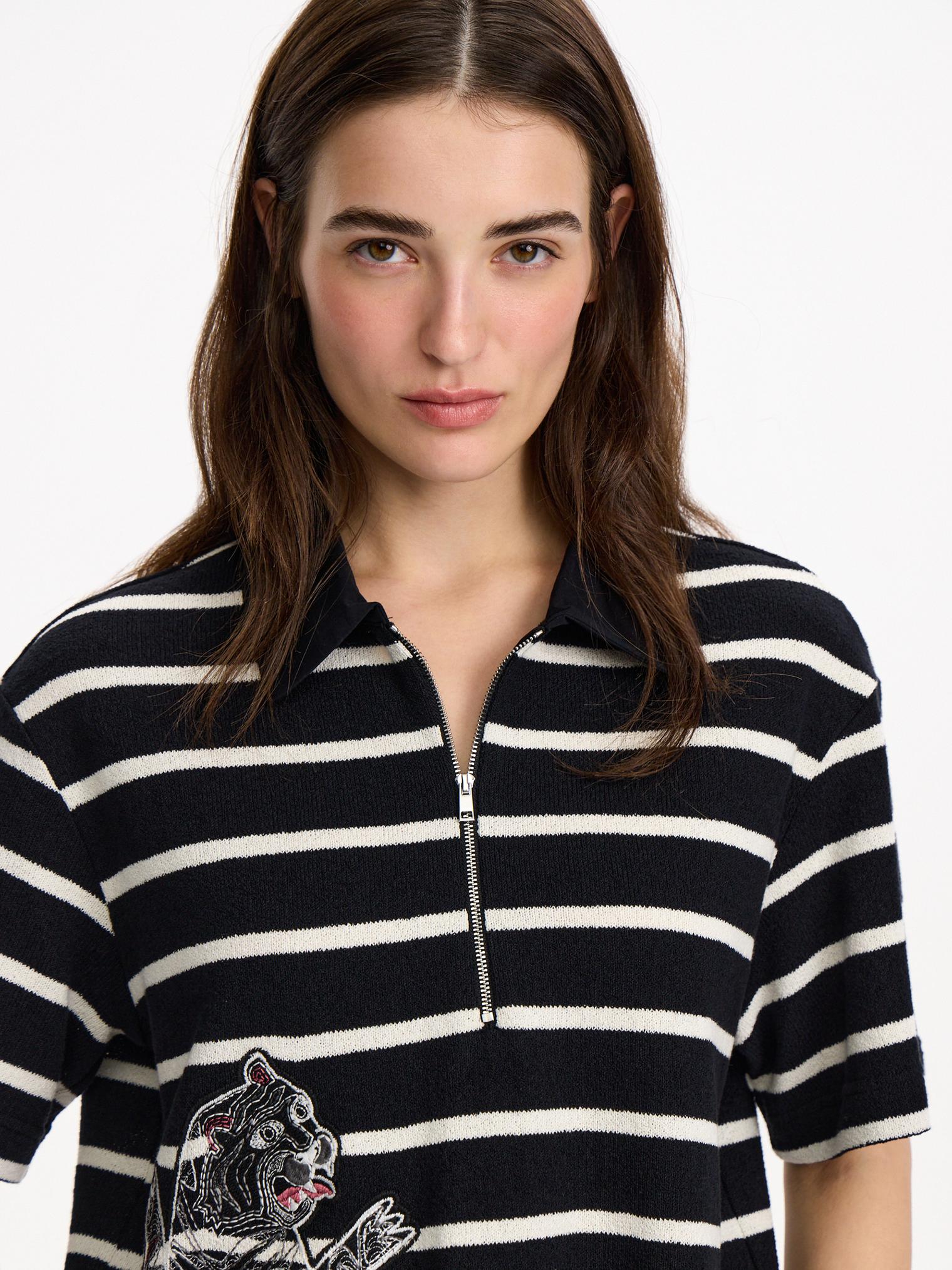Новинка - футболка-поло из вязаного трикотажа в графичную полоску. Эластичный хлопок идеально подойдет на теплую весеннюю и летнюю погоду. Футболка оформлена воротником-поло с застежкой на акцентную металлическую молнию и эффектной вышивкой в виде тигра.