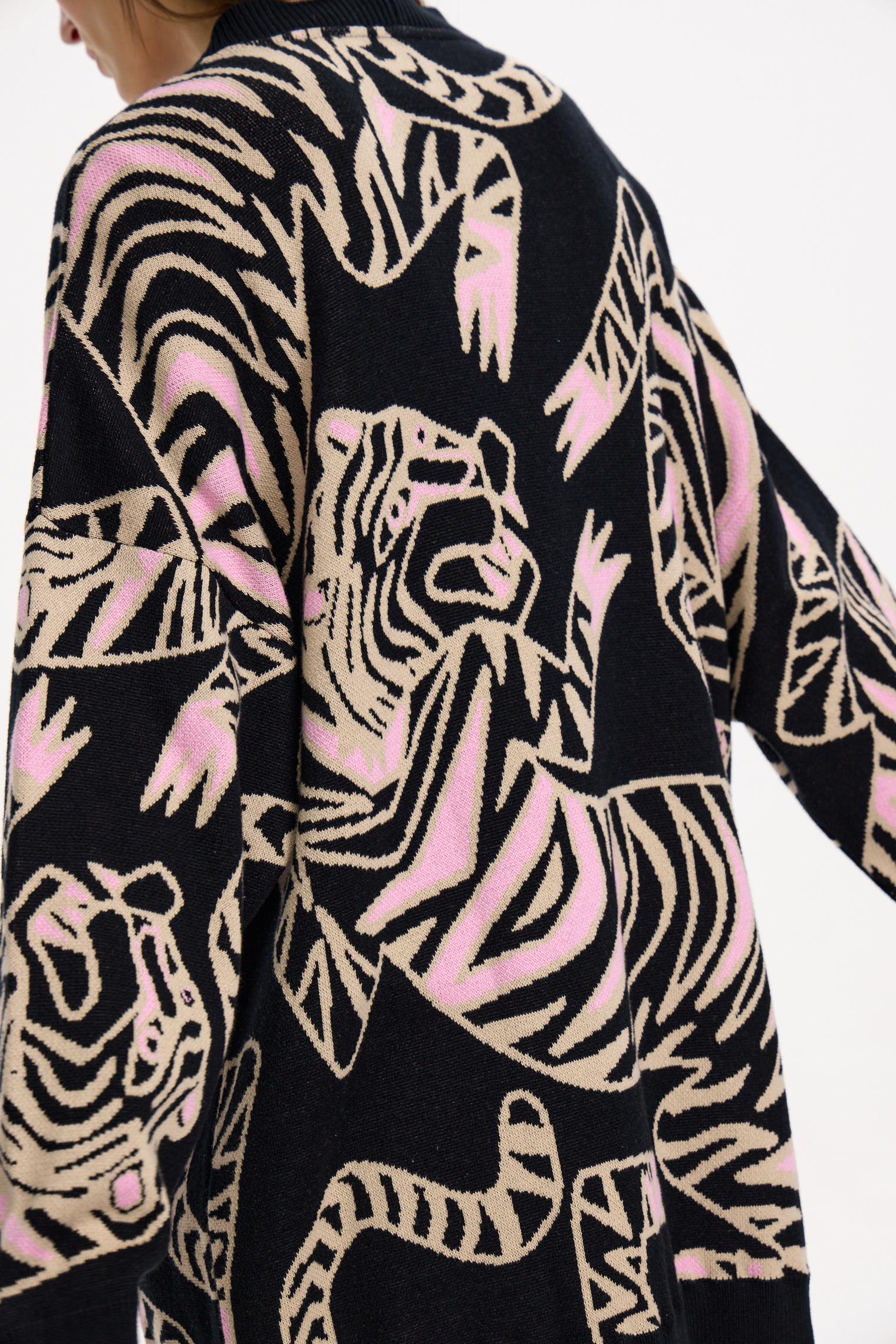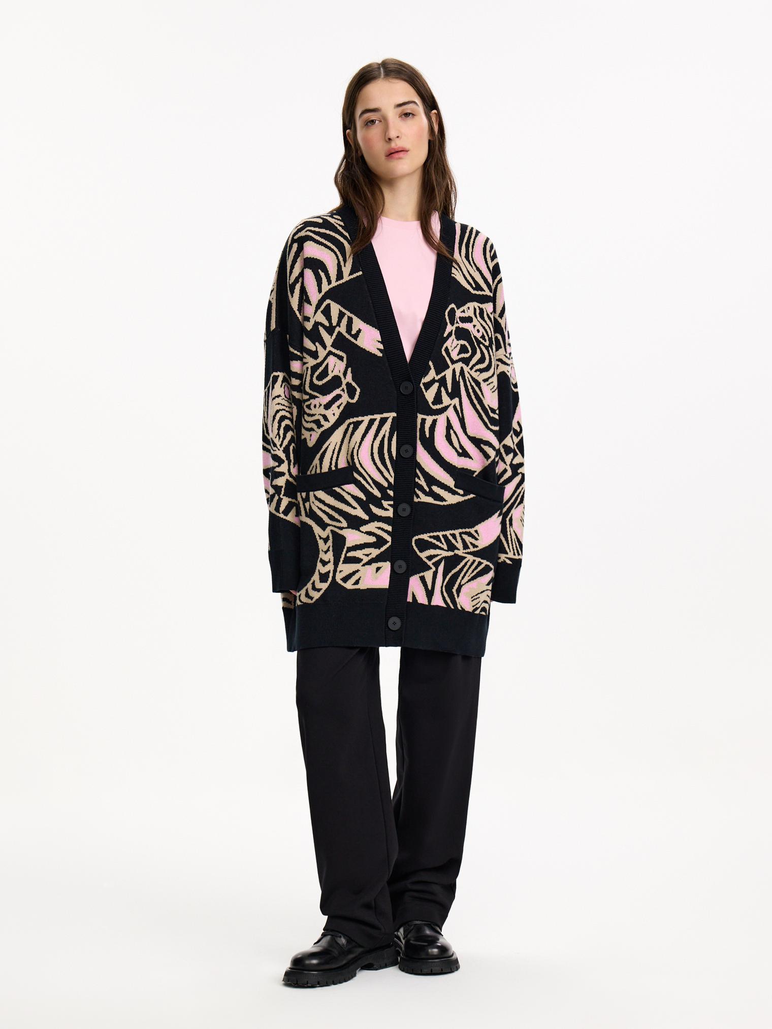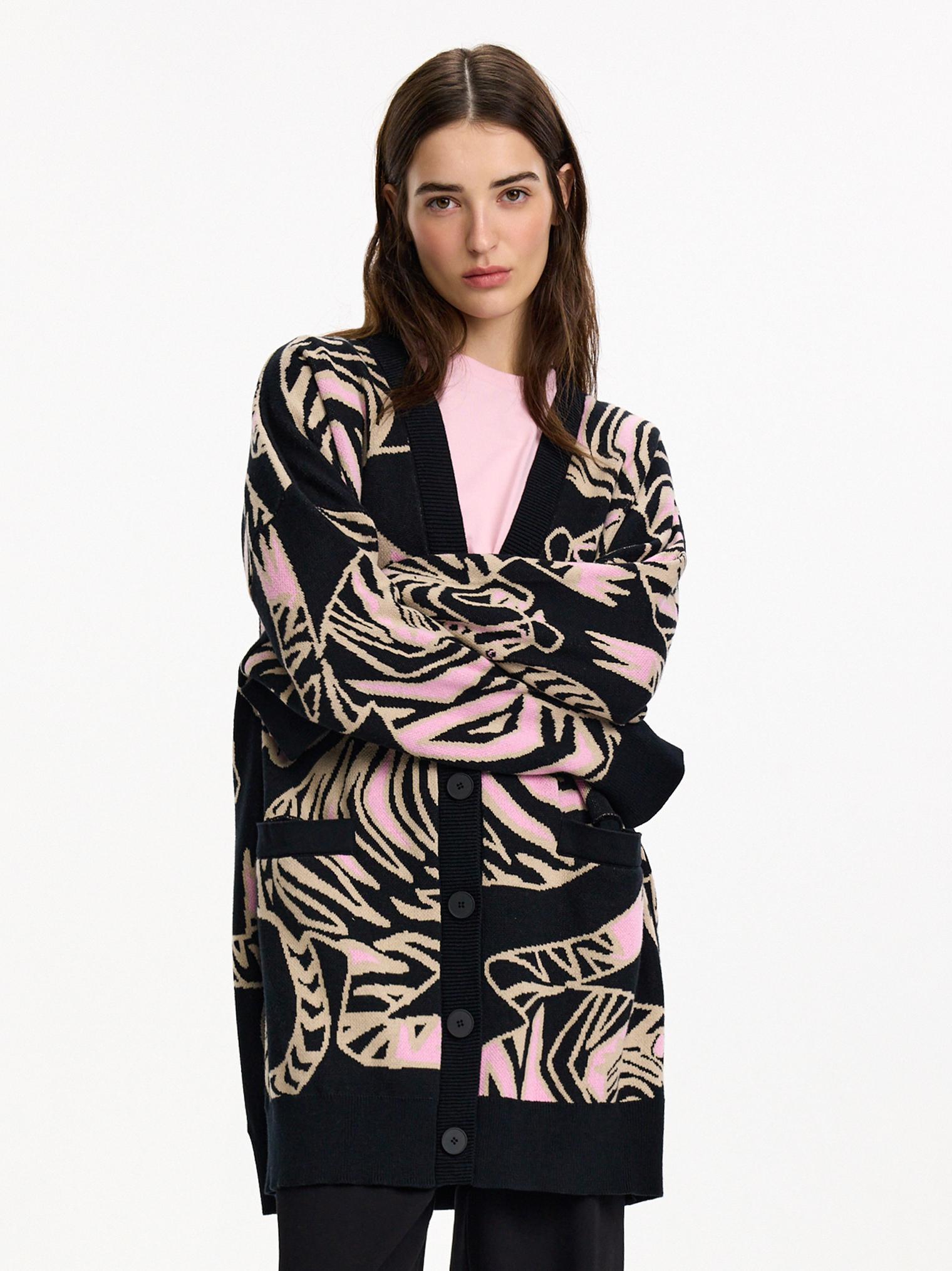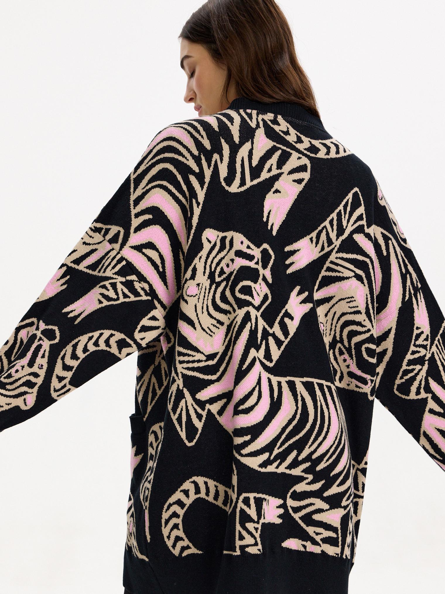Новая модель - оверсайз кардиган с жаккардовым рисунком в виде переплетающихся тигров. Очень уютный и комфортный в ношении, он создан для прохладных весенних вечеров. Такой кардиган разнообразит повседневный образ.
