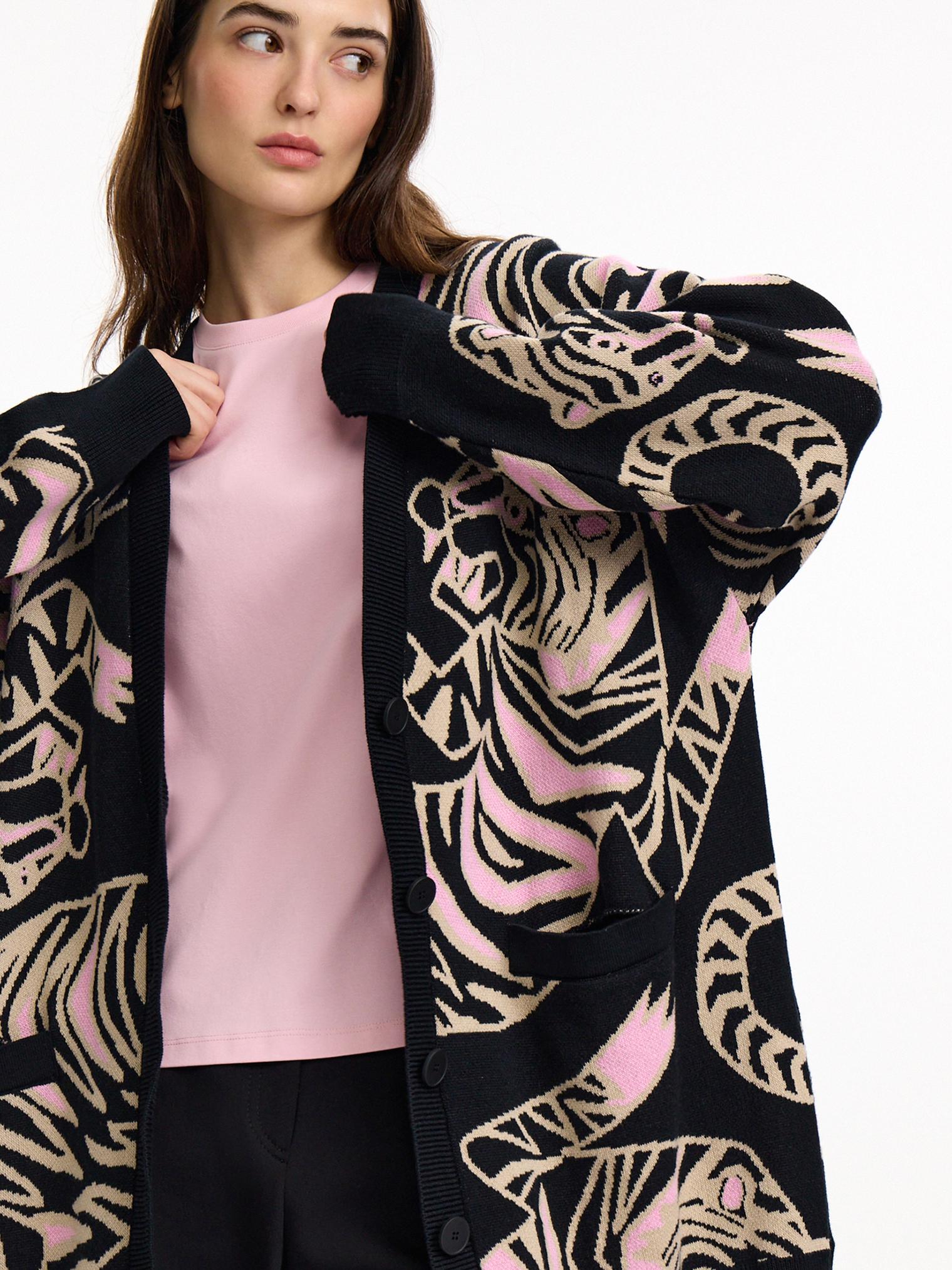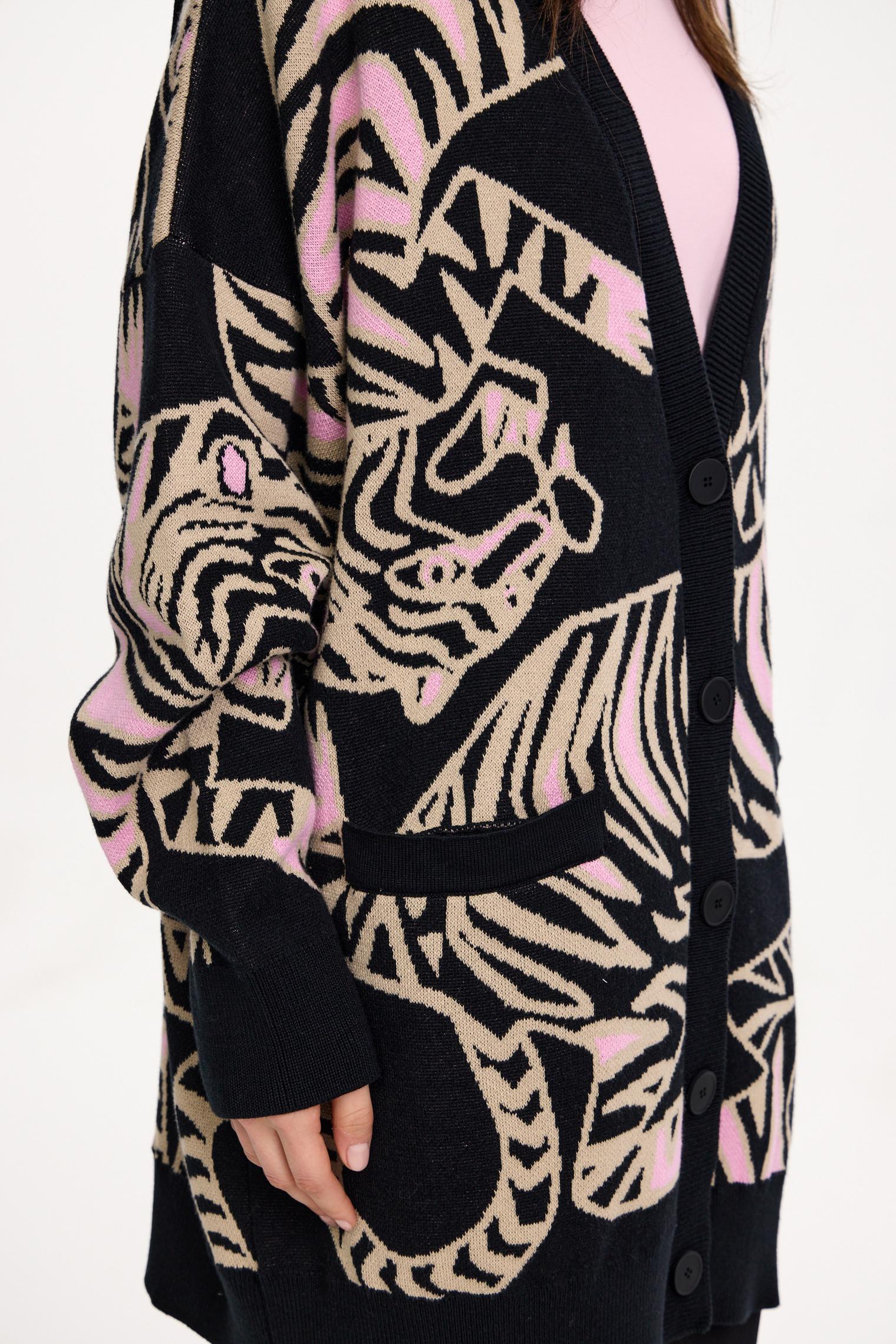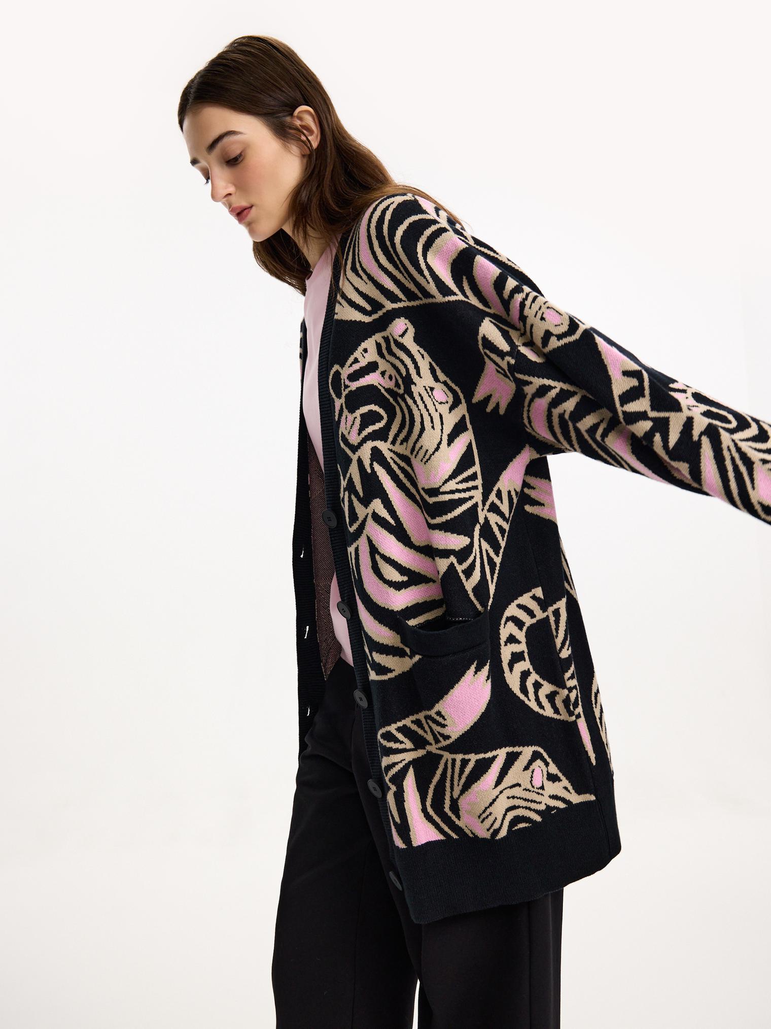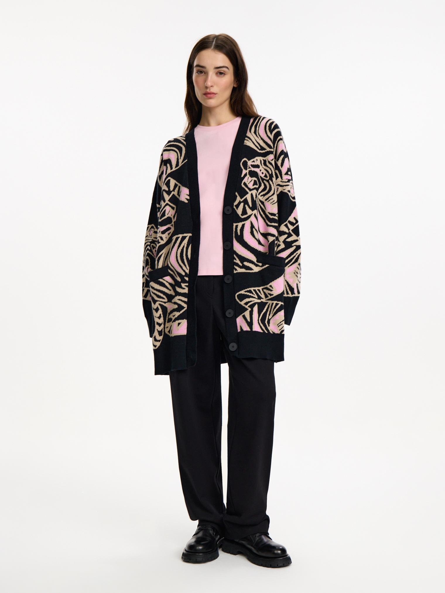 Новая модель - оверсайз кардиган с жаккардовым рисунком в виде переплетающихся тигров. Очень уютный и комфортный в ношении, он создан для прохладных весенних вечеров. Такой кардиган разнообразит повседневный образ.