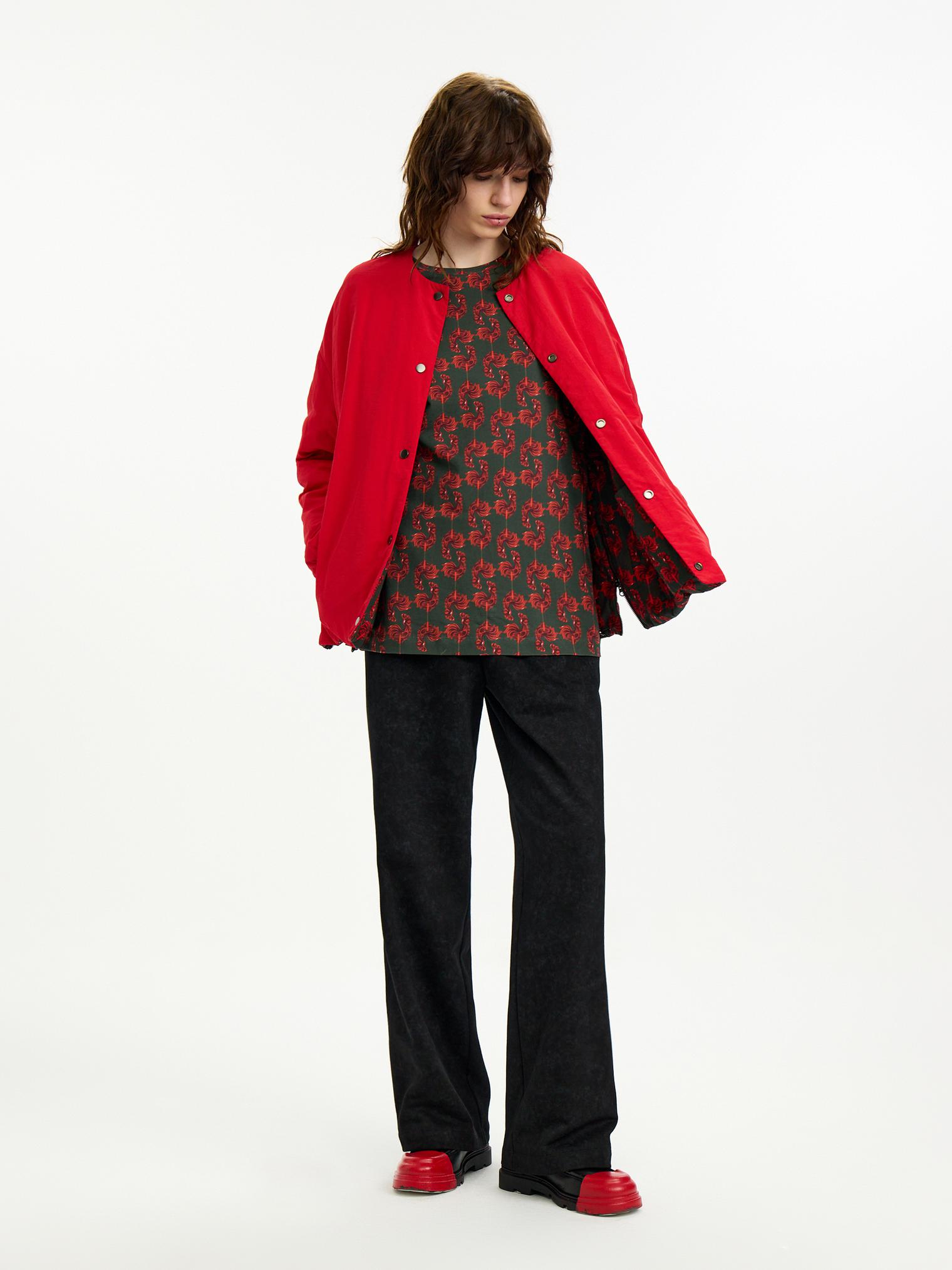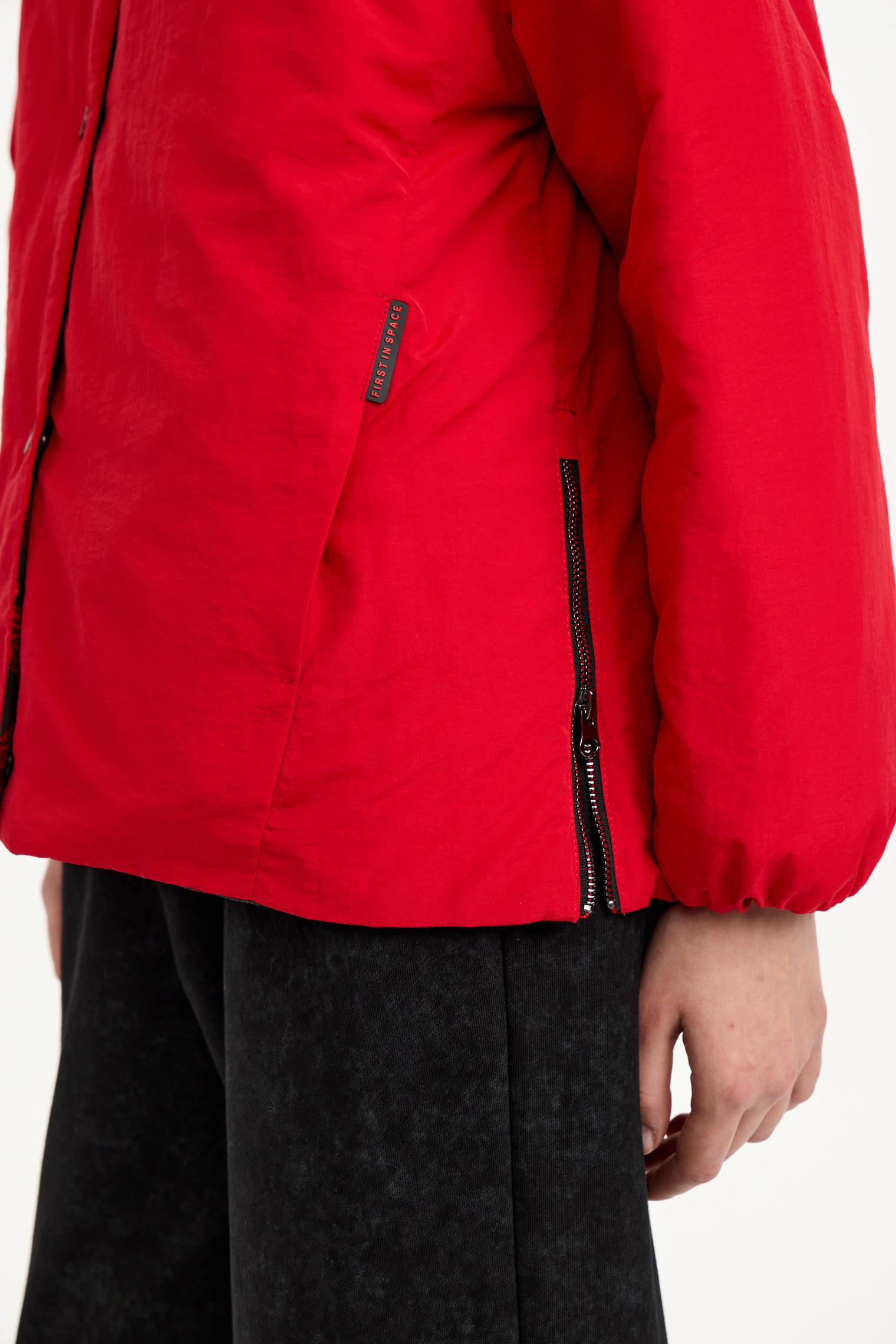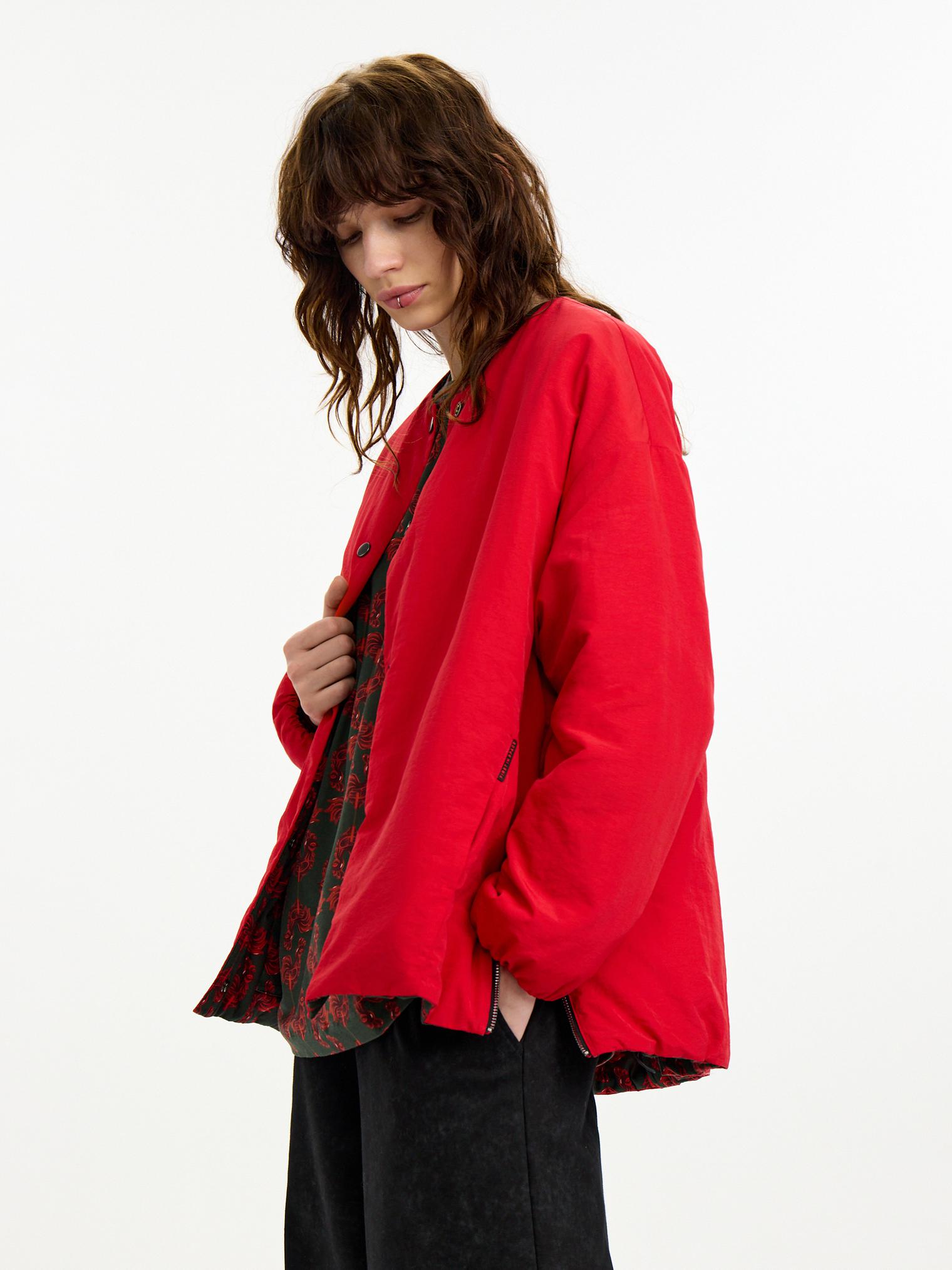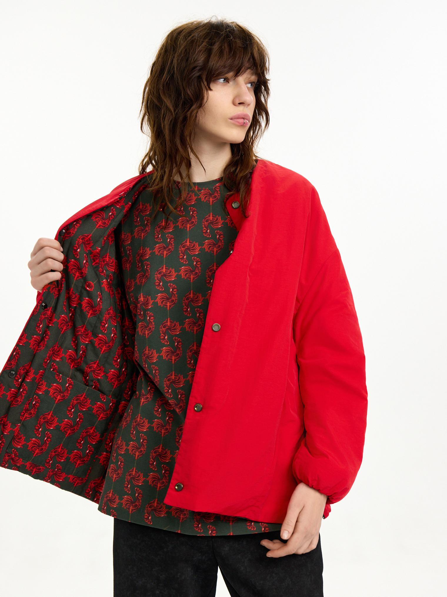 Пусть эта стеганая куртка на кнопках станет ярким ключом к весенней цветотерапии. Сочный красный оттенок и контрастный принт на подкладке добавляют графичности и жизнерадостности образу. Модель объемного расслабленного силуэта средней длины отлично сочетается с черным капюшоном из коллекции на прохладную погоду. Однотонная сторона из курточной ткани с эффектом варки и водоотталкивающими свойствами. Вторая сторона не для дождя - из принтованного, стёганного хлопка.