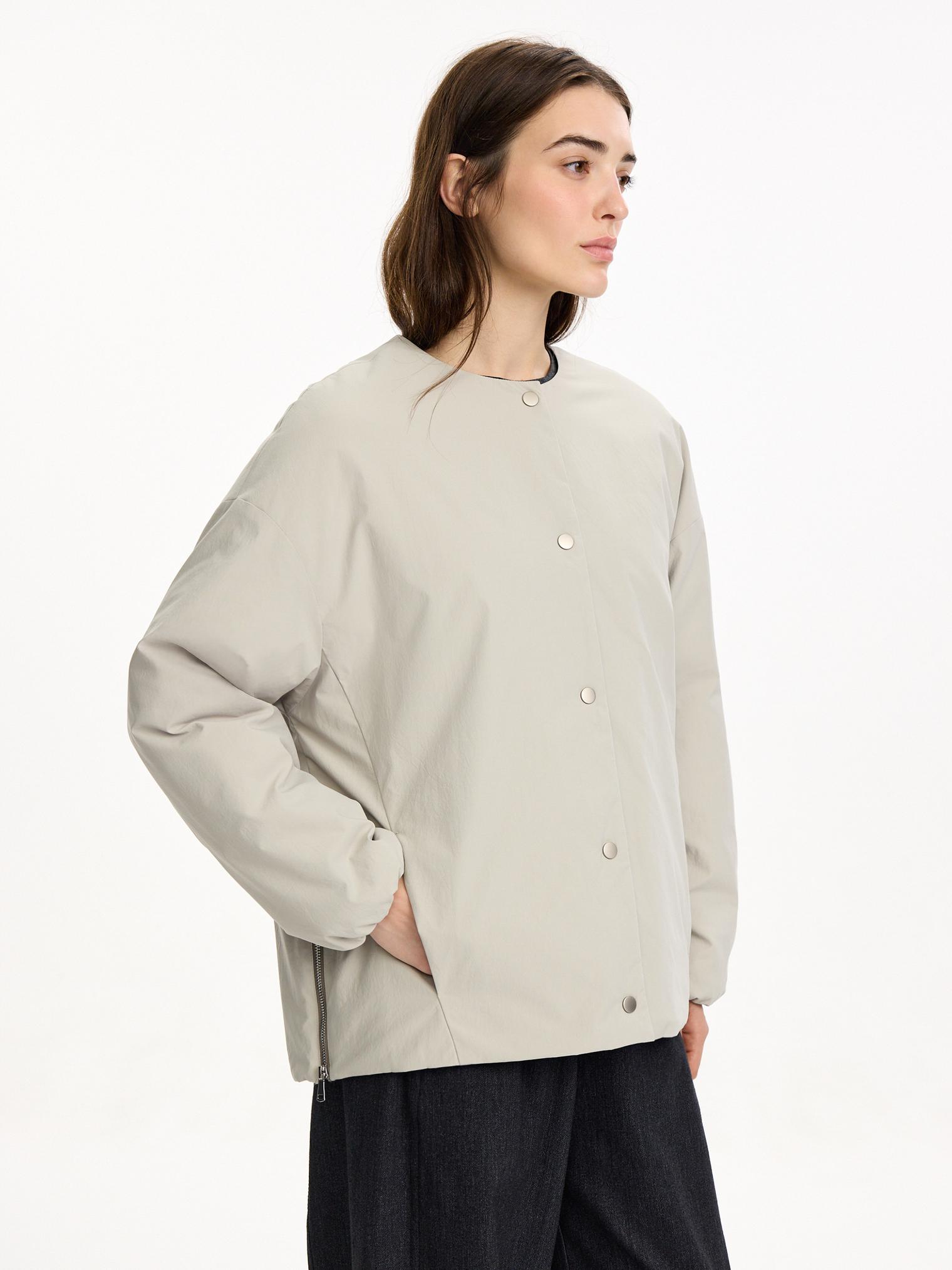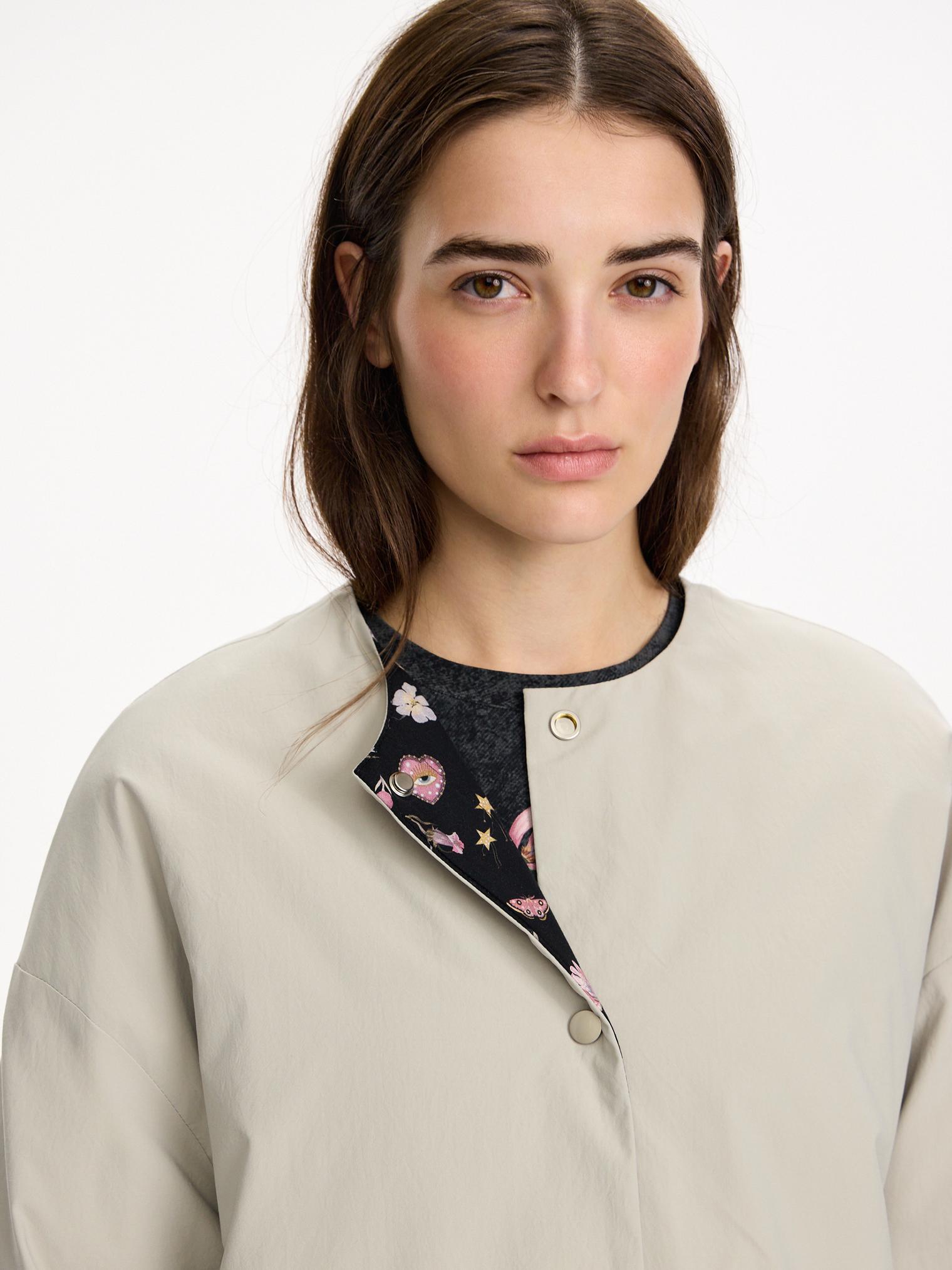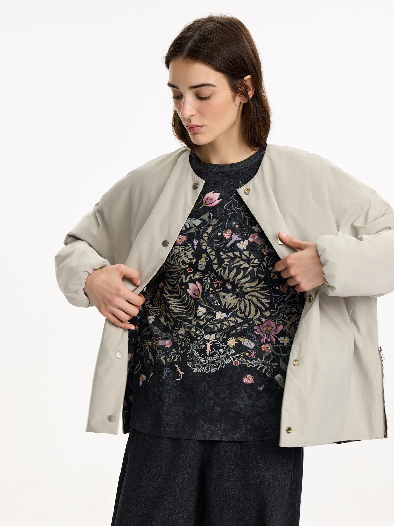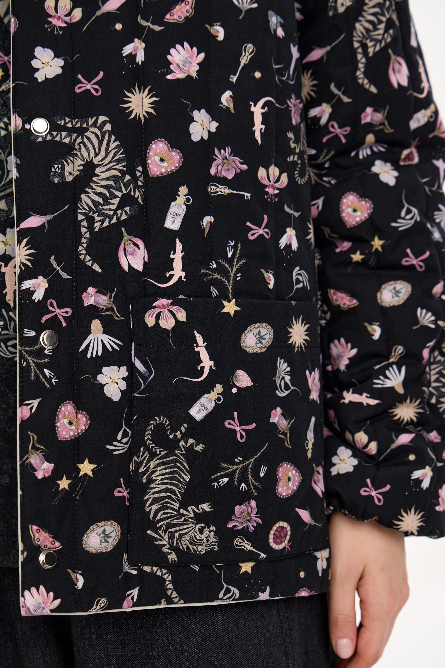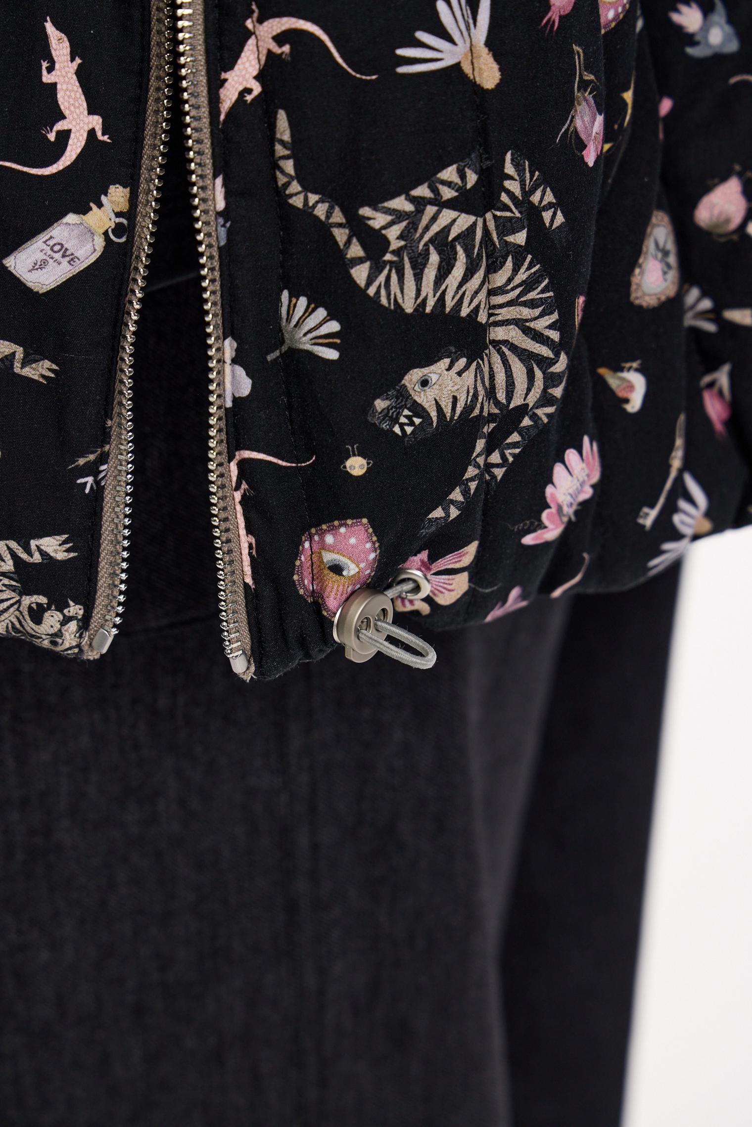 Новая модель двусторонней куртки объемного кроя на кнопках влюбляет в себя с первого взгляда. Внешняя сторона выполнена из курточной ткани с эффектом варки и водоотталкивающими свойствами. Внутренняя сторона из принтованного хлопка согревает и удерживает тепло. Советуем сочетать ее с капюшоном из капсулы Мартивские тигры.