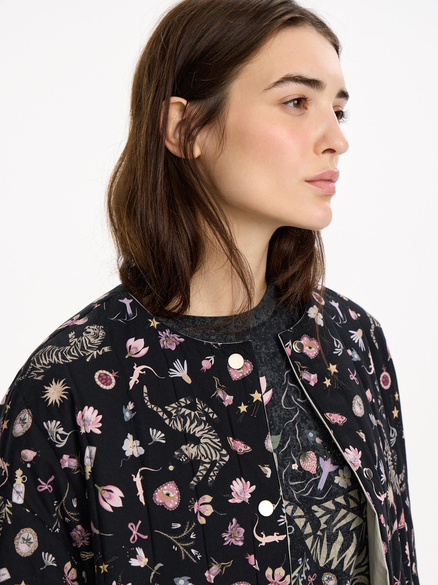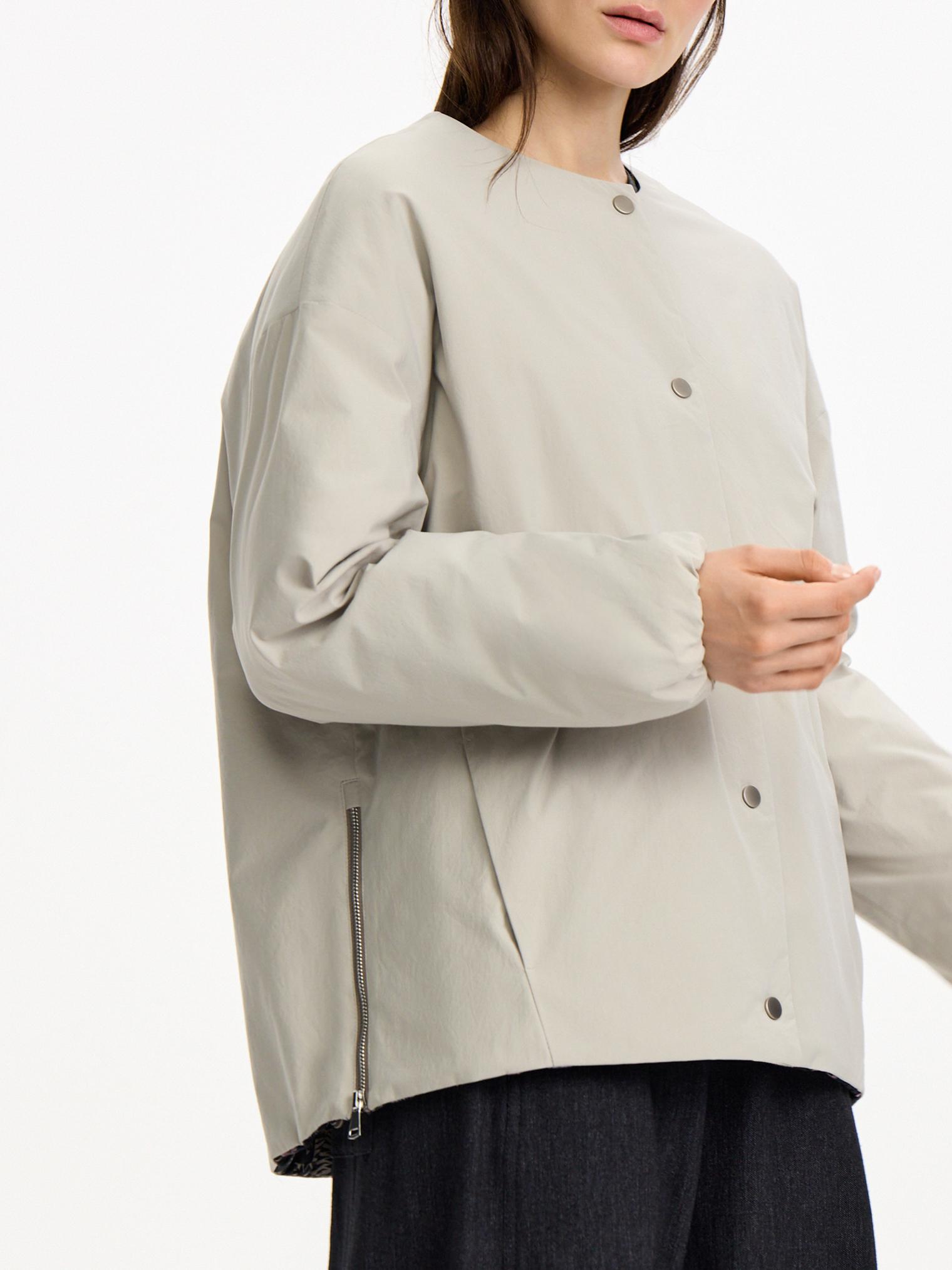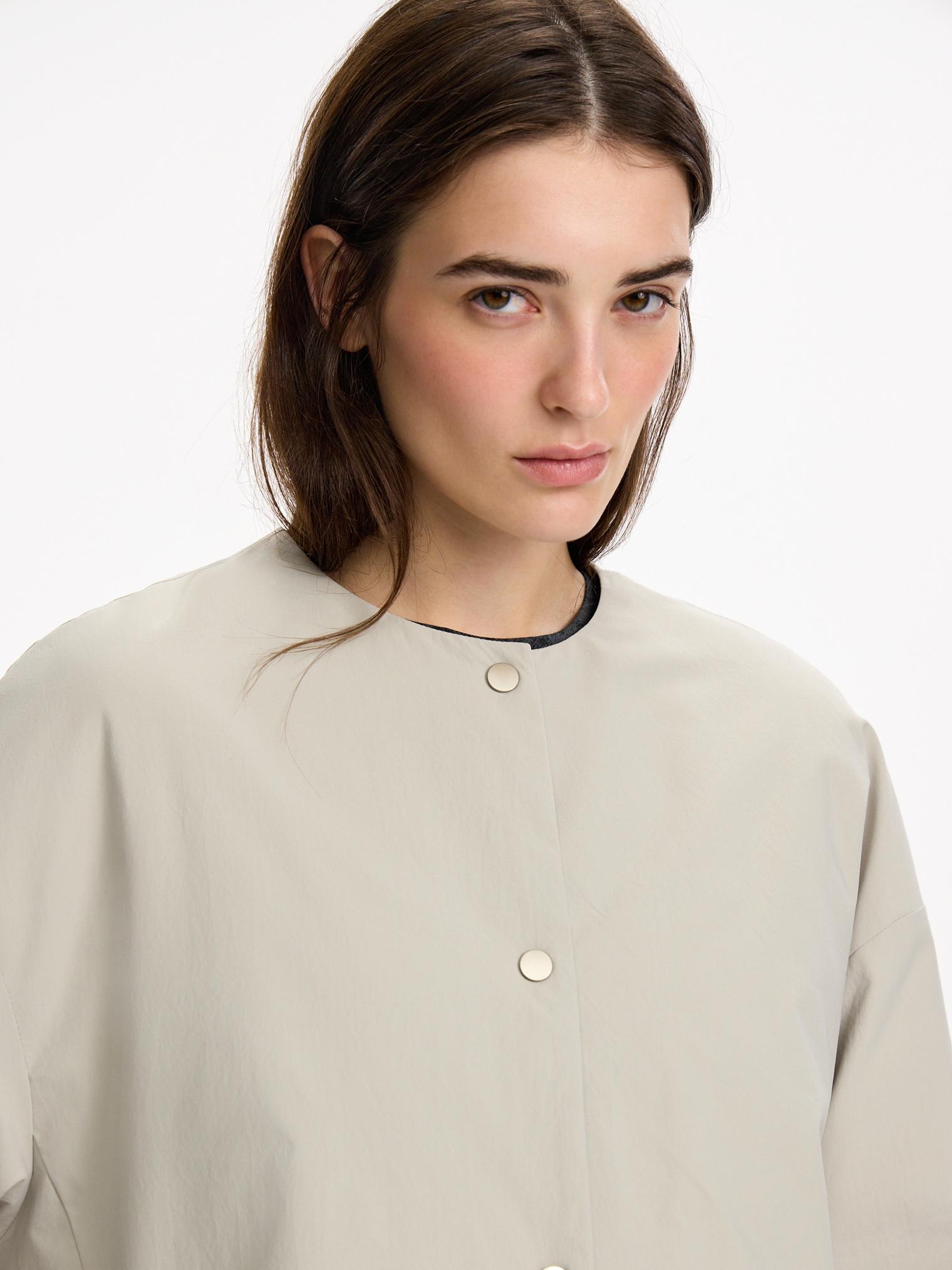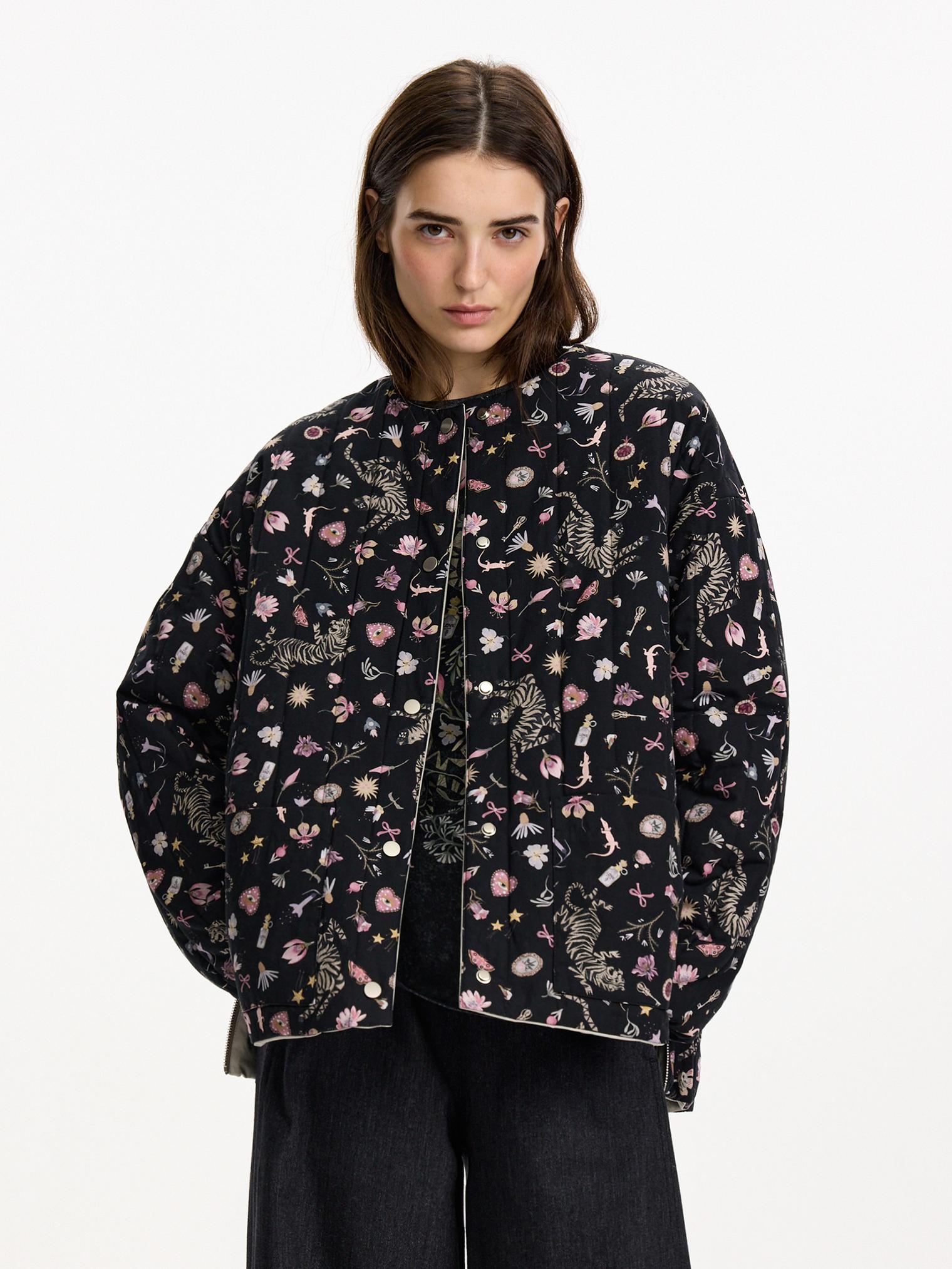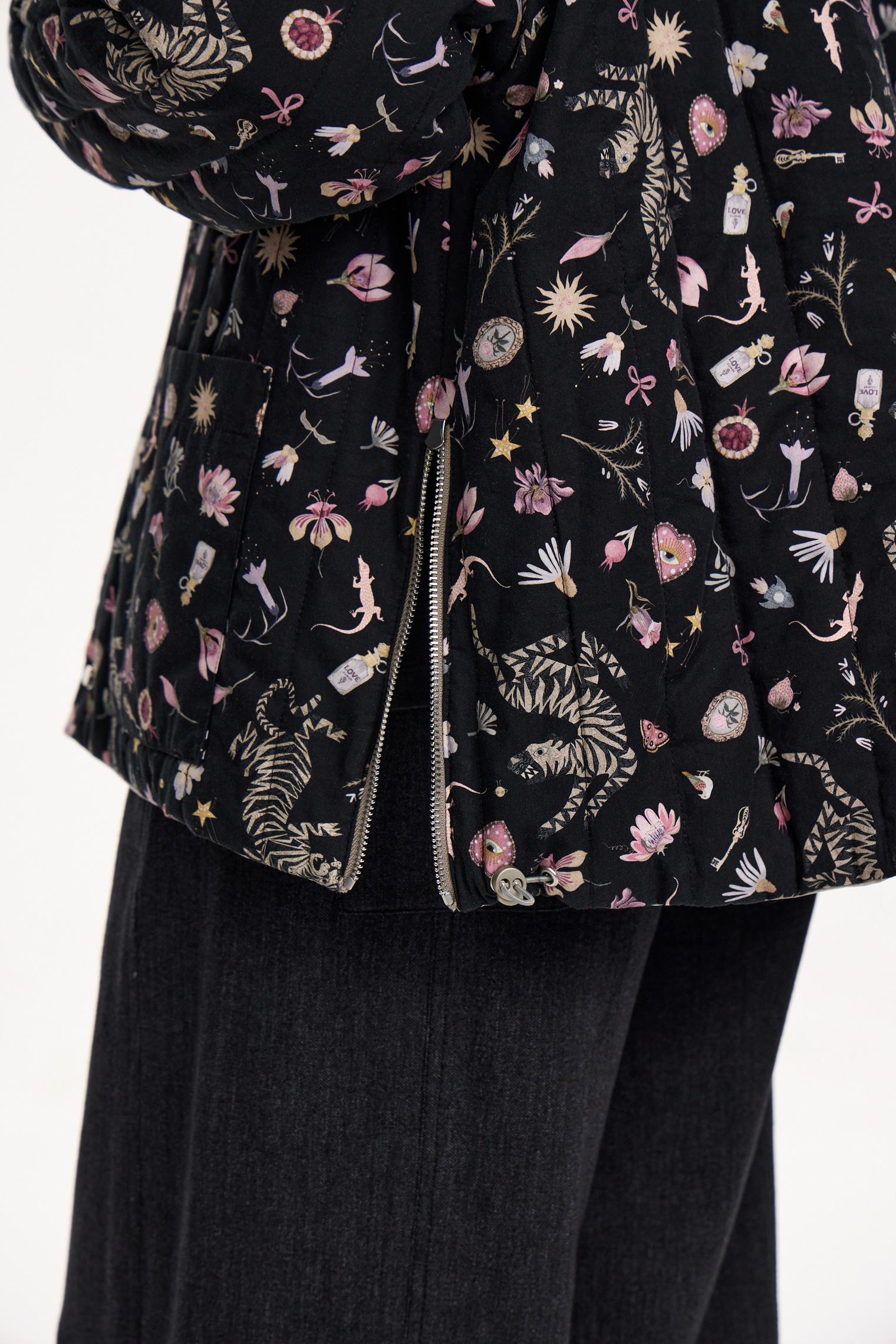 Новая модель двусторонней куртки объемного кроя на кнопках влюбляет в себя с первого взгляда. Внешняя сторона выполнена из курточной ткани с эффектом варки и водоотталкивающими свойствами. Внутренняя сторона из принтованного хлопка согревает и удерживает тепло. Советуем сочетать ее с капюшоном из капсулы Мартивские тигры.