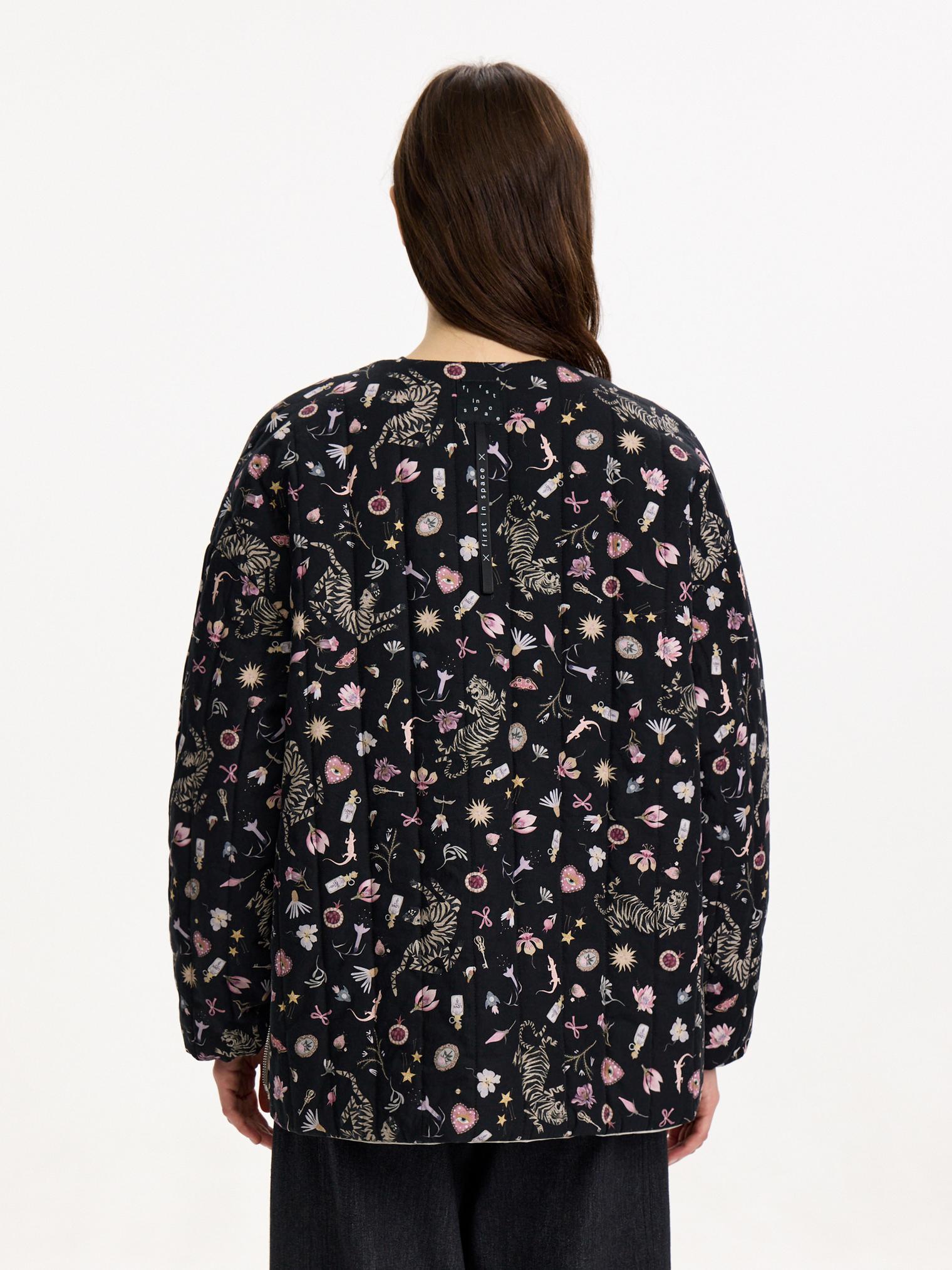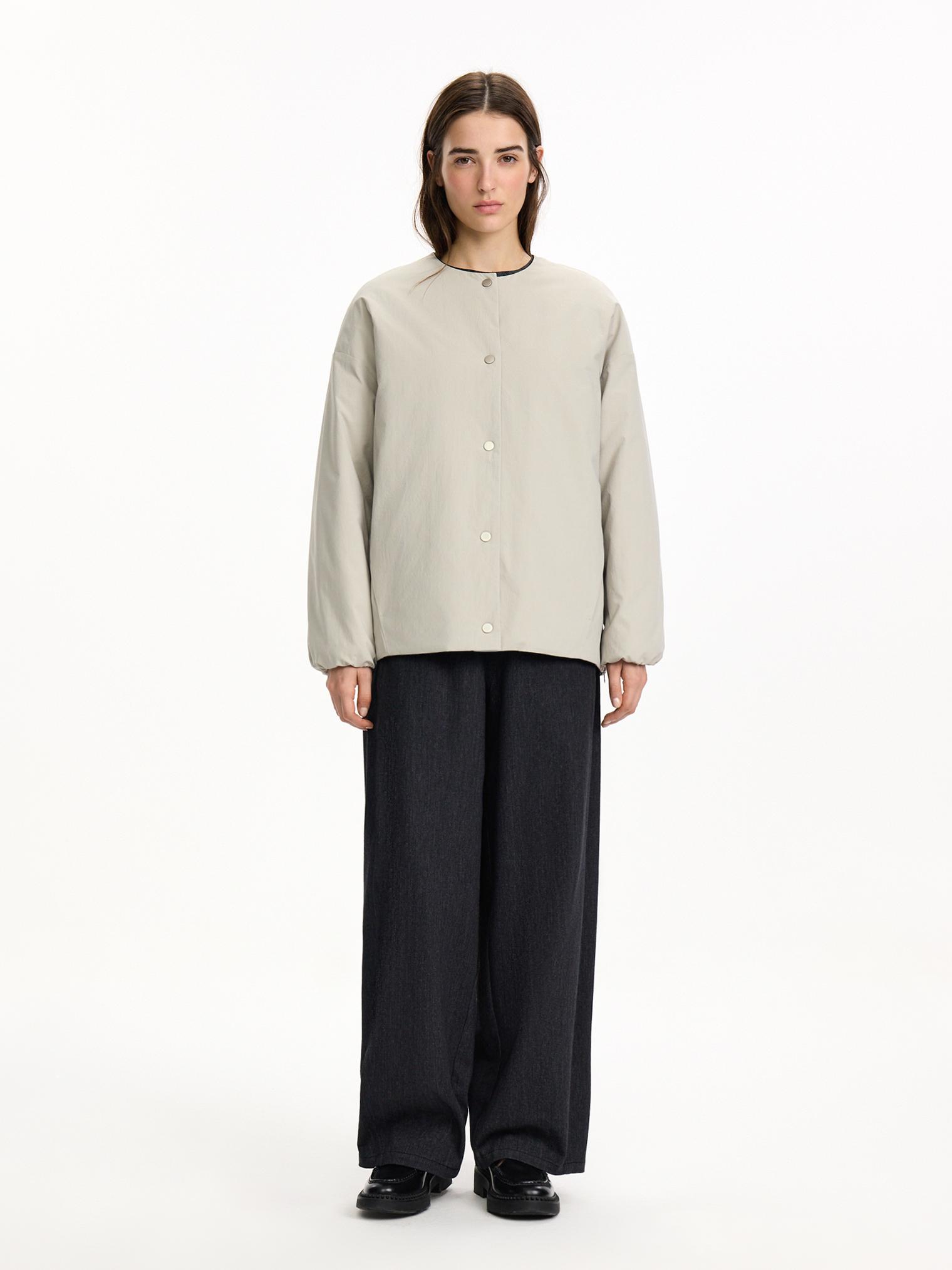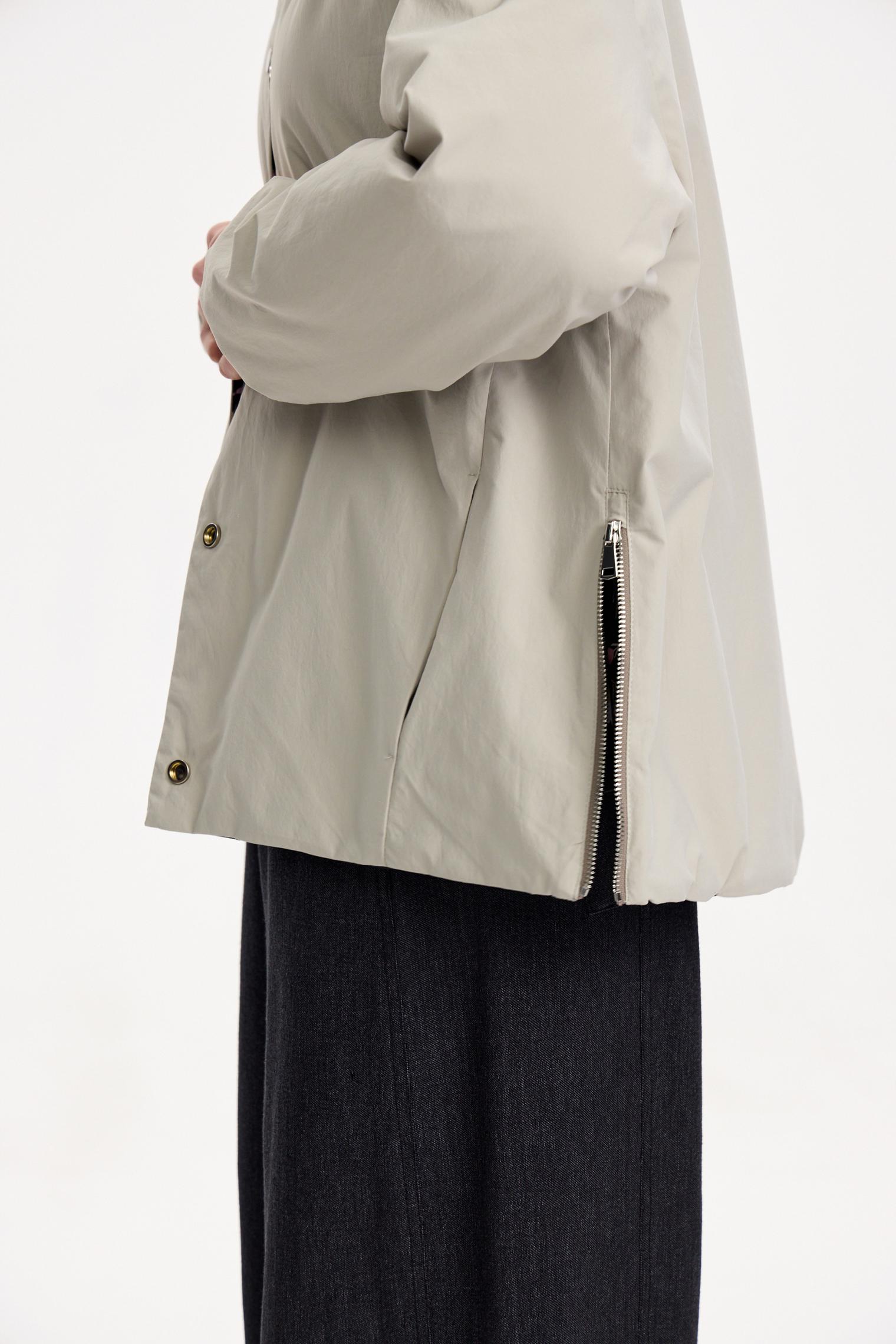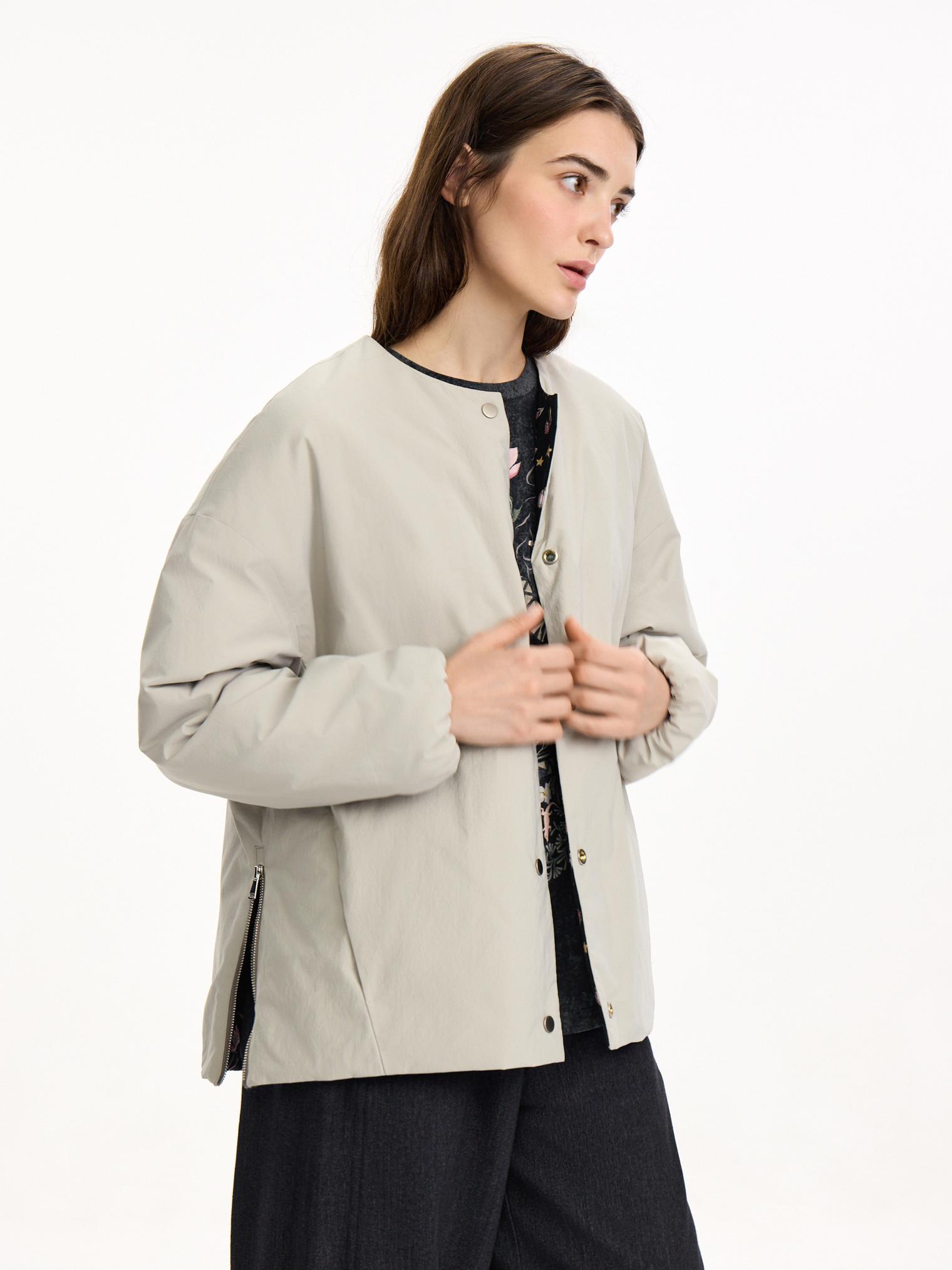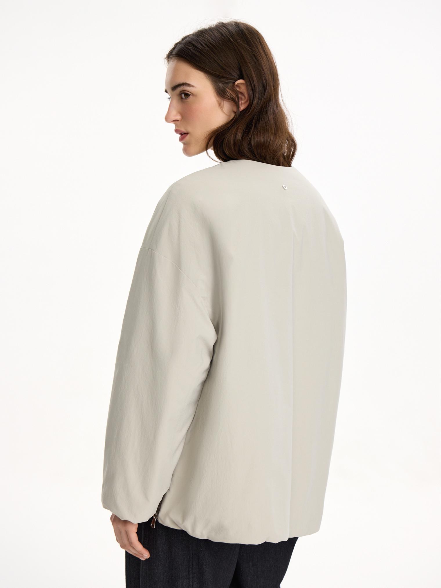 Новая модель двусторонней куртки объемного кроя на кнопках влюбляет в себя с первого взгляда. Внешняя сторона выполнена из курточной ткани с эффектом варки и водоотталкивающими свойствами. Внутренняя сторона из принтованного хлопка согревает и удерживает тепло. Советуем сочетать ее с капюшоном из капсулы Мартивские тигры.