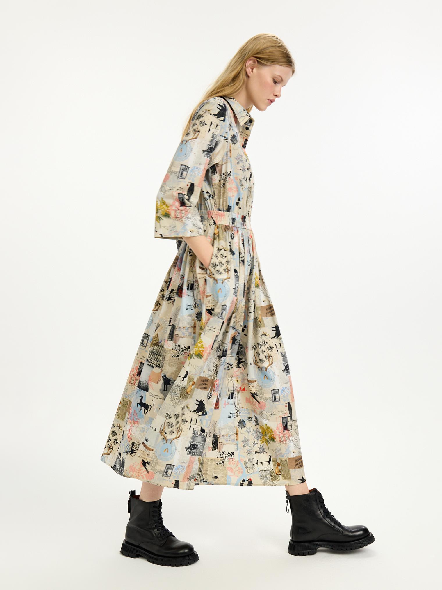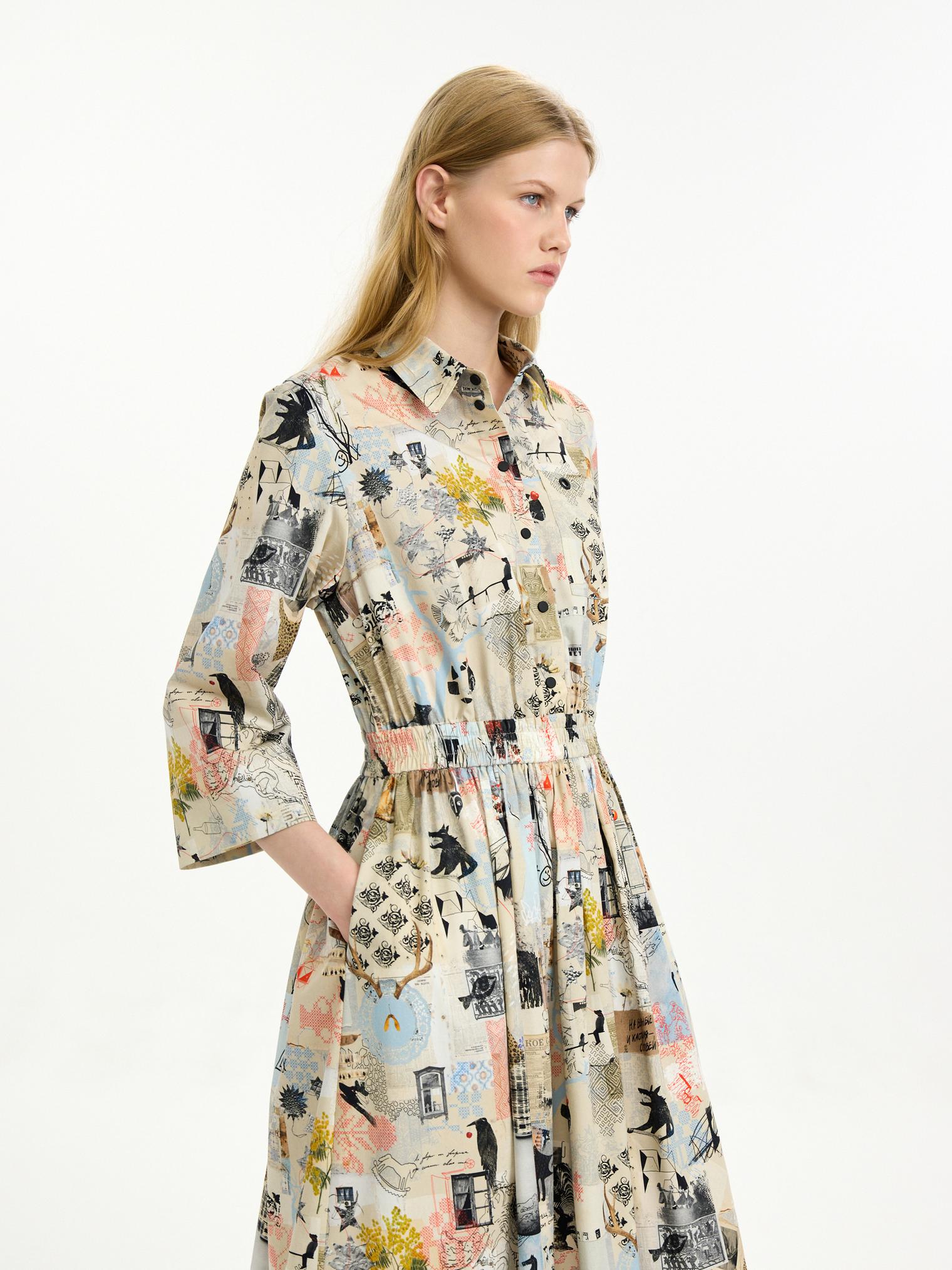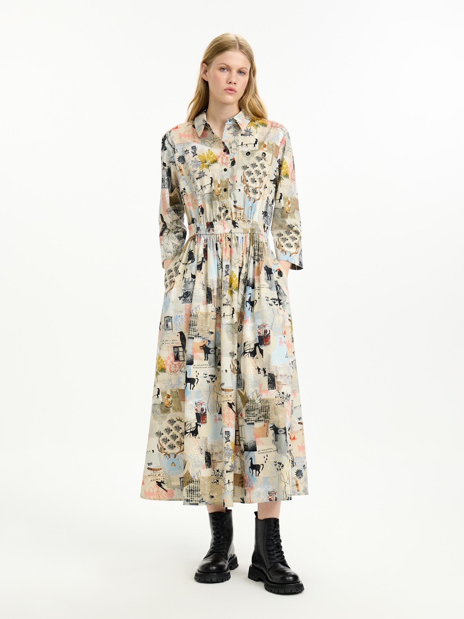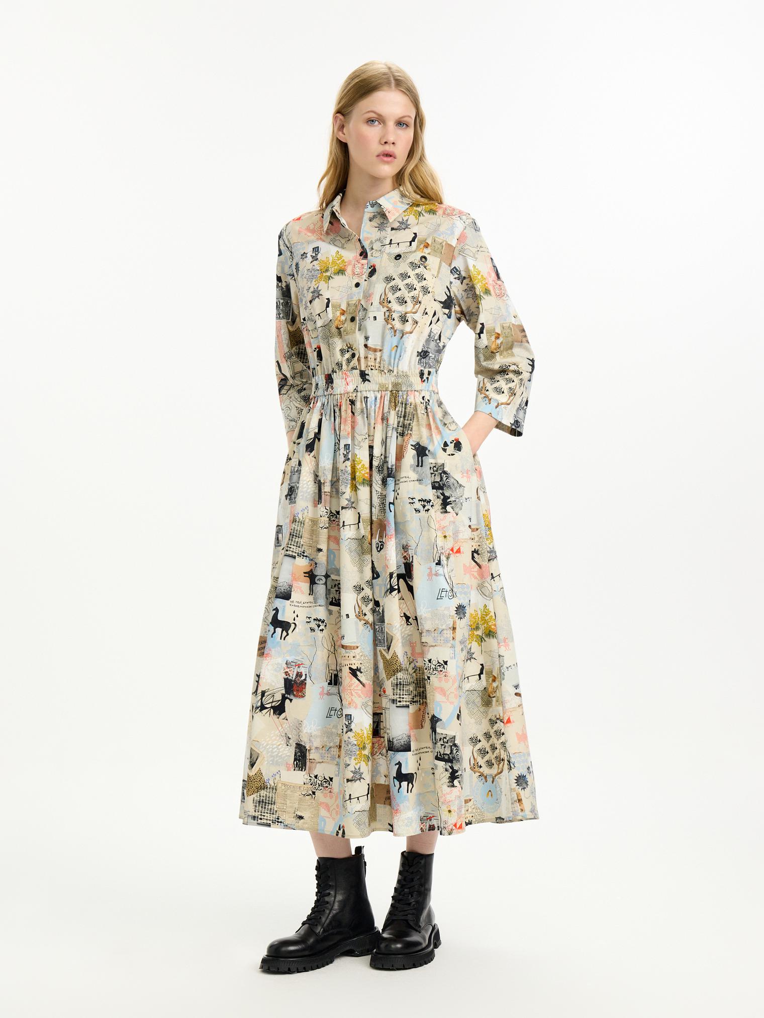 Платье-рубашка из хлопка с вискозой добавит красок демисезооному гардеробу. Мы адаптировали фасон модели, сделав ее приталенной за счёт резинки на поясе. Мы также улучшили материал: комбинированный хлопок с вискозой стал мягкче, легче струится и мало мнется. Авторский принт в коллажной технике добавляет визуальный колорит образу.