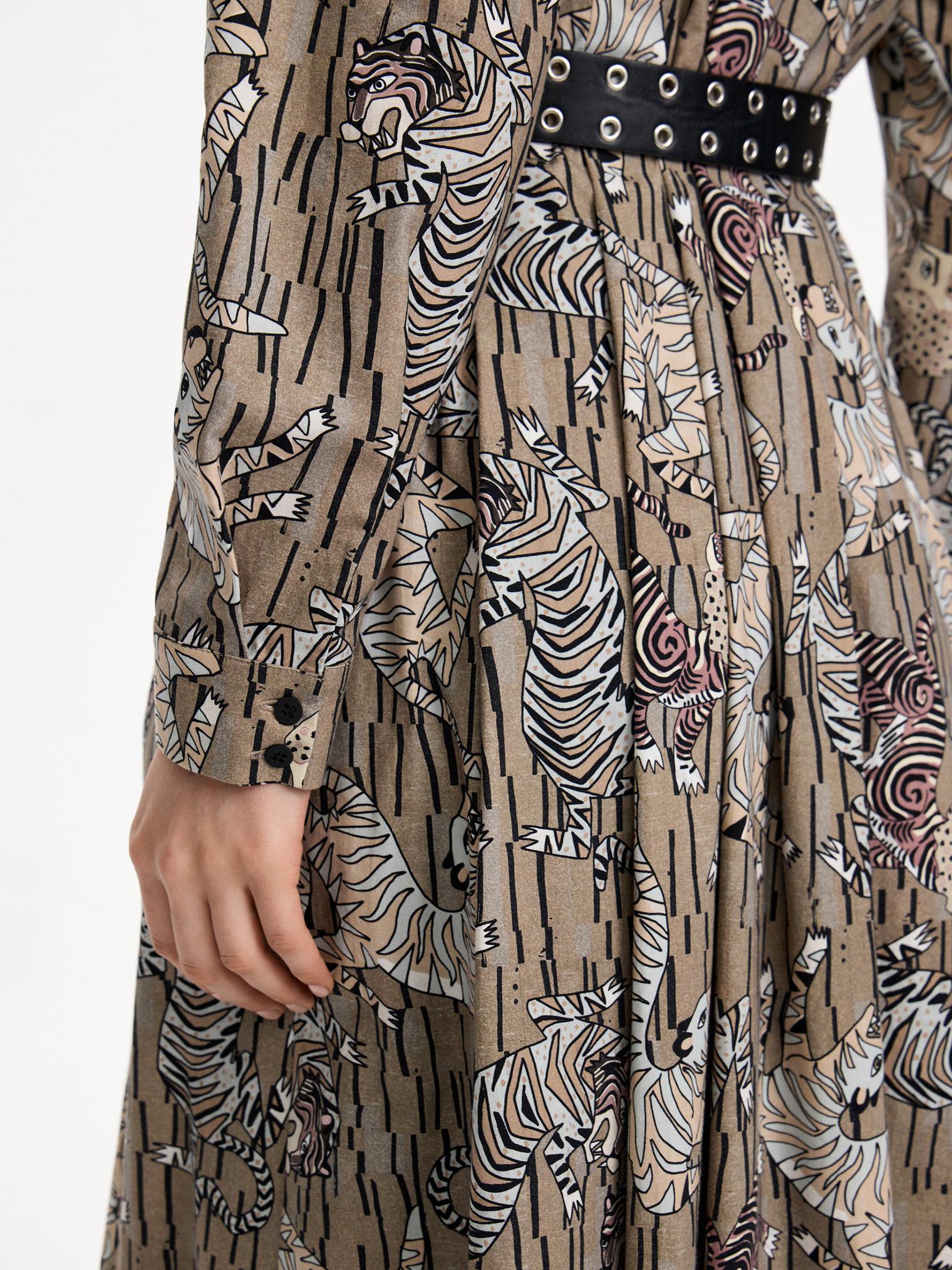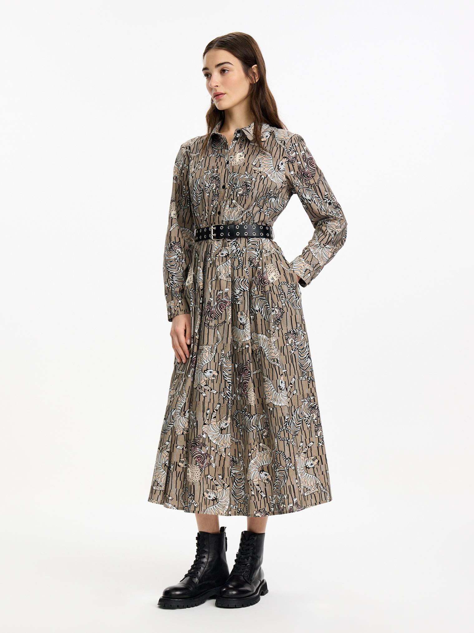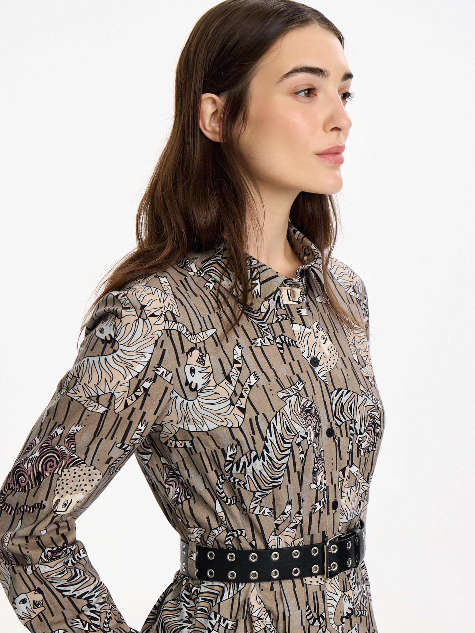 Платье-рубашка - бестселлер наших коллекций. Модель из хлопка с эластаном оттенка разбеленного хаки оформлена принтом с ритмичными тиграми. Широкий ремень с двумя рядами металлических люверсов в комплекте.