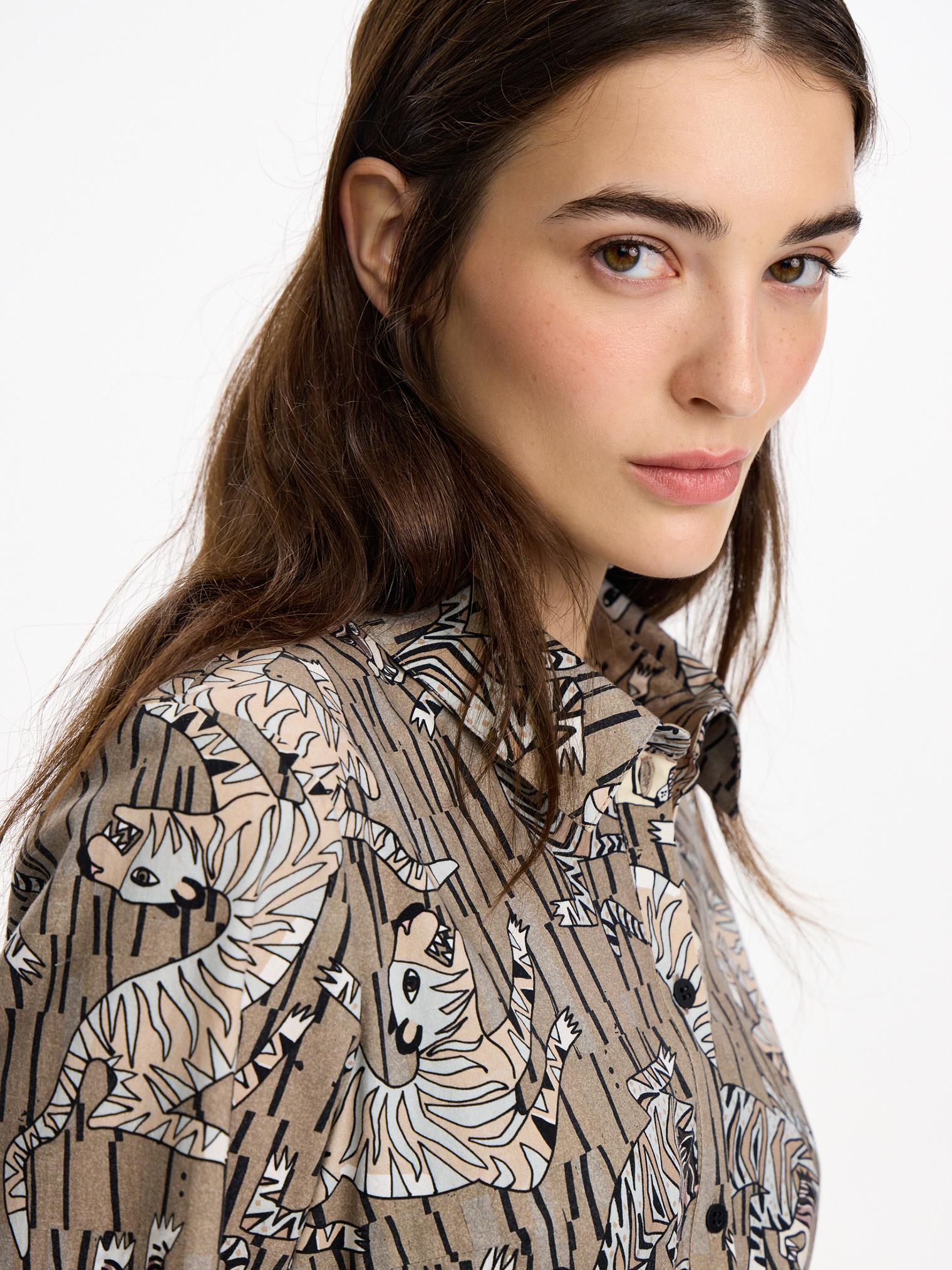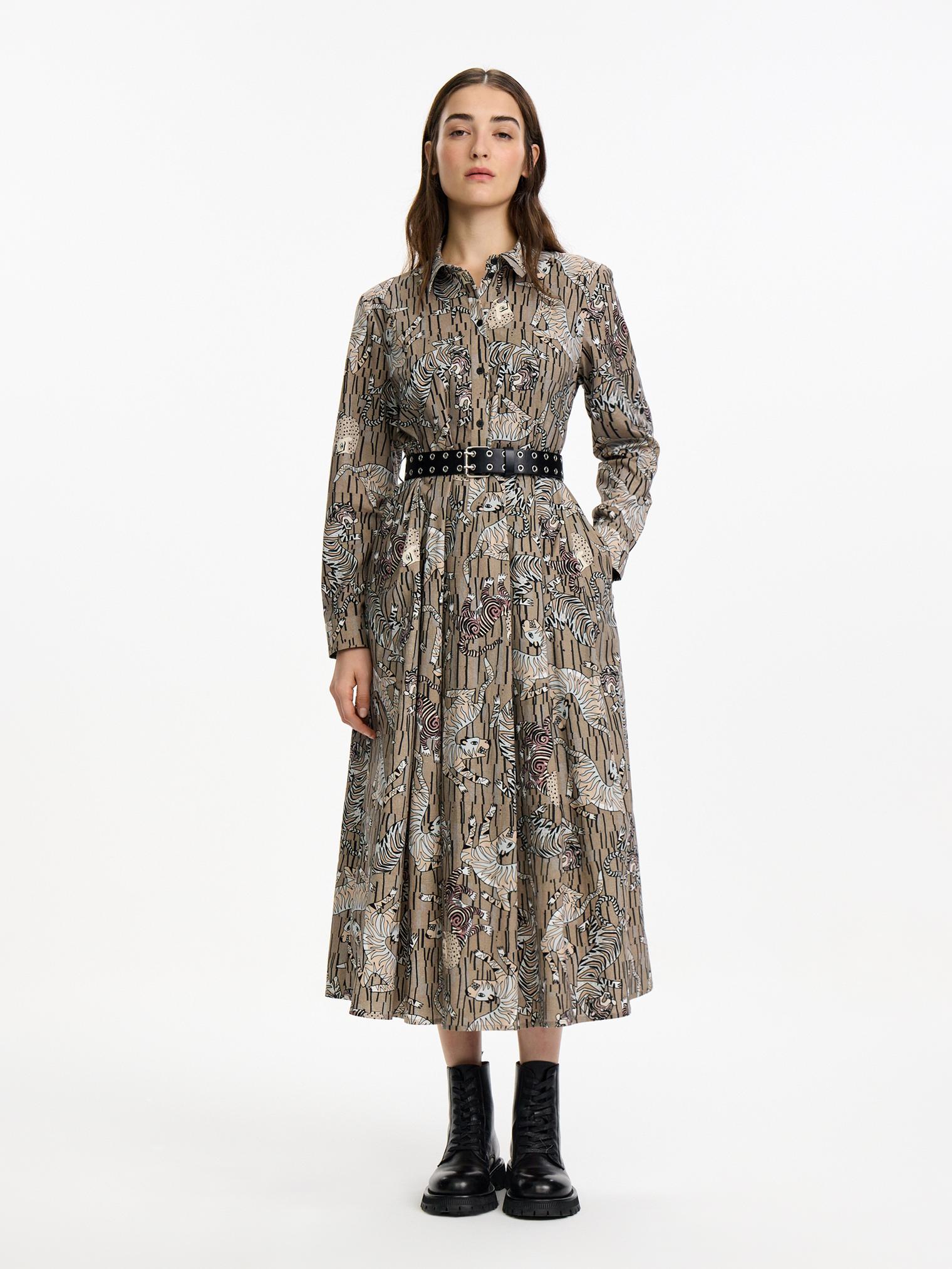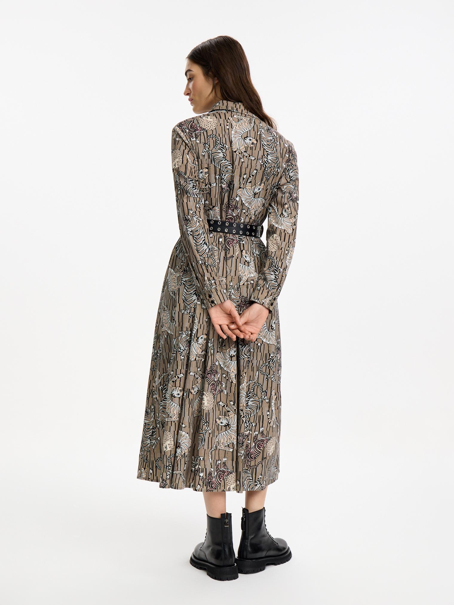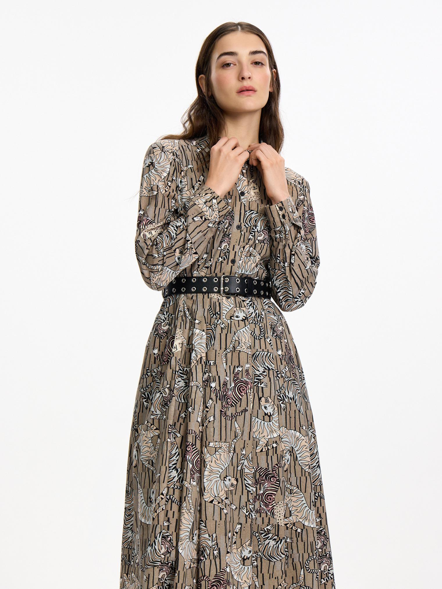 Платье-рубашка - бестселлер наших коллекций. Модель из хлопка с эластаном оттенка разбеленного хаки оформлена принтом с ритмичными тиграми. Широкий ремень с двумя рядами металлических люверсов в комплекте.