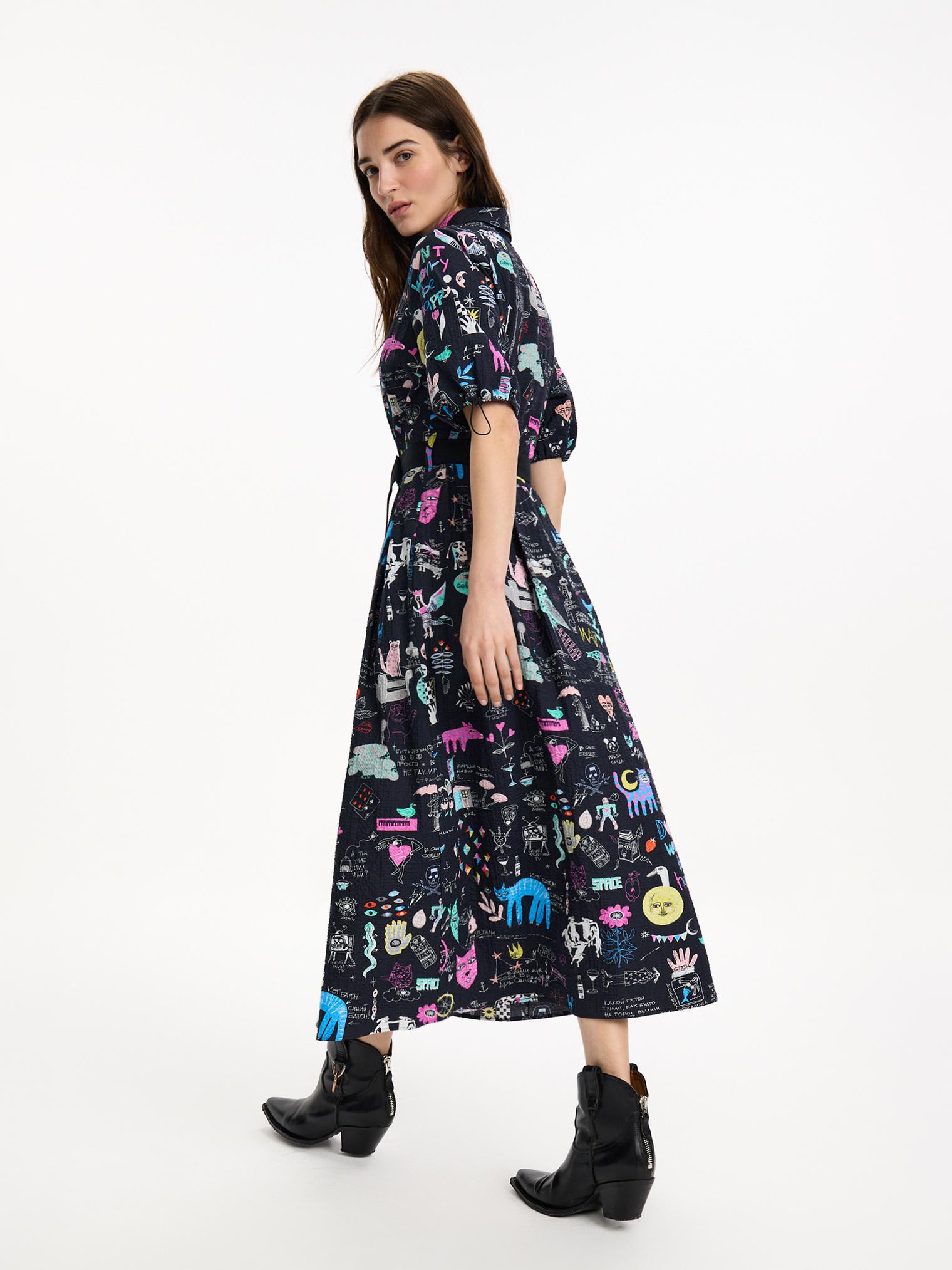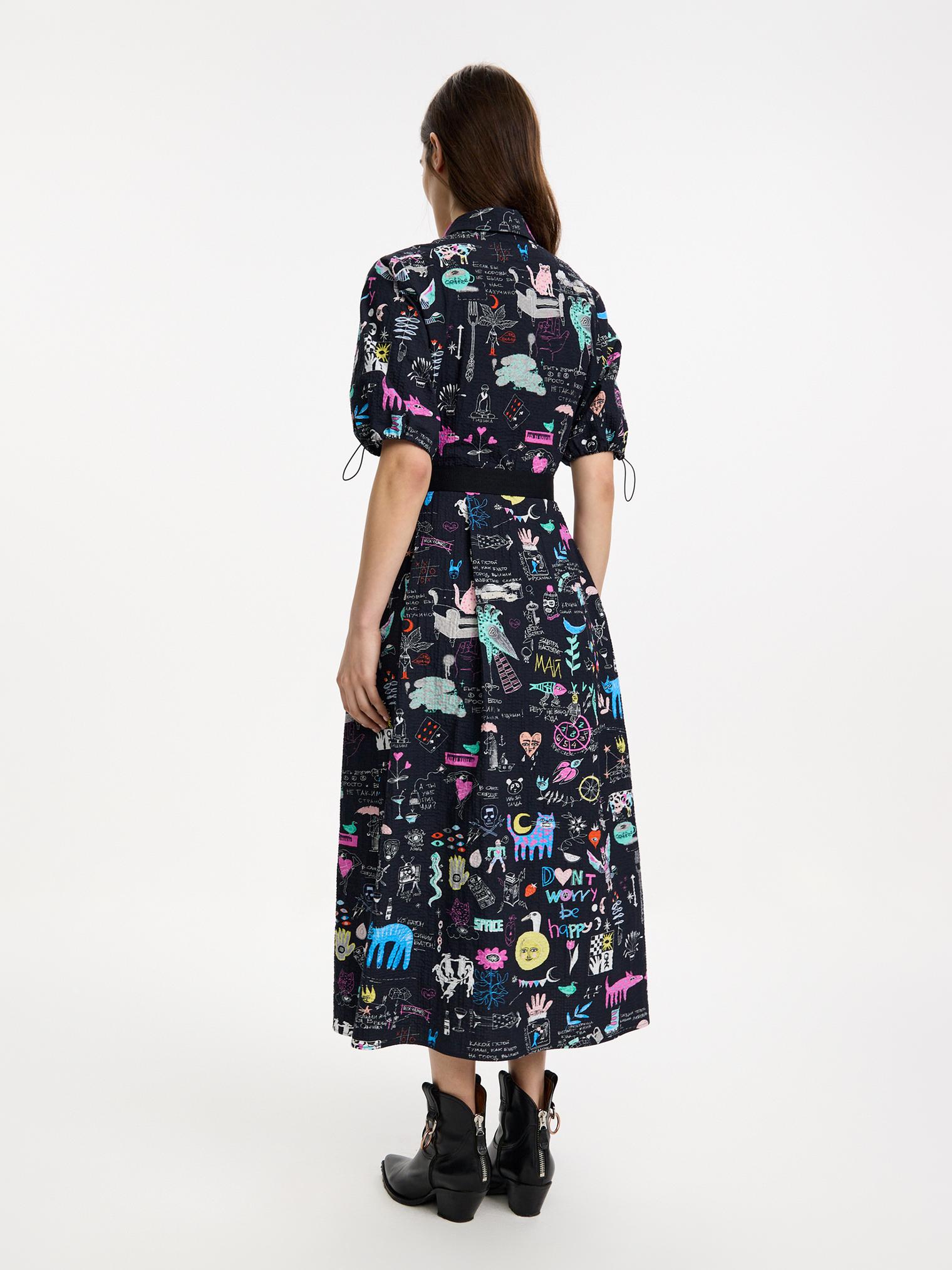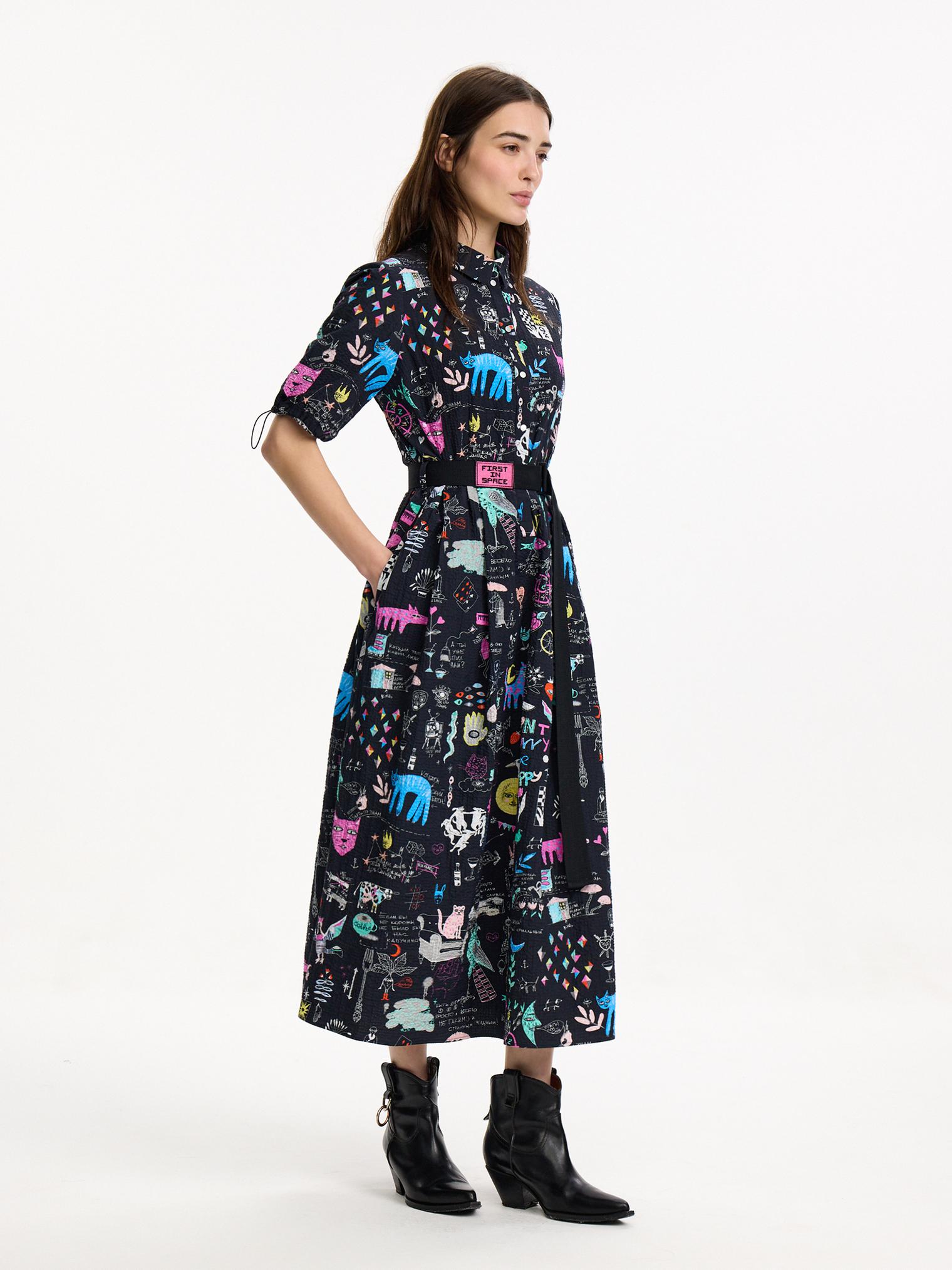 Платье-рубашка из крэшированного хлопка, легкого материала с необычной мятой фактурой. Подчеркнутая талия и юбка миди создают женственный силуэт, актуальный в любом сезоне. Сплошной авторский принт придает контрастности образу.