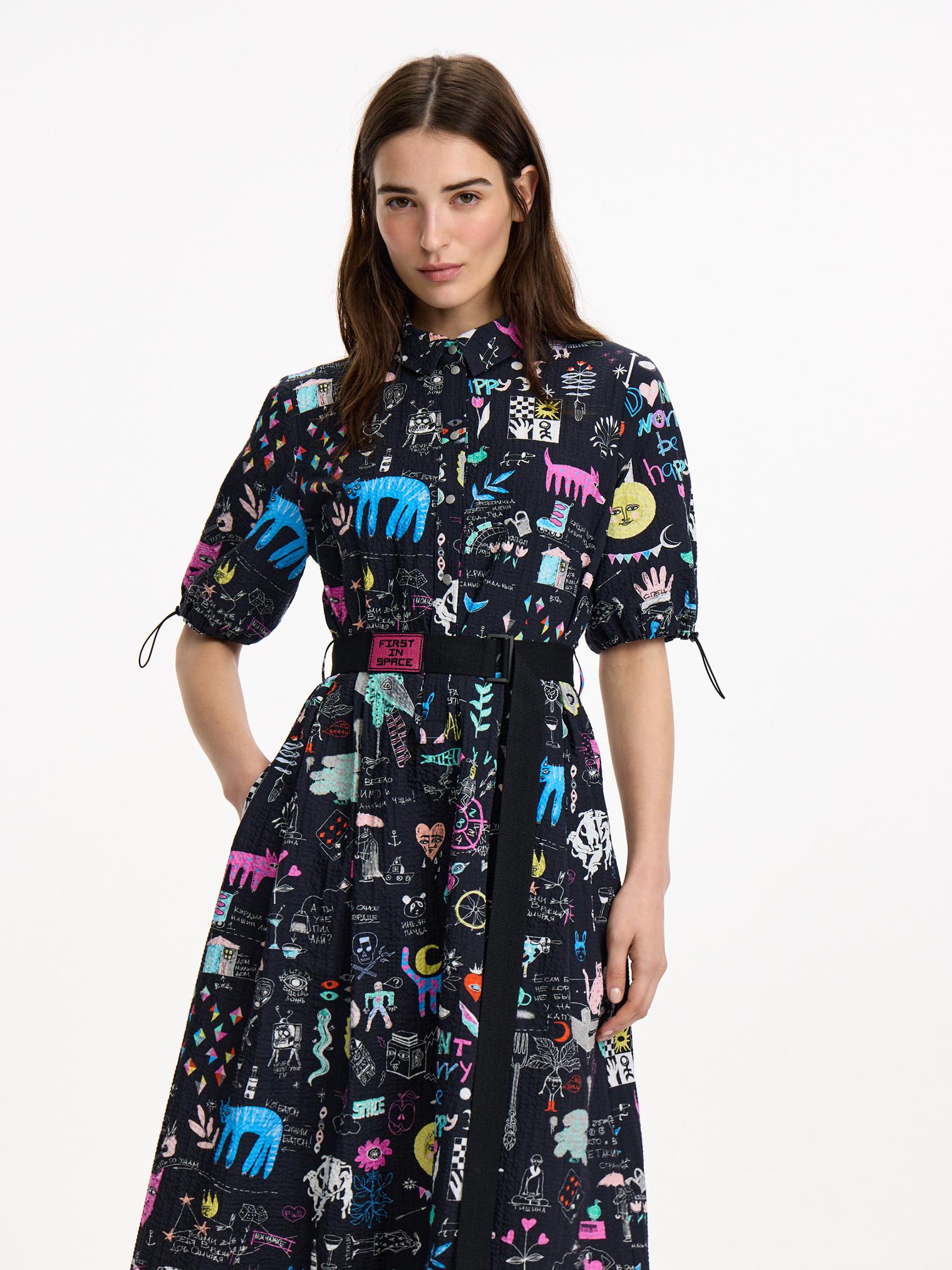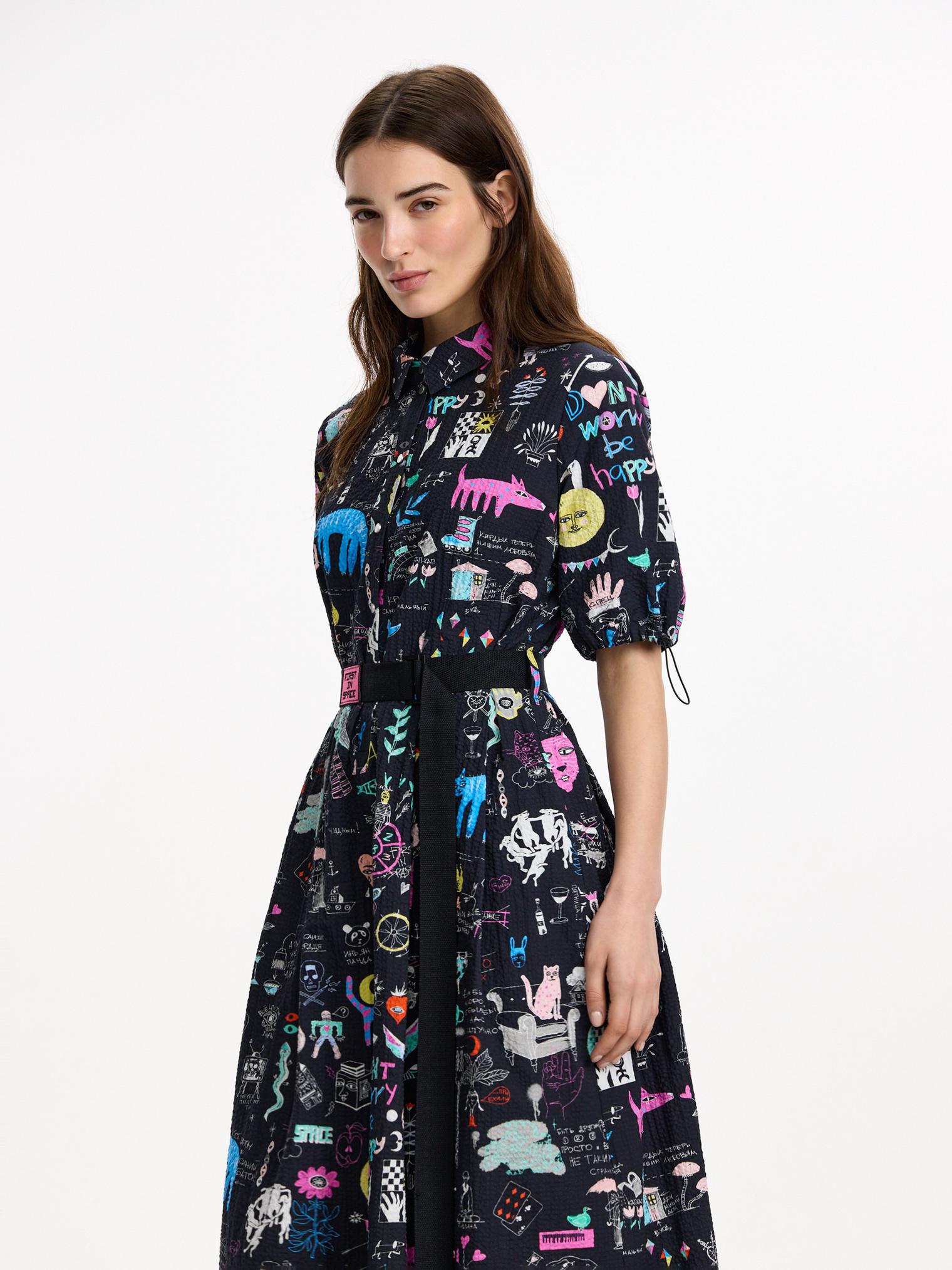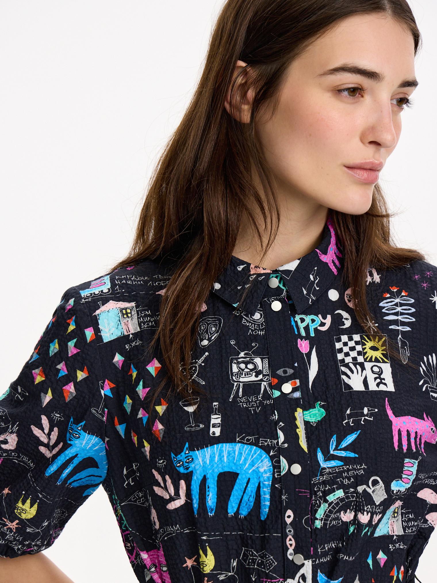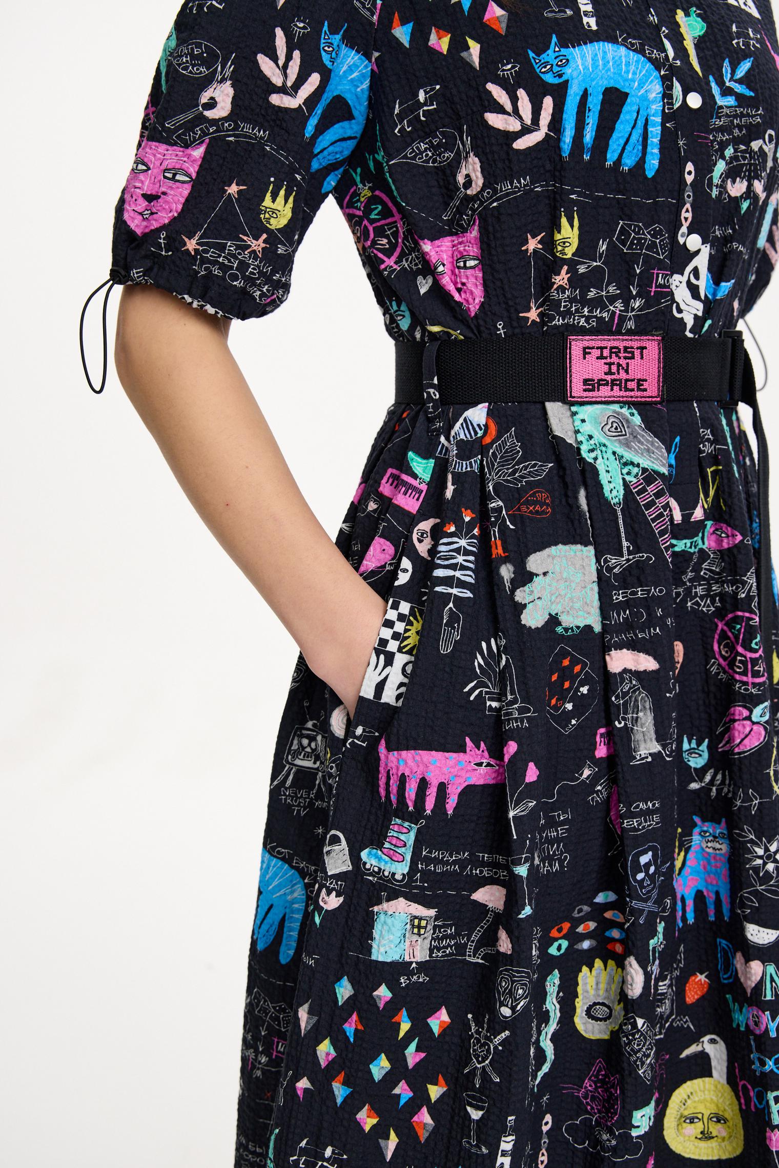 Платье-рубашка из крэшированного хлопка, легкого материала с необычной мятой фактурой. Подчеркнутая талия и юбка миди создают женственный силуэт, актуальный в любом сезоне. Сплошной авторский принт придает контрастности образу.