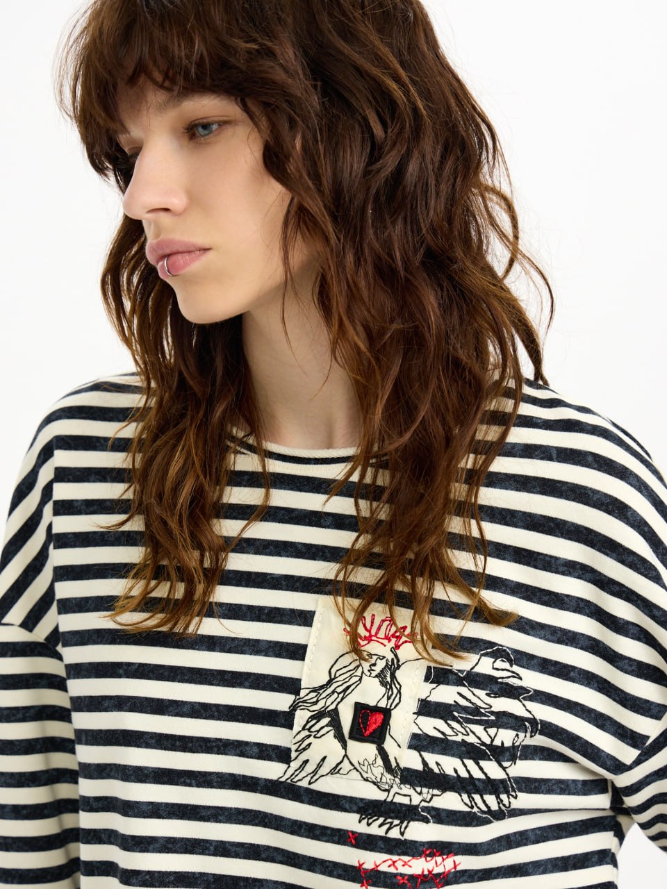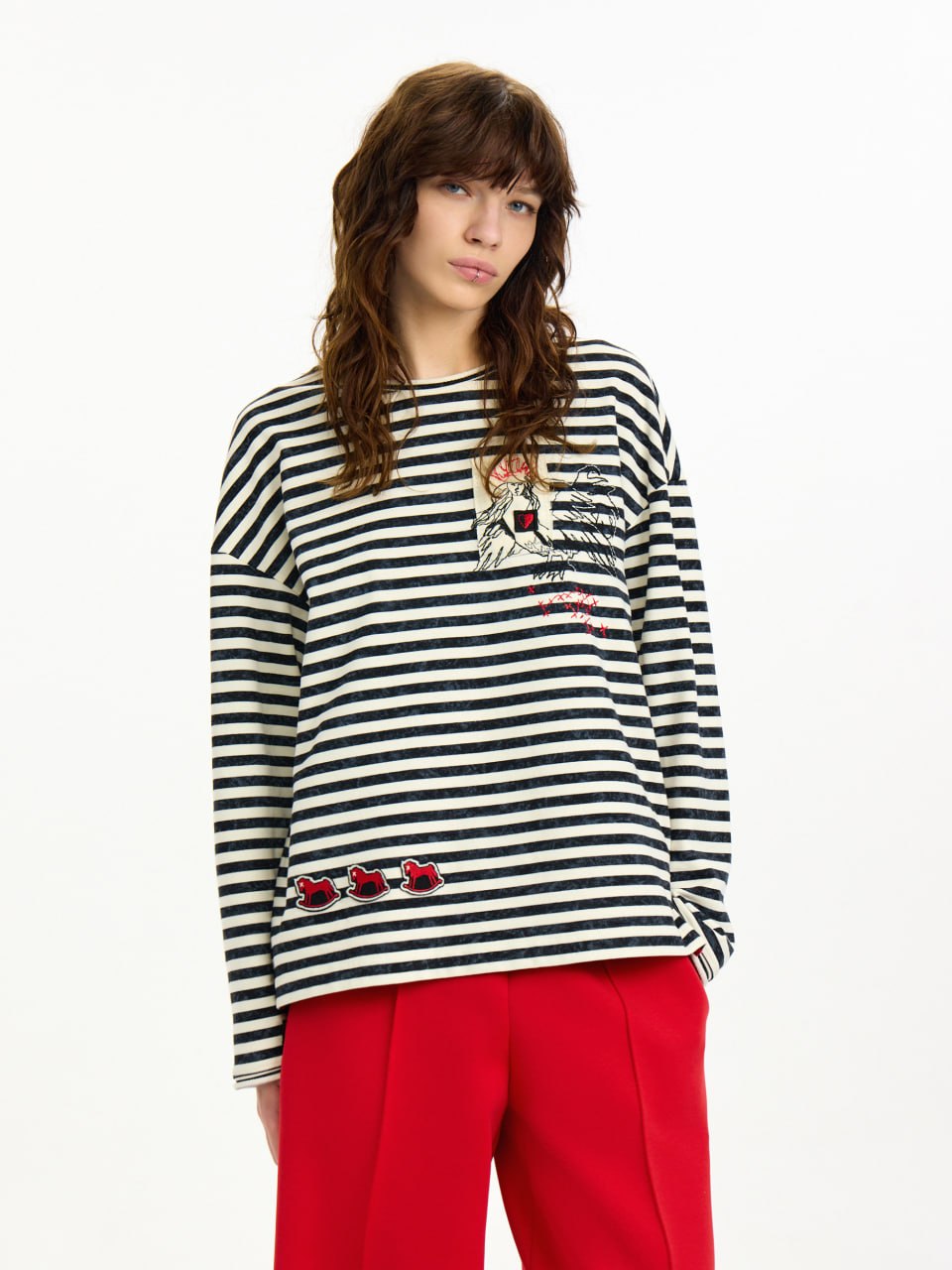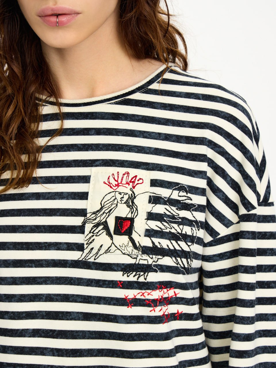 Свитшот из хлопкового футера в классическую бретонскую полоску украшен вышитой райской птицей Гамаюн. Черно-белая классика идеально подходит под любой образ и будет отлично смотреться с черным низом: брюками, джинсами или юбками. Но мы рекомендуем поэкспериметировать и с другими цветами.