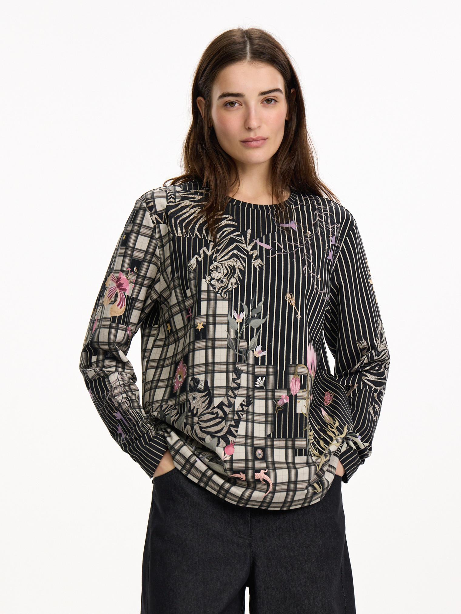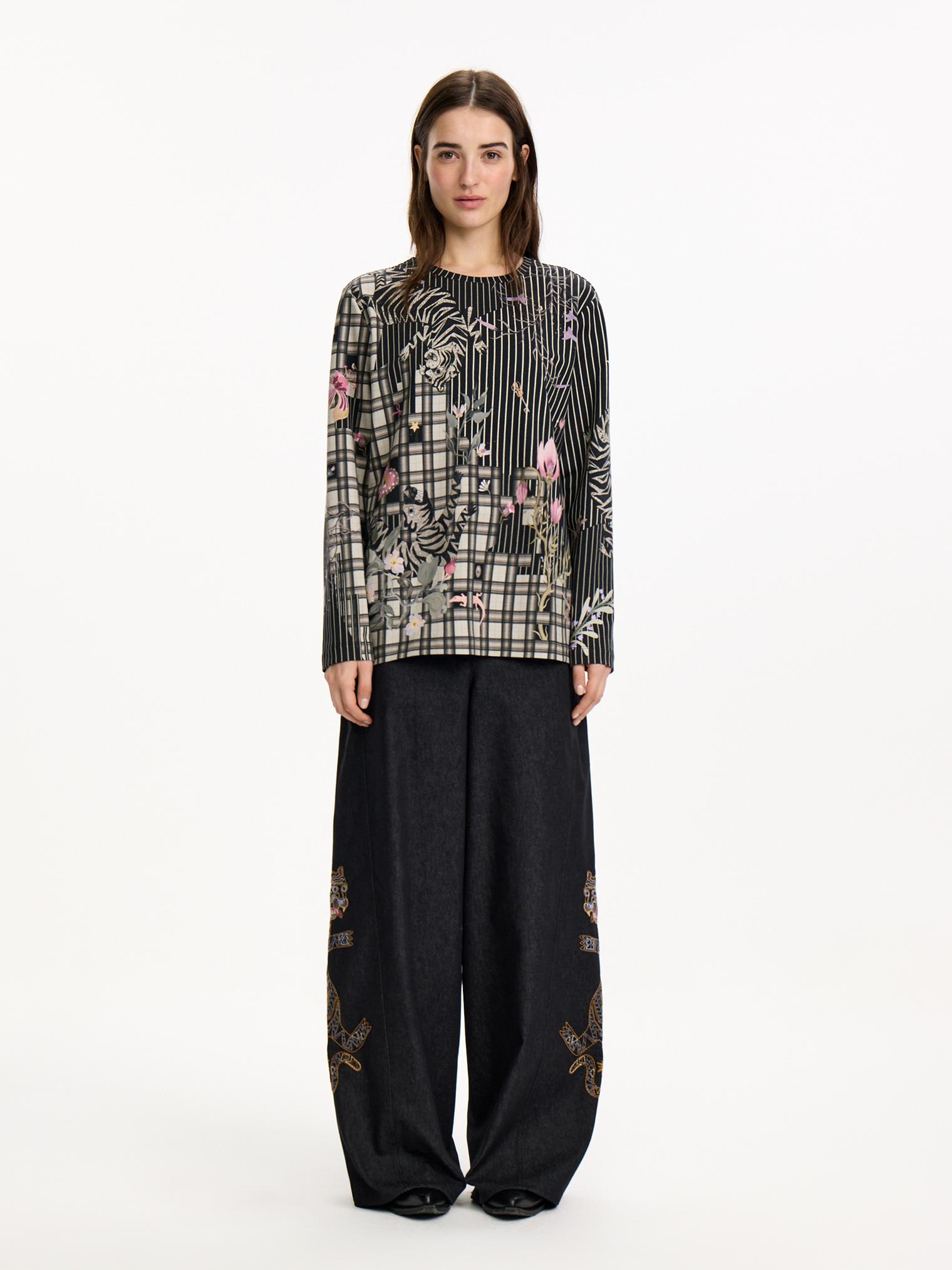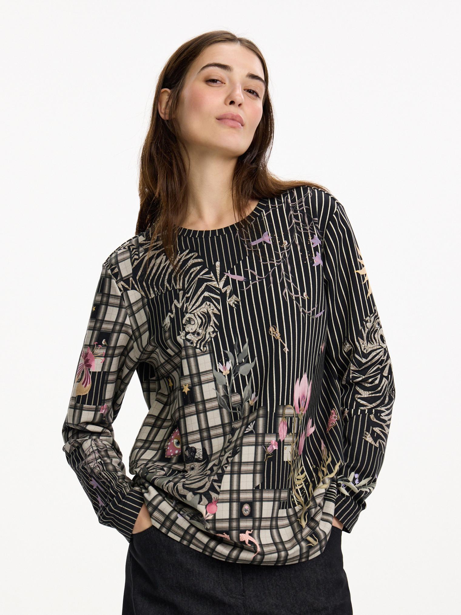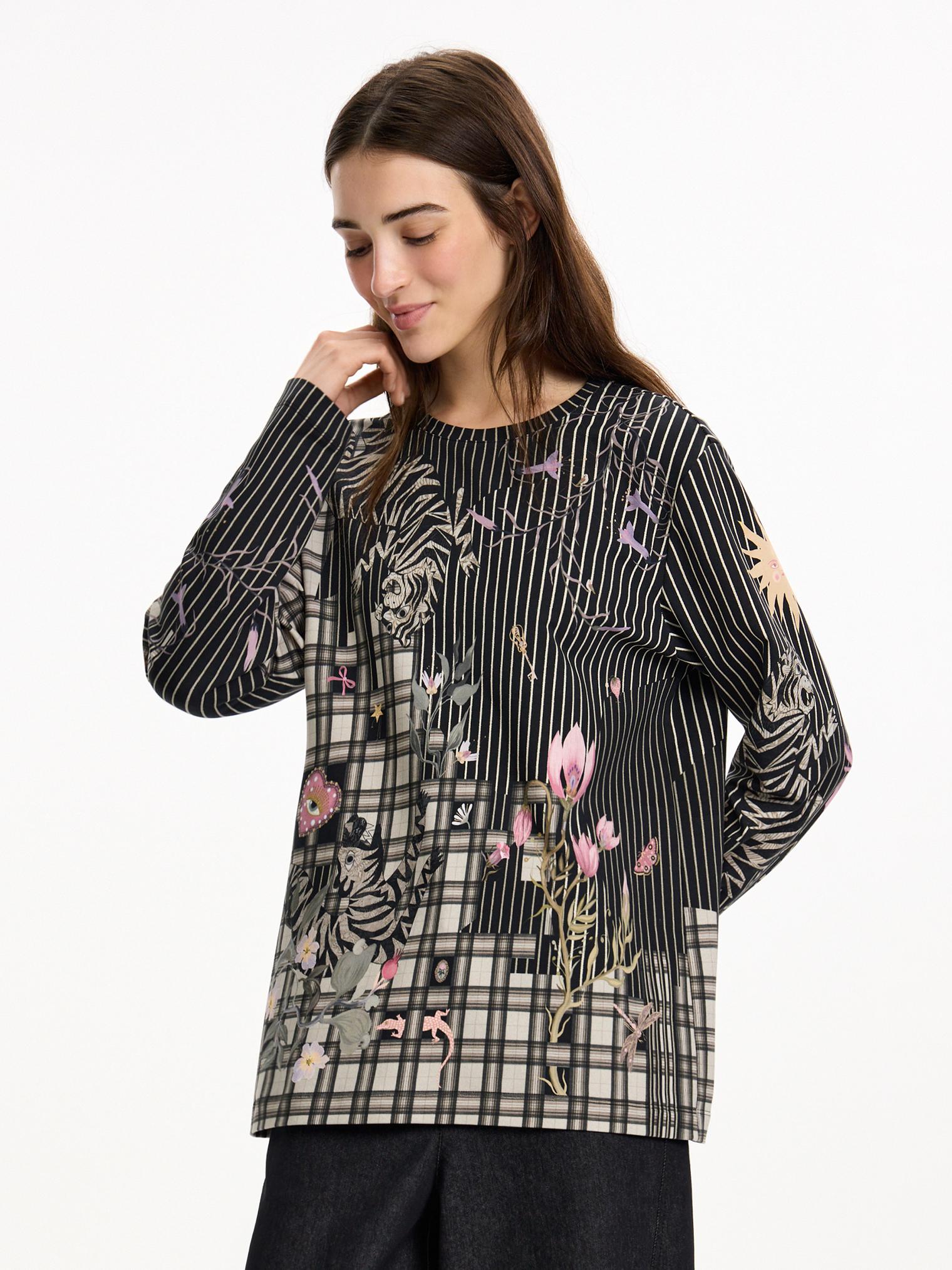 Свитшот из футора 2-х нитки украшен принтом в коллажной технике. Модель классического кроя идеально подойдет для образов в стиле кэжуал, а также обыграет офисные брюки или юбку.
