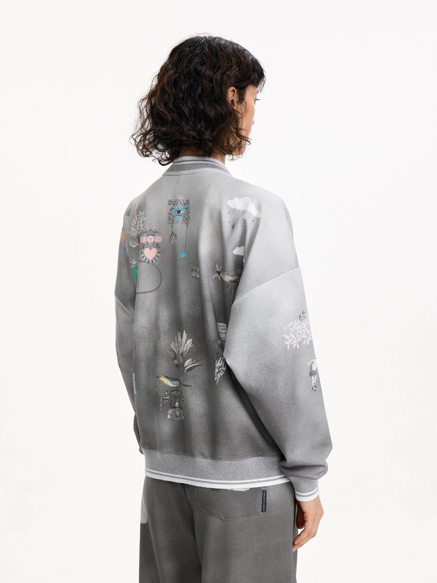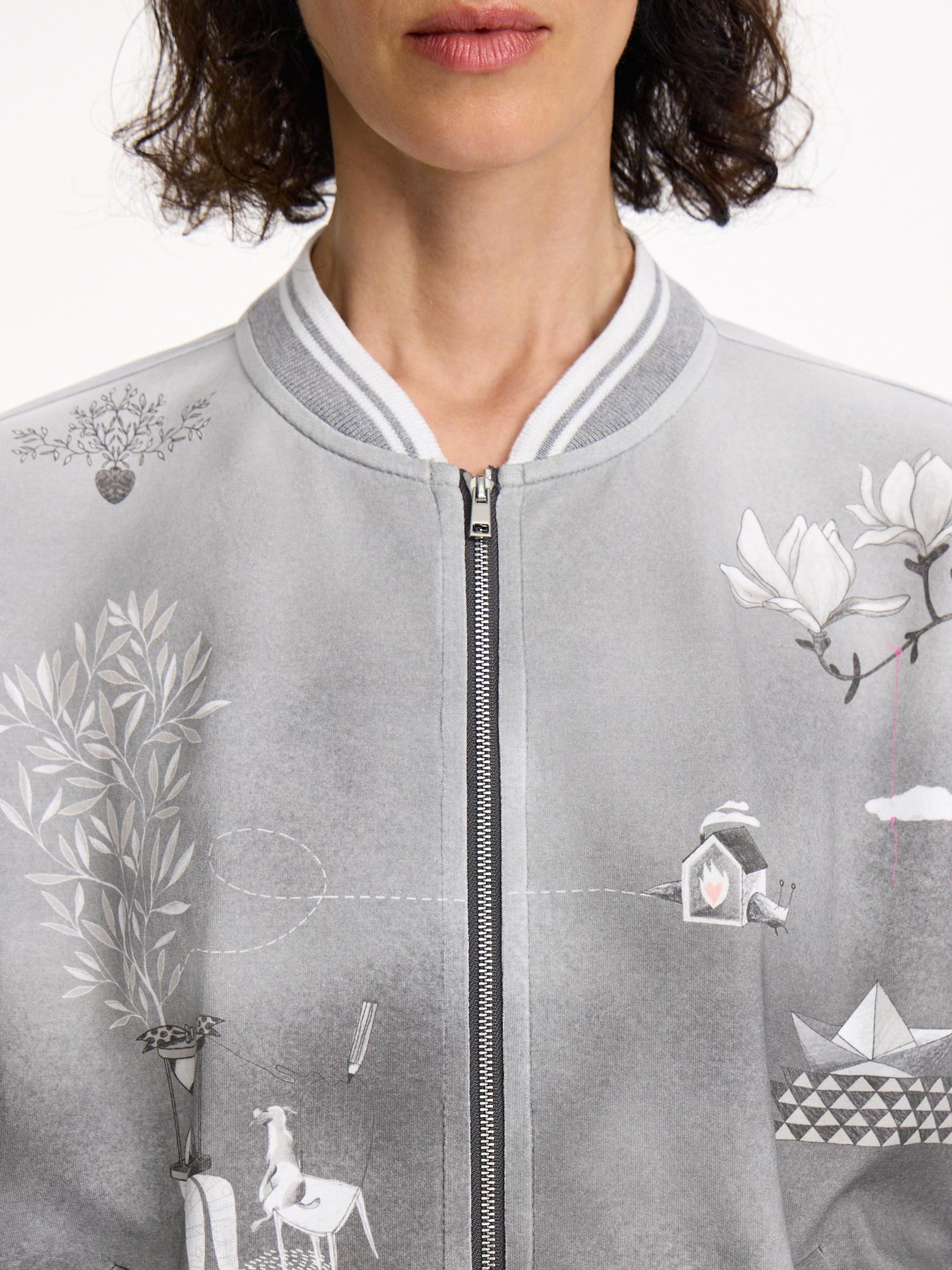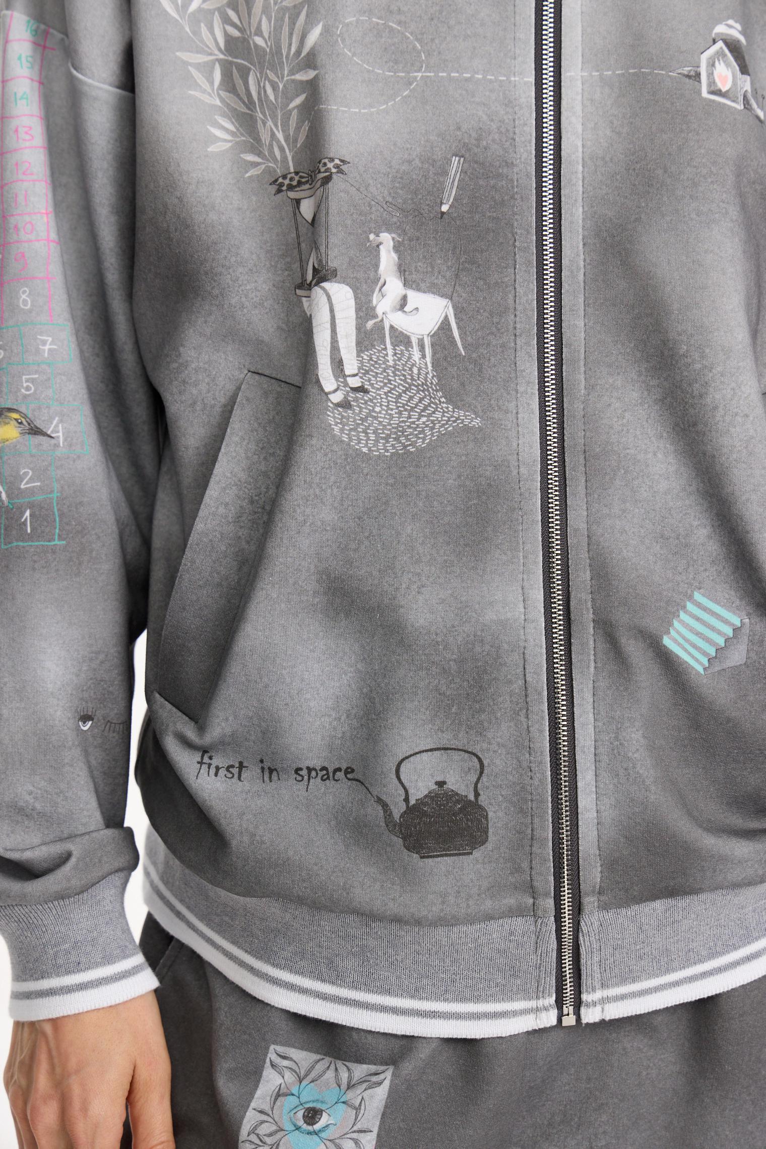 Толстовка из хлопкового футера в оттенке бетона с градиентом от светлого к темному и контрастным нежным принтом навевает умиротворенное весеннее настроение. Модель на молнии оформлена прорезными карманами и эластичными манжетами в полоску.
