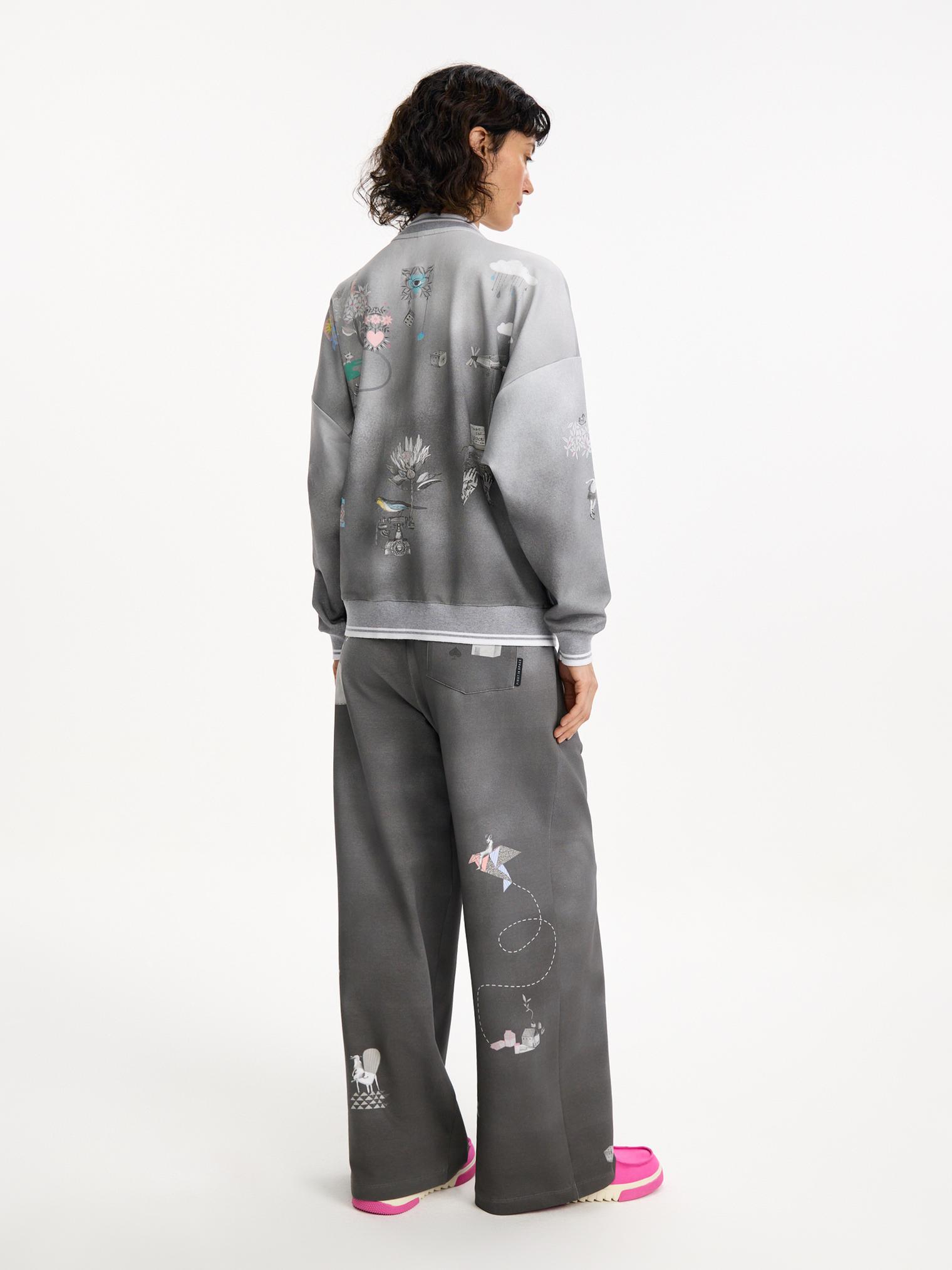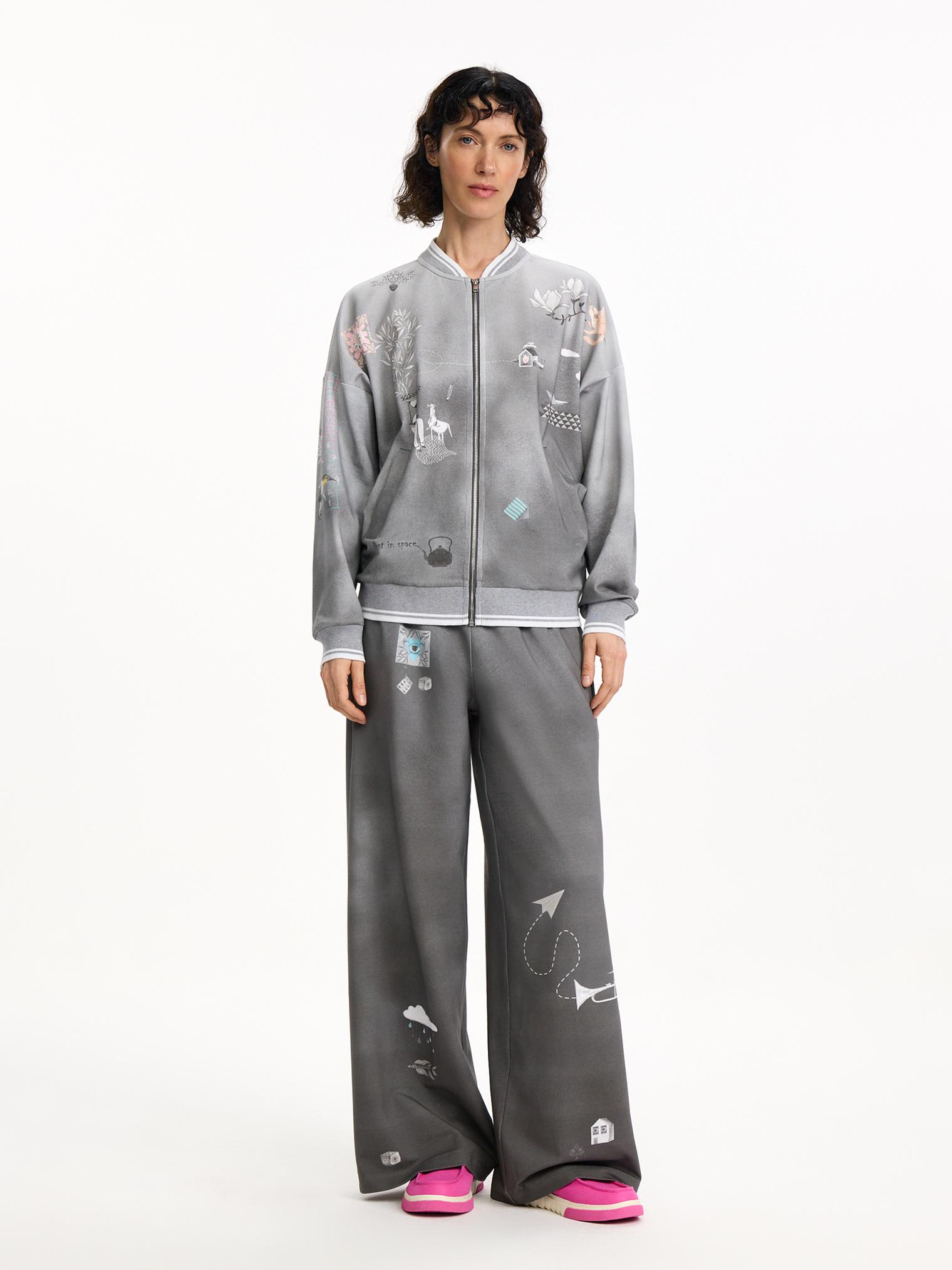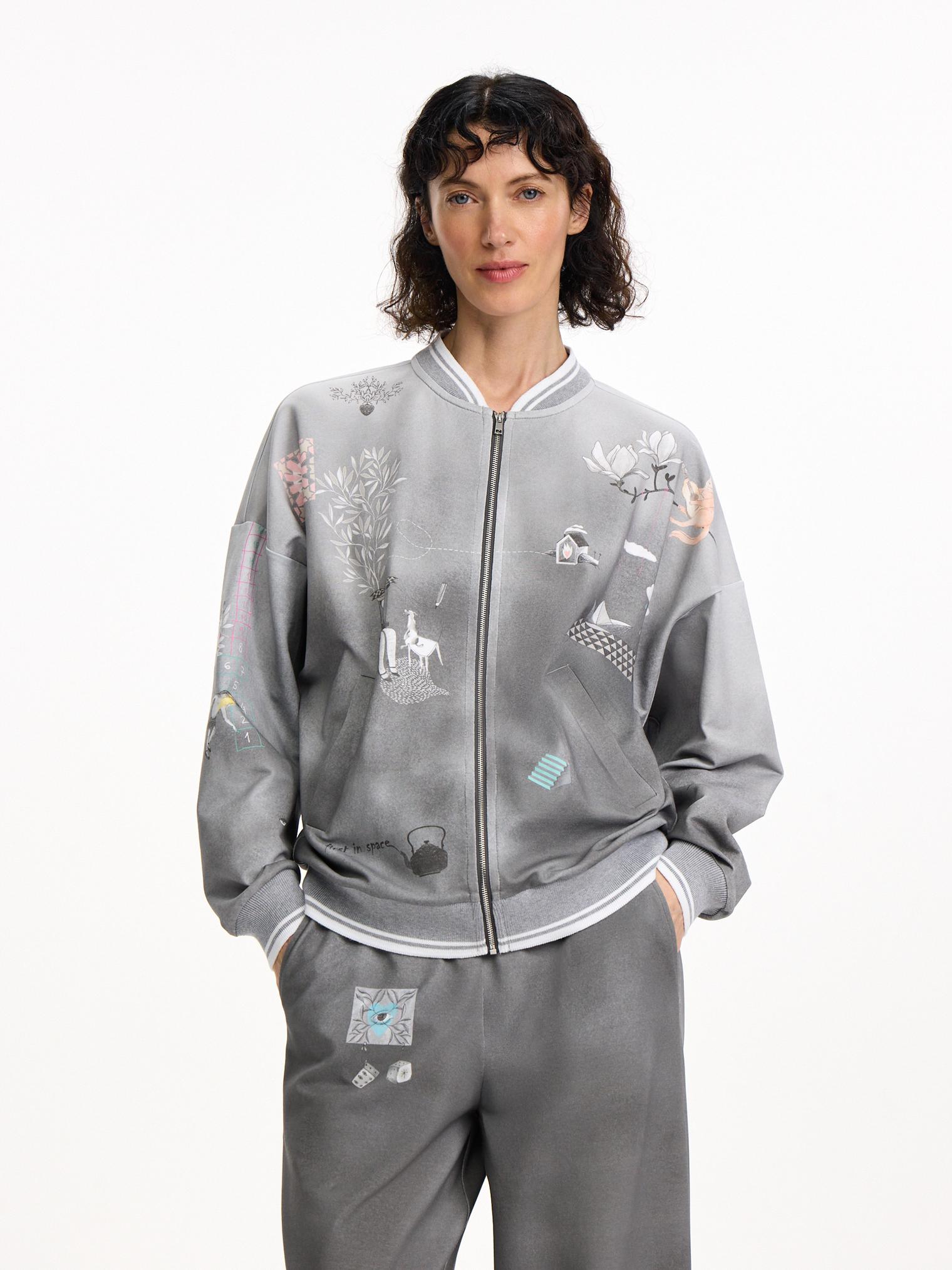 Толстовка из хлопкового футера в оттенке бетона с градиентом от светлого к темному и контрастным нежным принтом навевает умиротворенное весеннее настроение. Модель на молнии оформлена прорезными карманами и эластичными манжетами в полоску.
