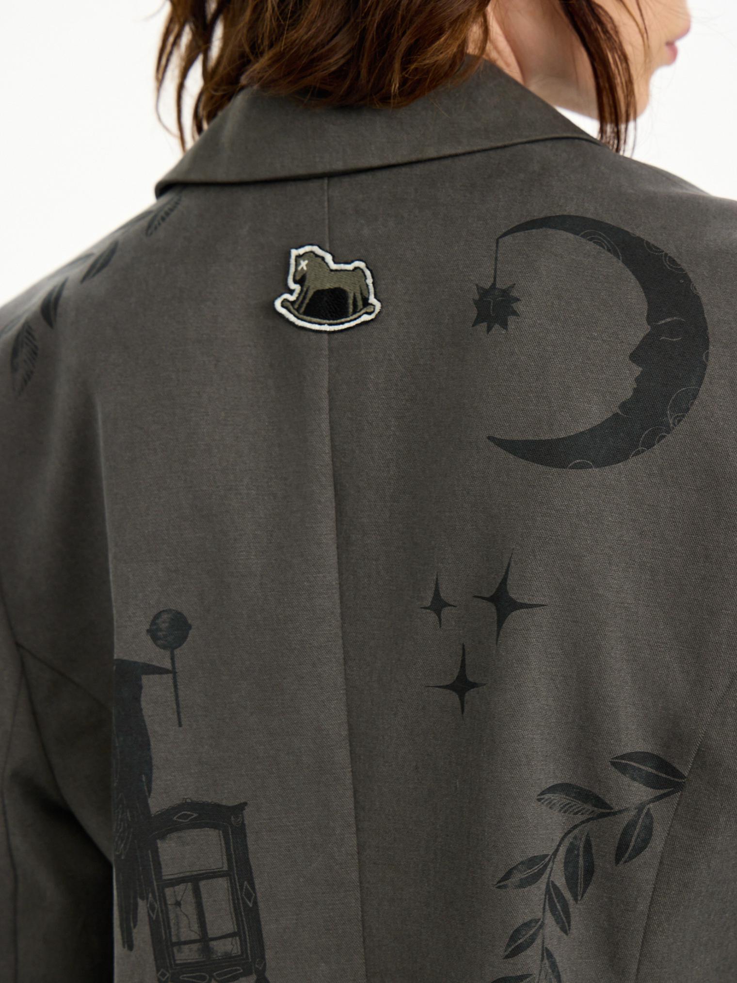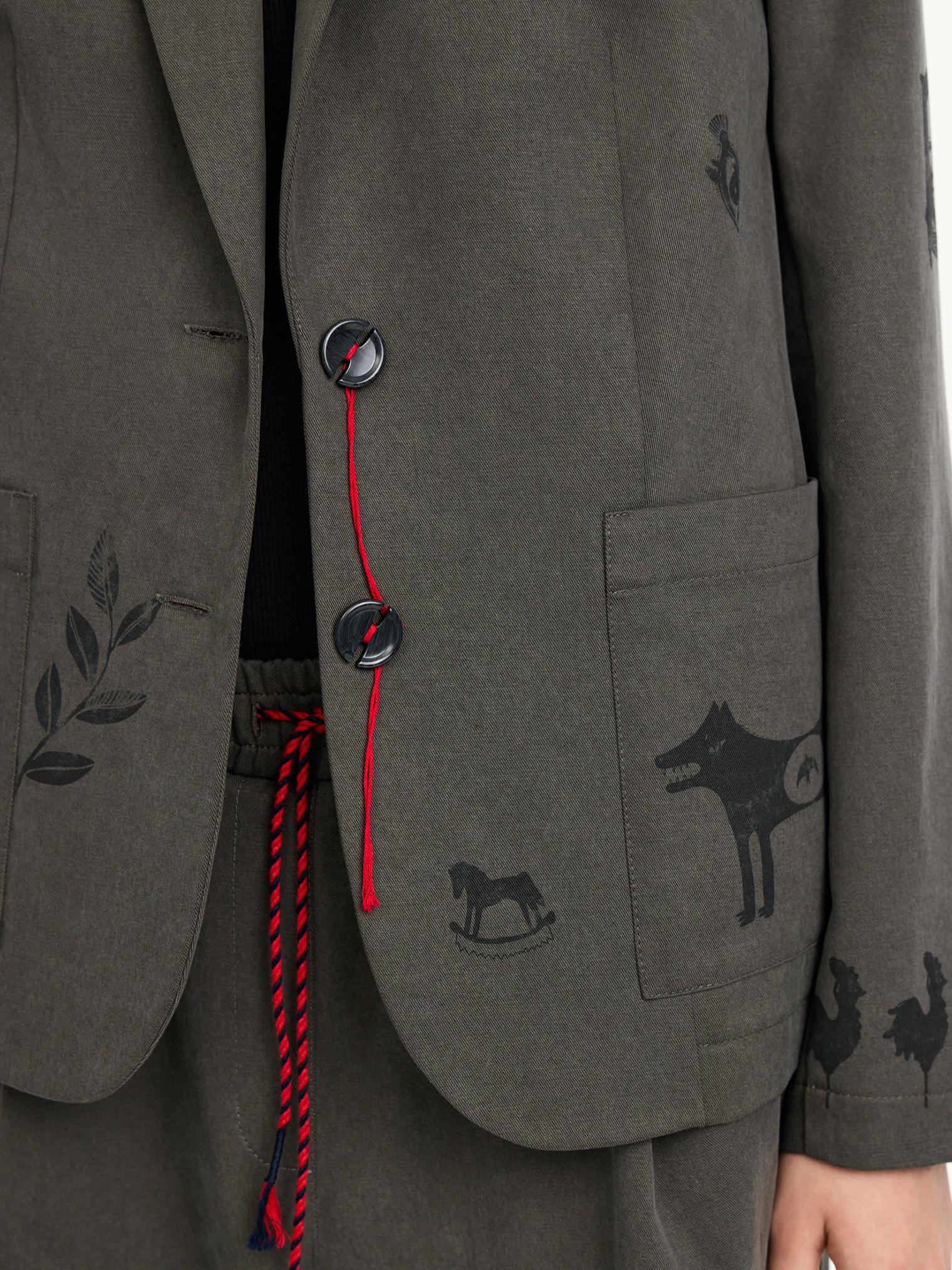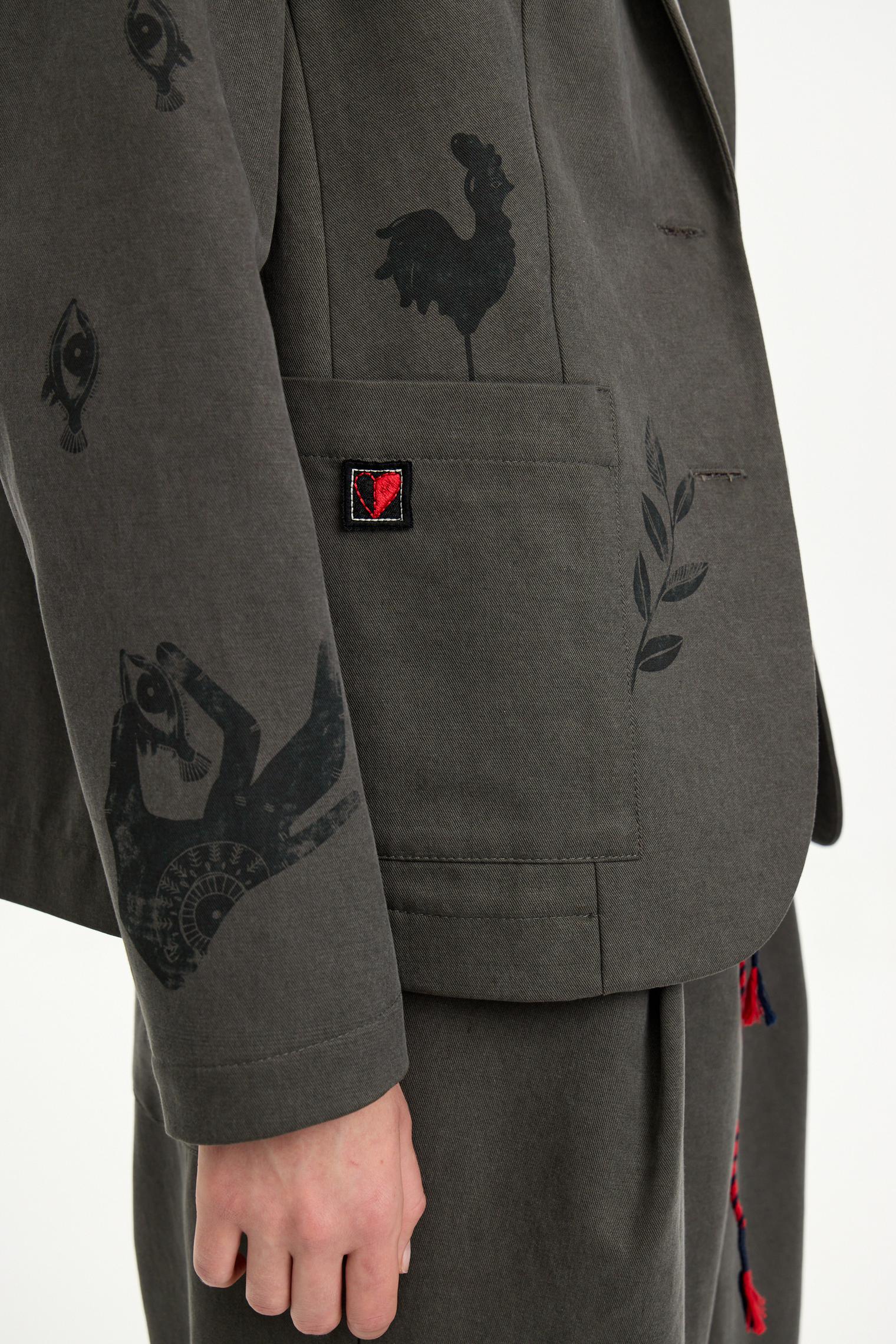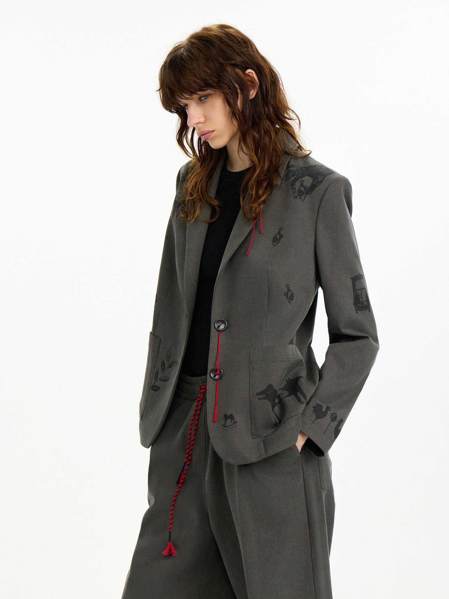 Жакет из хлопка с лиоцеллом с ручным декором из контрастных красных ниток, принтом, дизайнерскими пуговицами. Для дерзких, модных и задающих тренды. Модель идеально сочетается с брюками-бананами аналогичного цвета.