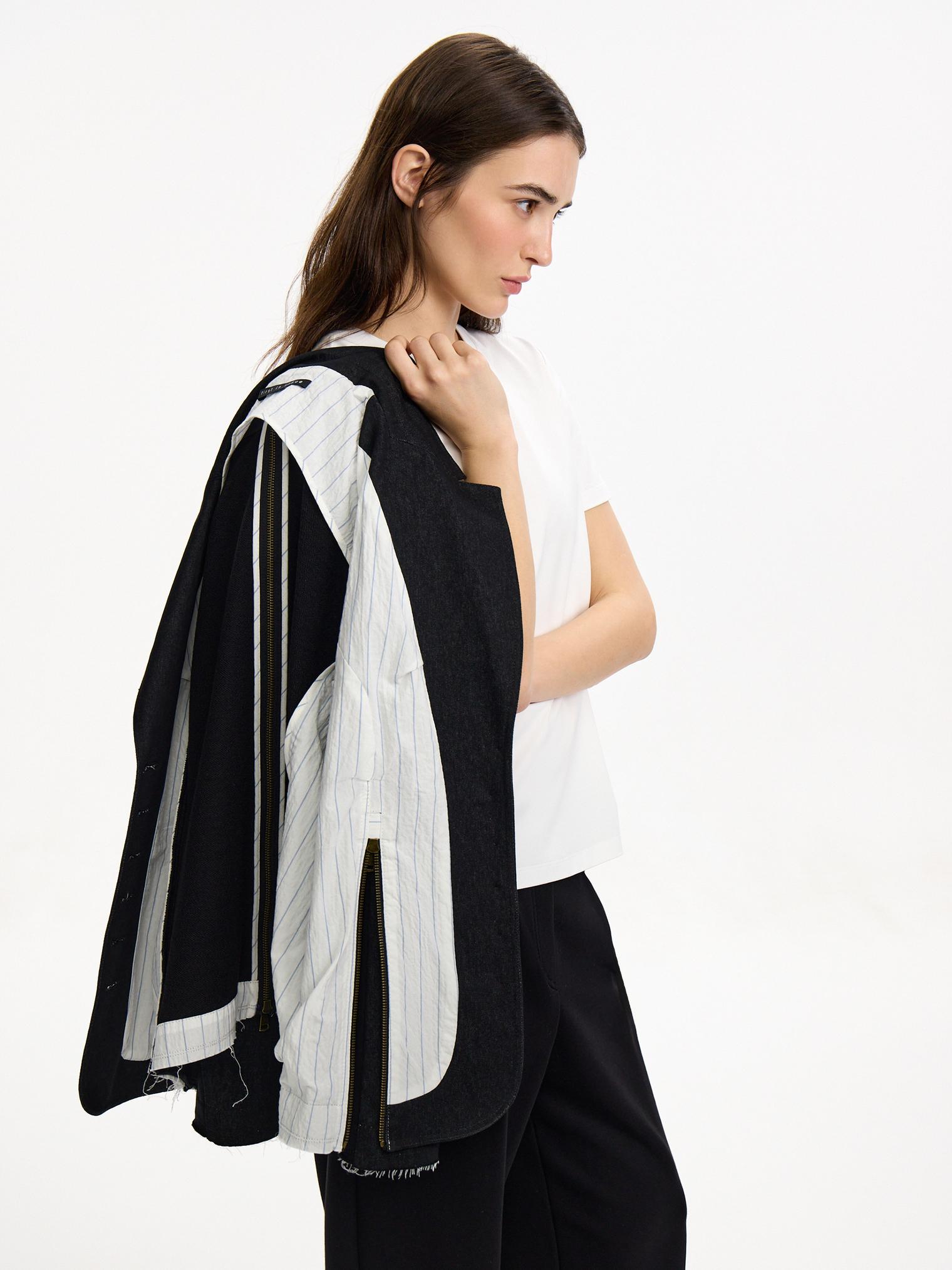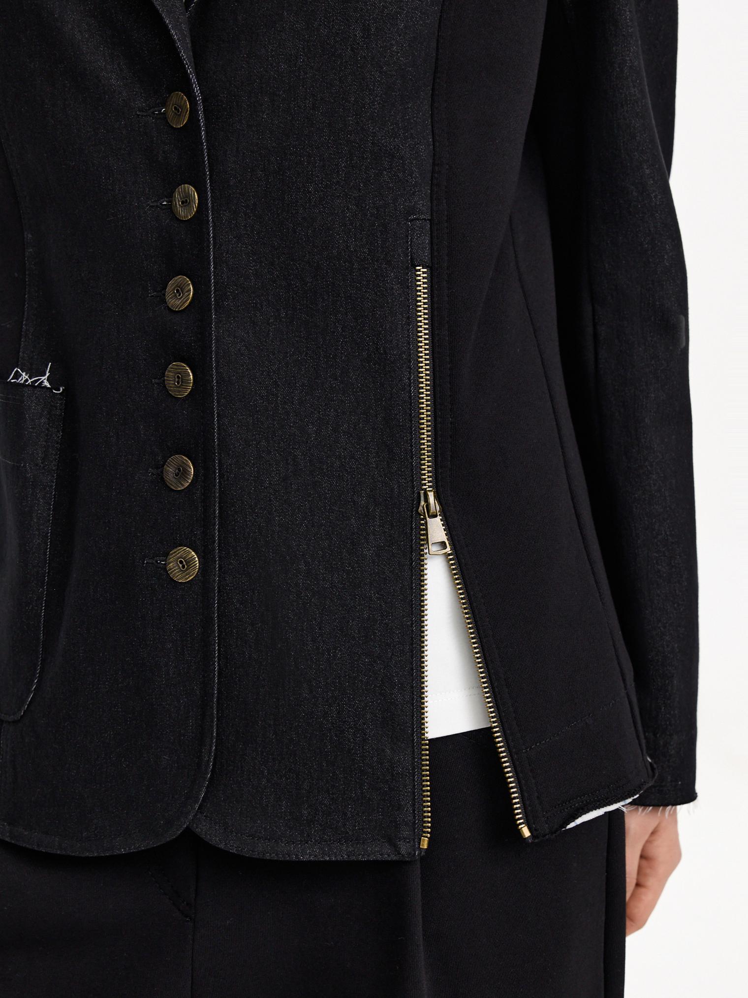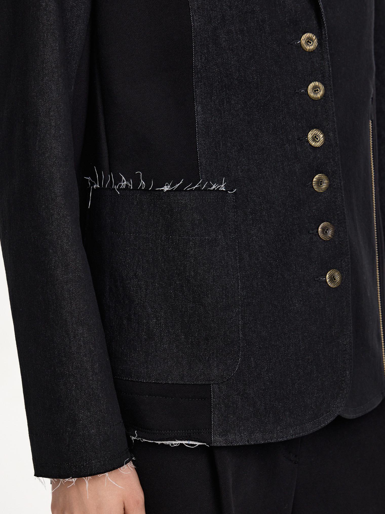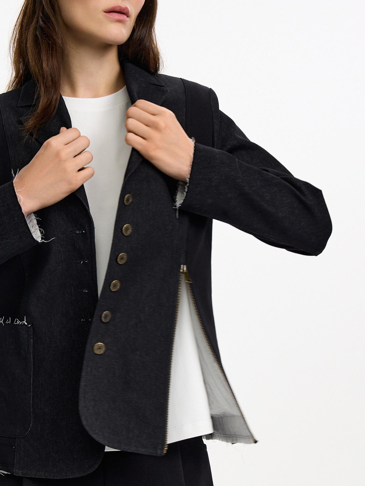 Жакет асимметричного кроя скомбинирован из денима и хлопкового футера. Модель в винтажном стиле с декоративными молниями и пуговицами. Подкладка из хлопка в полоску. Открытые срезы с необработанной краем придают эффект гранжевости и многослойности.