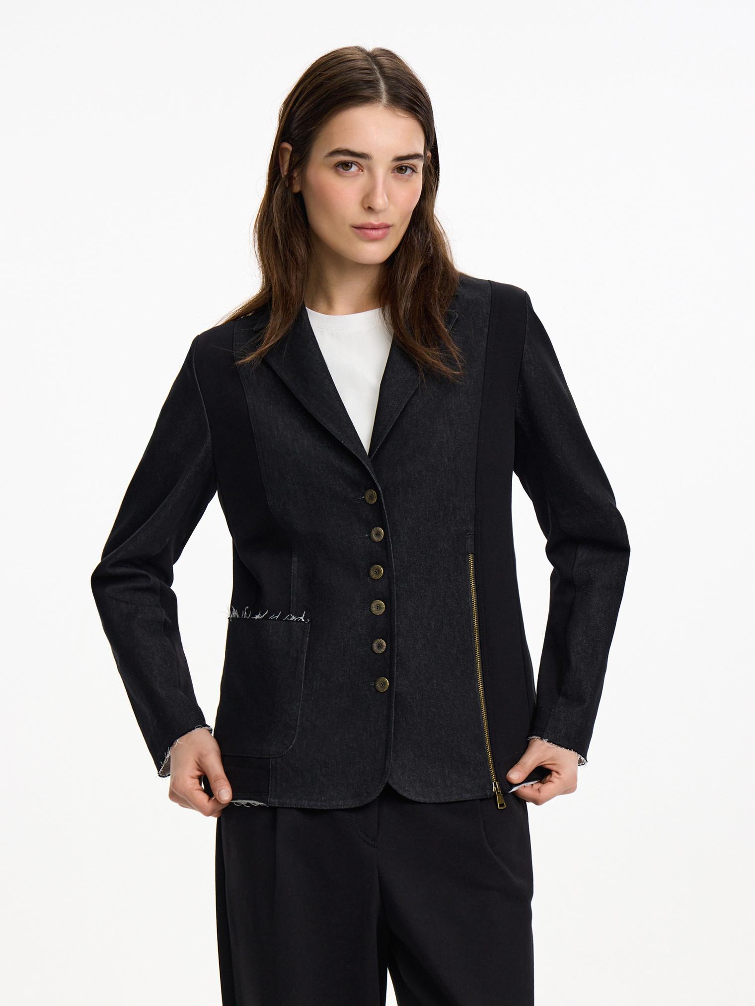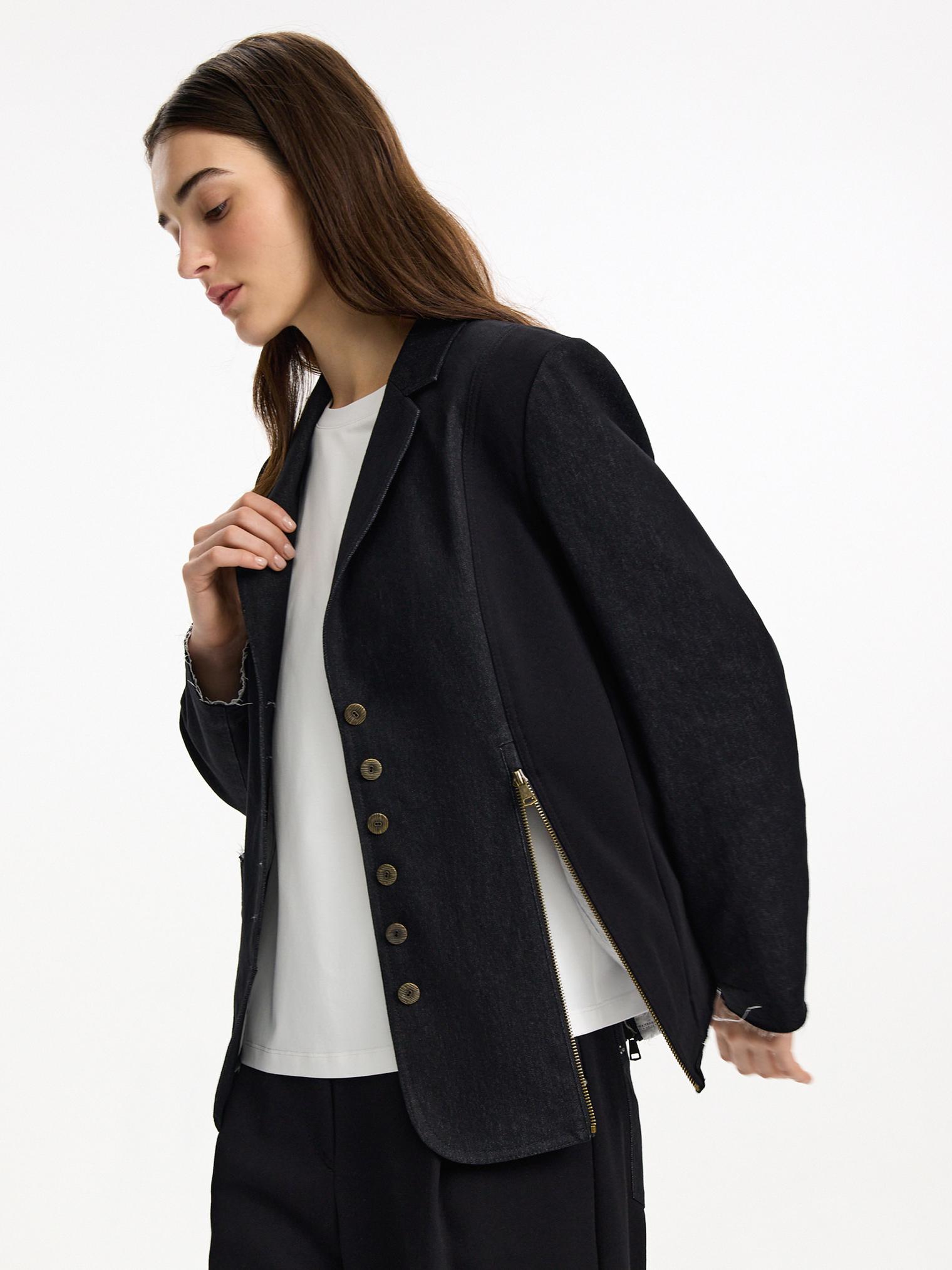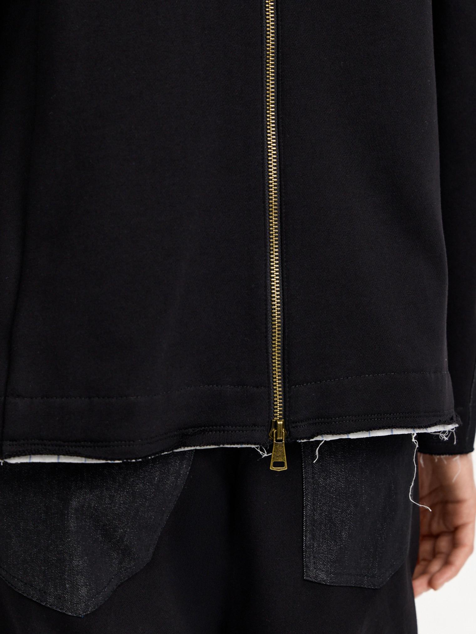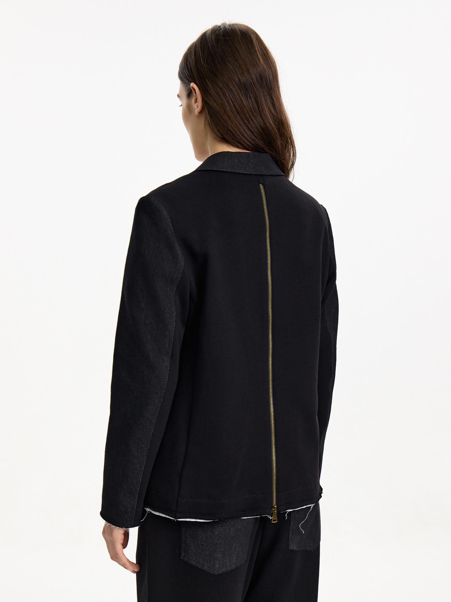 Жакет асимметричного кроя скомбинирован из денима и хлопкового футера. Модель в винтажном стиле с декоративными молниями и пуговицами. Подкладка из хлопка в полоску. Открытые срезы с необработанной краем придают эффект гранжевости и многослойности.