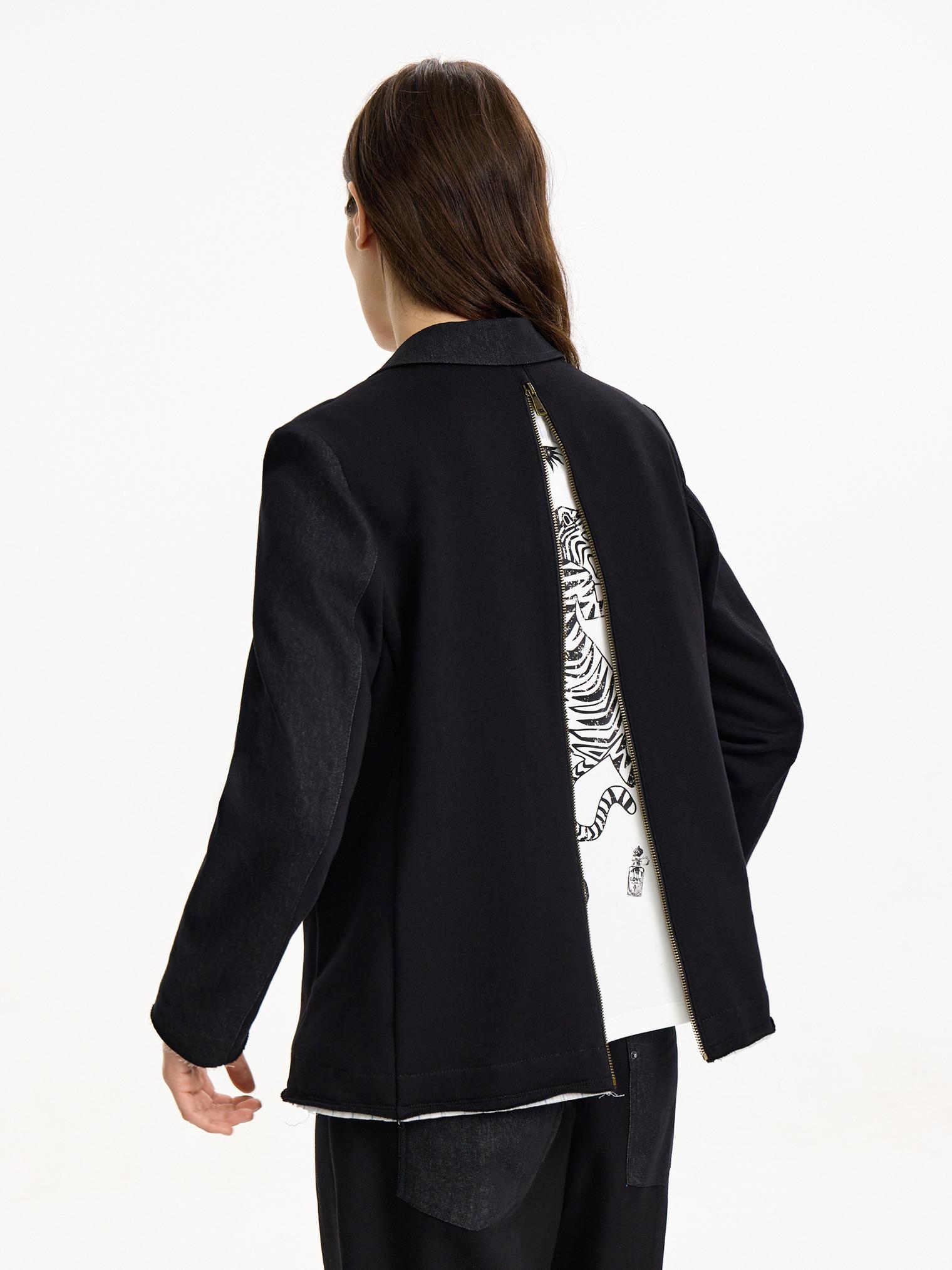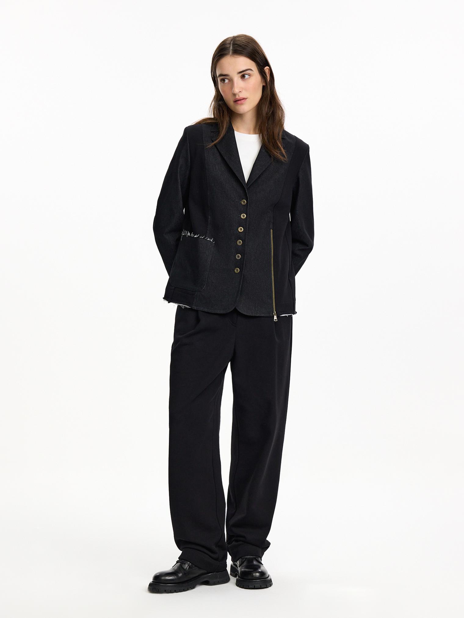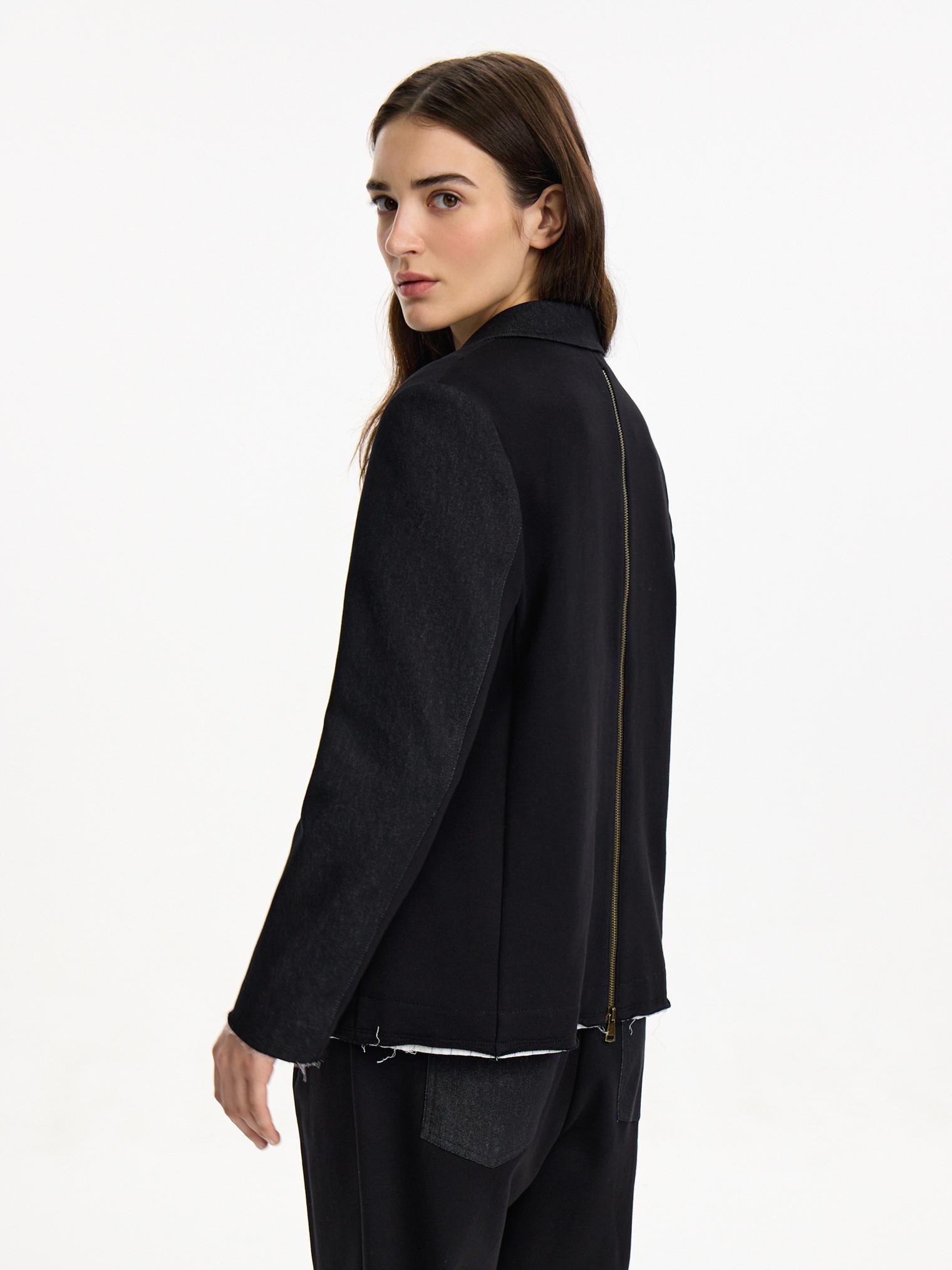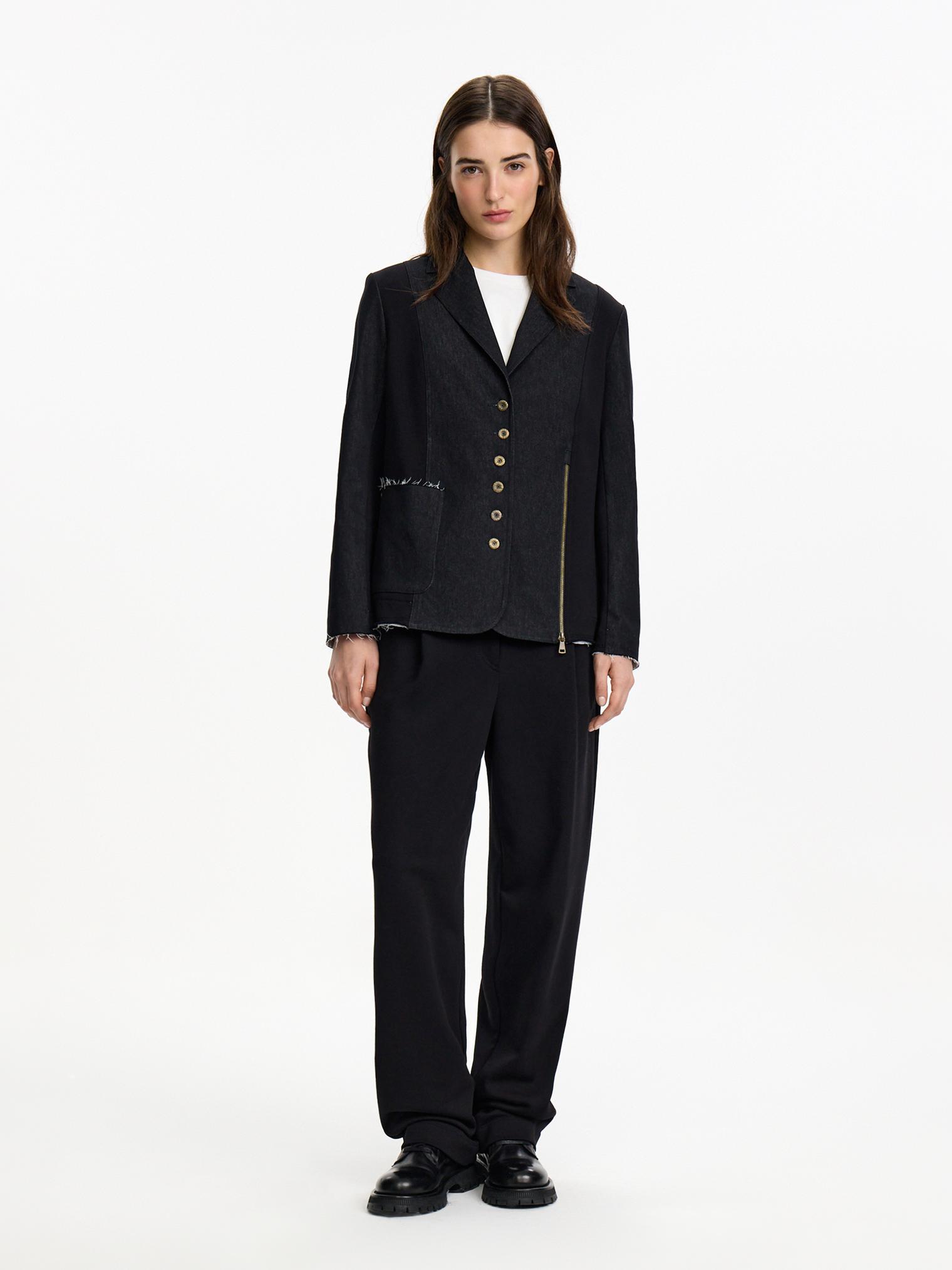 Жакет асимметричного кроя скомбинирован из денима и хлопкового футера. Модель в винтажном стиле с декоративными молниями и пуговицами. Подкладка из хлопка в полоску. Открытые срезы с необработанной краем придают эффект гранжевости и многослойности.