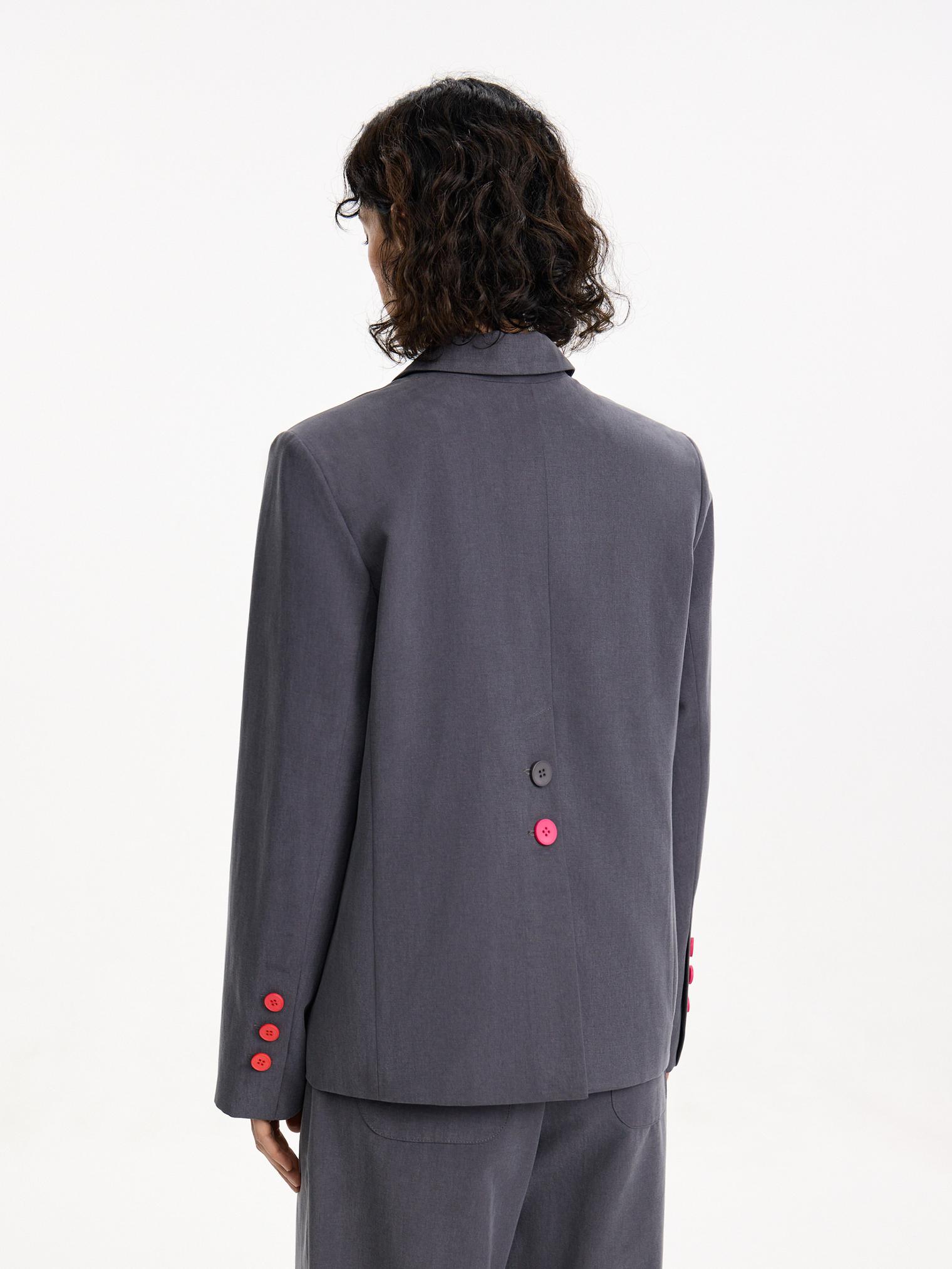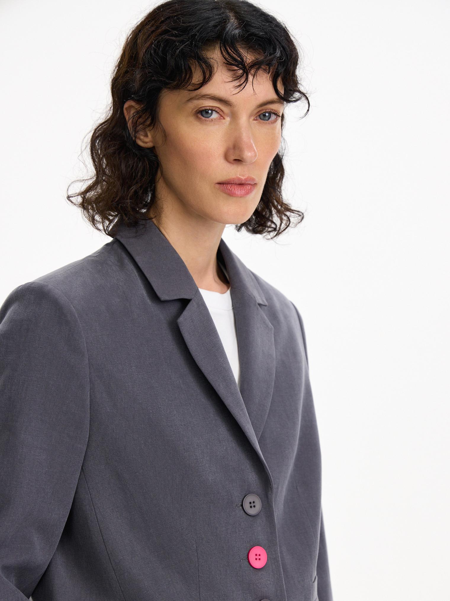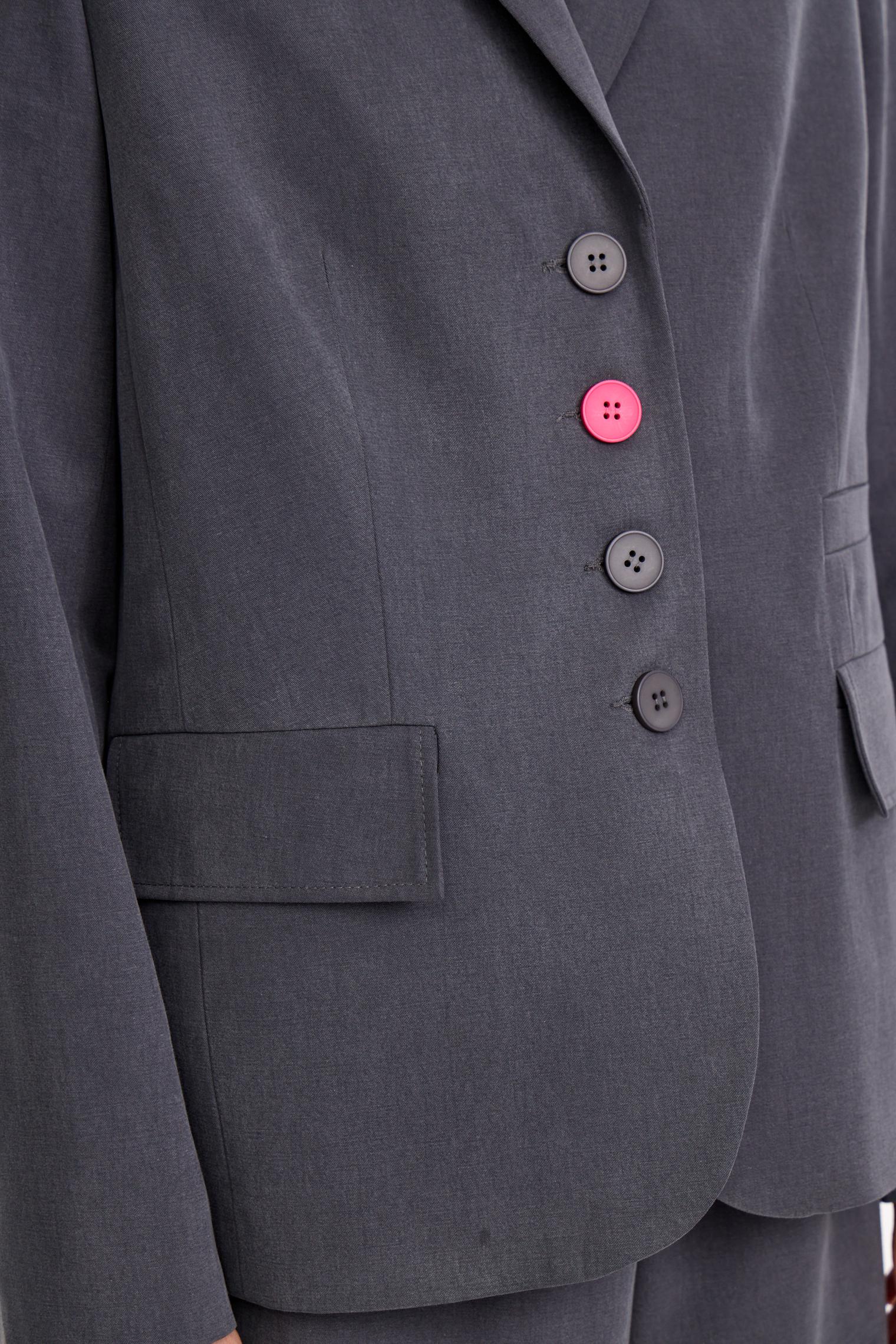 Однобортный жакет из классического, не свойственного для него материала - хлопка с лиоцеллом. Фурнитура модели выполнена в цвете цикламена, расставляющей яркие акценты. Нескучный вариант для весенне-летнего офиса.