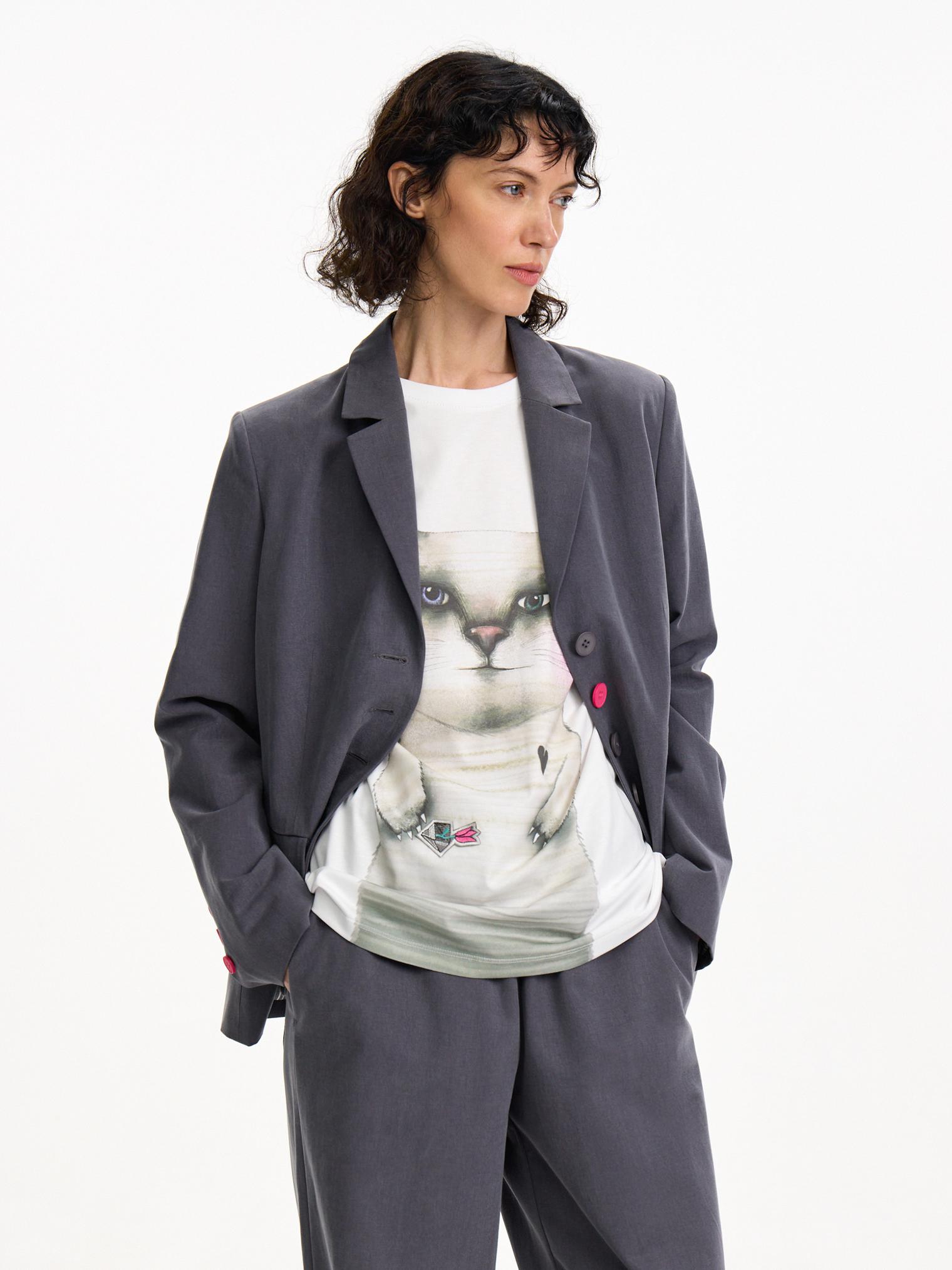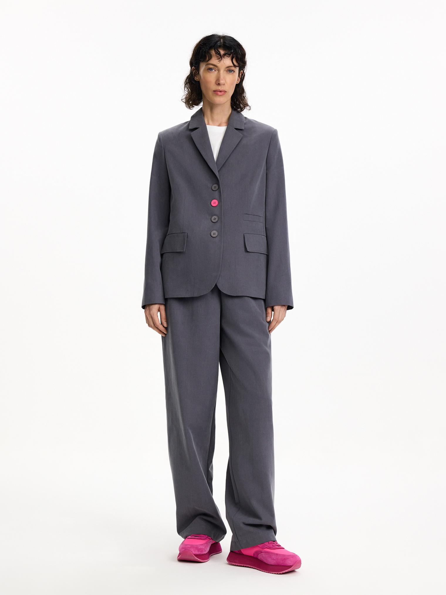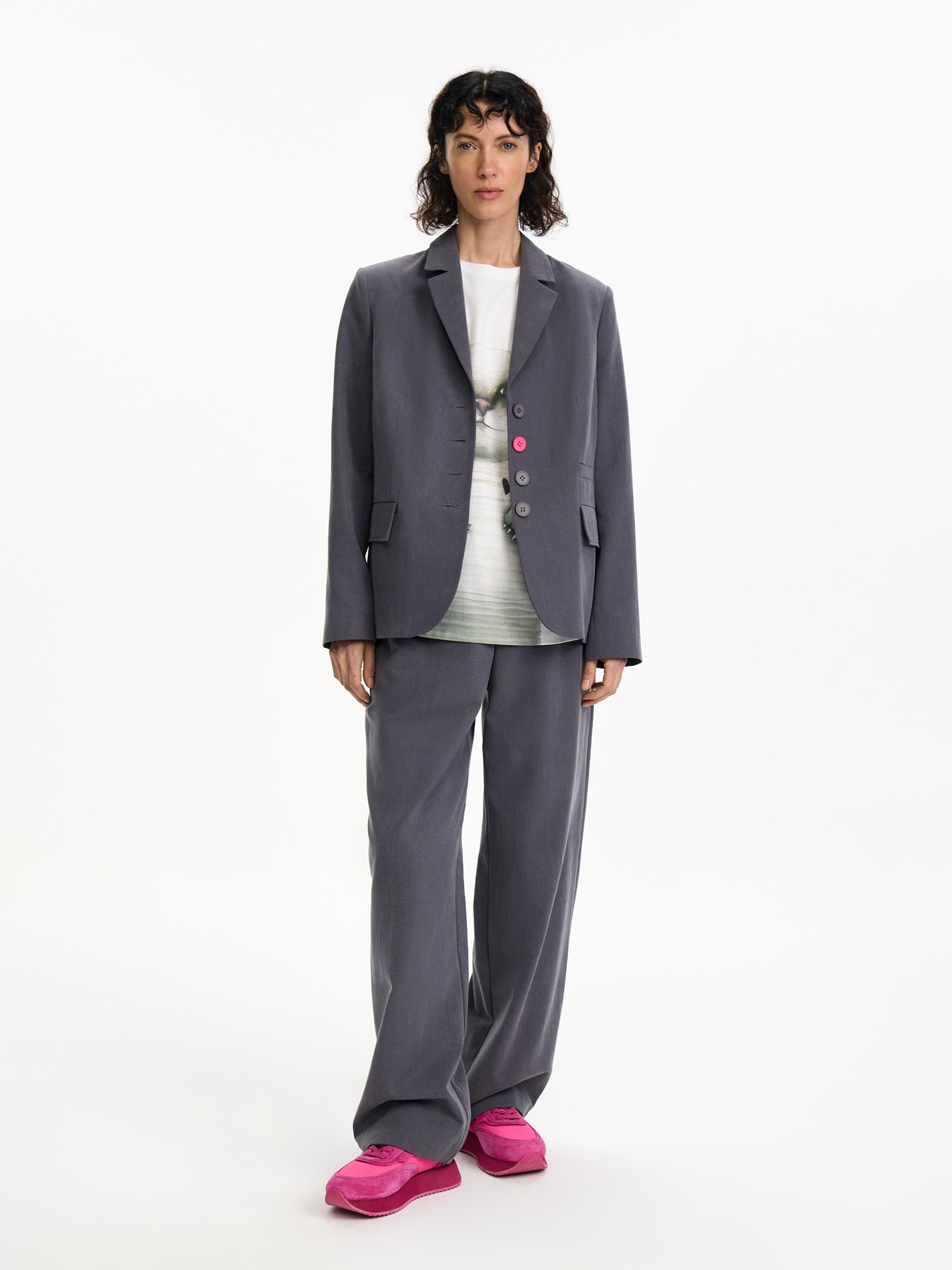 Однобортный жакет из классического, не свойственного для него материала - хлопка с лиоцеллом. Фурнитура модели выполнена в цвете цикламена, расставляющей яркие акценты. Нескучный вариант для весенне-летнего офиса.