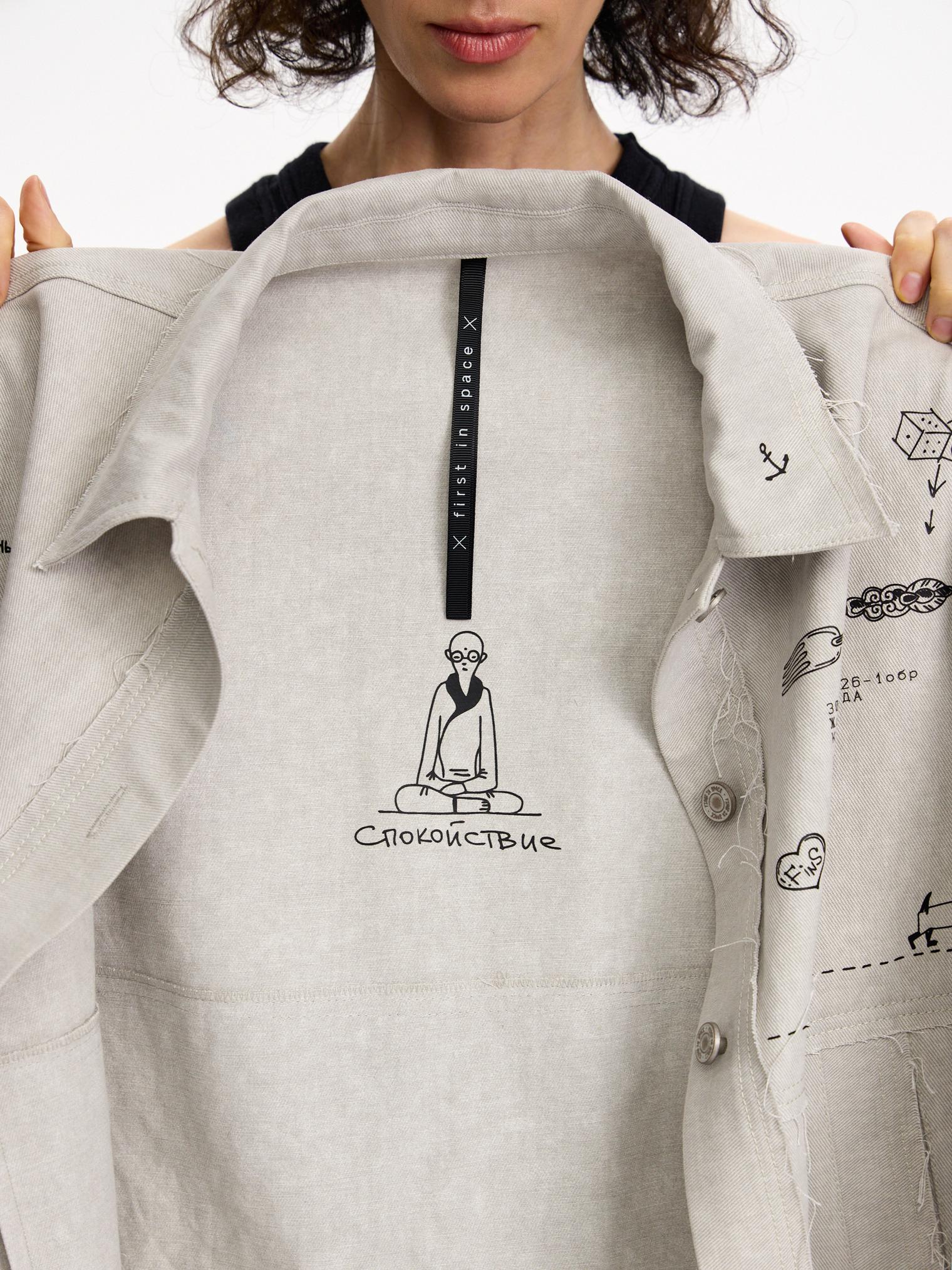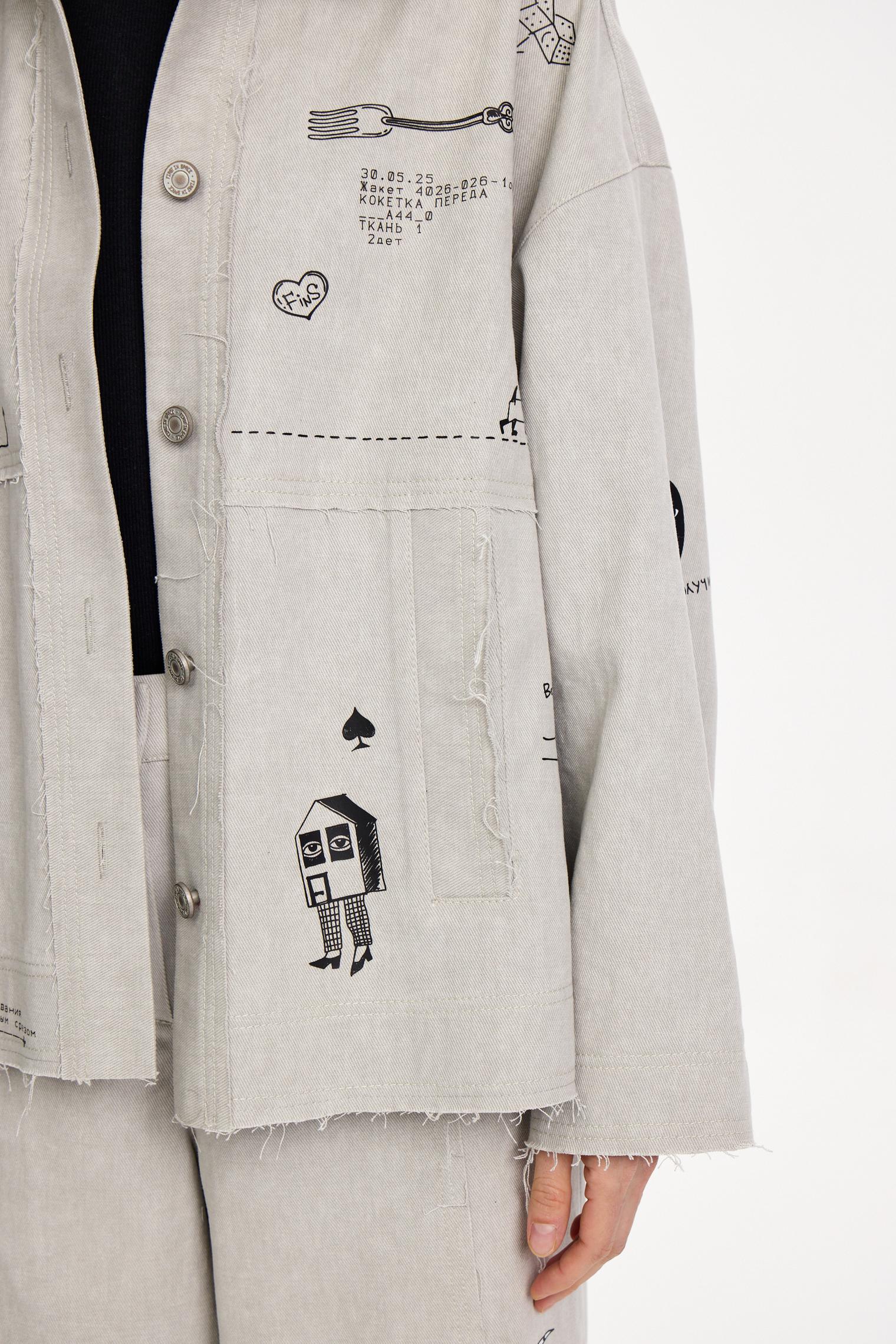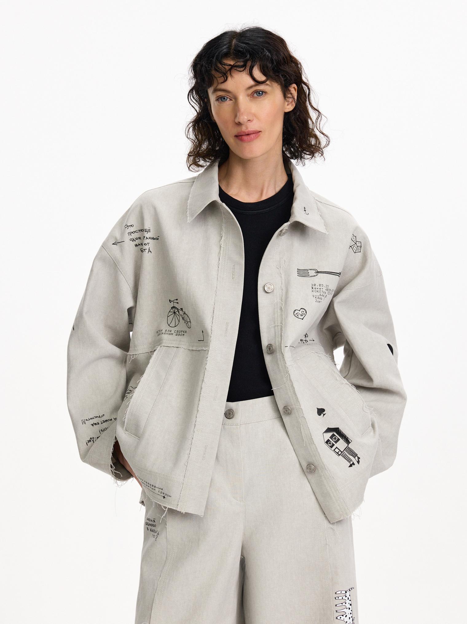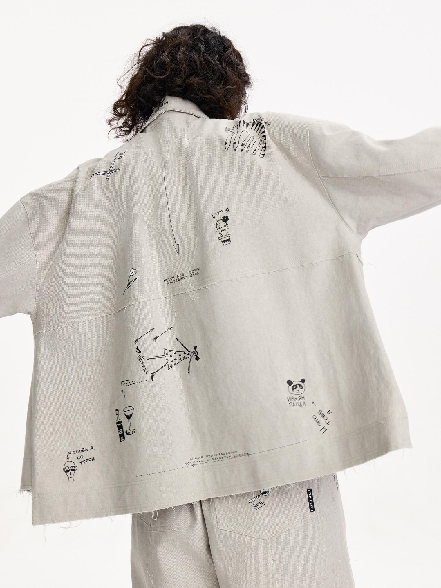 Куртка из хлопкового денима светлой варки. Необработанные швы придают гранжевое настроение. Модель с вайбовым принтом с авторскими зарисовками отлично будет сочетаться с однотонными футболками и брюками из капсулы.