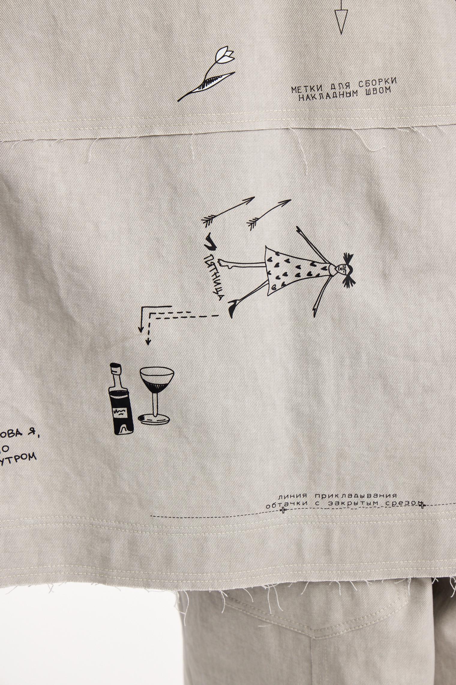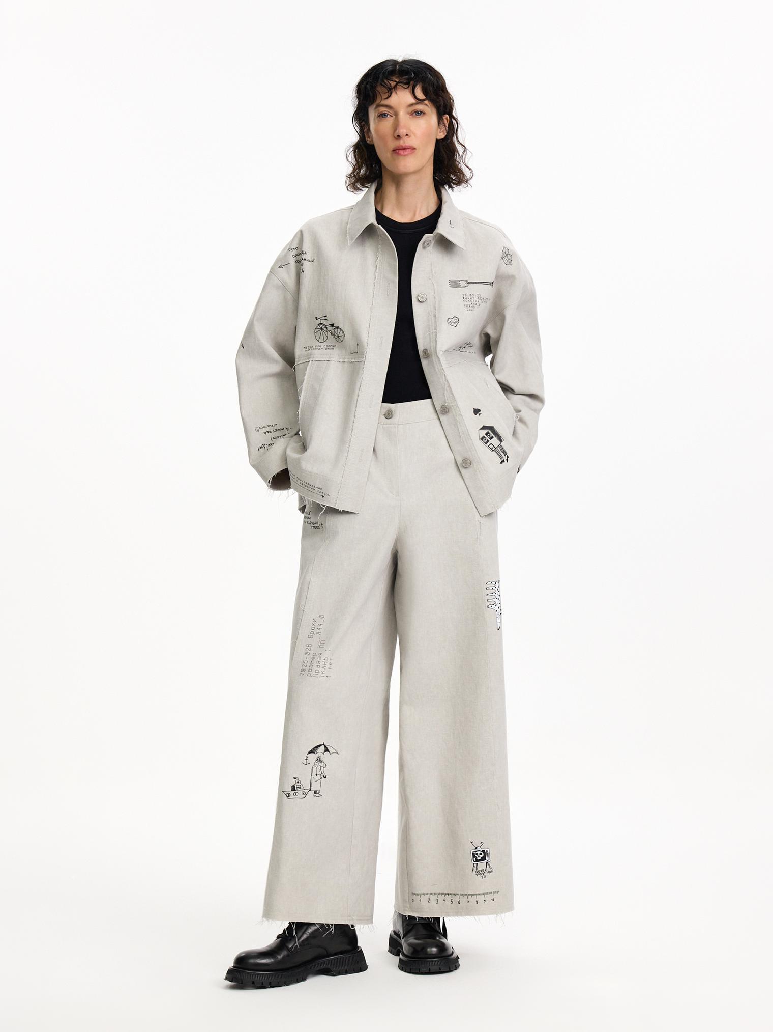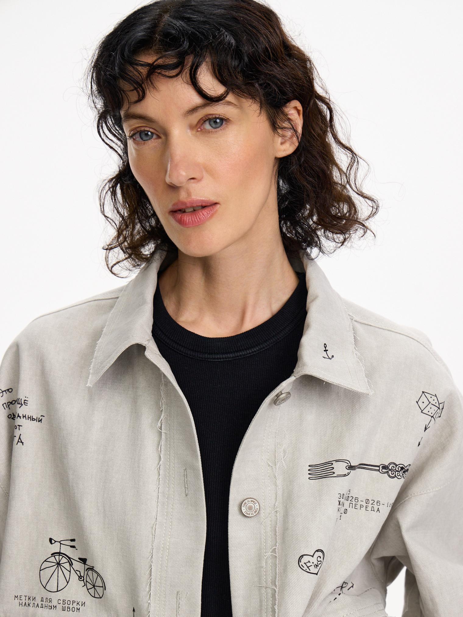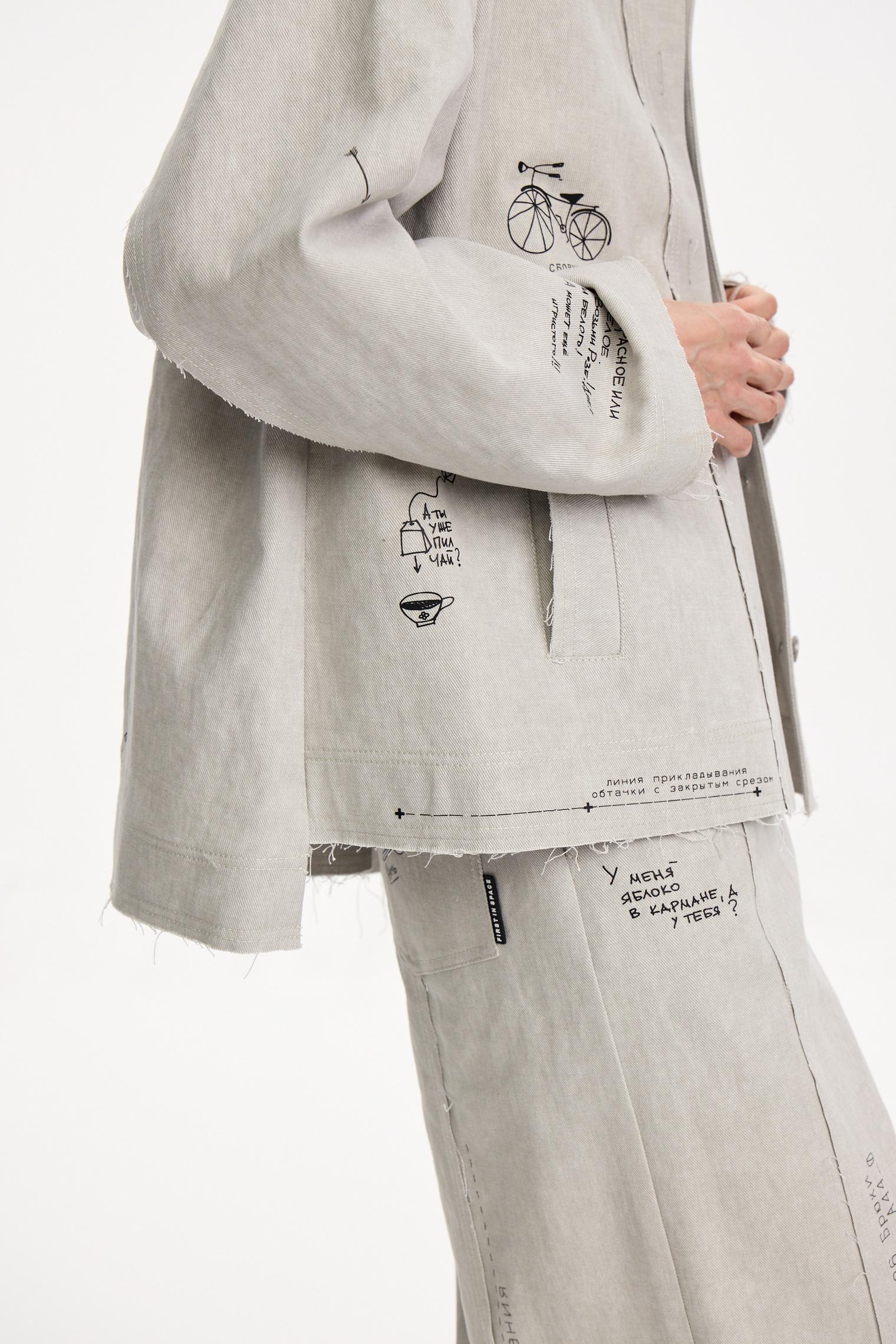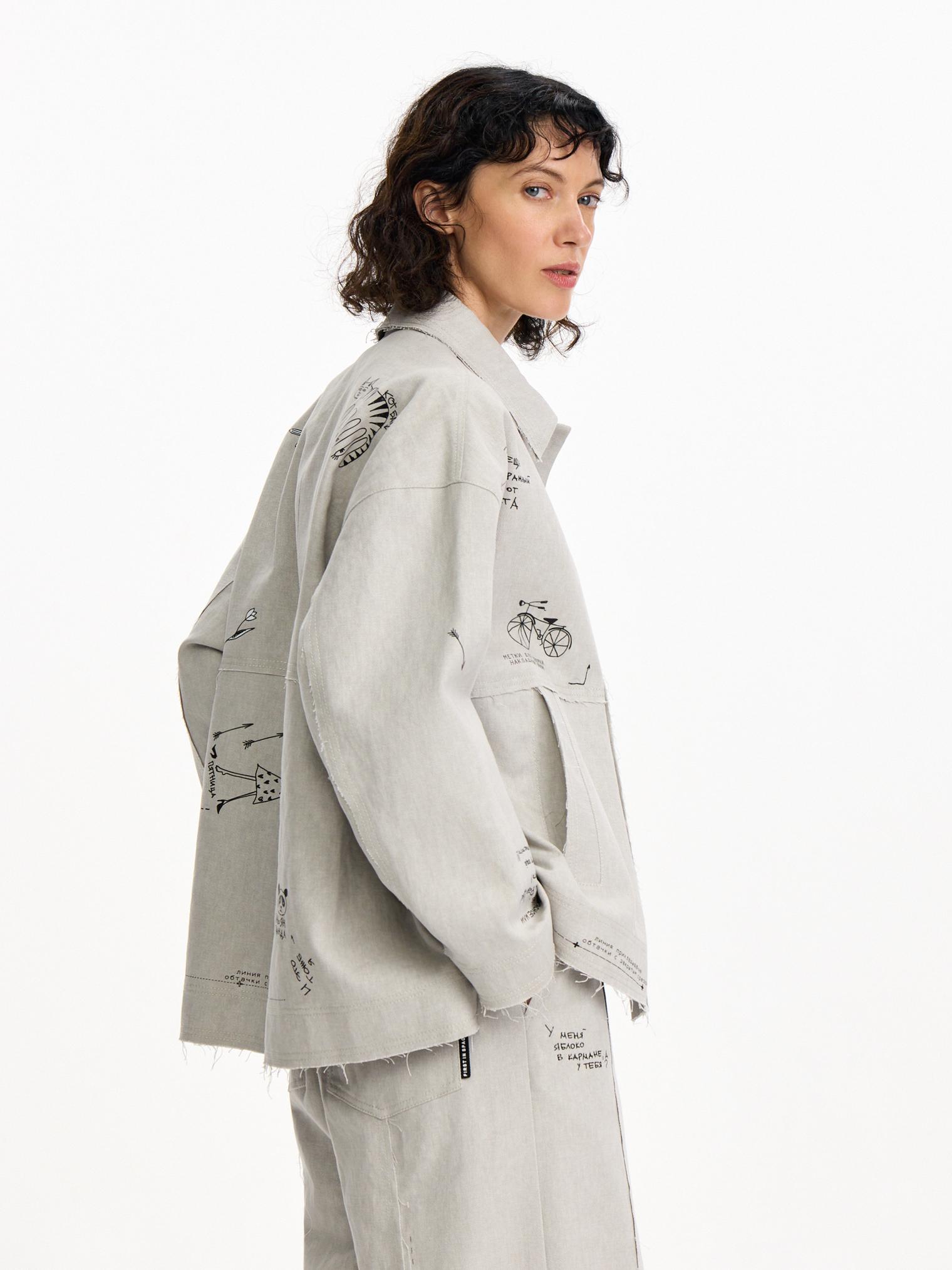 Куртка из хлопкового денима светлой варки. Необработанные швы придают гранжевое настроение. Модель с вайбовым принтом с авторскими зарисовками отлично будет сочетаться с однотонными футболками и брюками из капсулы.