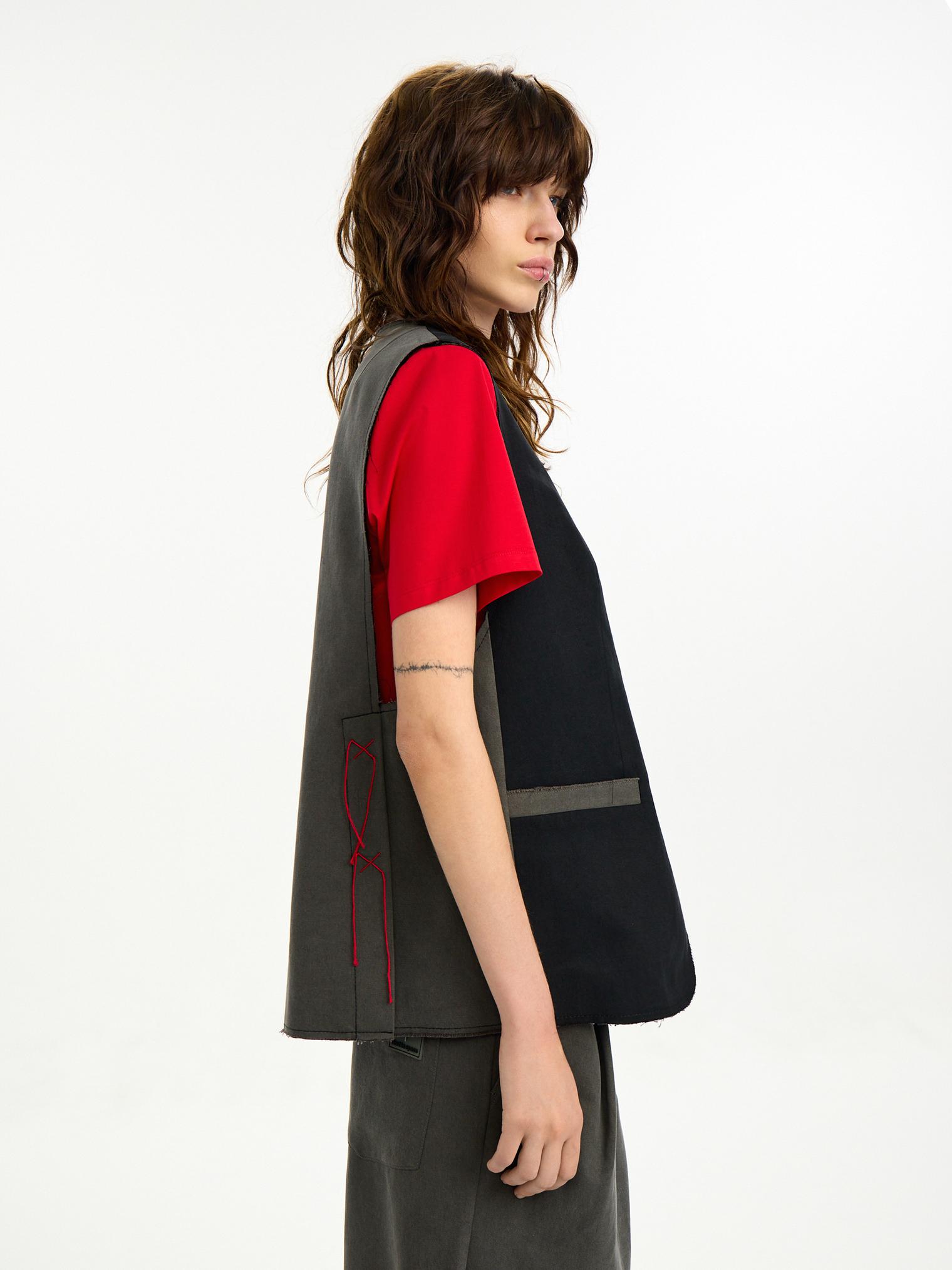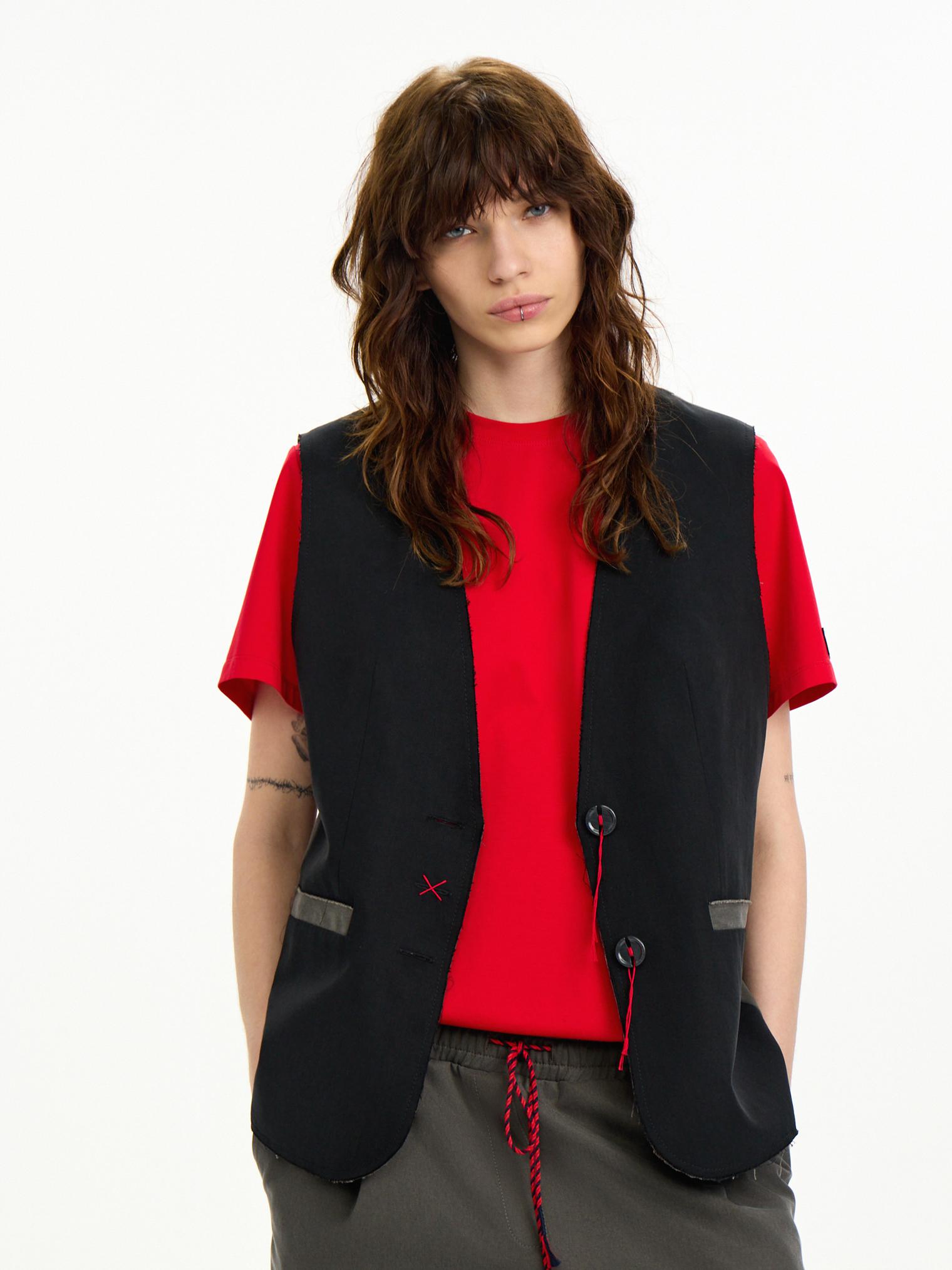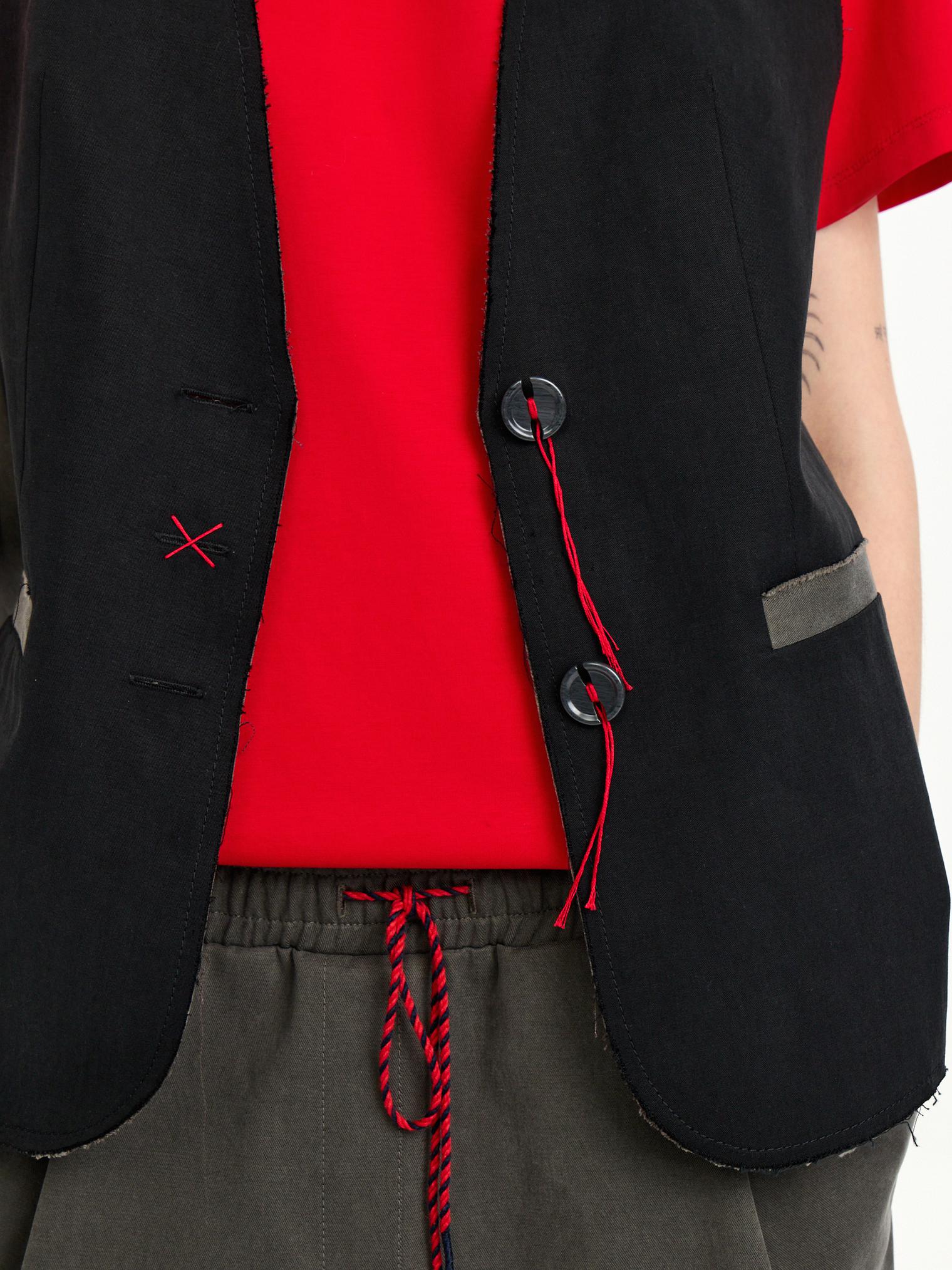 Комбинированный жилет сочетает хаки и чёрный цвета. Модель с контрастными листачками, крупными пуговицами, открытыми срезами и ручным декором из красных ниток идеально смотрится с брюками-бананами из той же капсулы.