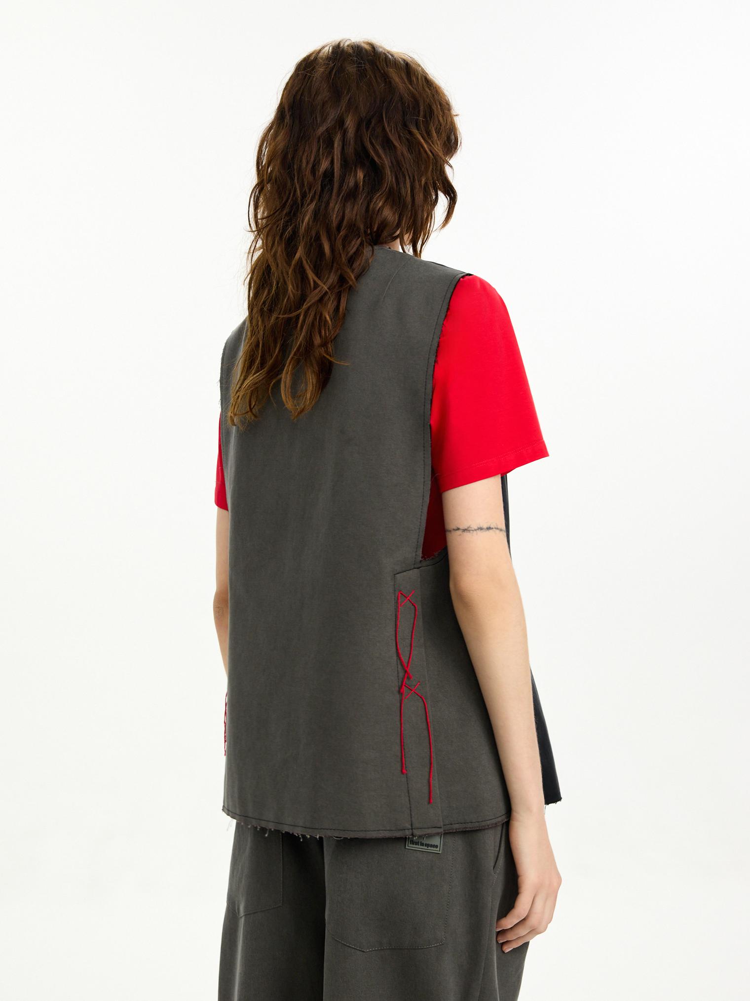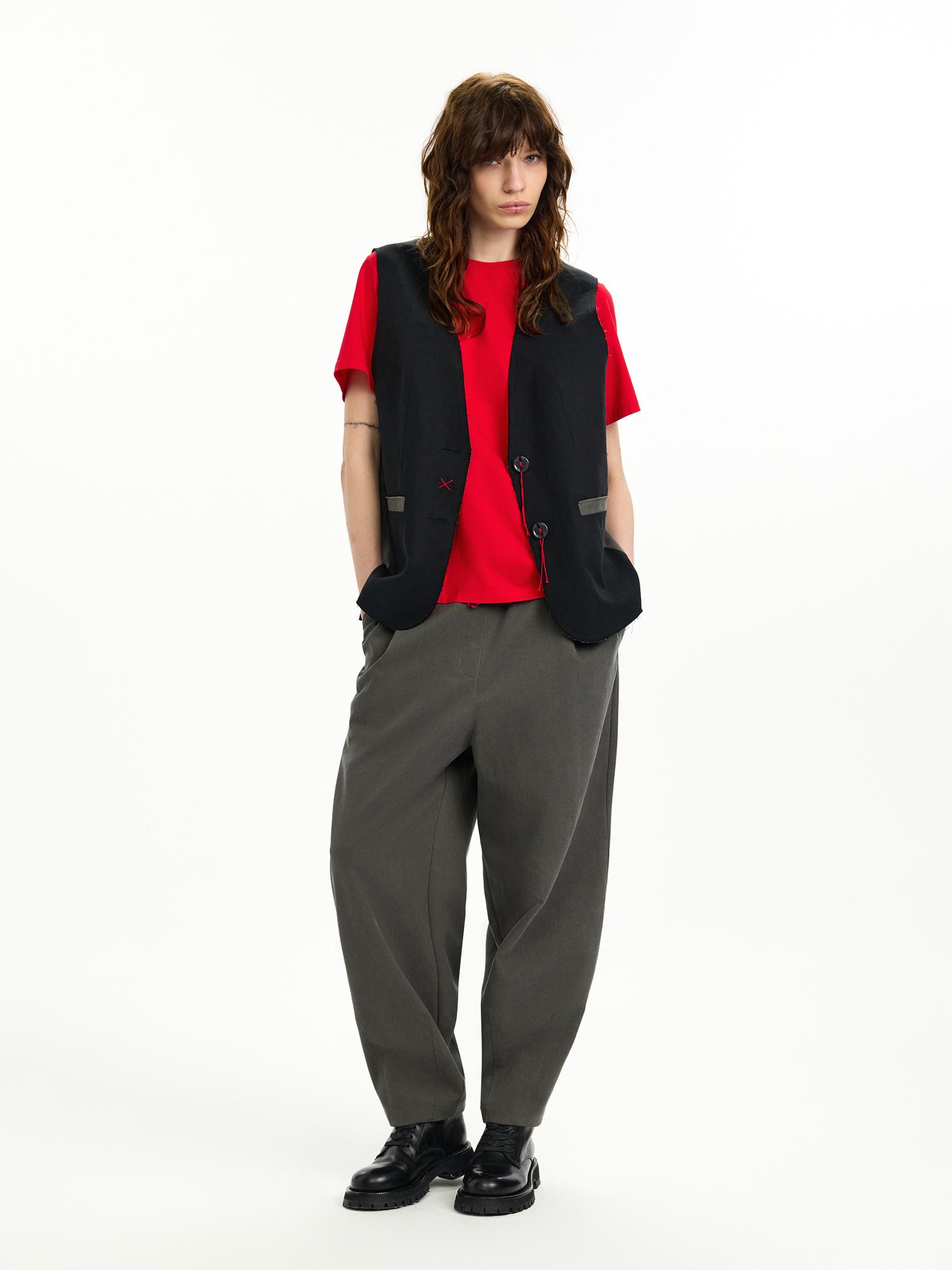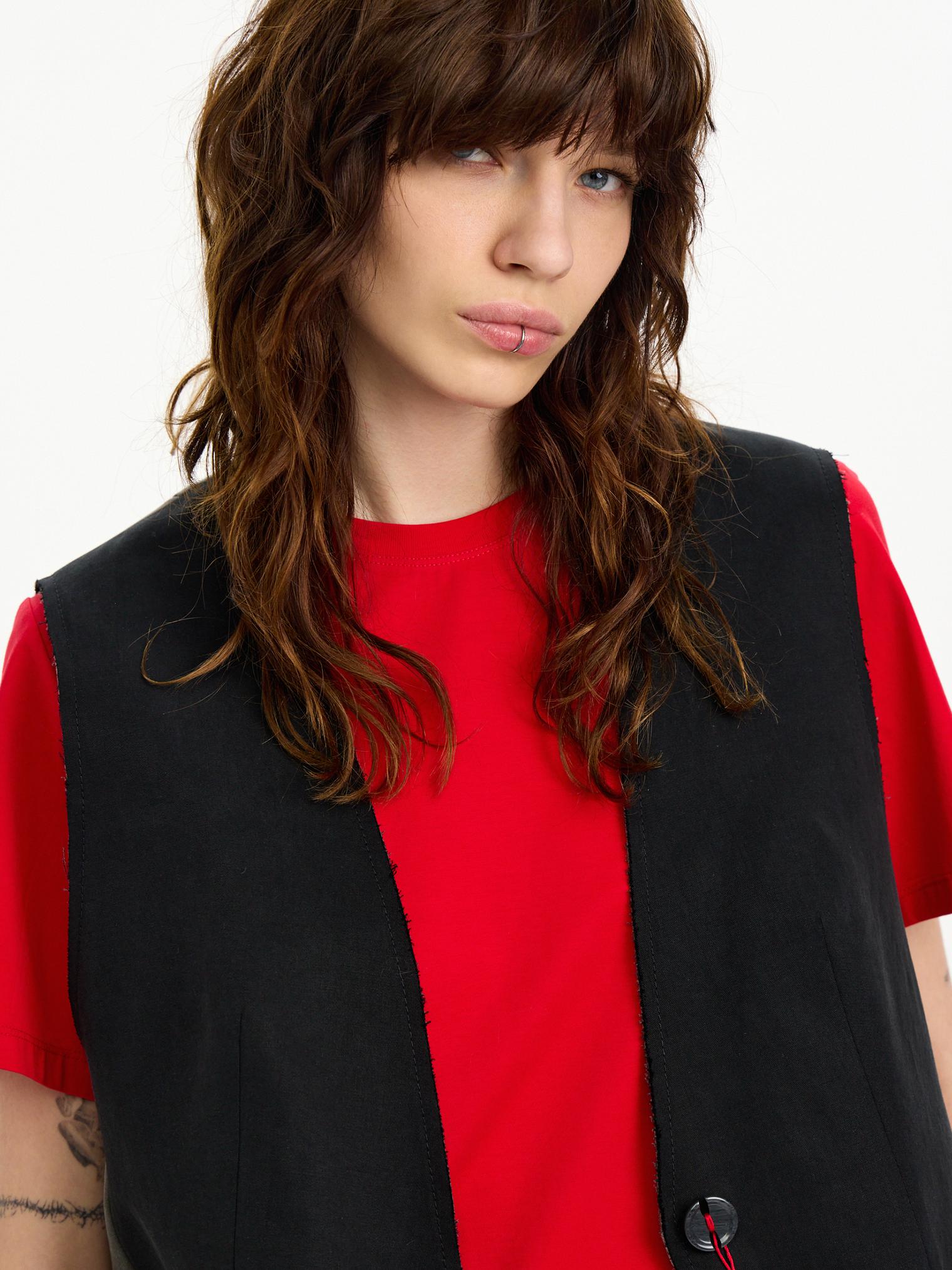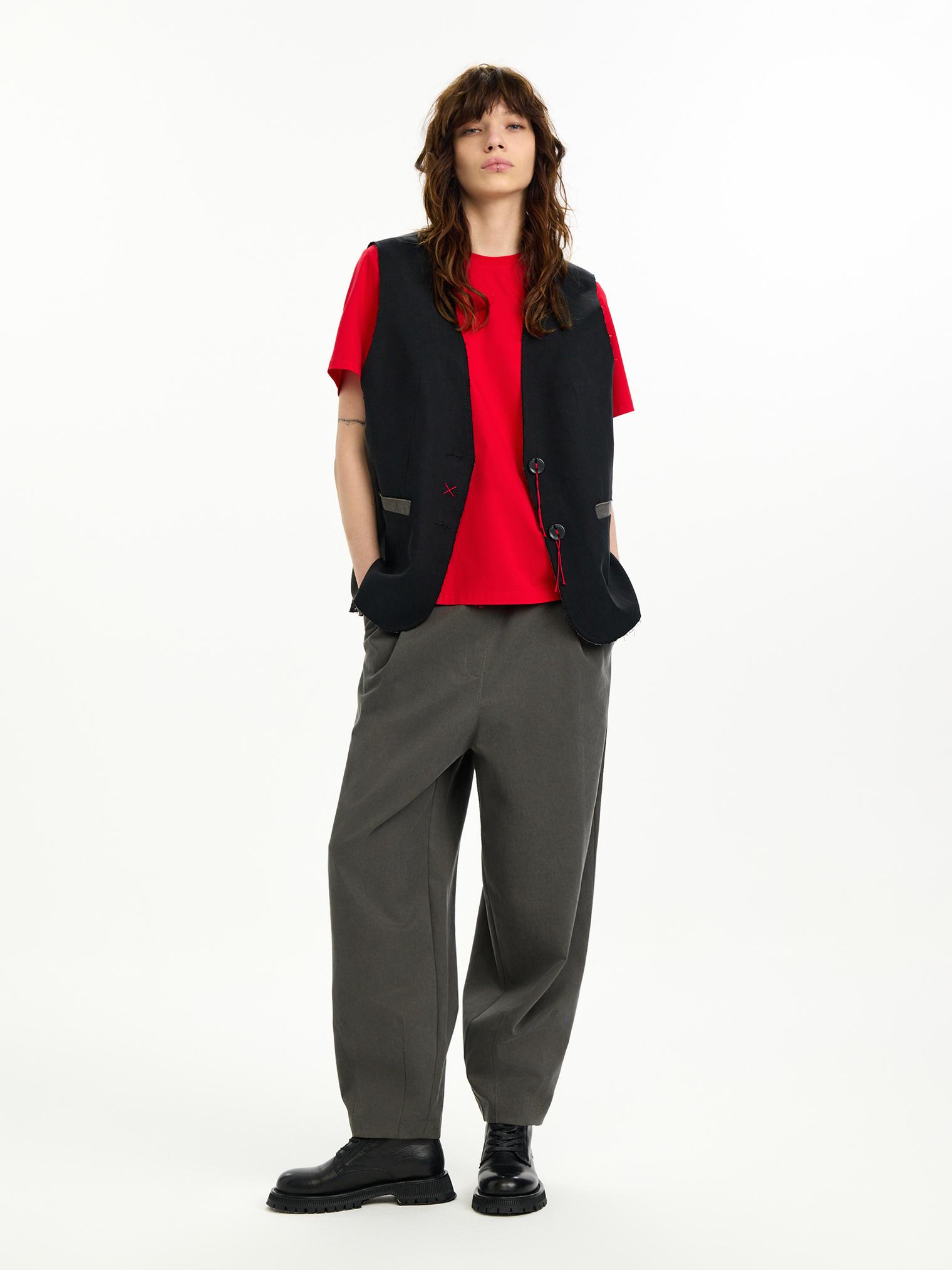 Комбинированный жилет сочетает хаки и чёрный цвета. Модель с контрастными листачками, крупными пуговицами, открытыми срезами и ручным декором из красных ниток идеально смотрится с брюками-бананами из той же капсулы.