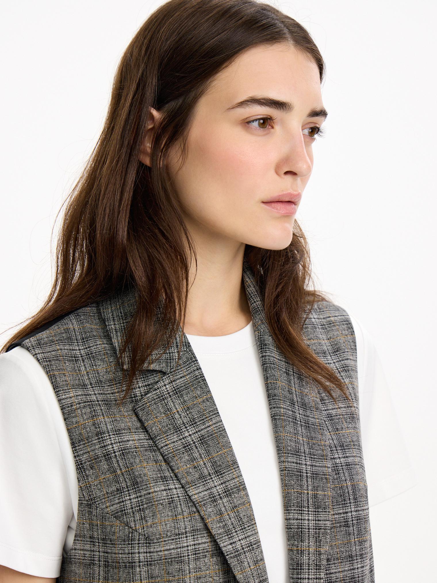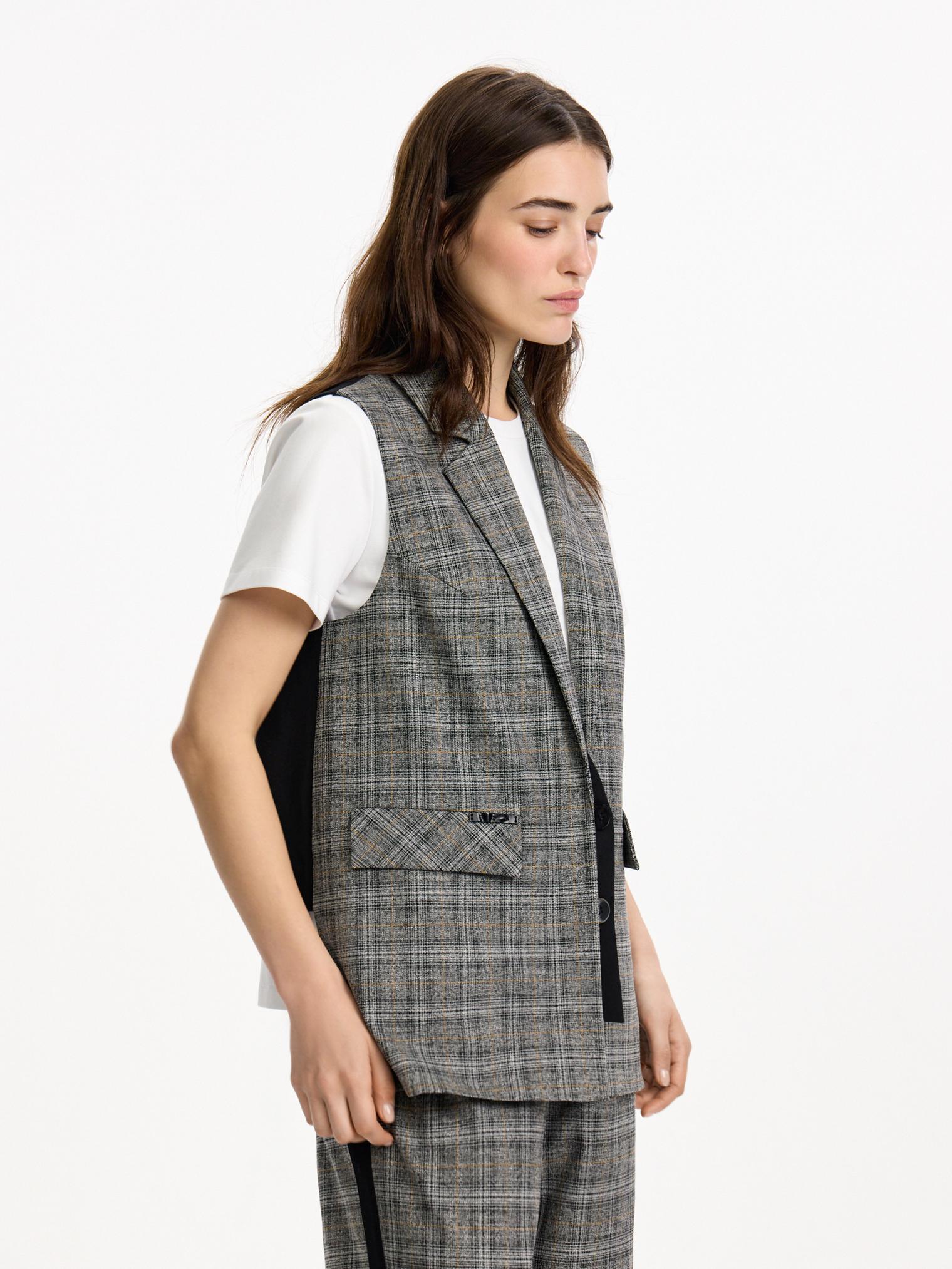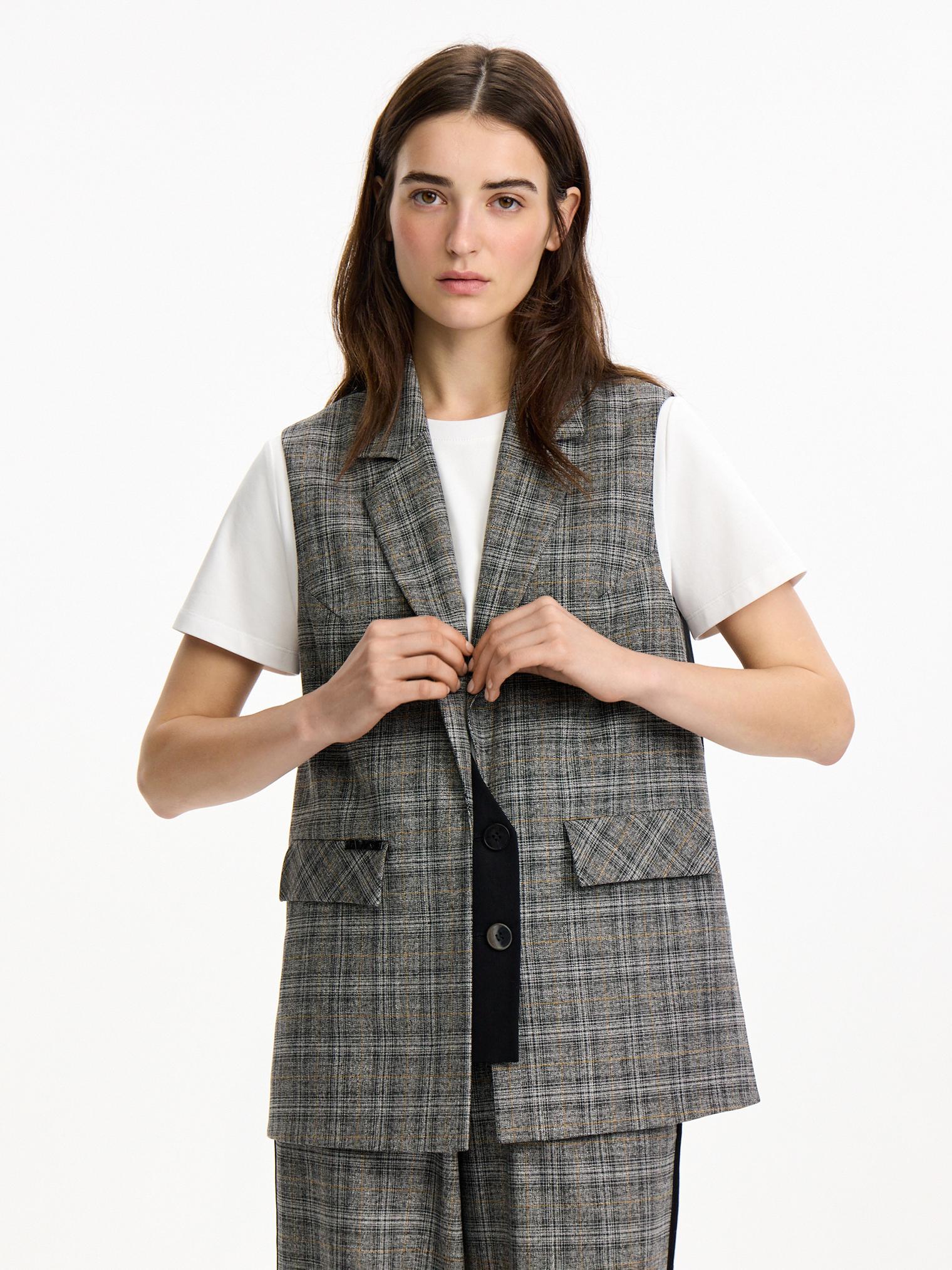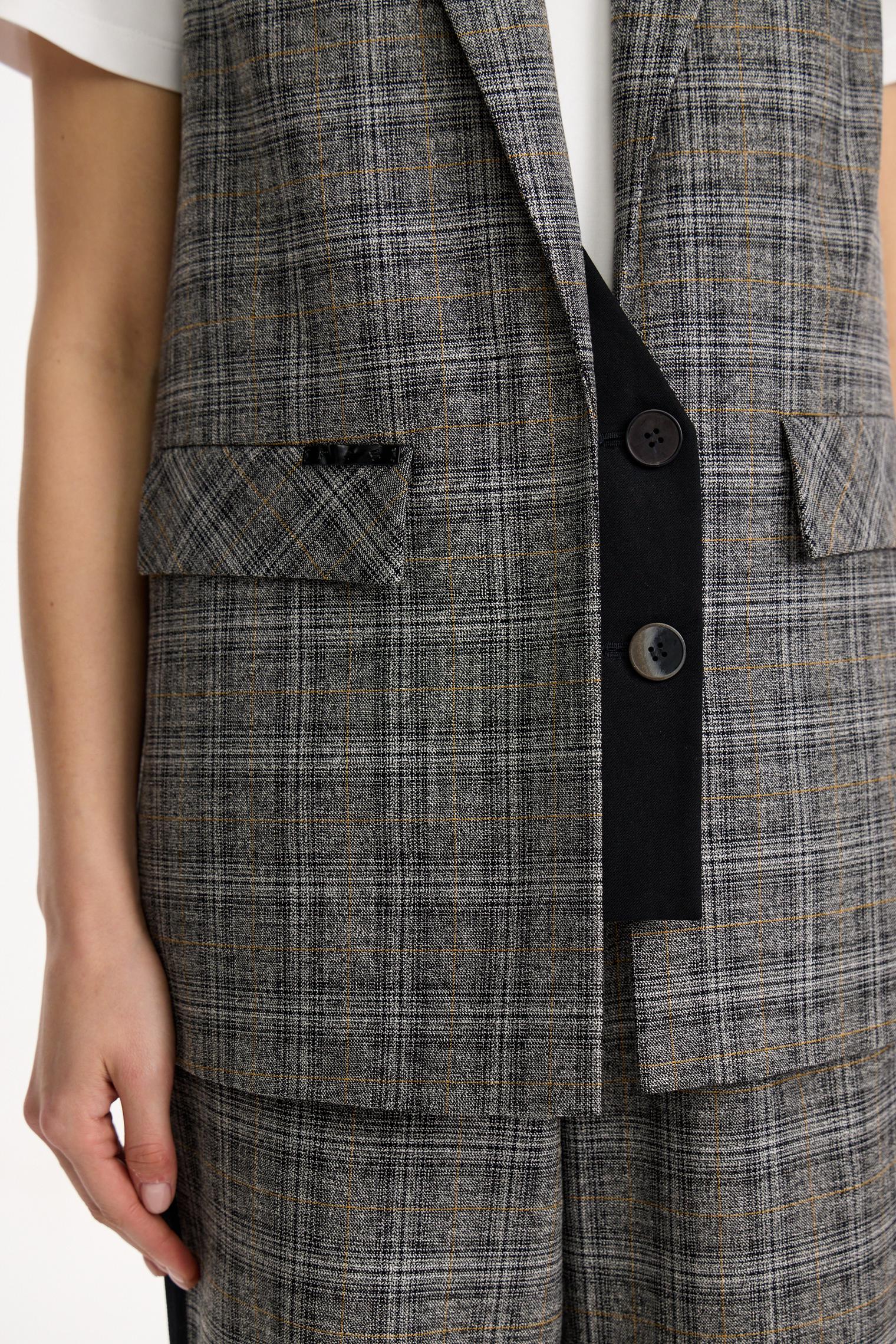 Однобортный жилет из костюмной ткани в клетку. Модель с имитацией ложного жилета. Контрастная планка-застежка отлично сочетается с клетчатыми и черными брюками из капсулы.