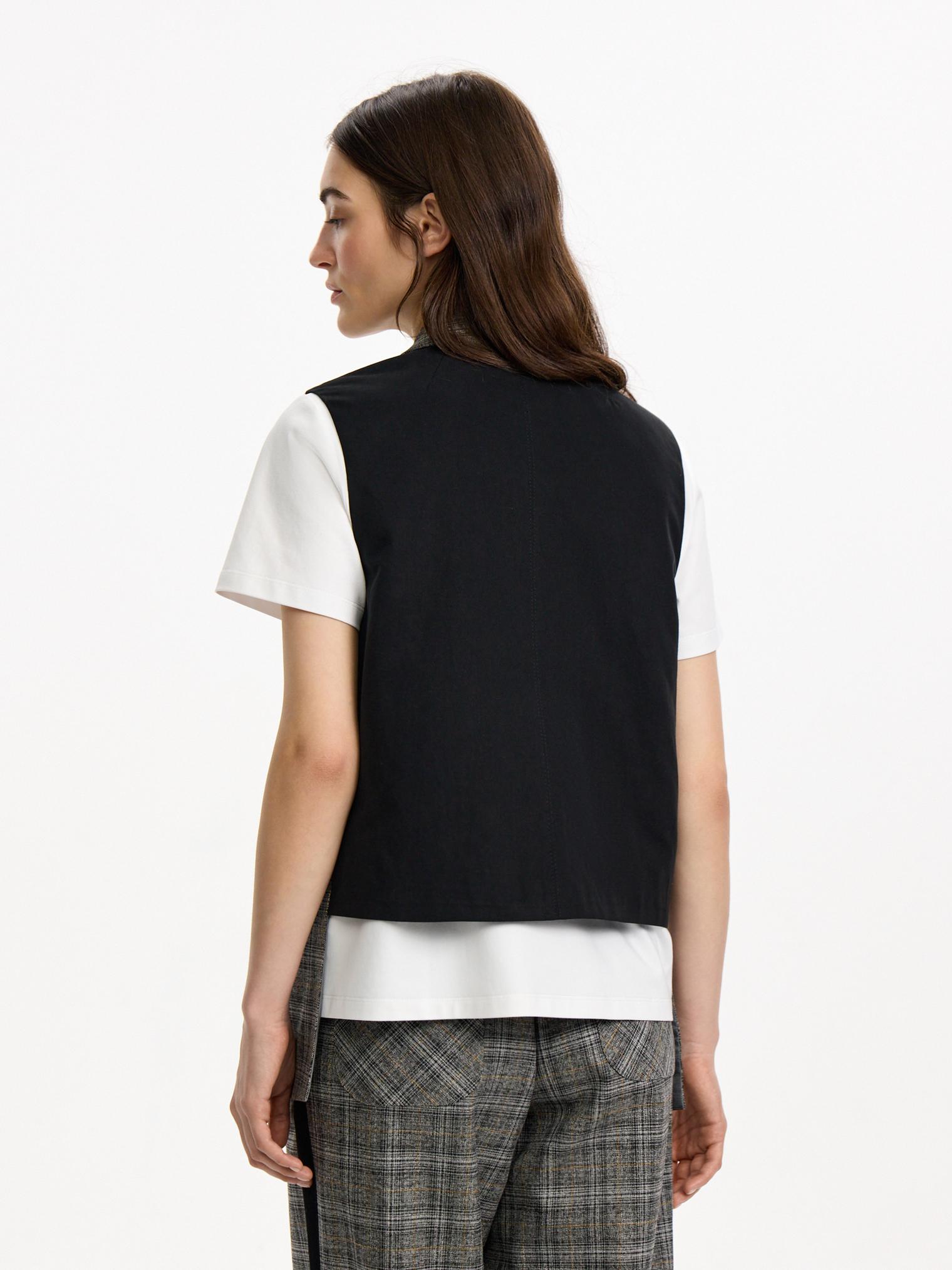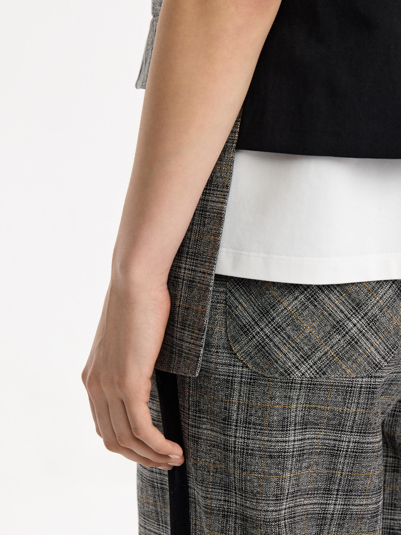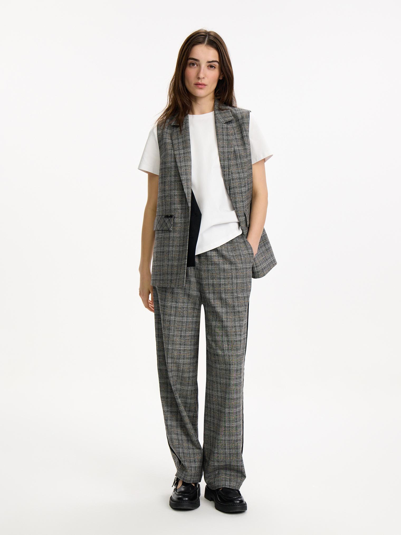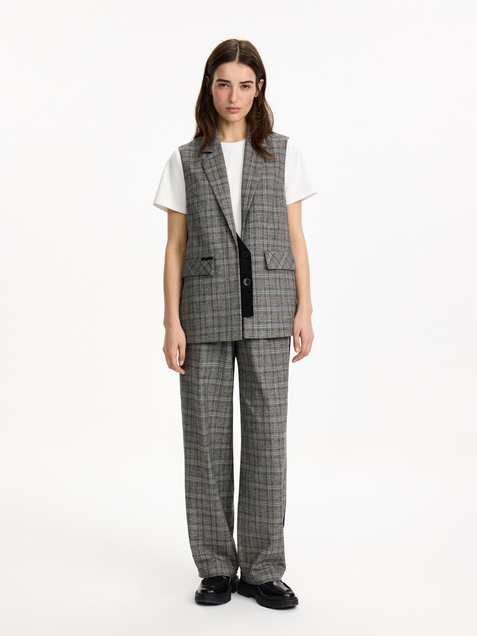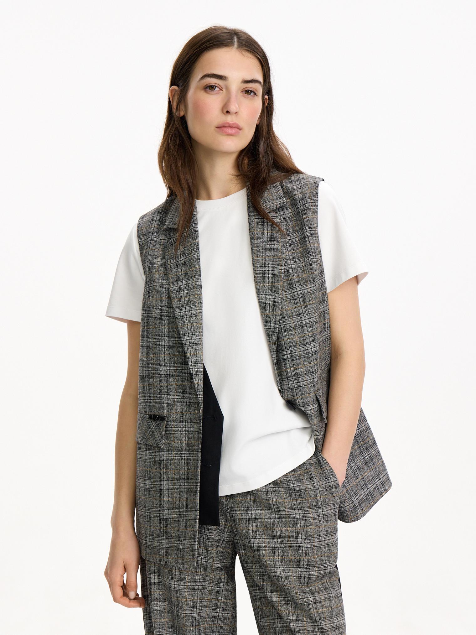 Однобортный жилет из костюмной ткани в клетку. Модель с имитацией ложного жилета. Контрастная планка-застежка отлично сочетается с клетчатыми и черными брюками из капсулы.