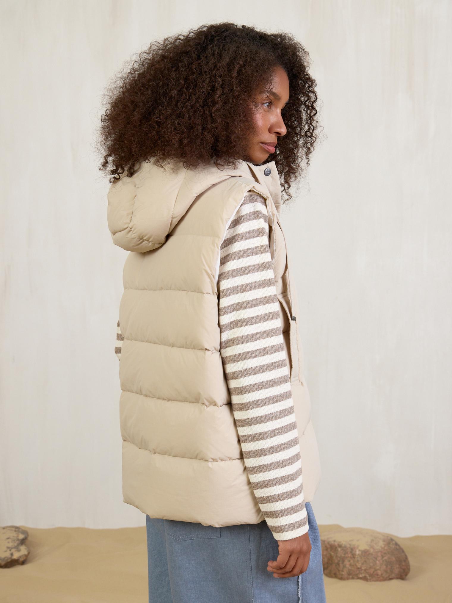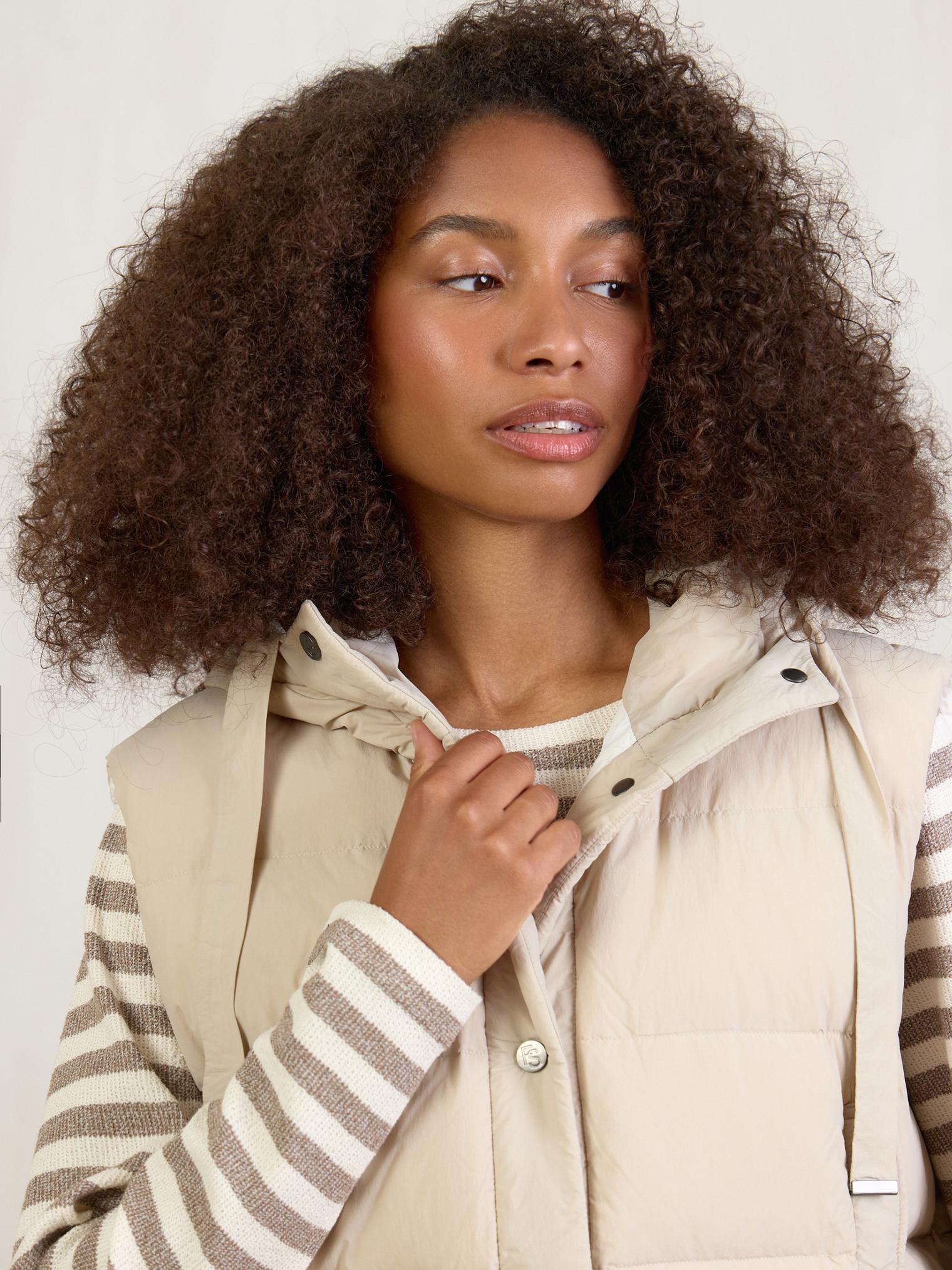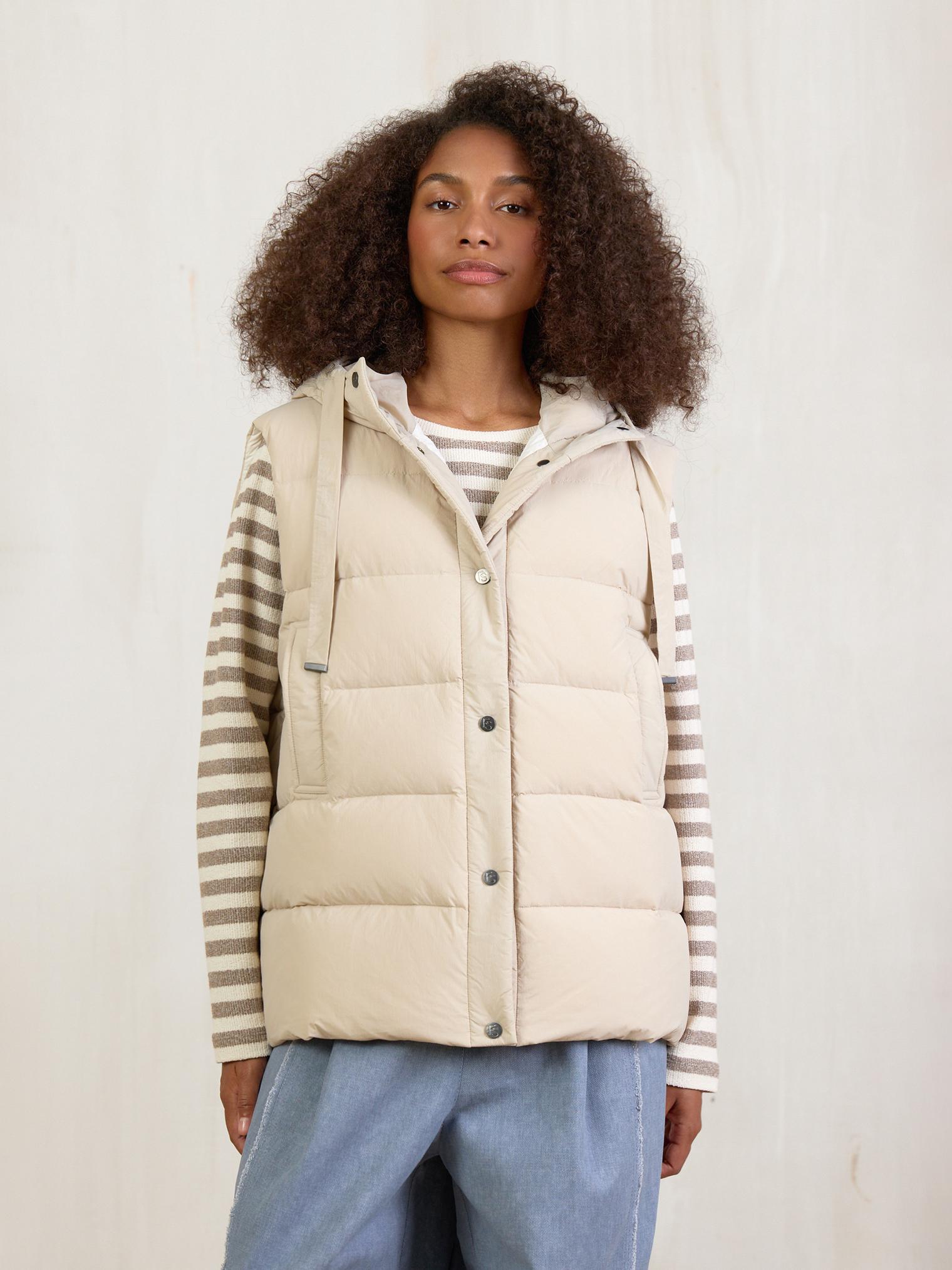Дутый стеганый жилет с тонким натуральным утеплителем из пуха и пера. Кремовый оттенок поможет создать нежный весенний образ в пастельных тонах. Капюшон на кулиске защитит от ветра и дождя.