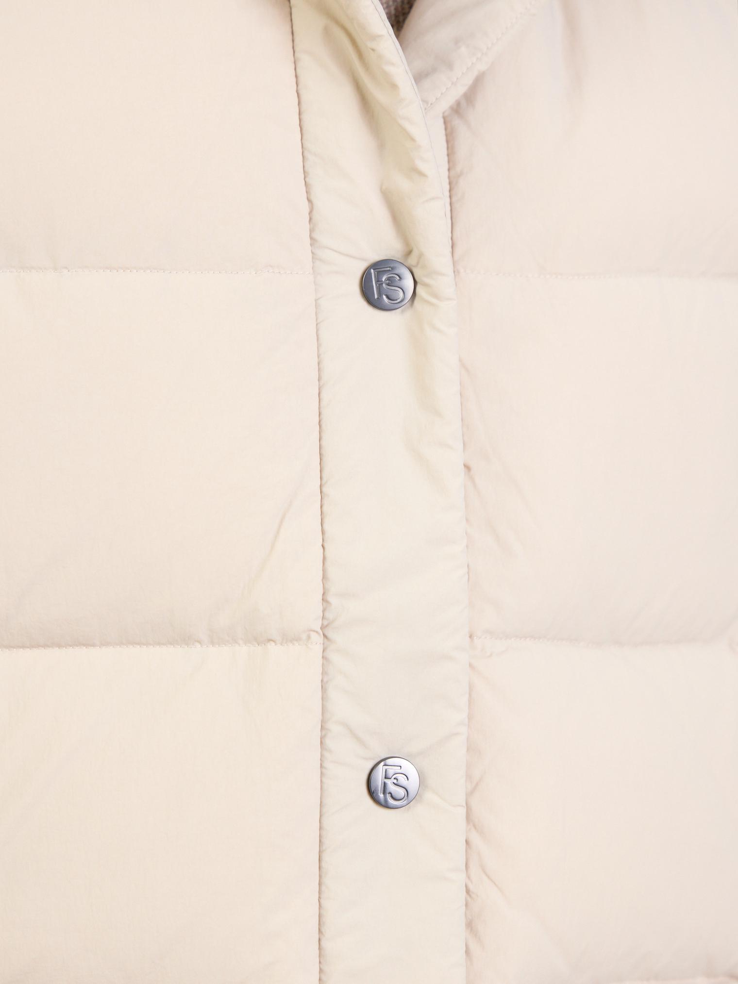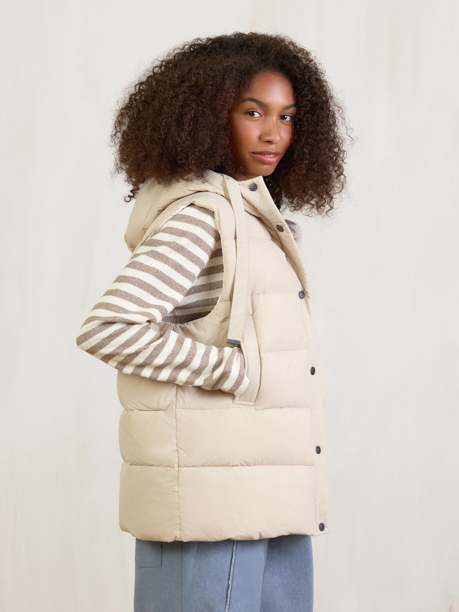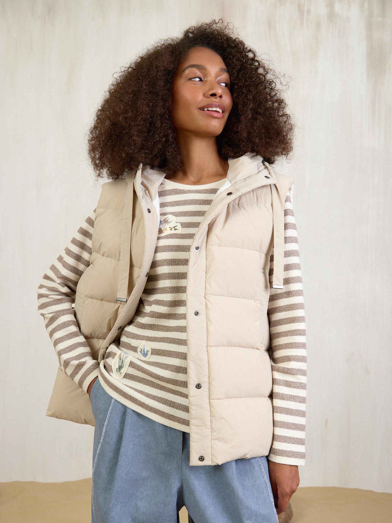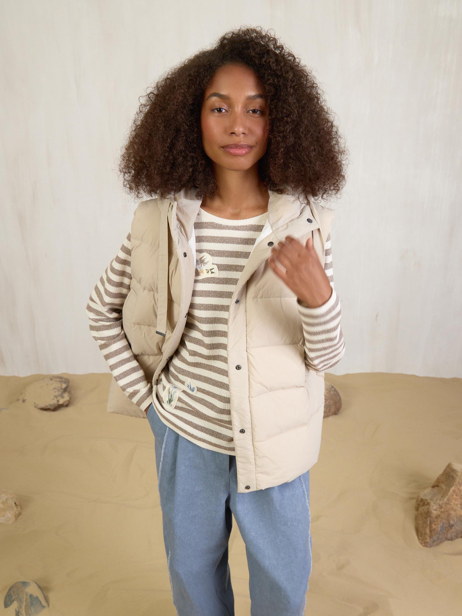 Дутый стеганый жилет с тонким натуральным утеплителем из пуха и пера. Кремовый оттенок поможет создать нежный весенний образ в пастельных тонах. Капюшон на кулиске защитит от ветра и дождя.